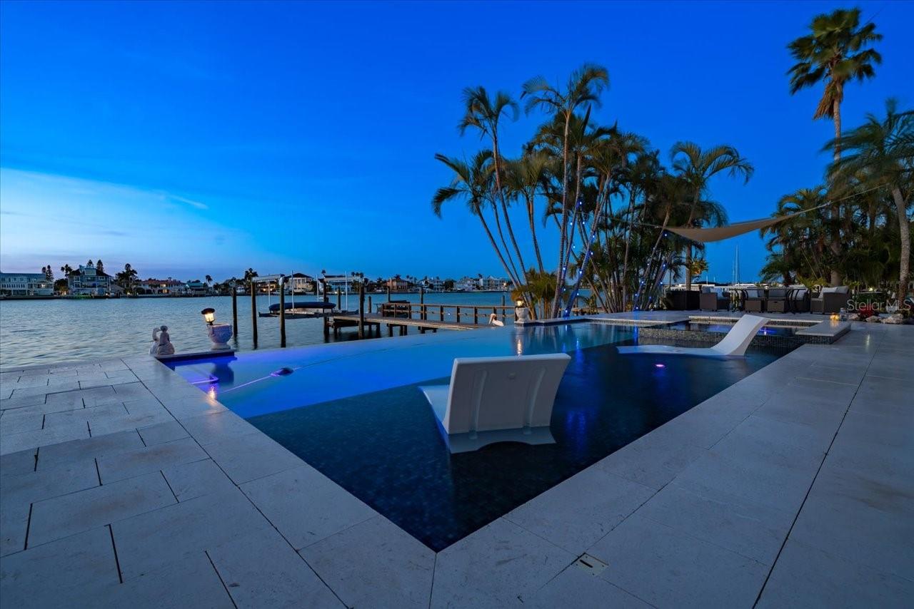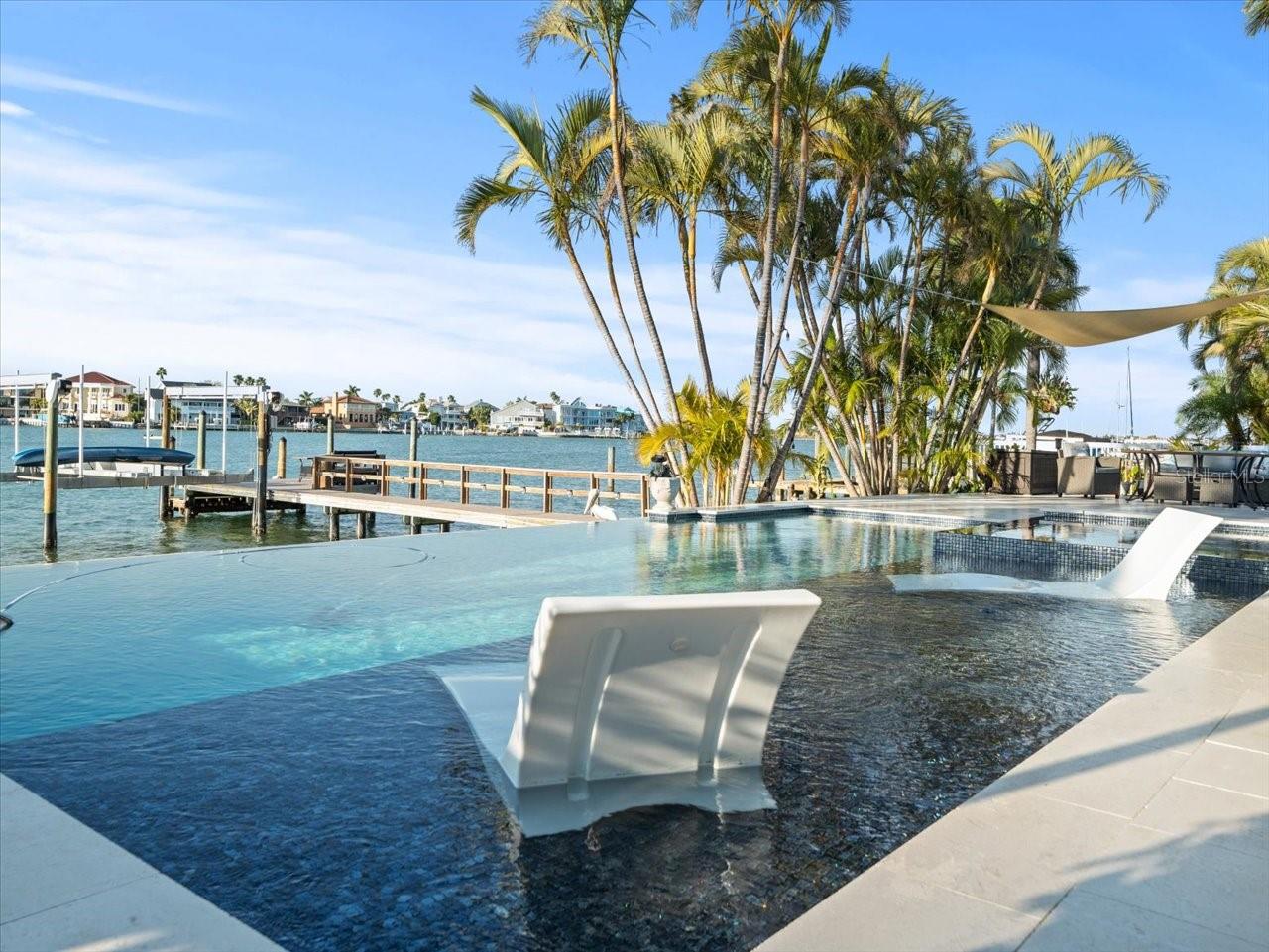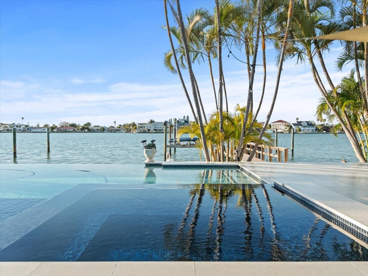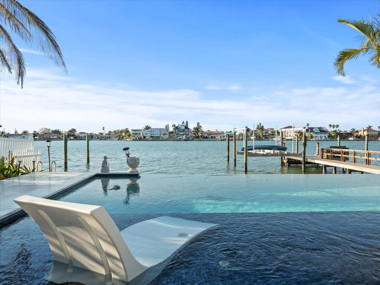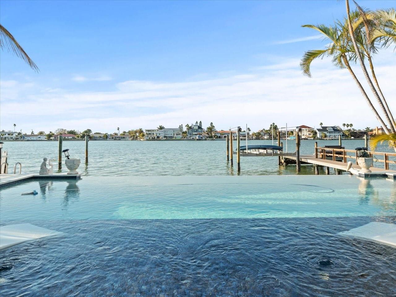 AN INSPIRING LUXURY WATERFRONT LIVING EXPERIENCE LOCATED IN THE HEART OF ST. PETE BEACH! A large circular driveway and lush subtropical landscaping introduce a wide and welcoming covered entry. Elegant wide-plank wood flooring, a wonderful array of skylights that deliver plenty of natural light, and spectacular water views visible across a rich open floor plan will assure an unforgettable living experience. The sumptuous and open chef’s kitchen features elegant white shaker-style cabinetry, fine granite surfaces, gorgeous small-tile blue backsplash, quality stainless steel appliances, an island prep center, and separate breakfast bar. An impressive great room concept integrates dining, living and kitchen areas in a way that maximizes your water views. Spacious owner’s suite boasts superb waterviews and a dazzling bath with dual vanities, coastal-modern wood cabinetry, quartz surfaces and a terrific walk-in glass rain-shower enclosure. 2nd and 3rd bedrooms are beautifully finished and the guest bath is luxurious in its appointments. The laundry facility is well-done, providing generous storage. Out back you’ll discover a captivating vision of paradise on the water! Luxury paver decking is tightly integrated with well-placed palm landscaping in a manner that calls you to the waterfront. Not to be outdone, is the absolutely stunning Pebbletec infinity pool & spa with lounging sun-shelf. By day, your pool seemingly disappears into the waterway; by early evening, radiant LED lighting produces a remarkable intimacy with sunsetting skies across the horizon. Separately, the rear yard offers substantial multi-purpose green space, an updated seawall, newer deep water composite dock, a 16,000 lb boat lift, and tie poles for a cruiser/sailboat – from here, you’re 15 minutes to the Gulf by Boat. The home’s many updates/upgrades include its kitchen and baths, its infinity pool/spa, solar electric panels (significantly lowering electric bills), newer windows and newer roof. The best of boating and the beach, with just a 5-minute walk to the nationally acclaimed powdersoft sands of St. Pete Beach. Situated in highly-desired Brightwater Beach Estates (where all the homes are on the water), you’ll find shopping, dining and entertainment are within easy walking distance. Close to downtown St. Petersburg (15-minute drive) and just 30 minutes to Tampa Airport. This is an extraordinary value in a superb waterfront location. Buyer to verify room dimensions.