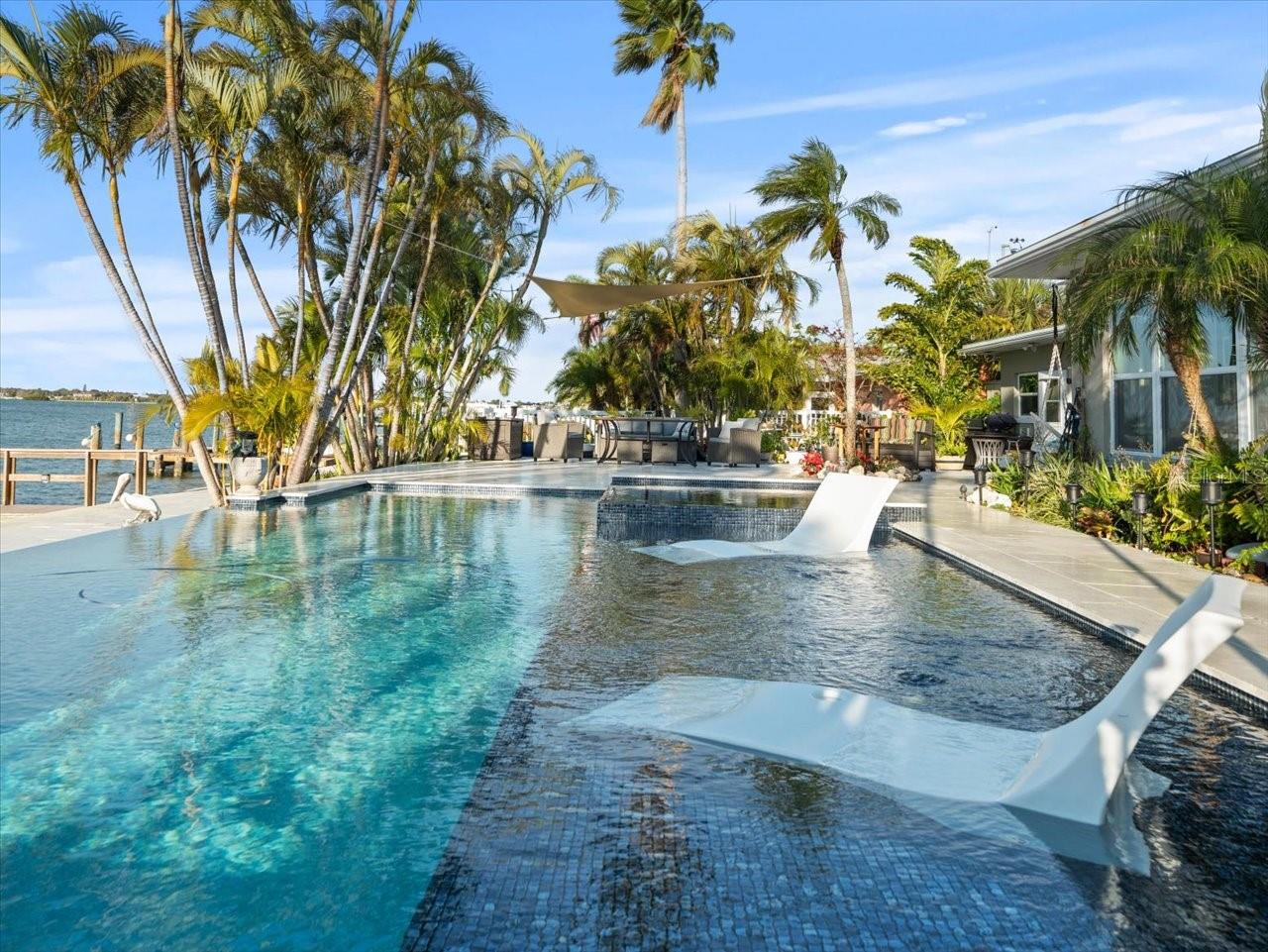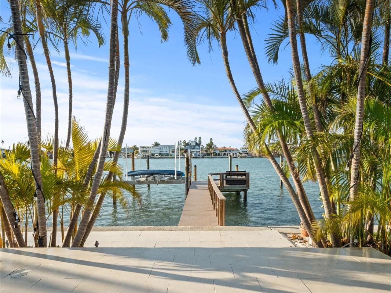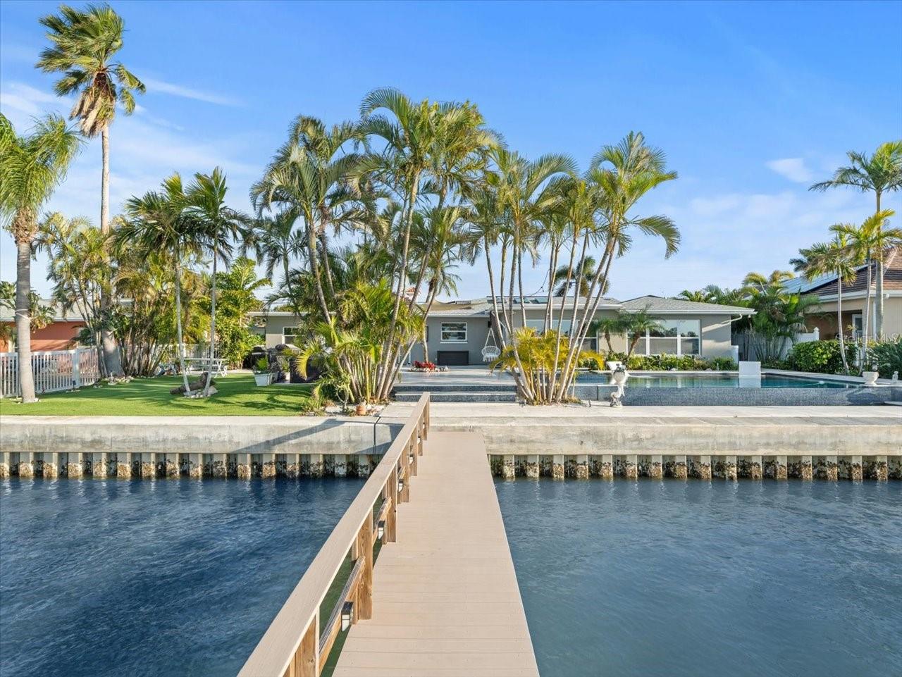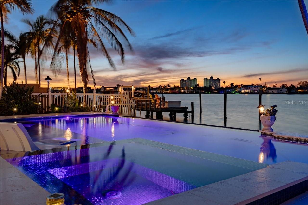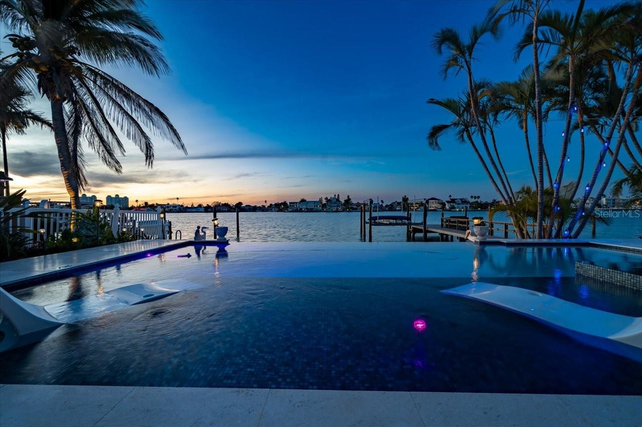 AN INSPIRING LUXURY WATERFRONT LIVING EXPERIENCE LOCATED IN THE HEART OF ST. PETE BEACH! A large circular driveway and lush subtropical landscaping introduce a wide and welcoming covered entry. Elegant wide-plank wood flooring, a wonderful array of skylights that deliver plenty of natural light, and spectacular water views visible across a rich open floor plan will assure an unforgettable living experience. The sumptuous and open chef’s kitchen features elegant white shaker-style cabinetry, fine granite surfaces, gorgeous small-tile blue backsplash, quality stainless steel appliances, an island prep center, and separate breakfast bar. An impressive great room concept integrates dining, living and kitchen areas in a way that maximizes your water views. Spacious owner’s suite boasts superb waterviews and a dazzling bath with dual vanities, coastal-modern wood cabinetry, quartz surfaces and a terrific walk-in glass rain-shower enclosure. 2nd and 3rd bedrooms are beautifully finished and the guest bath is luxurious in its appointments. The laundry facility is well-done, providing generous storage. Out back you’ll discover a captivating vision of paradise on the water! Luxury paver decking is tightly integrated with well-placed palm landscaping in a manner that calls you to the waterfront. Not to be outdone, is the absolutely stunning Pebbletec infinity pool & spa with lounging sun-shelf. By day, your pool seemingly disappears into the waterway; by early evening, radiant LED lighting produces a remarkable intimacy with sunsetting skies across the horizon. Separately, the rear yard offers substantial multi-purpose green space, an updated seawall, newer deep water composite dock, a 16,000 lb boat lift, and tie poles for a cruiser/sailboat – from here, you’re 15 minutes to the Gulf by Boat. The home’s many updates/upgrades include its kitchen and baths, its infinity pool/spa, solar electric panels (significantly lowering electric bills), newer windows and newer roof. The best of boating and the beach, with just a 5-minute walk to the nationally acclaimed powdersoft sands of St. Pete Beach. Situated in highly-desired Brightwater Beach Estates (where all the homes are on the water), you’ll find shopping, dining and entertainment are within easy walking distance. Close to downtown St. Petersburg (15-minute drive) and just 30 minutes to Tampa Airport. This is an extraordinary value in a superb waterfront location. Buyer to verify room dimensions.