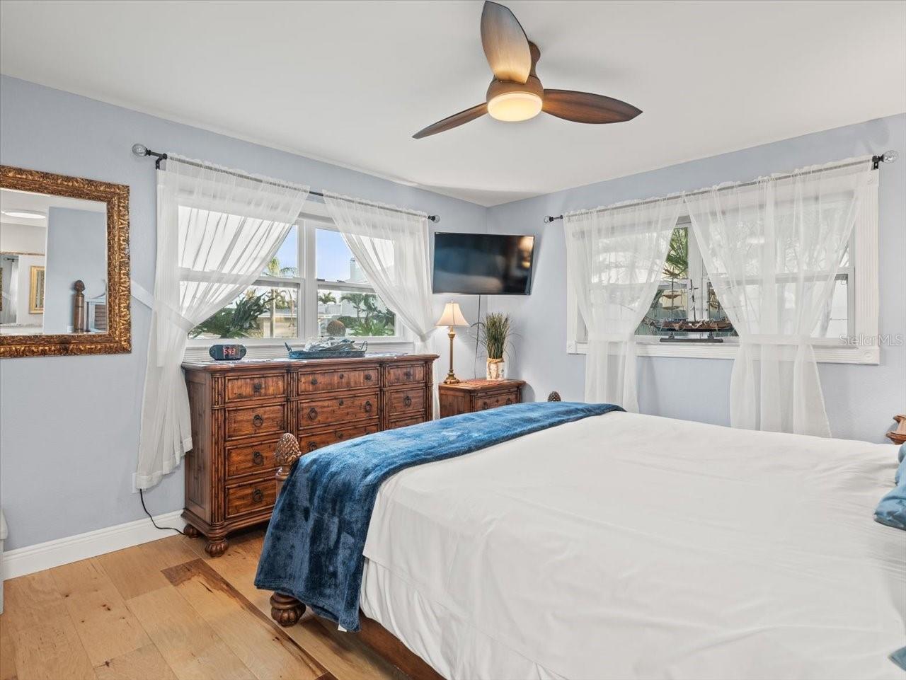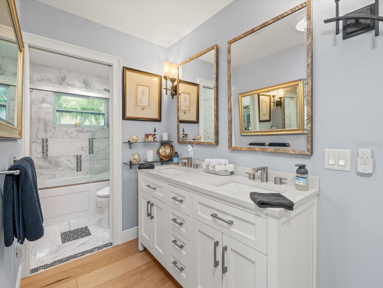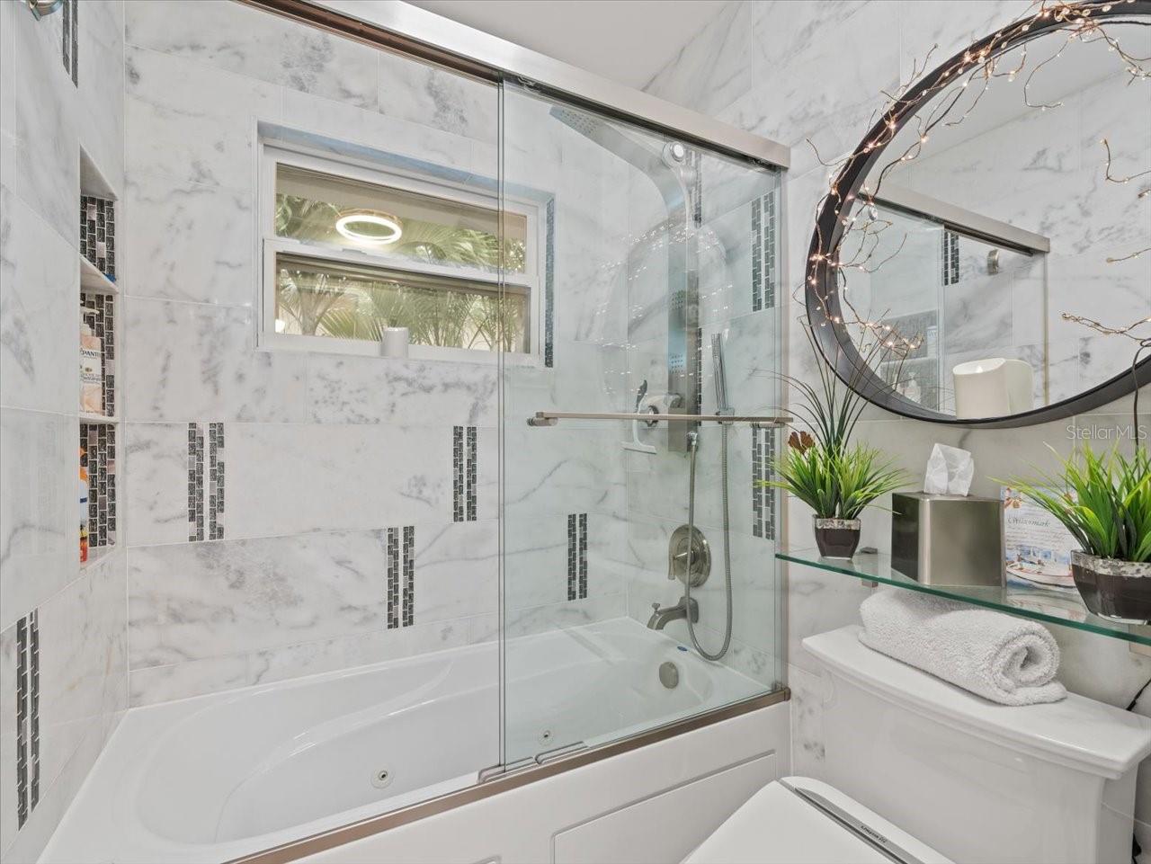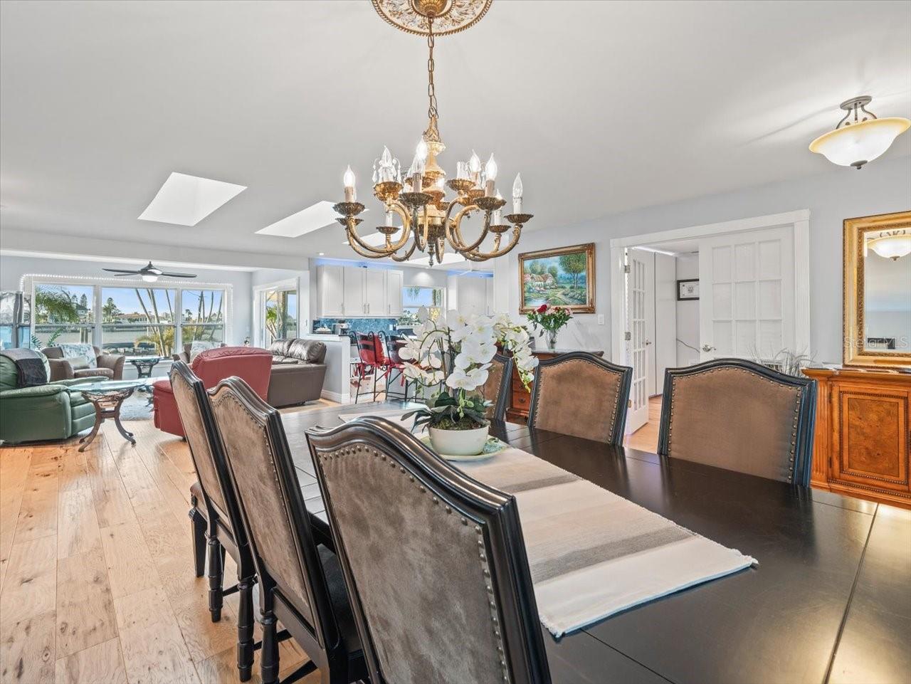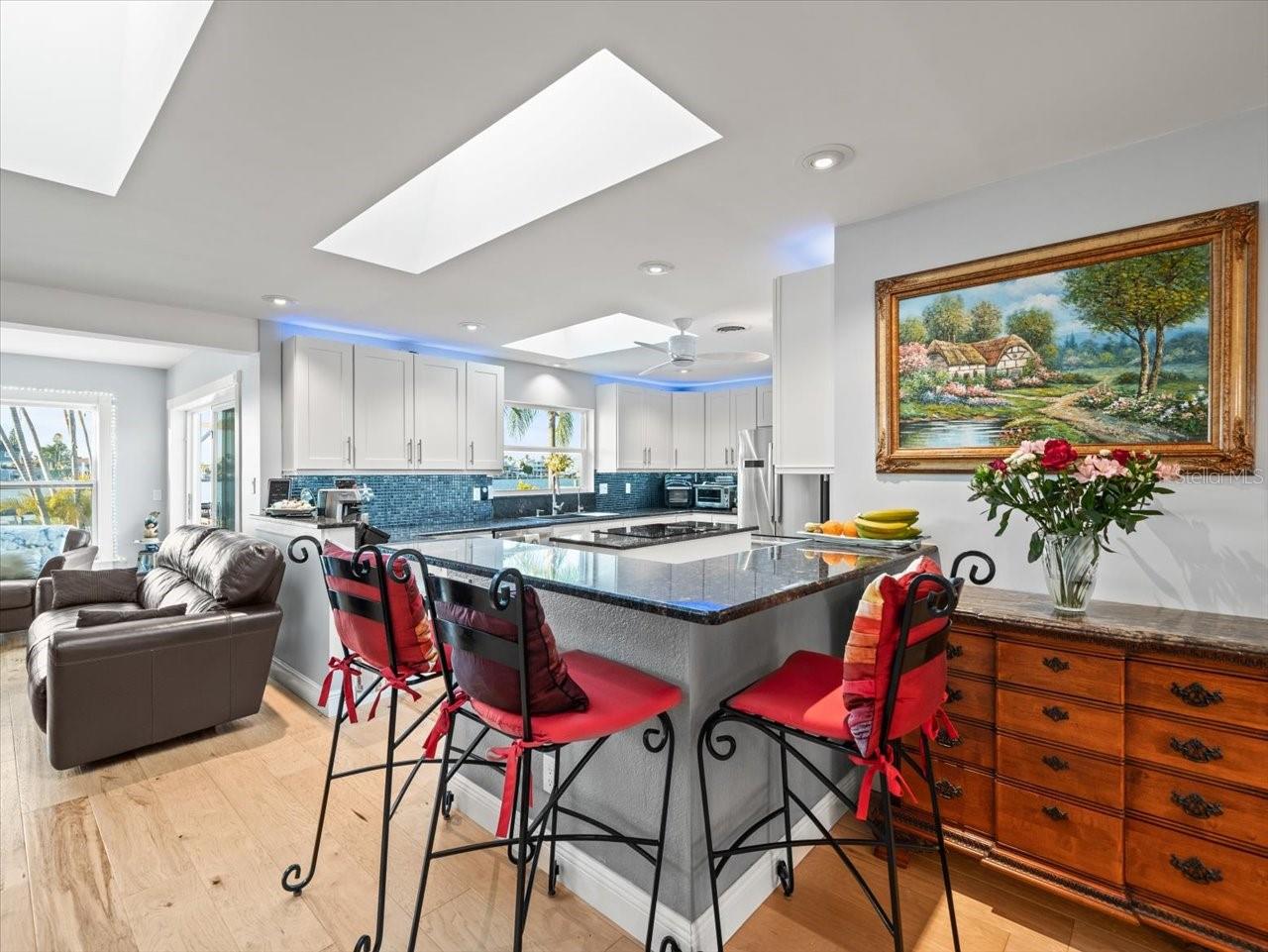 AN INSPIRING LUXURY WATERFRONT LIVING EXPERIENCE LOCATED IN THE HEART OF ST. PETE BEACH! A large circular driveway and lush subtropical landscaping introduce a wide and welcoming covered entry. Elegant wide-plank wood flooring, a wonderful array of skylights that deliver plenty of natural light, and spectacular water views visible across a rich open floor plan will assure an unforgettable living experience. The sumptuous and open chef’s kitchen features elegant white shaker-style cabinetry, fine granite surfaces, gorgeous small-tile blue backsplash, quality stainless steel appliances, an island prep center, and separate breakfast bar. An impressive great room concept integrates dining, living and kitchen areas in a way that maximizes your water views. Spacious owner’s suite boasts superb waterviews and a dazzling bath with dual vanities, coastal-modern wood cabinetry, quartz surfaces and a terrific walk-in glass rain-shower enclosure. 2nd and 3rd bedrooms are beautifully finished and the guest bath is luxurious in its appointments. The laundry facility is well-done, providing generous storage. Out back you’ll discover a captivating vision of paradise on the water! Luxury paver decking is tightly integrated with well-placed palm landscaping in a manner that calls you to the waterfront. Not to be outdone, is the absolutely stunning Pebbletec infinity pool & spa with lounging sun-shelf. By day, your pool seemingly disappears into the waterway; by early evening, radiant LED lighting produces a remarkable intimacy with sunsetting skies across the horizon. Separately, the rear yard offers substantial multi-purpose green space, an updated seawall, newer deep water composite dock, a 16,000 lb boat lift, and tie poles for a cruiser/sailboat – from here, you’re 15 minutes to the Gulf by Boat. The home’s many updates/upgrades include its kitchen and baths, its infinity pool/spa, solar electric panels (significantly lowering electric bills), newer windows and newer roof. The best of boating and the beach, with just a 5-minute walk to the nationally acclaimed powdersoft sands of St. Pete Beach. Situated in highly-desired Brightwater Beach Estates (where all the homes are on the water), you’ll find shopping, dining and entertainment are within easy walking distance. Close to downtown St. Petersburg (15-minute drive) and just 30 minutes to Tampa Airport. This is an extraordinary value in a superb waterfront location. Buyer to verify room dimensions.