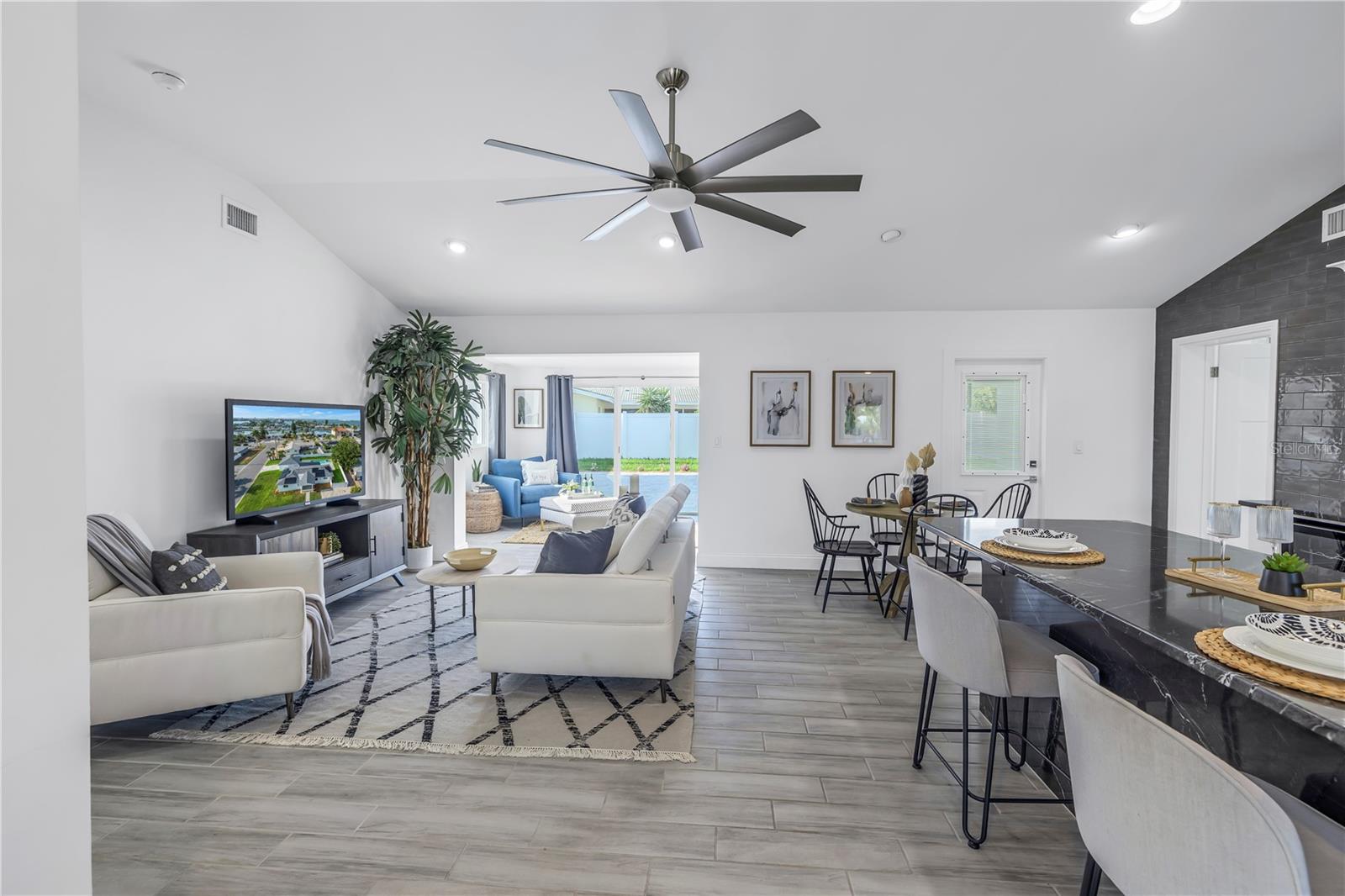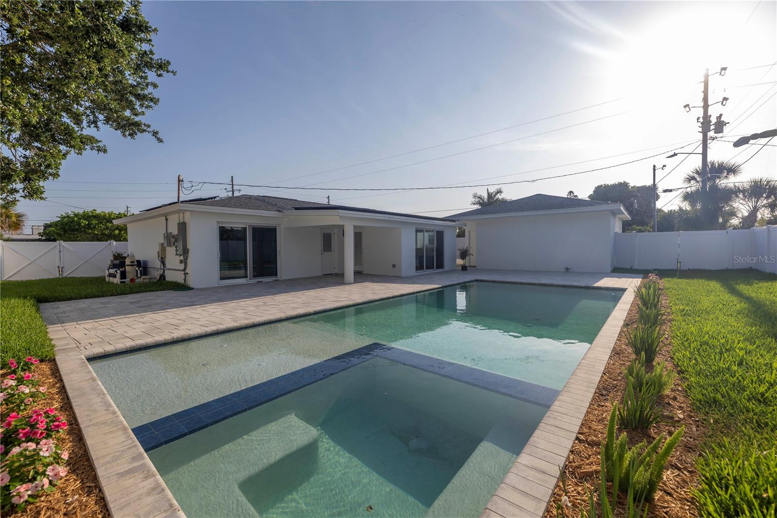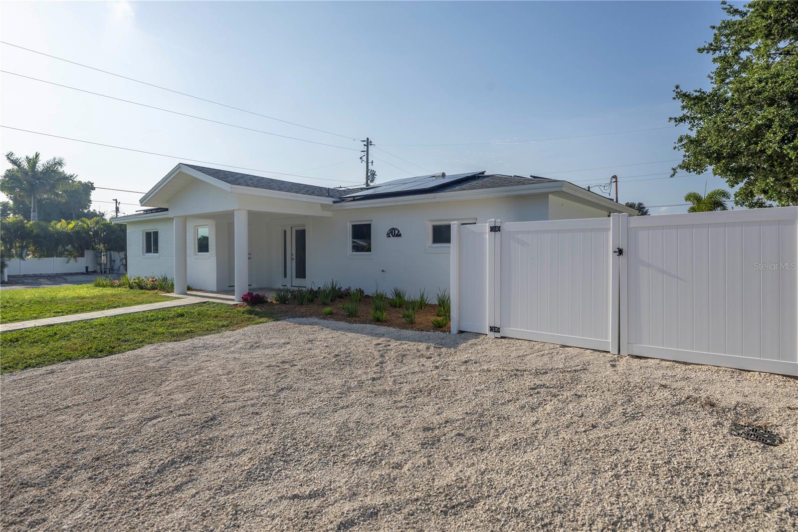 Welcome to your dream home on the biggest interior lot in Belle Vista! This COMPLETELY remodeled contemporary house is a masterpiece, boasting 3 bedrooms, 2 bathrooms, and a brand-new pool. Step inside and be greeted by high ceilings, abundant natural light, and premium finishes throughout. The open-concept living space is perfect for entertaining, with a seamless flow from the gourmet kitchen with an oversized granite kitchen island to the living space. Prepare culinary delights in style with state-of-the-art appliances and custom cabinetry. The master bedroom features a large walk-in closet and a luxurious ensuite bathroom, with a large walk-in shower and elegant fixtures. Two additional bedrooms and an additional bathroom provide plenty of space for family or guests. The home also features a mud room with butcher block counters for crafts, laundry, and cabinets for additional storage. Outside, discover your own private oasis in the expansive backyard with a pool featuring a spa and sun shelf. In addition, the home has a new water heater, all new waste and supply lines for the plumbing system, new tile flooring throughout, new HVAC system and ducting, solar panels, and new roof in 2020. Renovation included all new treated lumber, new insulation, new impact windows and doors throughout, and hurricane strapping. The home also has a detached 2-car garage, providing privacy to the yard and a workshop for hobbyists. There are also 2 driveways and a large side yard for all your toys! Enjoy access to Belle Vista’s waterfront parks, a playground, and scenic walking paths, all within the charming neighborhood. And with the beach just a short stroll away, every day feels like a vacation. Don't miss this opportunity to own a large slice of paradise in Belle Vista!
