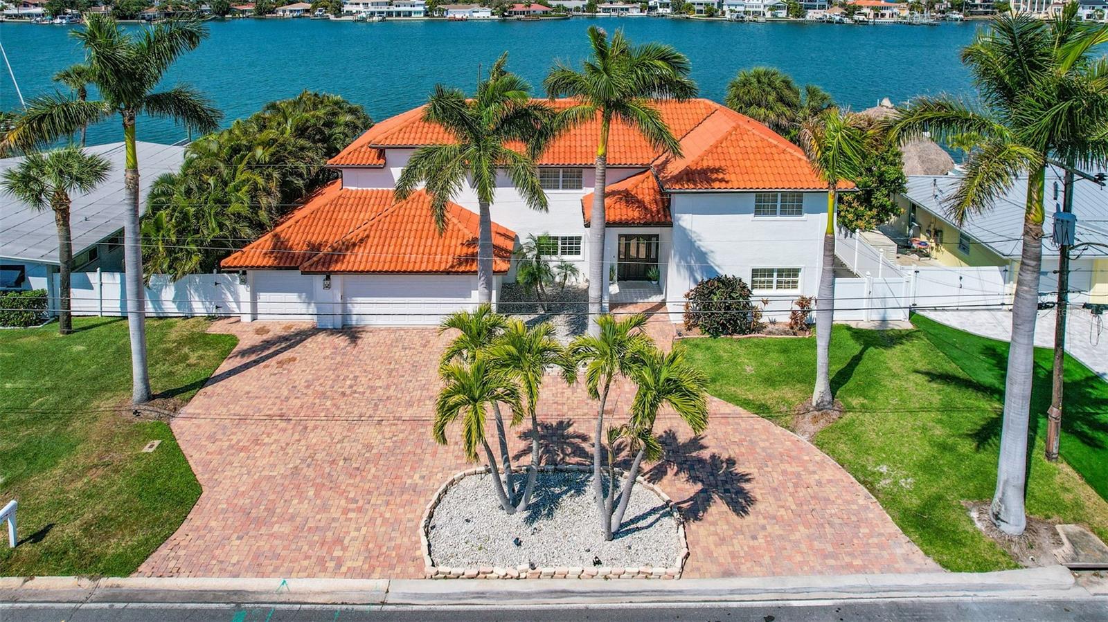 Modern, Bright and Elegant Villa. This Brightwater Estates designer updated 4 bedroom 3.5 bath 3 car garage waterfront pool home has spectacular views from every room. Sitting on 90' of deep open water frontage the home includes a circular paver driveway, barrel tile roof, open floor plan, large rooms throughout, new floors, freshly painted inside and out, new garage doors, updated baths, updated kitchen, new seawall and dock and much much more. The spacious foyer leads into the open floor plan with windows and sliders offering surrounding views of Boca Ciega Bay from most every room. There is a large formal living with soaring ceilings and separate dining area with abundant natural light, as well as a great family room immediately off the kitchen. The well-appointed chef’s kitchen features elegant wood cabinetry, granite countertops and a breakfast bar that can seat six. Two large bedrooms, a full bath and a powder room complete the downstairs. Venturing upstairs using the floating wood staircase leads you on to a dramatic, light-filled loggia and a 2nd living room or home office with excellent water views. A guest room and full bath are adjacent. The primary suite has TWO separate walk-in closets and a an en-suite with double sinks, shower, toilet room and a garden tub, as well as a spacious private deck and stunning sunset views. Out back is a in-ground pool and spill-over spa. The brand new dock and seawall comes with a boat lift, and an additional spaces to accommodate numerous boats. Natural gas from Teco has just been added to the street. From the dock, it is just a brief boat ride to the Intracoastal Waterway, with a multitude of local boat-friendly restaurants. The sand of St. Pete Beach is 12 min walk away, as are restaurants and fun things to do! St. Pete Beach is consistently voted in the top five beaches of the US. This is one of the premier residential locations among the Gulf beaches! TPA and downtown St. Pete are approx 20 minutes away.