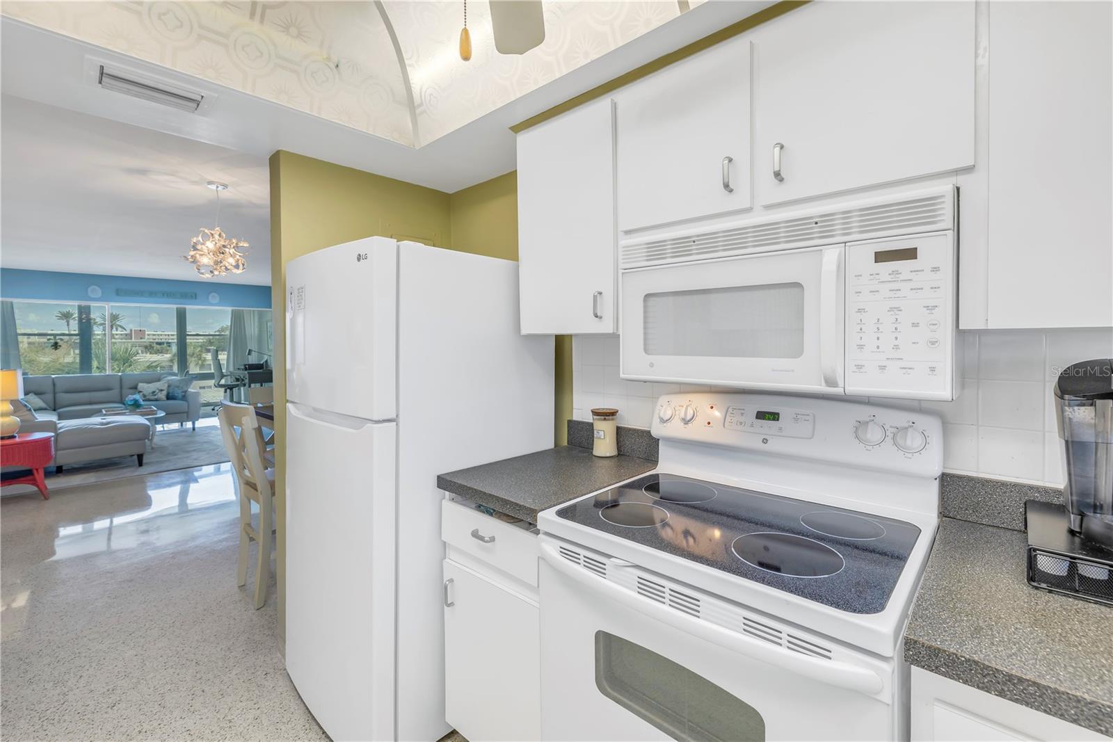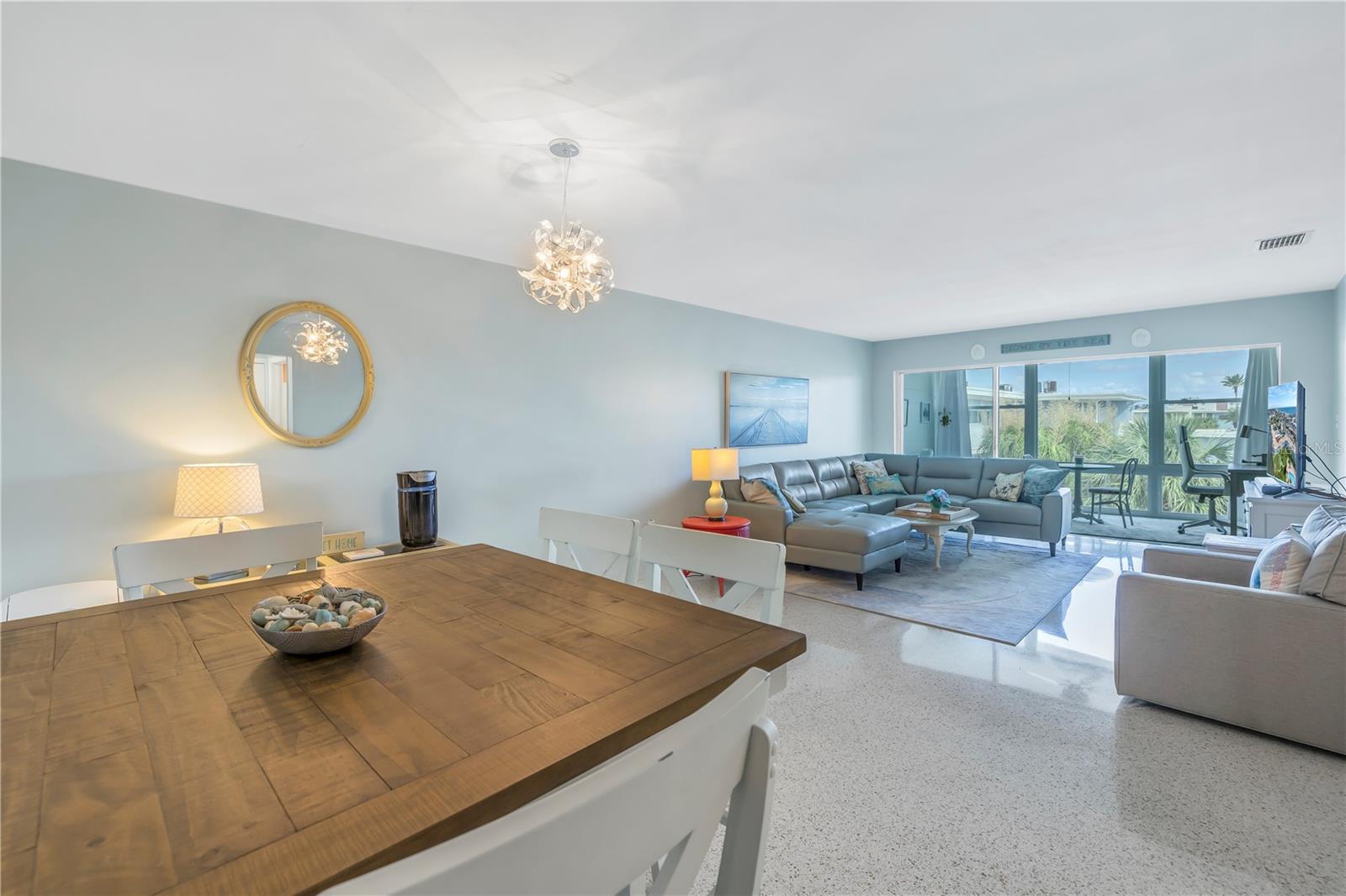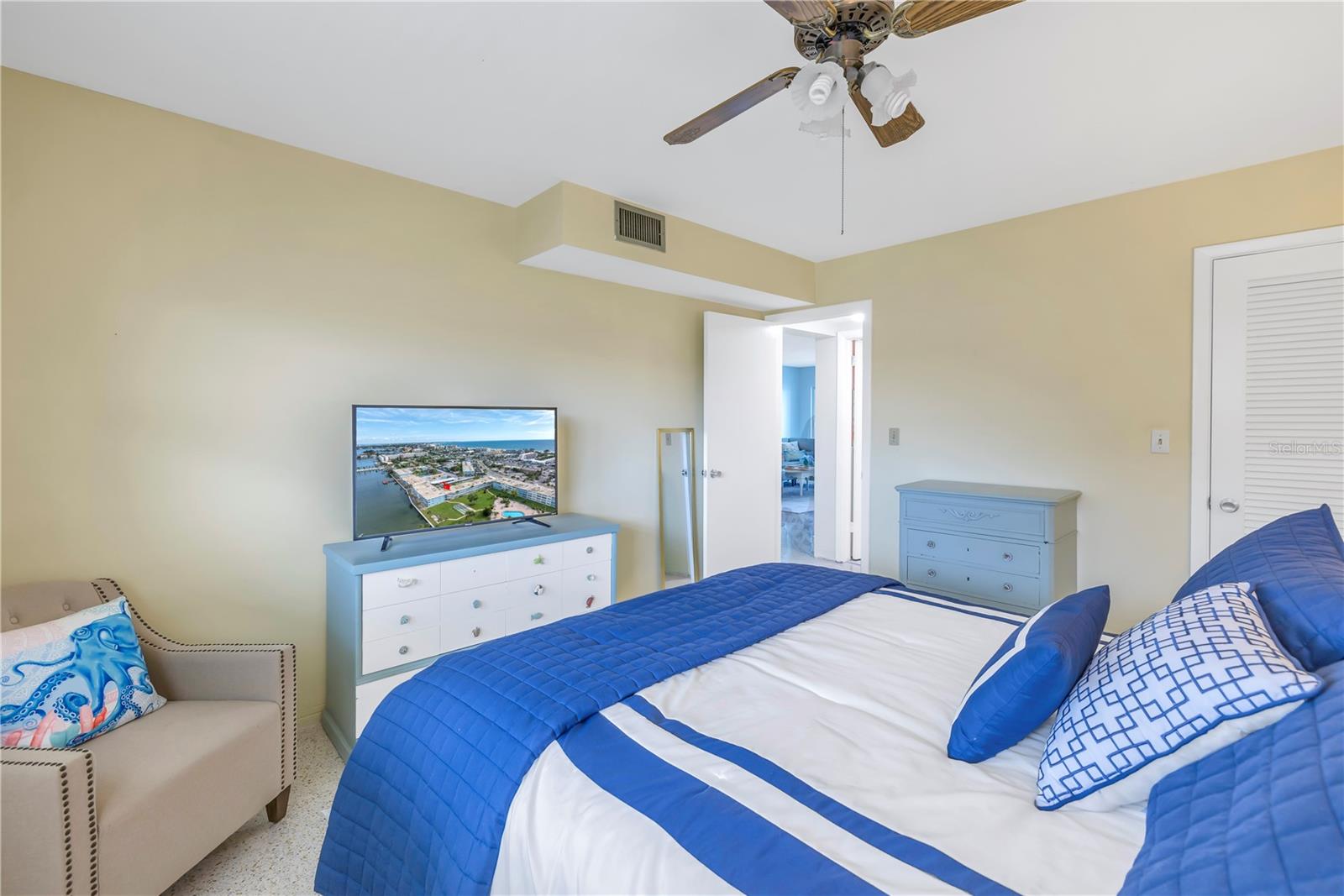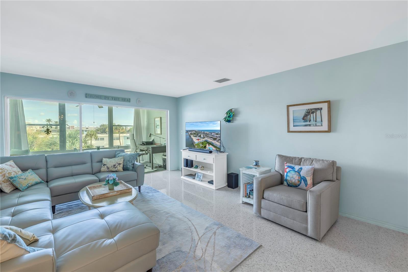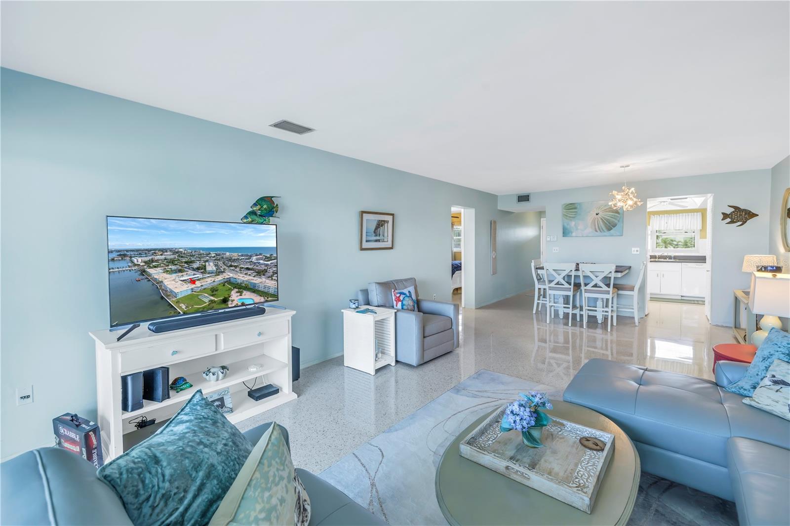 Welcome to Paradise says this very nicely updated turnkey 1 bed 1 bath condo. Beautifully polished terrazzo flows throughout the unit along with throw rugs to make it comfy and cozy. The condo is decorated with all new furniture that stays with the condo. It features a beautiful tall breakfast table and matching wood stools. There is a large sectional, coffee table and tv that looks out onto the large glassed in sunroom with new windows overlooking the wonderful courtyard setting. Inside is a spacious kitchen, with nice cabinets and appliances. There is a nice bathroom with tub and shower and a very large bedroom with a generous sized closet. Just outside the door is a laundry room, storage closet, elevator and stairs. Outside your front door is a nice view of the bay and boats and a straight shot to the pool and common ground. This condo is a short walk to Gulf Blvd and everything it has to offer with restaurants, shops, bars and more. This condo is across the street to the sugary sand of St Pete Beach. This condo is located a short drive from Treasure Island Beach and Gulfport and everything it has to offer downtown. You are minutes from Corey Avenue shopping district and a short drive to Pass a Grille Beach and Fort De Soto State Park. Last but not least this condo comes with a 1 Year Warranty for peace of mind. Buyers will love living in Paradise in their new beautifully decorated turnkey condo!