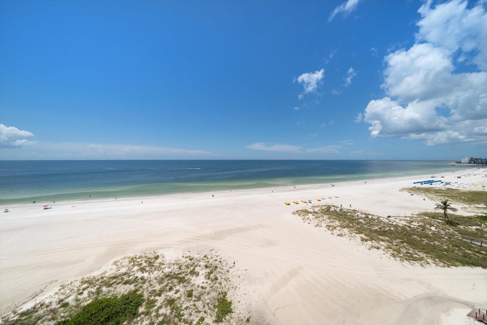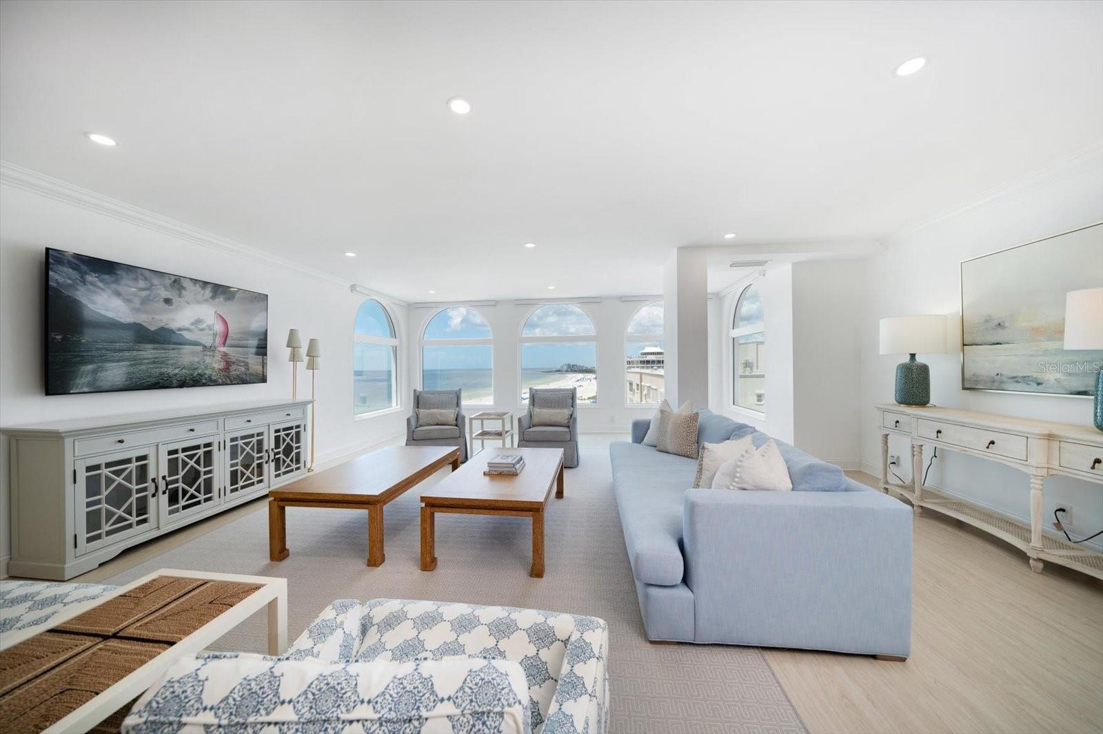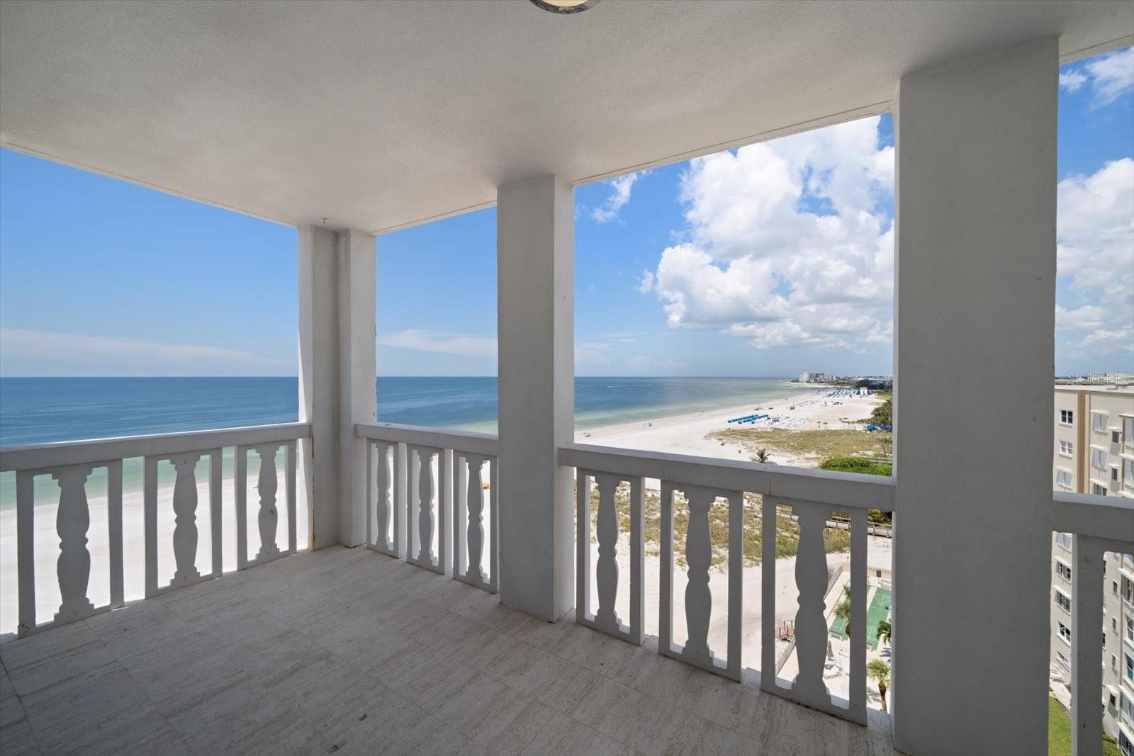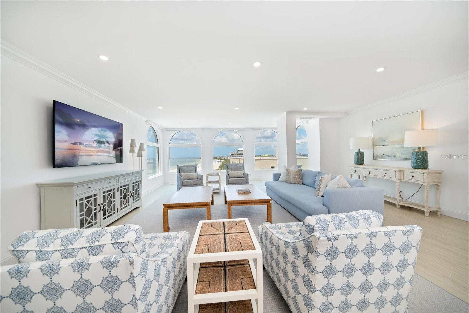 Discover the epitome of coastal luxury in this exquisite 4BR/4.5BA Gulf-front penthouse condo in the private and secure Beau Monde community on beautiful St. Pete Beach. Recently renovated with a respectful nod to its past grandeur, and attention to detail at every turn, this residence effortlessly blends classic elegance with modern sophistication. As you step inside, an expanse of arched windows instantly captivates, framing breathtaking views of white sand beaches and crystal-clear waters. The open floor plan invites you to a stunning kitchen, where custom tile work, stainless steel appliances, and a huge island with seating under sleek pendant lighting set the stage for culinary delights. Adjacent to this culinary haven, a catering kitchen/pantry and a large laundry room with a separate entrance add convenience and practicality to luxurious living. The versatile floor plan also includes a private suite, currently used as a game room and additional living space, complete with a spacious bedroom and ensuite bath—perfect as an in-law or nanny suite. The spacious dining and family rooms are bathed in natural light, offering expansive Gulf views that promise serene sunsets. Retreat to the primary bedroom, a sanctuary of comfort, with walls of arched windows offering endless vistas of both the Intracoastal Waterway and the Gulf of Mexico. The spa-like ensuite features double sink vanities, abundant storage, a huge walk-in shower, and an oversized walk-in closet with custom shelving. The additional bedrooms are equally impressive, beautifully appointed with custom closets and tastefully designed bathrooms, ensuring comfort for every guest. This recently renovated complex includes a fitness center, two tennis/pickleball courts, BBQ and picnic areas, and a heated community pool. Conveniently located near shopping, local restaurants, and two airports, this residence offers a living experience steeped in luxury, enveloped by the tranquil azure waters and spectacular sunsets that have become the signature of this esteemed community.