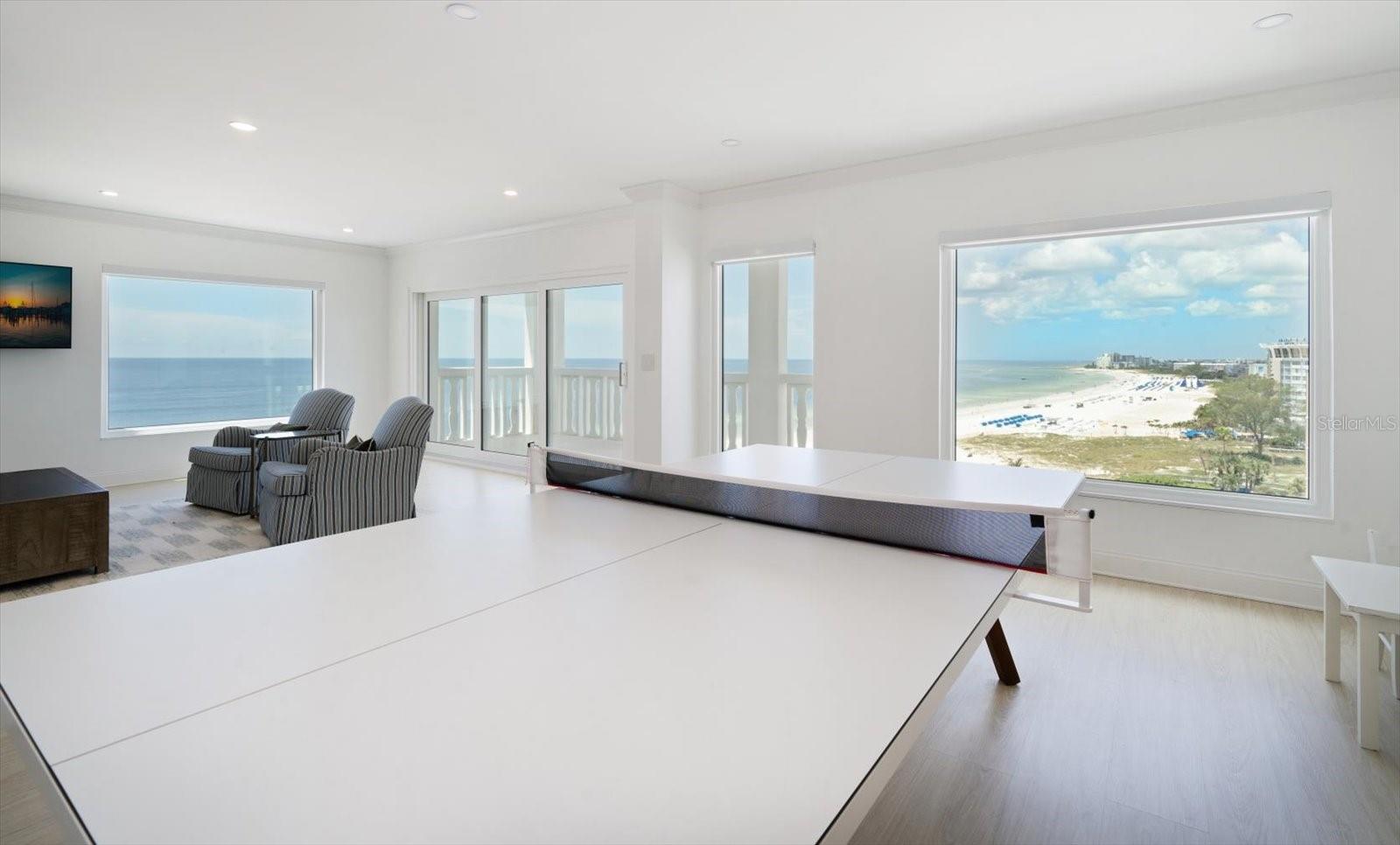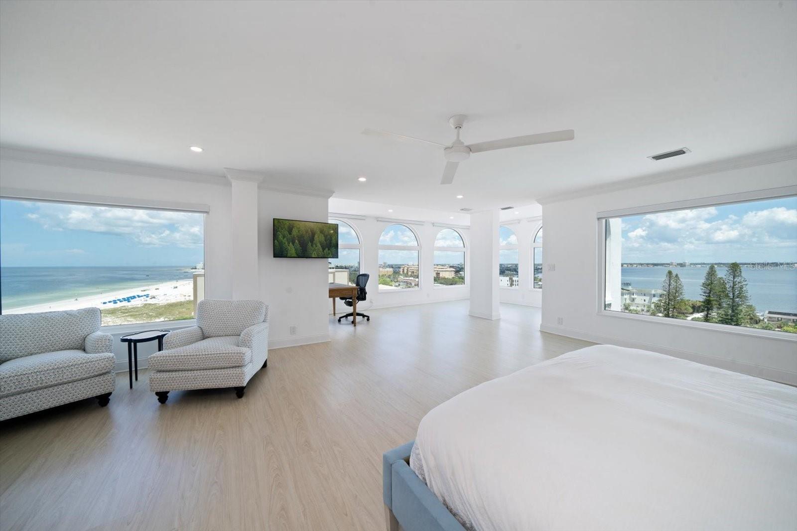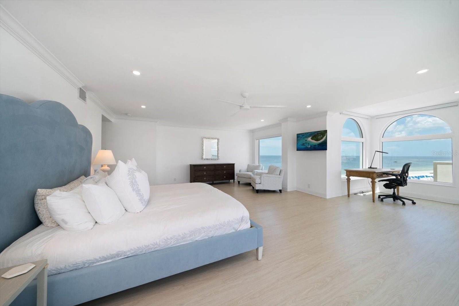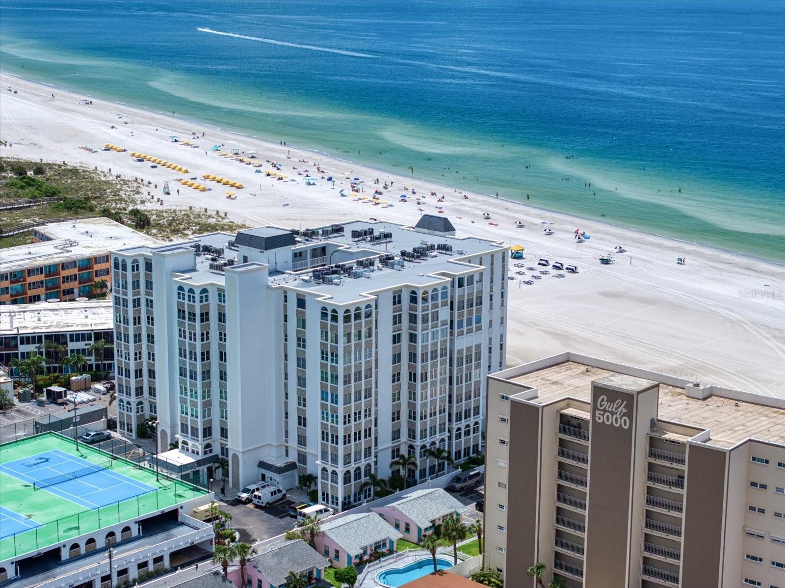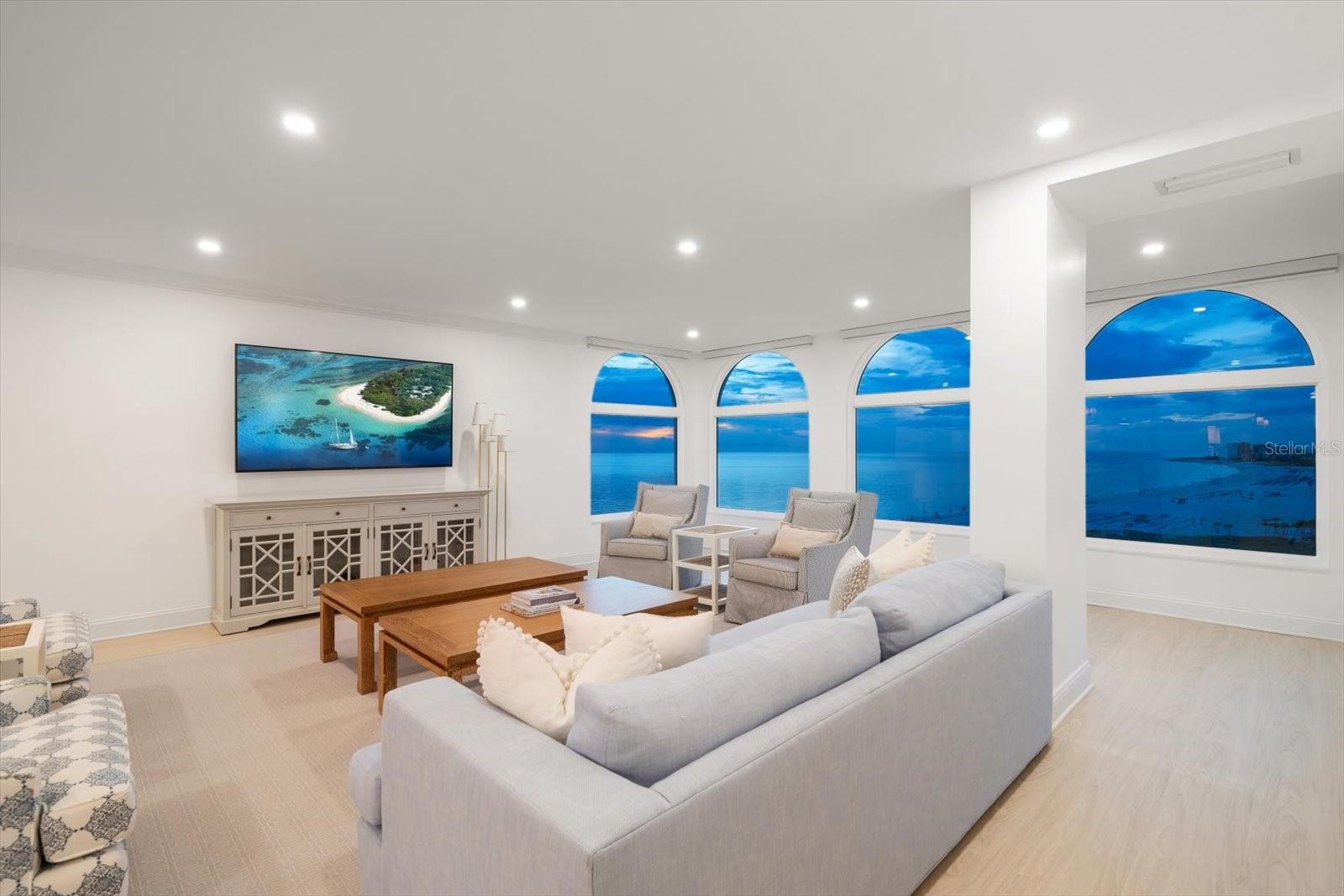 Discover the epitome of coastal luxury in this exquisite 4BR/4.5BA Gulf-front penthouse condo in the private and secure Beau Monde community on beautiful St. Pete Beach. Recently renovated with a respectful nod to its past grandeur, and attention to detail at every turn, this residence effortlessly blends classic elegance with modern sophistication. As you step inside, an expanse of arched windows instantly captivates, framing breathtaking views of white sand beaches and crystal-clear waters. The open floor plan invites you to a stunning kitchen, where custom tile work, stainless steel appliances, and a huge island with seating under sleek pendant lighting set the stage for culinary delights. Adjacent to this culinary haven, a catering kitchen/pantry and a large laundry room with a separate entrance add convenience and practicality to luxurious living. The versatile floor plan also includes a private suite, currently used as a game room and additional living space, complete with a spacious bedroom and ensuite bath—perfect as an in-law or nanny suite. The spacious dining and family rooms are bathed in natural light, offering expansive Gulf views that promise serene sunsets. Retreat to the primary bedroom, a sanctuary of comfort, with walls of arched windows offering endless vistas of both the Intracoastal Waterway and the Gulf of Mexico. The spa-like ensuite features double sink vanities, abundant storage, a huge walk-in shower, and an oversized walk-in closet with custom shelving. The additional bedrooms are equally impressive, beautifully appointed with custom closets and tastefully designed bathrooms, ensuring comfort for every guest. This recently renovated complex includes a fitness center, two tennis/pickleball courts, BBQ and picnic areas, and a heated community pool. Conveniently located near shopping, local restaurants, and two airports, this residence offers a living experience steeped in luxury, enveloped by the tranquil azure waters and spectacular sunsets that have become the signature of this esteemed community.