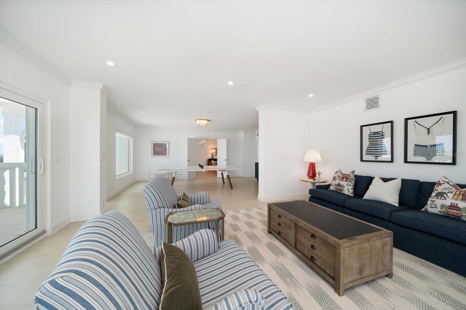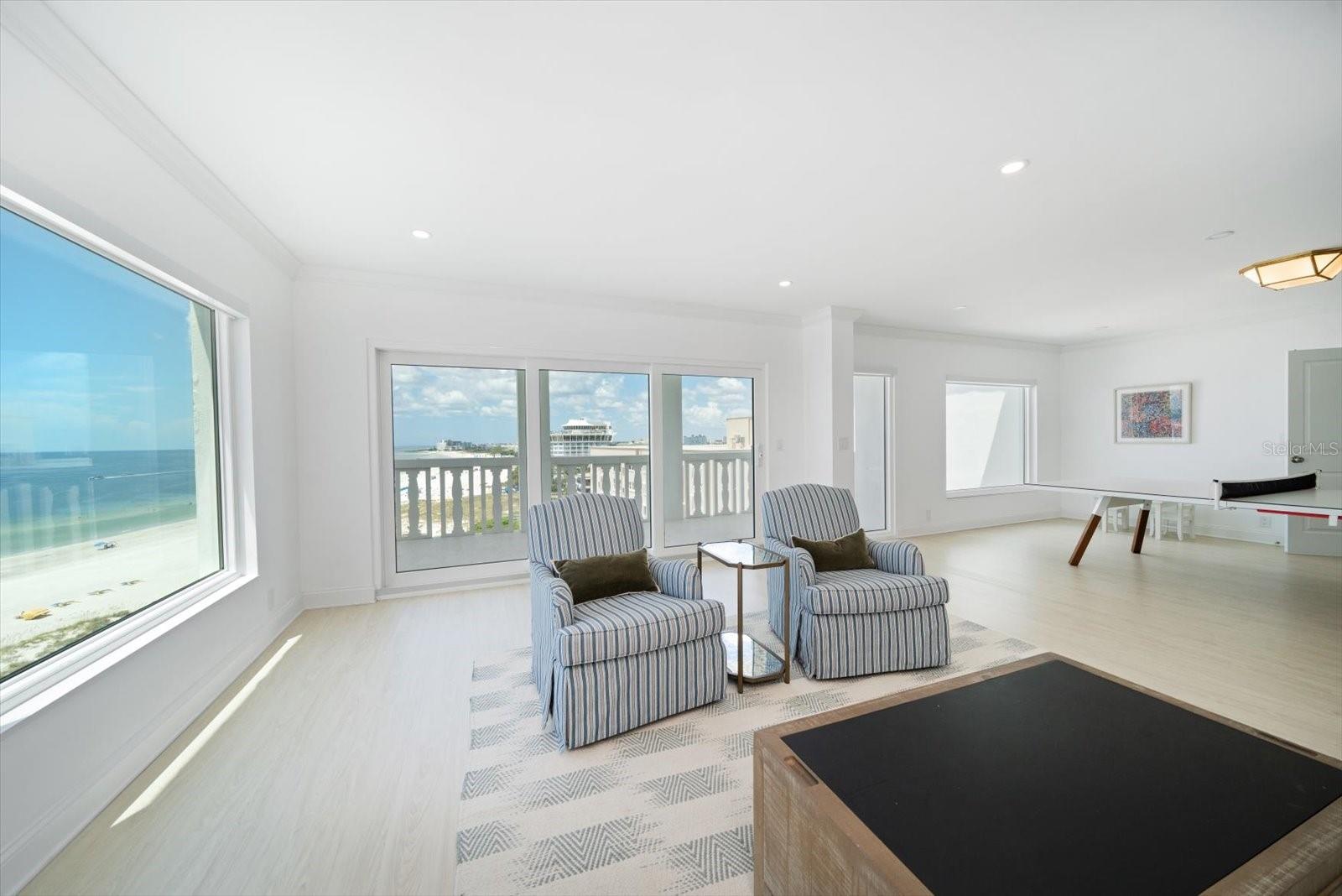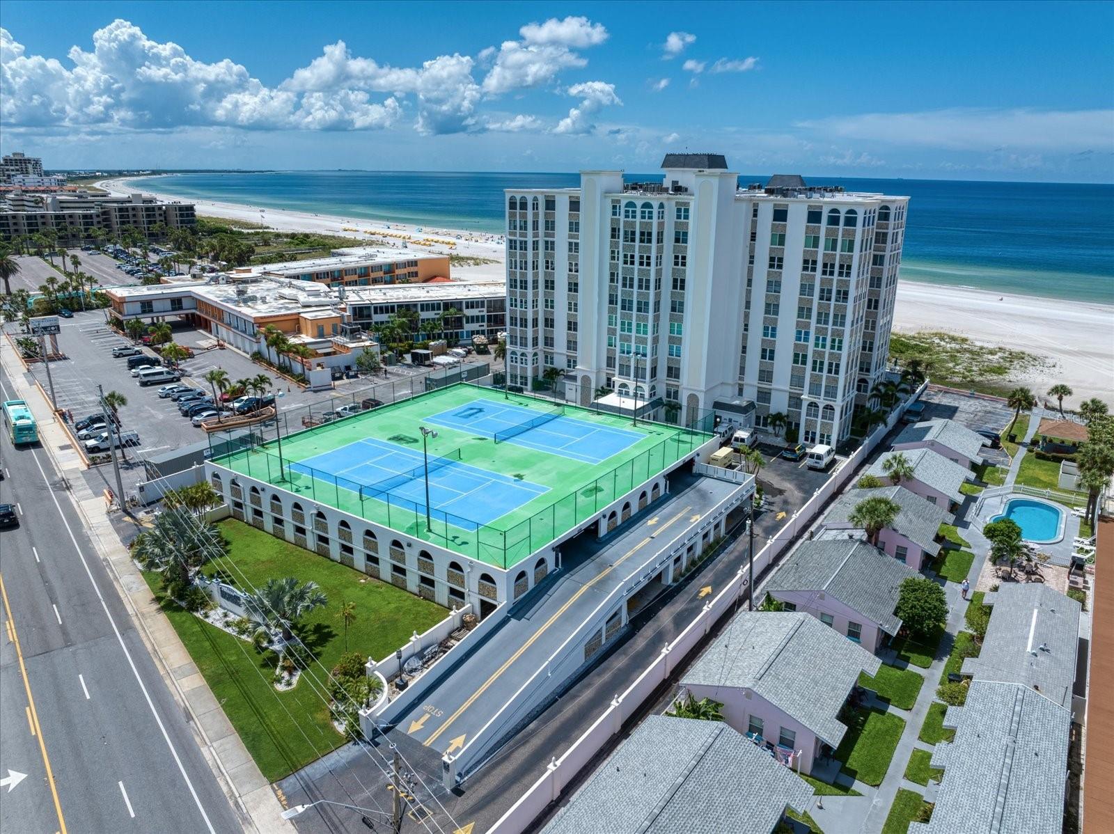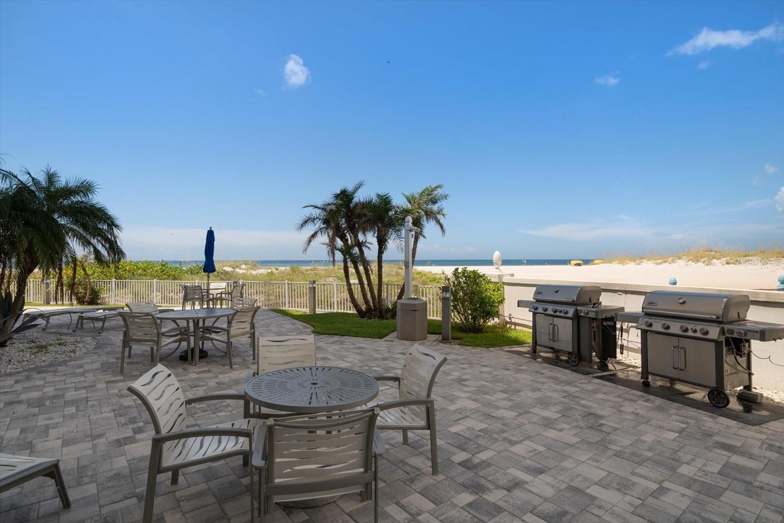 Discover the epitome of coastal luxury in this exquisite 4BR/4.5BA Gulf-front penthouse condo in the private and secure Beau Monde community on beautiful St. Pete Beach. Recently renovated with a respectful nod to its past grandeur, and attention to detail at every turn, this residence effortlessly blends classic elegance with modern sophistication. As you step inside, an expanse of arched windows instantly captivates, framing breathtaking views of white sand beaches and crystal-clear waters. The open floor plan invites you to a stunning kitchen, where custom tile work, stainless steel appliances, and a huge island with seating under sleek pendant lighting set the stage for culinary delights. Adjacent to this culinary haven, a catering kitchen/pantry and a large laundry room with a separate entrance add convenience and practicality to luxurious living. The versatile floor plan also includes a private suite, currently used as a game room and additional living space, complete with a spacious bedroom and ensuite bath—perfect as an in-law or nanny suite. The spacious dining and family rooms are bathed in natural light, offering expansive Gulf views that promise serene sunsets. Retreat to the primary bedroom, a sanctuary of comfort, with walls of arched windows offering endless vistas of both the Intracoastal Waterway and the Gulf of Mexico. The spa-like ensuite features double sink vanities, abundant storage, a huge walk-in shower, and an oversized walk-in closet with custom shelving. The additional bedrooms are equally impressive, beautifully appointed with custom closets and tastefully designed bathrooms, ensuring comfort for every guest. This recently renovated complex includes a fitness center, two tennis/pickleball courts, BBQ and picnic areas, and a heated community pool. Conveniently located near shopping, local restaurants, and two airports, this residence offers a living experience steeped in luxury, enveloped by the tranquil azure waters and spectacular sunsets that have become the signature of this esteemed community.