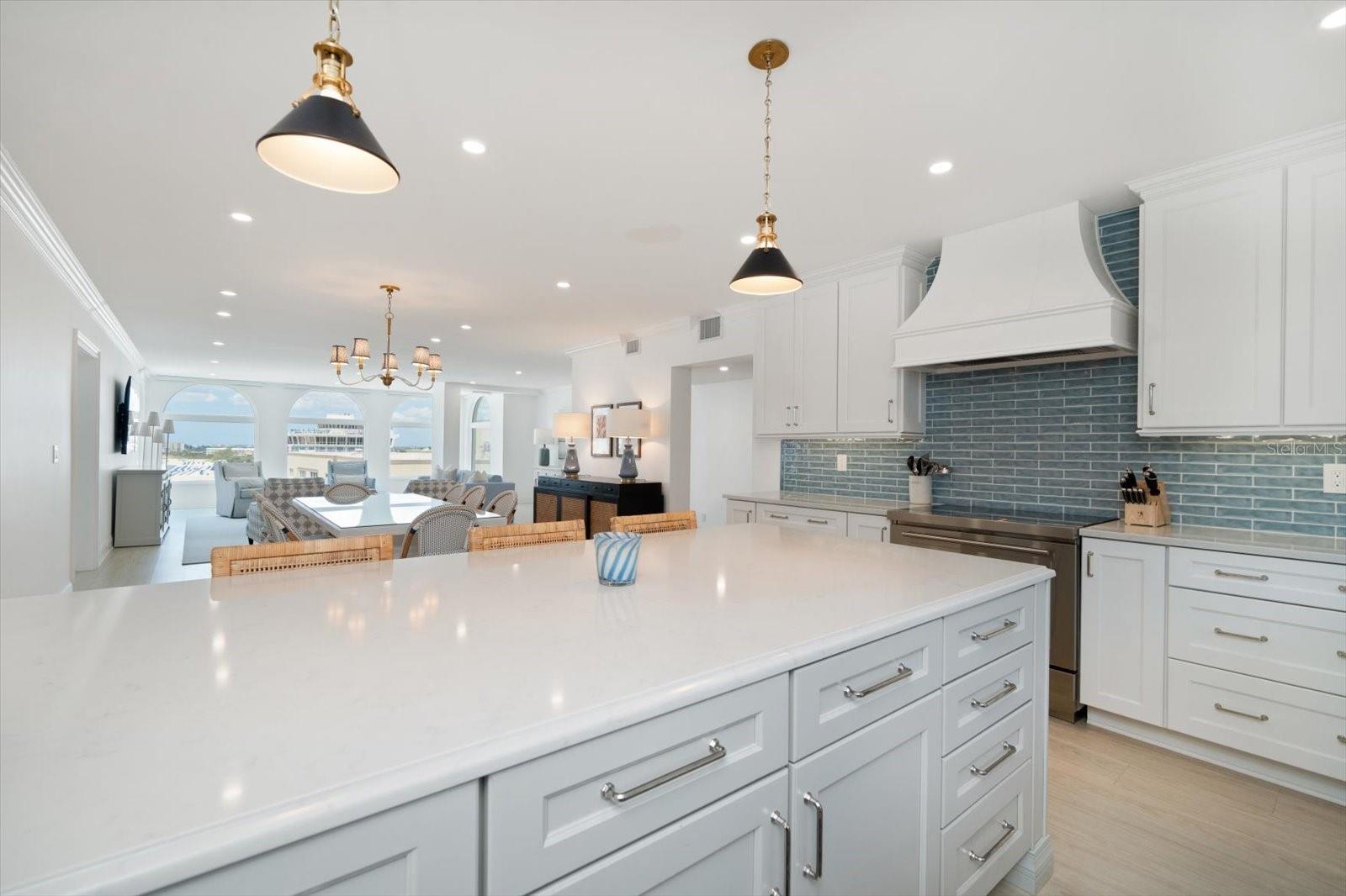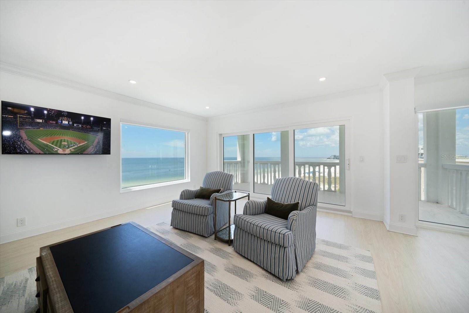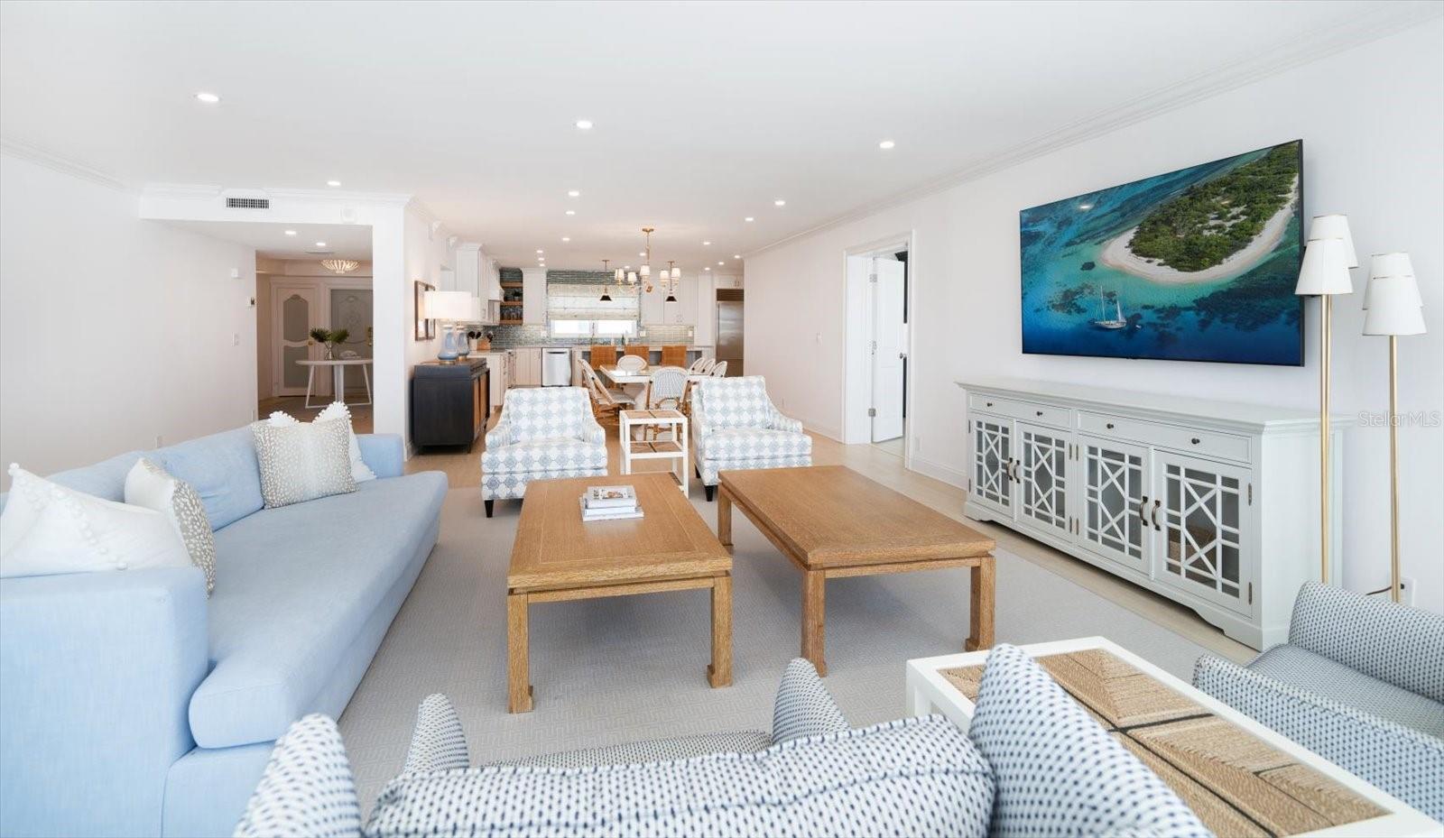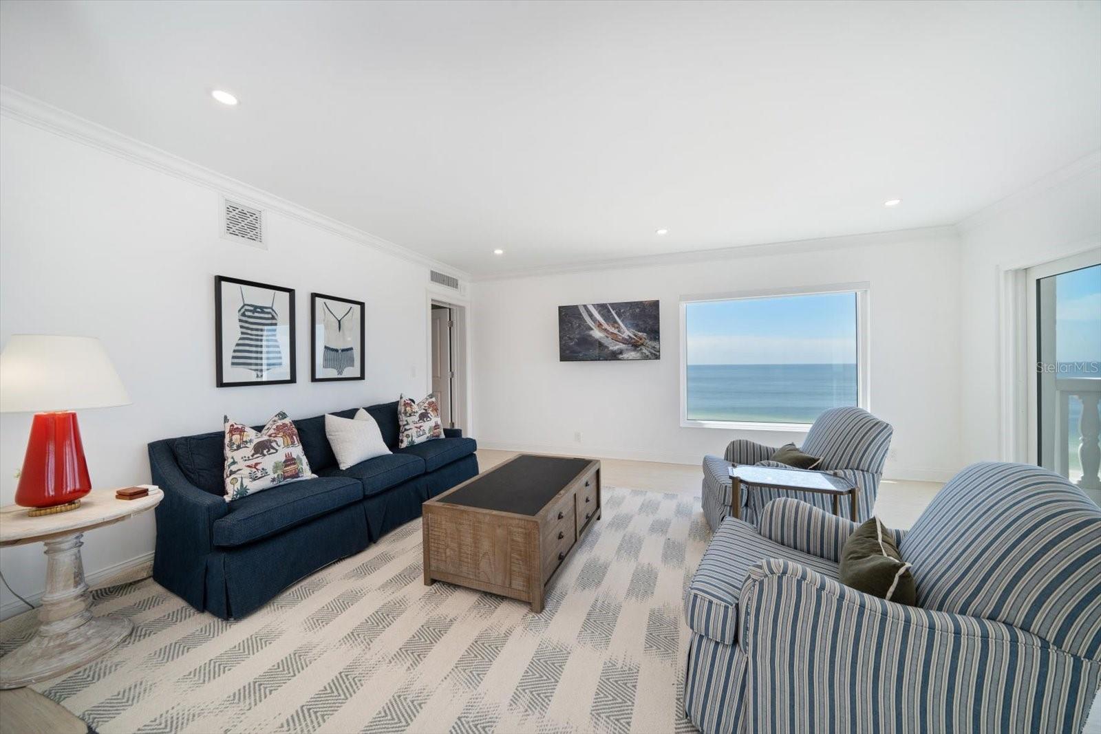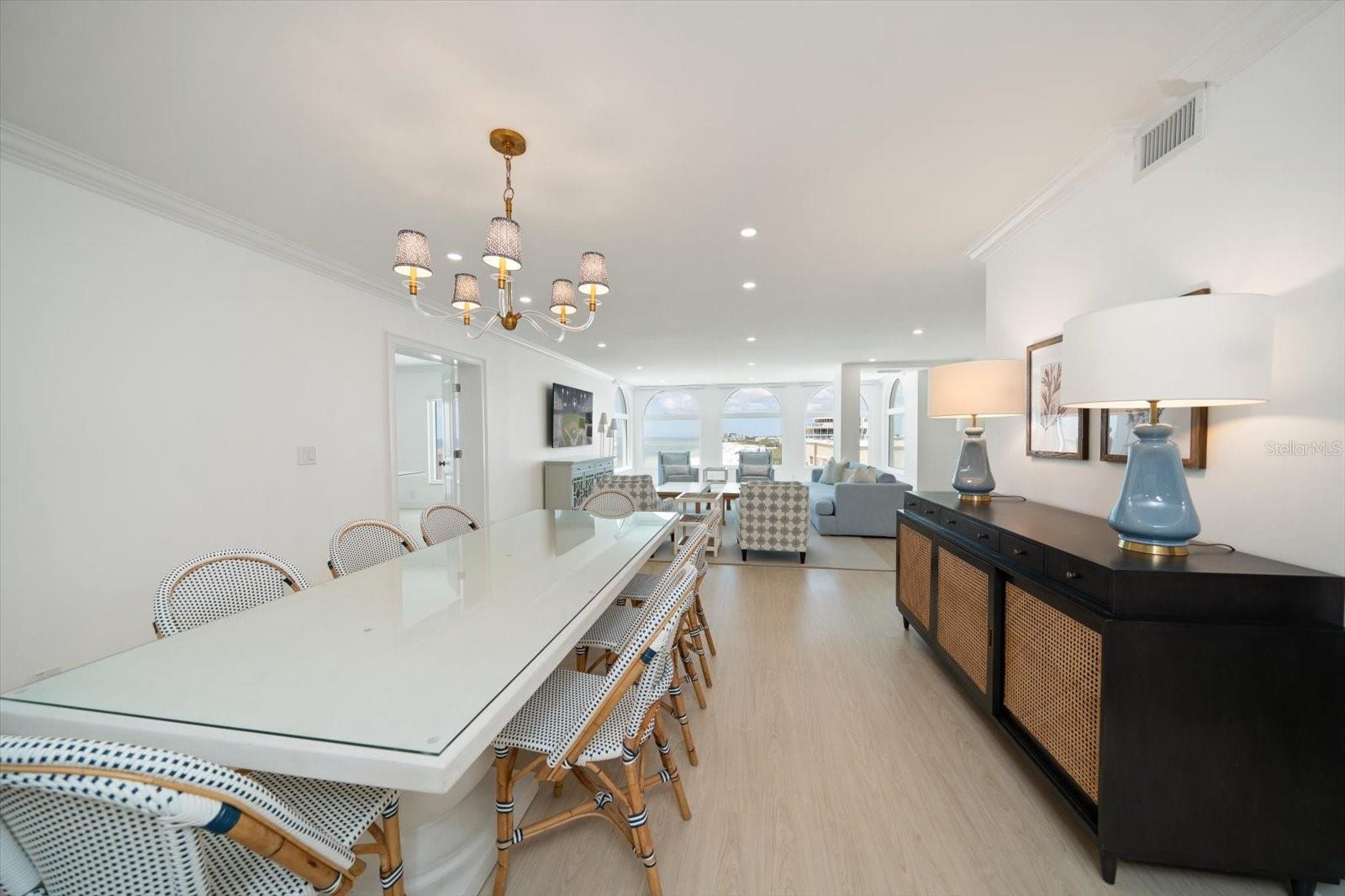 Discover the epitome of coastal luxury in this exquisite 4BR/4.5BA Gulf-front penthouse condo in the private and secure Beau Monde community on beautiful St. Pete Beach. Recently renovated with a respectful nod to its past grandeur, and attention to detail at every turn, this residence effortlessly blends classic elegance with modern sophistication. As you step inside, an expanse of arched windows instantly captivates, framing breathtaking views of white sand beaches and crystal-clear waters. The open floor plan invites you to a stunning kitchen, where custom tile work, stainless steel appliances, and a huge island with seating under sleek pendant lighting set the stage for culinary delights. Adjacent to this culinary haven, a catering kitchen/pantry and a large laundry room with a separate entrance add convenience and practicality to luxurious living. The versatile floor plan also includes a private suite, currently used as a game room and additional living space, complete with a spacious bedroom and ensuite bath—perfect as an in-law or nanny suite. The spacious dining and family rooms are bathed in natural light, offering expansive Gulf views that promise serene sunsets. Retreat to the primary bedroom, a sanctuary of comfort, with walls of arched windows offering endless vistas of both the Intracoastal Waterway and the Gulf of Mexico. The spa-like ensuite features double sink vanities, abundant storage, a huge walk-in shower, and an oversized walk-in closet with custom shelving. The additional bedrooms are equally impressive, beautifully appointed with custom closets and tastefully designed bathrooms, ensuring comfort for every guest. This recently renovated complex includes a fitness center, two tennis/pickleball courts, BBQ and picnic areas, and a heated community pool. Conveniently located near shopping, local restaurants, and two airports, this residence offers a living experience steeped in luxury, enveloped by the tranquil azure waters and spectacular sunsets that have become the signature of this esteemed community.