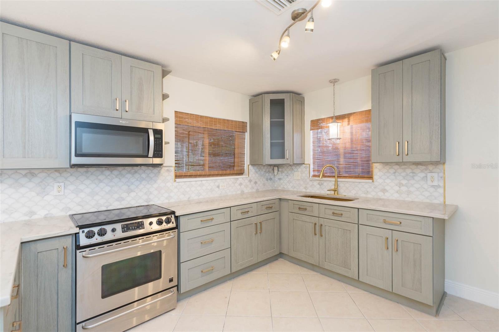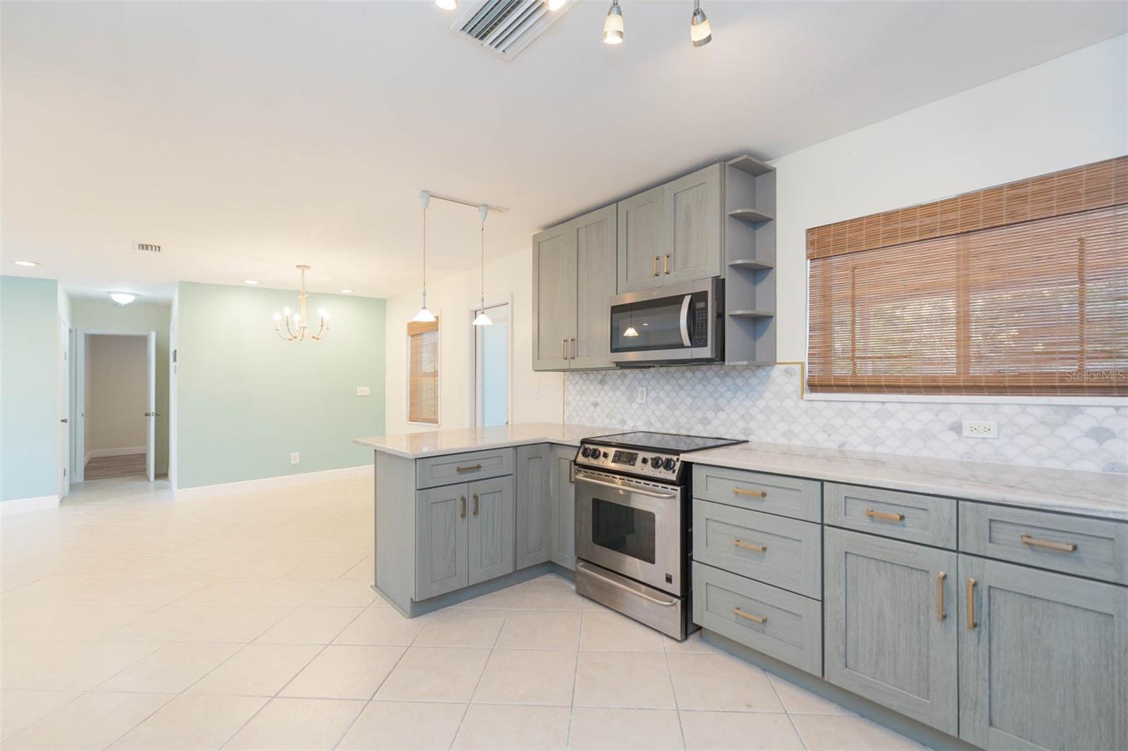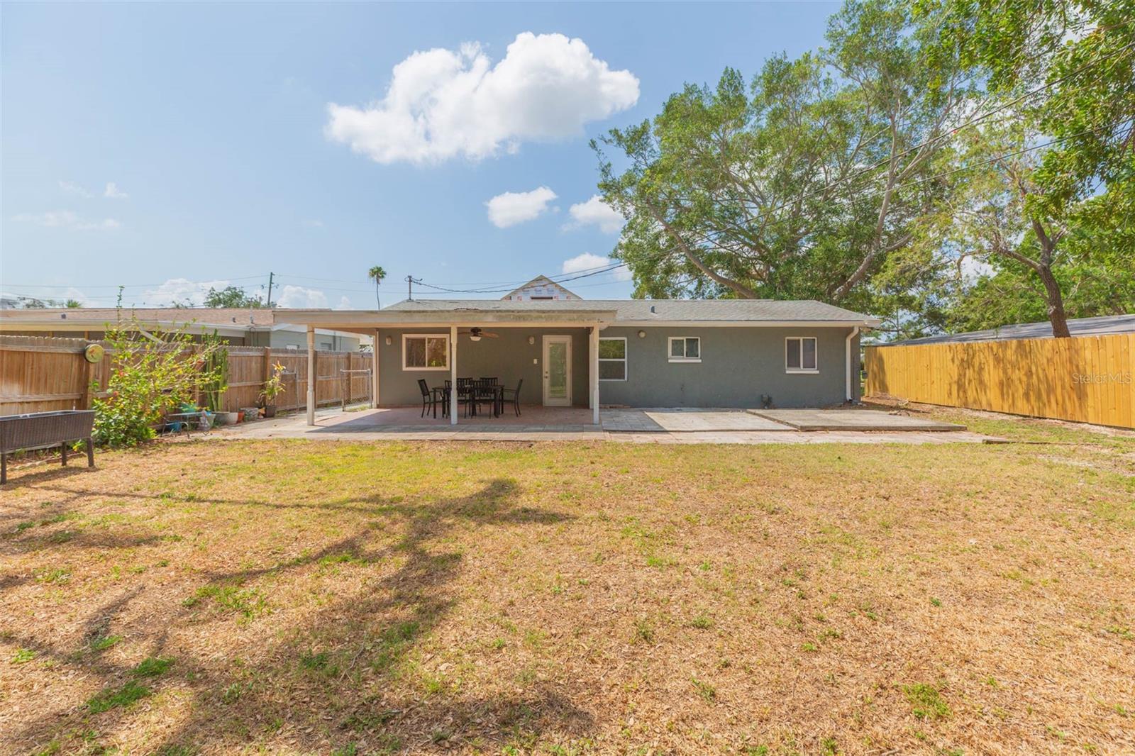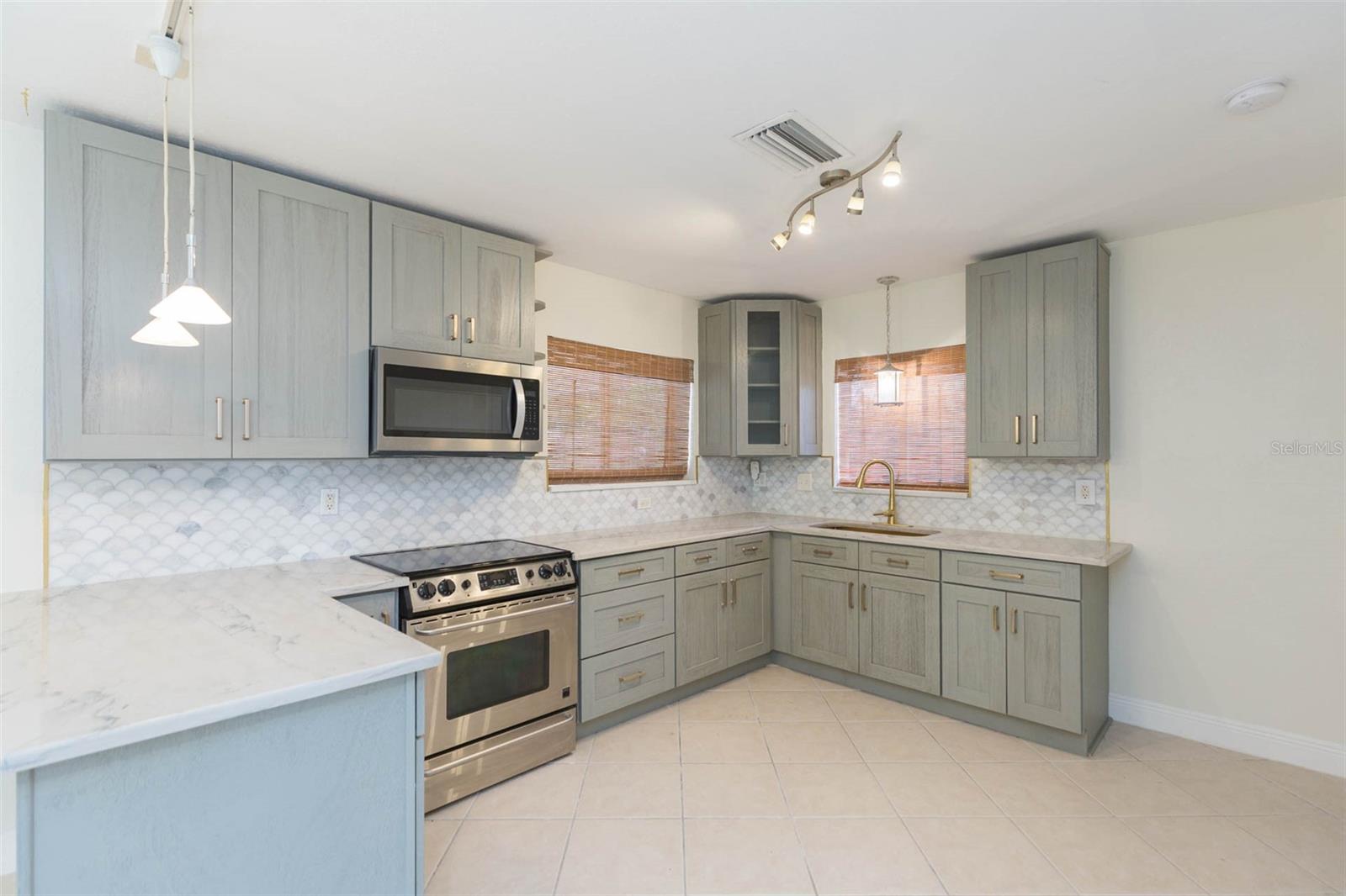 Tastefully Renovated Concrete Block Home in Beautiful Riviera Bay! Nestled on a quiet dead-end street, this beautifully updated concrete block home sits on an oversized lot in the desirable Riviera Bay neighborhood. A newer roof adds peace of mind, while the spacious, open-concept kitchen boasts modern grey cabinetry, a stylish backsplash, and luxurious quartz countertops. The large kitchen island features an undermount sink, upgraded faucet, and elegant pendant lighting—perfect for entertaining. Neutral tones complement the diagonal tile flooring, 5-inch baseboards, and abundant recessed lighting that enhance the bright, inviting living space. The renovated bathroom features a sleek new vanity, updated mirror, and a tiled tub that reaches the ceiling for a contemporary look. Step outside to enjoy your private, fully fenced backyard complete with a tranquil covered patio—ideal for relaxing or hosting guests. Don’t miss your chance to own this move-in ready gem in Riviera Bay. Schedule your private showing today!