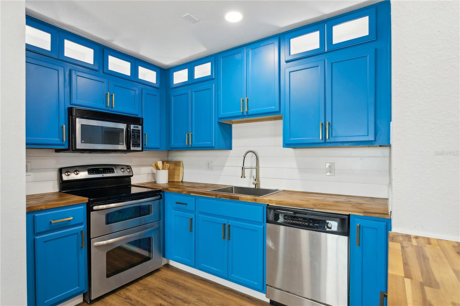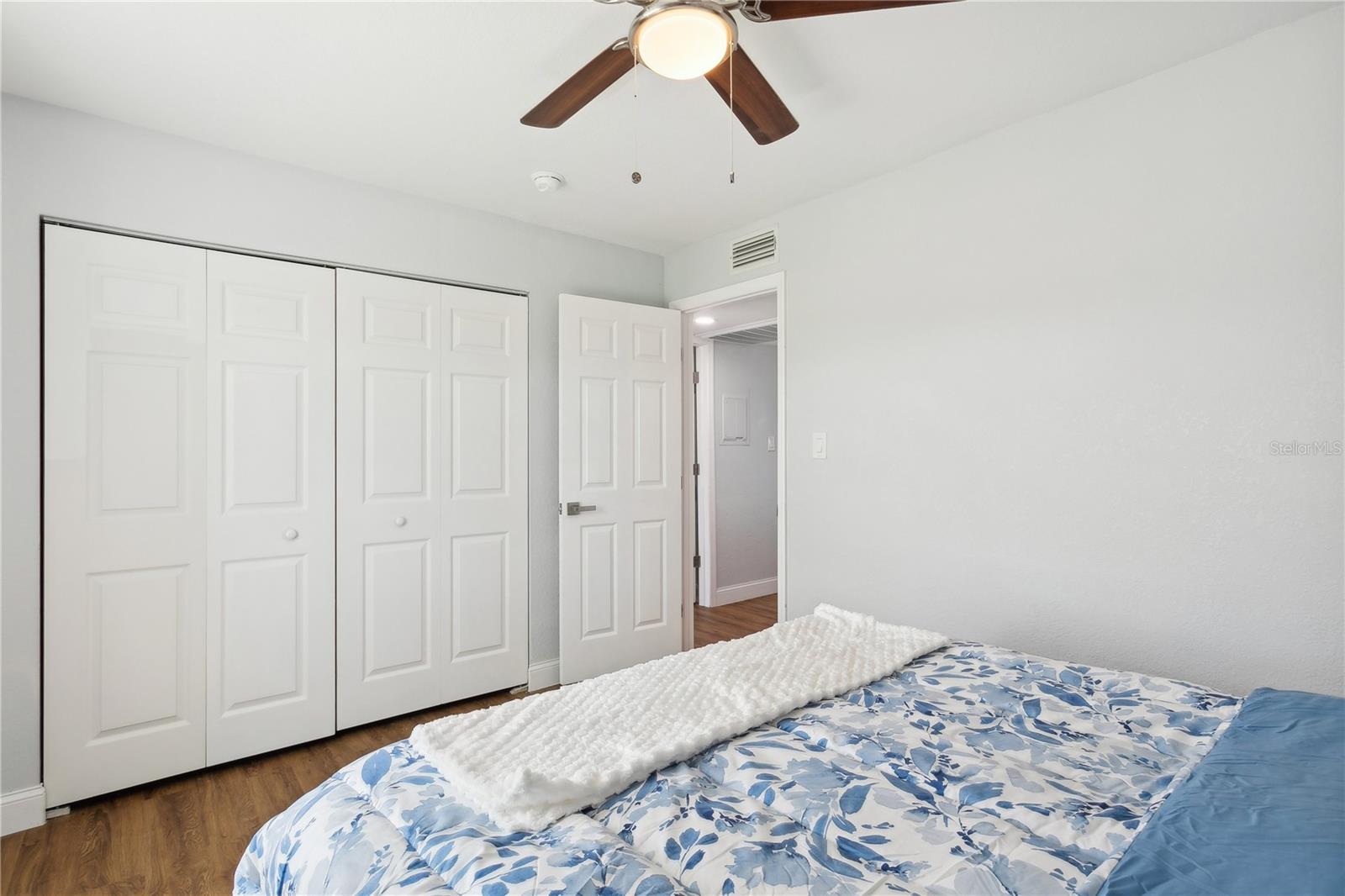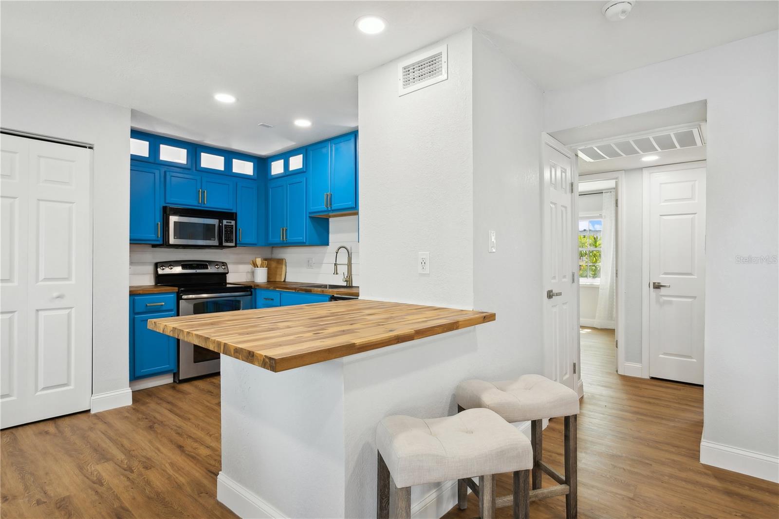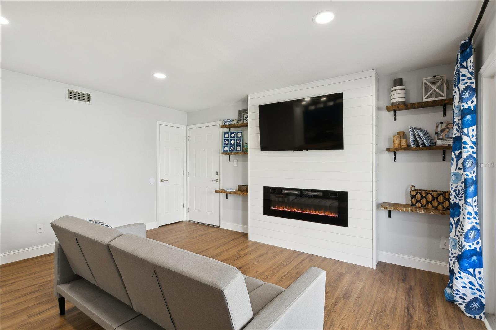 Come fall in love with this Waterfront FULLY RENOVATED GROUND FLOOR unit. This GROUND FLOOR unit comes FURNISHED and ready to occupy or rent out for the busy snowbird season around the corner. The building was recently painted on the exterior, and the interior has been beautifully renovated. The kitchen features designer color BLUE cabinets with GOLD ACCENTS and a SHIPLAP BACKSPLASH. This is paired with a rick honey colored 1.5” THICK ACACIA WOOD BUTCHER BLOCK countertop and 10" deep kitchen sink made of premium 16 gauge thick T-304(18/10) stainless steel. There’s also a NEW STAINLESS STEEL REFRIGERATOR, a DOUBLE OVEN, and a NEW MICROWAVE. Additionally, LIGHTED UPPER CABINETS make the space feel airy and bright. The kitchen outlet at the newly designed island has been updated with a USB adaptive plug, so you can plug in your phone or other USB devices conveniently. The unit features new water resistant LUXURY VINYL PLANK flooring throughout, along with ELEGANT 5 ¼” BASEBOARDS everywhere. The walls have been painted Olympus White and a SHIPLAP FIREPLACE has been CUSTOM DESIGNED for the space. The fireplace build out is flanked by wood shelving, the bottom of which is set to desk height to allow for addition of chairs and use as a laptop workstation. The bathroom has NEW TILE, FIXTURES, MIRROR, VANITY, TOILET, AND LIGHTING; along with a decorative shiplap and boat cleat accent that allows hanging of 6 towels so that all your guests will have a spot of their own. The fan in the bathroom also features a BUILT IN BLUETOOTH SPEAKER, so just connect with your phone and you’ll be singing in the shower to your favorite music. The master bedroom has a SHIPLAP ACCENT WALL and the second bedroom, with it’s beach cabana theme, has been designed to allow for two full beds so that you can sleep 4 comfortably in the second bedroom. Outside, you’ll love the OVERSIZED PATIO. Seriously, it’s huge, the photos don’t do it justice. And, the best part is the location on the water. Located at the end of the length of the pond allows for the LONGEST WATER VIEWS possible. You’ll love the vast views of water and wildlife from your patio, and from the large window in the kitchen and the 3 glass doors in the living room. The view is unforgettable, especially when you SEE IT AT SUNSET. Also, the unit has it’s own stackable WASHER AND DRYER, no need to head to the laundry room! Sold FULLY FURNISHED AND EQUIPPED. Now on to the community amenities… The condo fee includes Spectrum TV & internet, common area maintenance, insurance, water, trash, sewer and secure gated entry. Enjoy tennis, pickleball, swimming in the heated pool, lush landscaped grounds which offer acres to walk your dog around the pet-friendly community, dog park, and fitness center. Additionally, while this unit pays lower fees than sister community Waterside South, it does come with the use of all Waterside South amenities (clubhouse, hot tub, pools (heated in Winter), spas, fitness center, volleyball, shuffleboard, golf practice area, dog park, pub, etc) at nearby Waterside at Coquina Key South only 5 minutes away You are allowed short term rentals 3x/year less than 30 days; and no limit on rentals over 30 days.