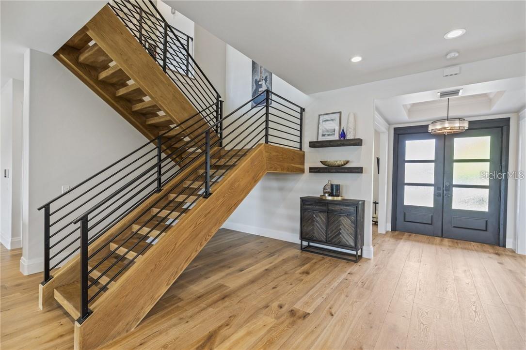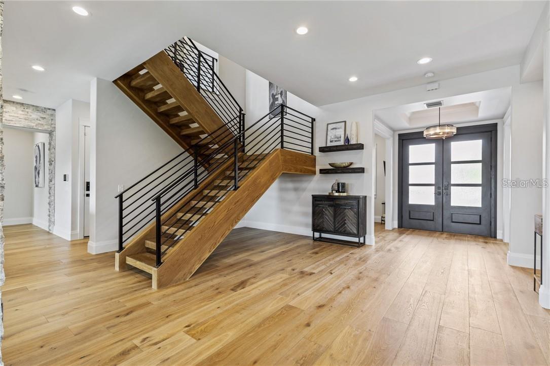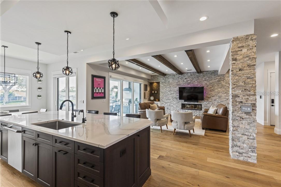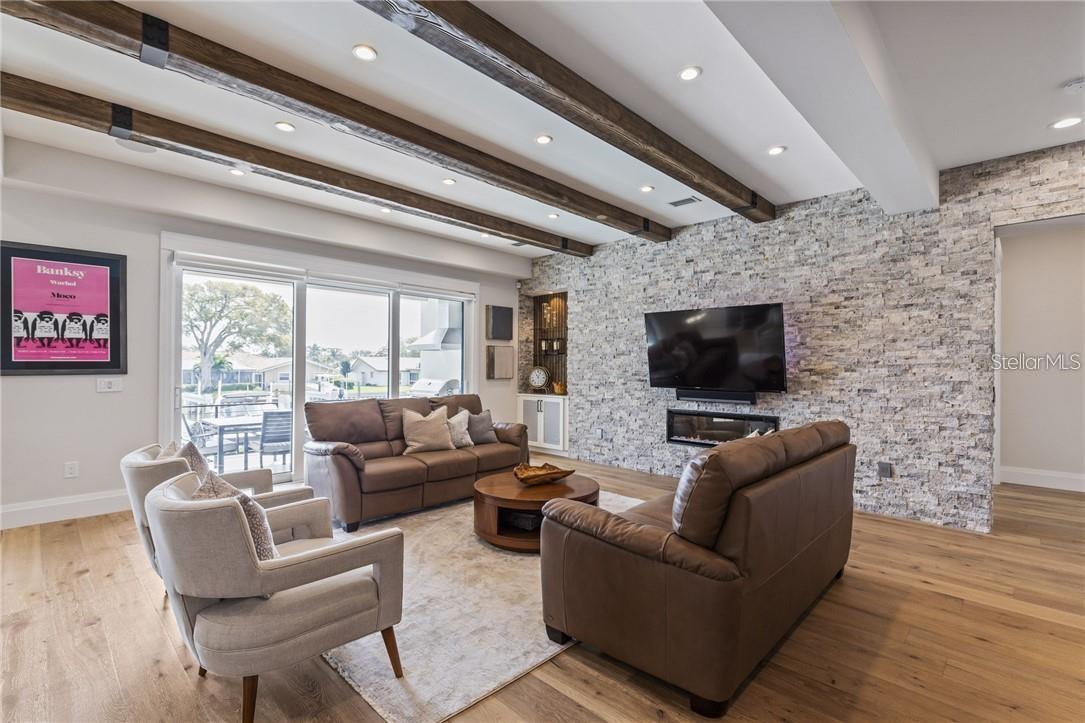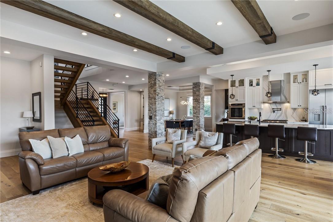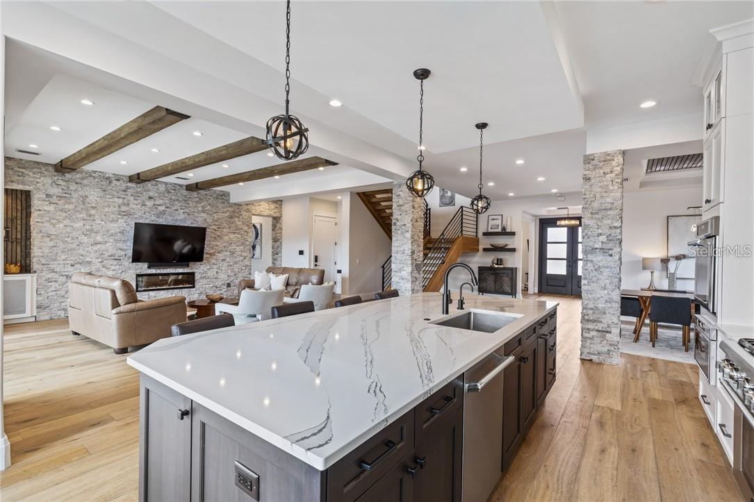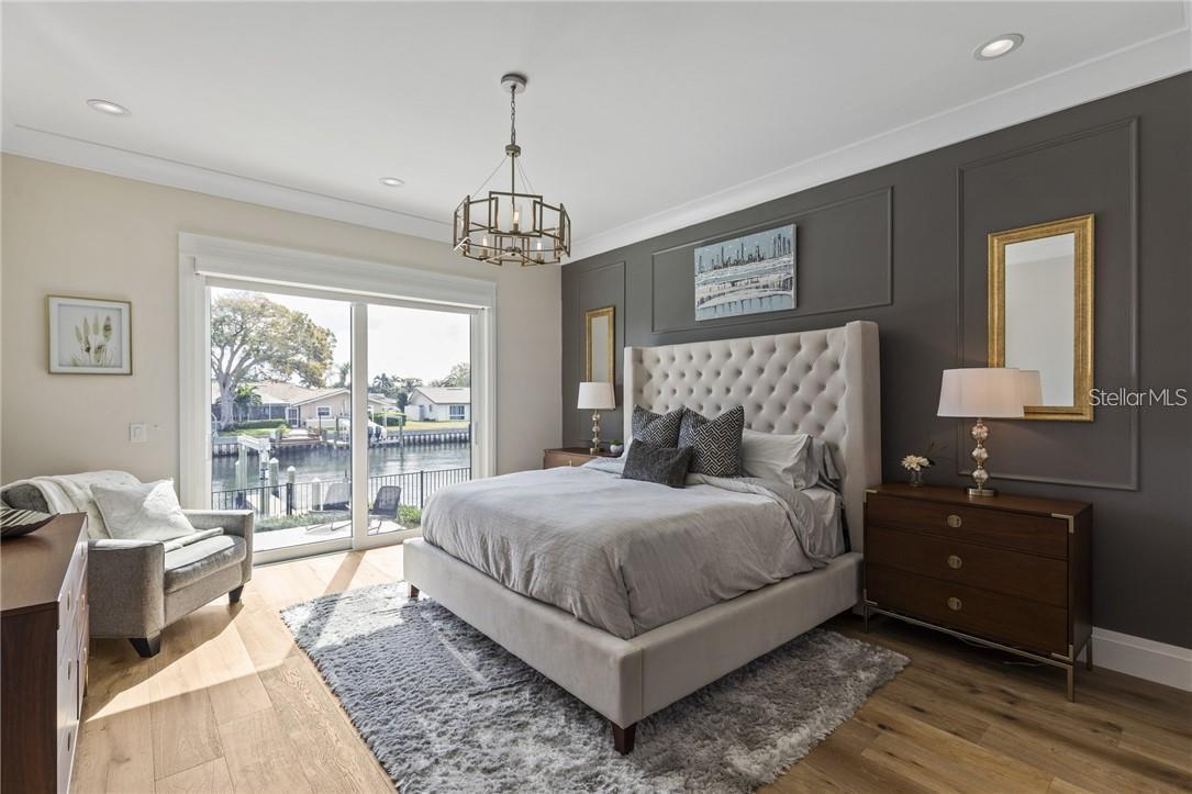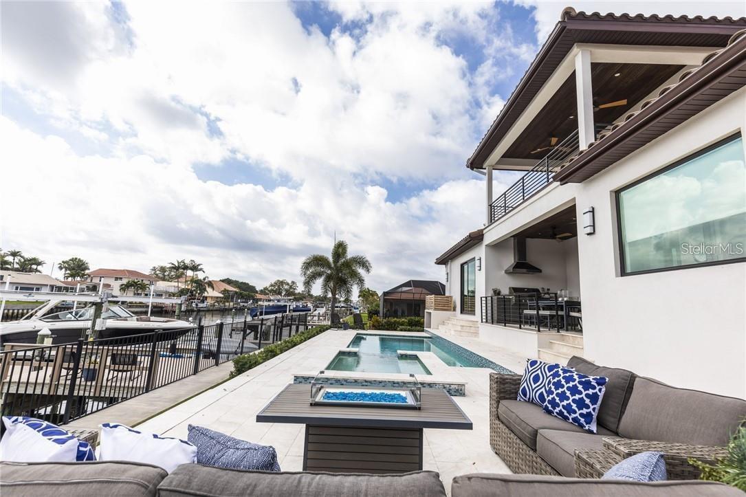 A spectacular custom waterfront estate with a clean California Modern design, this exceptional home stands out in one of St. Petersburg’s most sought-after neighborhoods. Built with an impressive level of detail and craftsmanship, it offers a rare combination of style, comfort, and functionality. Don't miss the video walk-thru: vimeo.com/1172020405 The front exterior makes a strong first impression with extensive stonework, a marble walkway, and custom composite wood Eden Coast 3-car garage doors. Inside, the open-concept layout is enhanced by 8-inch wide French oak flooring throughout and airy 10-foot ceilings. Just beyond the home office with custom built-ins, architectural columns with modern stone accents add character and definition to the main living space. The kitchen is thoughtfully designed with Cambria Britannica countertops, KitchenCraft cabinetry, Thermador appliances, and matte black finishes. An oversized walk-in pantry and butler’s pantry with a sink and wine refrigerator provide excellent prep and storage space. The large one-piece quartz island seats five comfortably, with additional room for dining in the breakfast area. The great room features wood ceiling beams, a striking stone accent wall, and built-in cabinetry with custom wood paneling that continues into the dining room ceiling, creating a cohesive and polished look. The first-floor primary suite offers water views and a private bath entered through custom barn doors. The bathroom includes floor-to-ceiling marble tile, a soaking tub, a large walk-in shower, and matte black fixtures. The spacious 16.5' x 7' walk-in closet is paired with a private laundry room in the suite, and there is an additional laundry room upstairs. Motorized blinds add everyday convenience throughout the home. Upstairs, the custom oak staircase with open risers, iron railing, and statement chandelier leads to a large loft area. Through the 8-foot sliders, the balcony offers beautiful Tampa Bay views along with marble flooring and wood-beamed ceilings. The second level also includes four oversized bedrooms with French oak flooring and three full bathrooms finished with marble floors, designer tile, and quartz countertops. The outdoor living area is equally well designed. Hurricane-rated 8-foot sliding doors open to a covered outdoor kitchen with custom granite counters, weatherproof cabinetry, a 38-inch stainless Delta Heat grill with hood, and a beverage center with sink. The backyard is set up for year-round enjoyment with a gas-heated pool and spa, tumbled marble decking, and a seating area centered around a fire table activated at the push of a button. For boating, the property offers custom dockage and a high-speed lift capable of handling a vessel up to 24,000 pounds, with access to sailboat water. The Synlawn artificial turf backyard includes a putting green and offers a low-maintenance alternative to natural grass. Additional features include a Sonos sound system and generator-ready wiring. Homes with this level of finish and attention to detail rarely become available. This is a unique opportunity to own a custom waterfront residence in a premier St. Petersburg location. Photography, renderings, floor plans, descriptions, current furnishings, dimensions, square footage, and features are approximate, for illustrative purposes only, and subject to change without notice. Buyer to verify all information through personal inspection. Equal Housing Opportunity.
