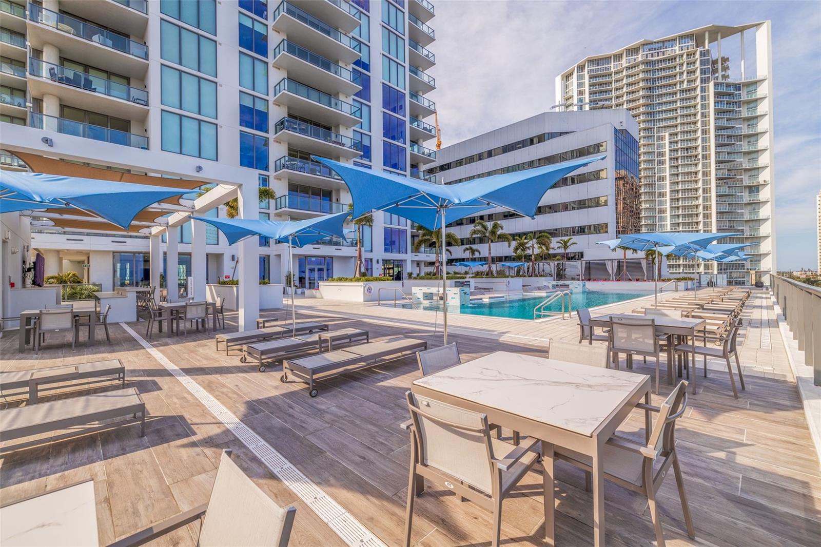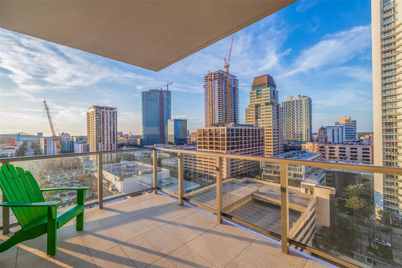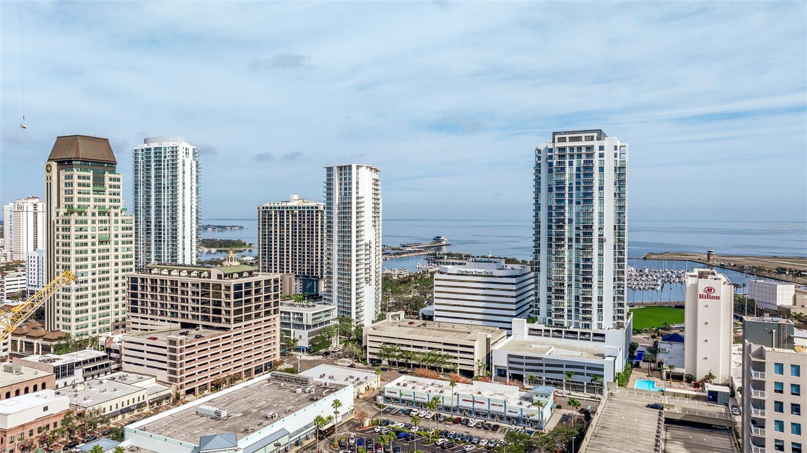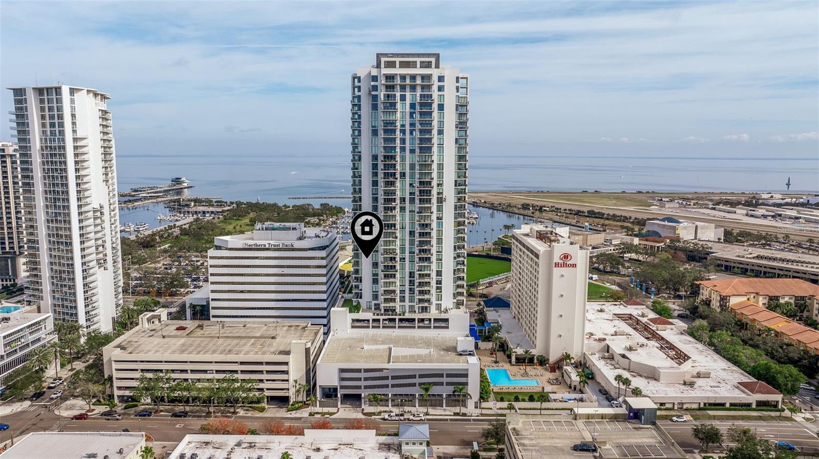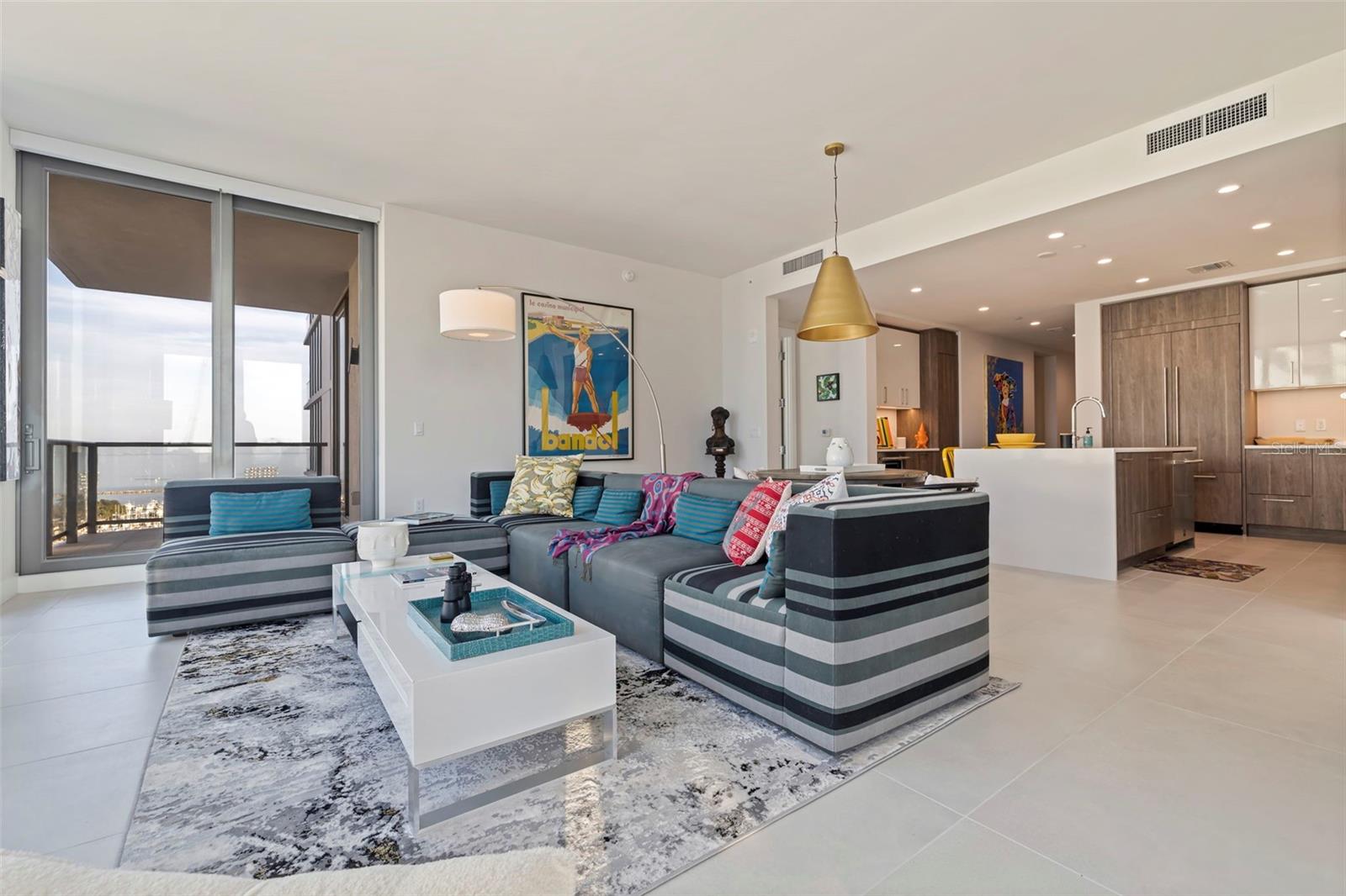 Situated on the 14th floor of the newly completed Saltaire, this exquisite condominium epitomizes the fusion of luxury and leisure. Offering an unparalleled living experience, this 2-bedroom plus versatile den, 3-bathroom unit spans 2,036 sq ft of meticulously designed interiors. Upon entry, be captivated by breathtaking water vistas to the east and sweeping city panoramas to the west. Dual expansive balconies, accessible from both the great room and each bedroom, invite seamless indoor-outdoor living. The interior is adorned with elegant porcelain tile flooring and high-end fixtures throughout, including three ceiling fans for added comfort. The kitchen dazzles with stainless steel appliances, slide-out pantry drawers, and a central island with bar seating, perfect for hosting guests. The owner's suite offers a tranquil retreat with a private balcony showcasing a blend of water and city views, along with dual walk-in closets. Indulge in the spa-like owner's bath, complete with refined vanities, a soaking tub, and an oversized walk-in shower. The second bedroom suite provides its own sanctuary with city views, a walk-in closet, and a private balcony, while the den offers flexibility as an additional bedroom or home office. This unit includes two dedicated parking spaces in a secure, covered garage, along with a climate-controlled storage unit conveniently located next to the residence. Beyond its exceptional interiors, Saltaire offers resort-style amenities, including a pool, spa, club rooms, fitness center, and dog park. Residents can also enjoy breathtaking views from the 7th-floor deck overlooking Tampa Bay and downtown St. Pete. With waterfront parks, marinas, shops, and dining options just steps away, Saltaire isn’t just a place to live—it’s a statement of sophistication, offering an unparalleled blend of luxury, convenience, and vibrant city living.