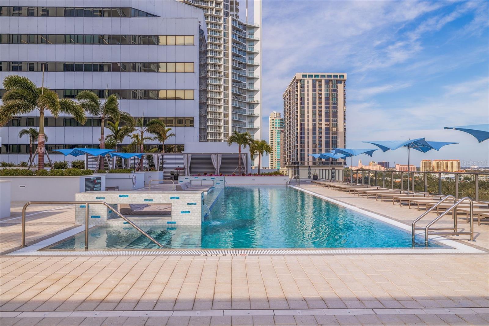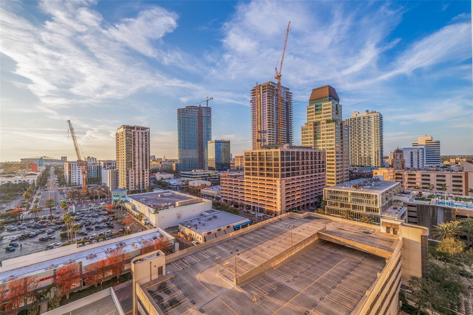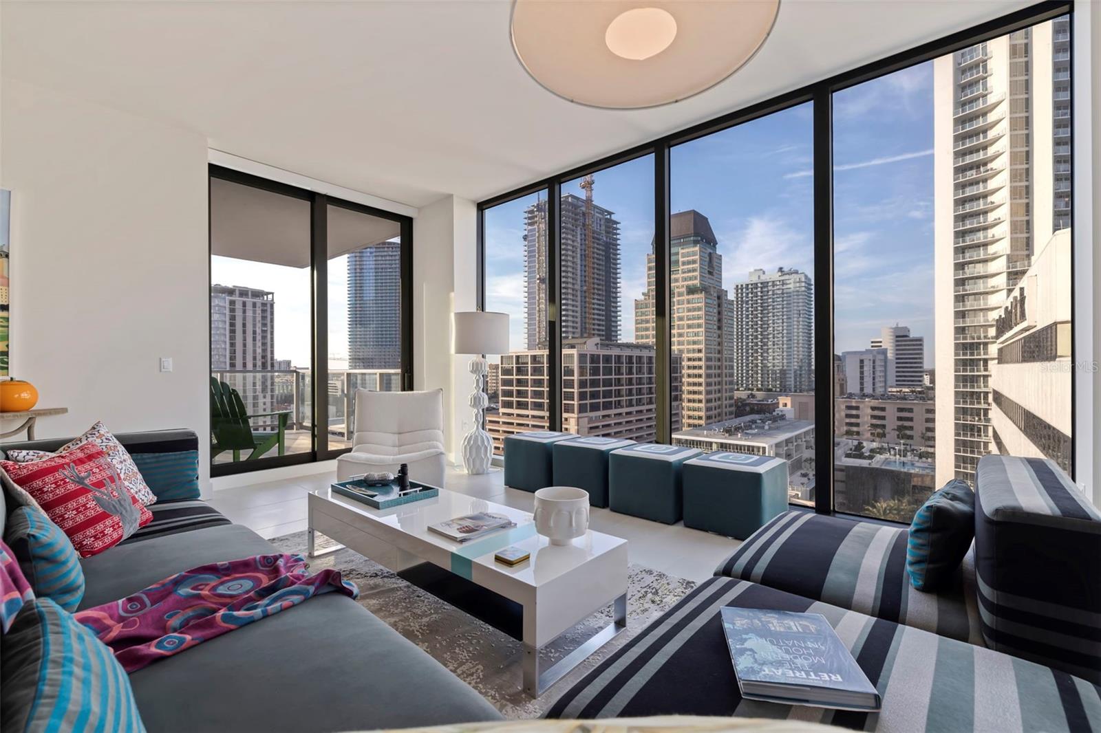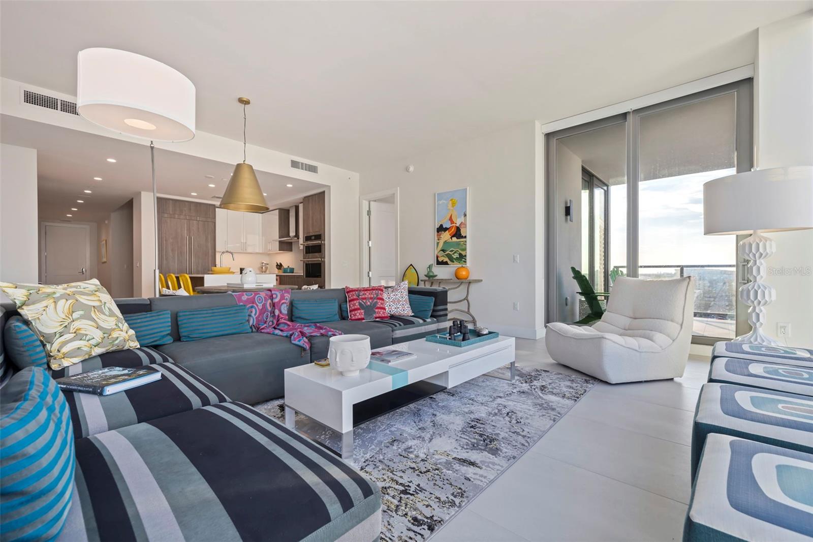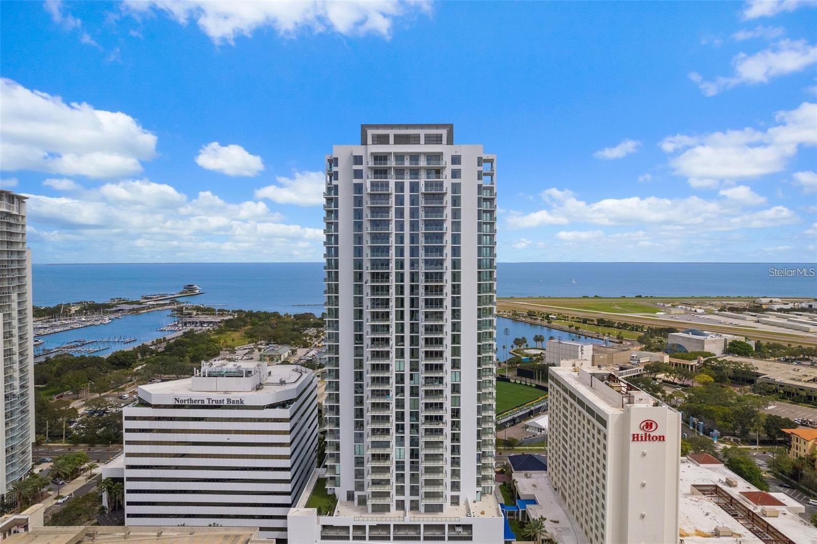 Situated on the 14th floor of the newly completed Saltaire, this exquisite condominium epitomizes the fusion of luxury and leisure. Offering an unparalleled living experience, this 2-bedroom plus versatile den, 3-bathroom unit spans 2,036 sq ft of meticulously designed interiors. Upon entry, be captivated by breathtaking water vistas to the east and sweeping city panoramas to the west. Dual expansive balconies, accessible from both the great room and each bedroom, invite seamless indoor-outdoor living. The interior is adorned with elegant porcelain tile flooring and high-end fixtures throughout, including three ceiling fans for added comfort. The kitchen dazzles with stainless steel appliances, slide-out pantry drawers, and a central island with bar seating, perfect for hosting guests. The owner's suite offers a tranquil retreat with a private balcony showcasing a blend of water and city views, along with dual walk-in closets. Indulge in the spa-like owner's bath, complete with refined vanities, a soaking tub, and an oversized walk-in shower. The second bedroom suite provides its own sanctuary with city views, a walk-in closet, and a private balcony, while the den offers flexibility as an additional bedroom or home office. This unit includes two dedicated parking spaces in a secure, covered garage, along with a climate-controlled storage unit conveniently located next to the residence. Beyond its exceptional interiors, Saltaire offers resort-style amenities, including a pool, spa, club rooms, fitness center, and dog park. Residents can also enjoy breathtaking views from the 7th-floor deck overlooking Tampa Bay and downtown St. Pete. With waterfront parks, marinas, shops, and dining options just steps away, Saltaire isn’t just a place to live—it’s a statement of sophistication, offering an unparalleled blend of luxury, convenience, and vibrant city living.
