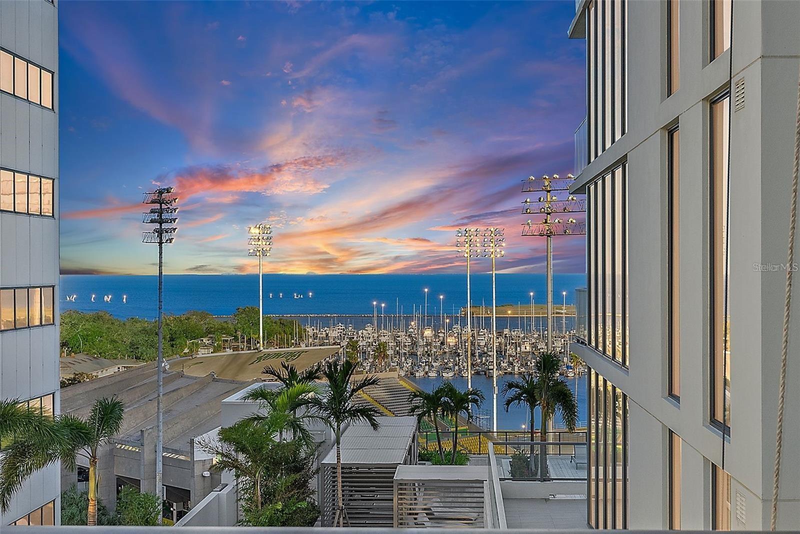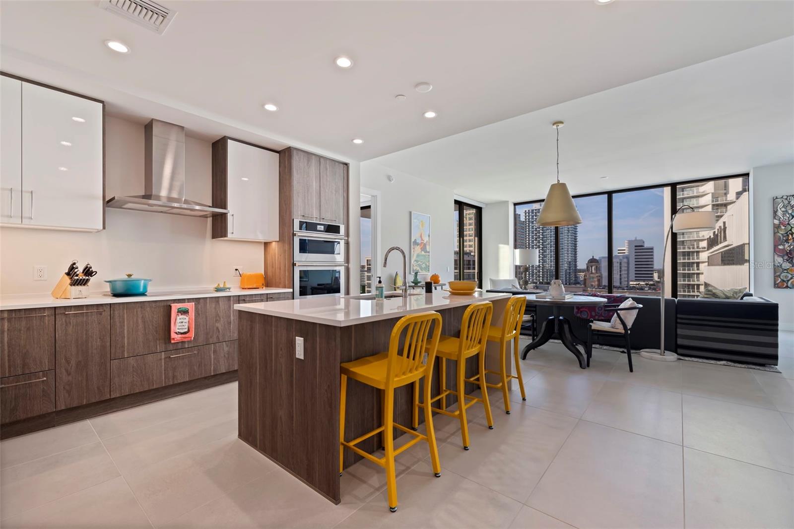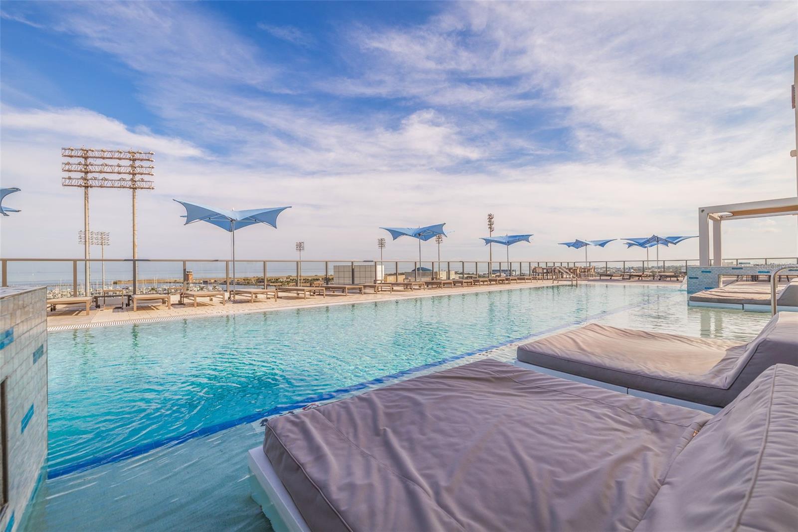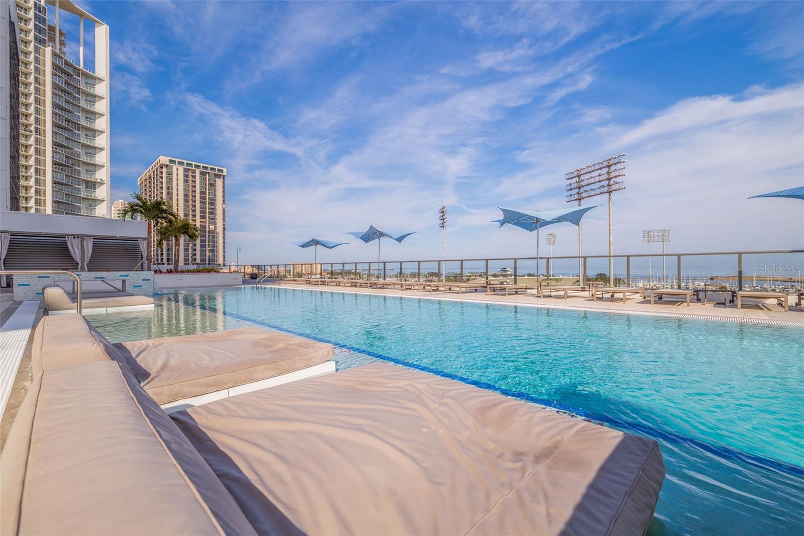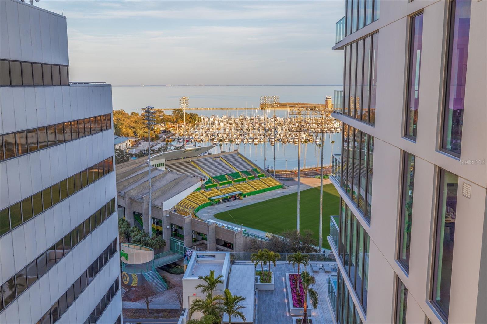 Situated on the 14th floor of the newly completed Saltaire, this exquisite condominium epitomizes the fusion of luxury and leisure. Offering an unparalleled living experience, this 2-bedroom plus versatile den, 3-bathroom unit spans 2,036 sq ft of meticulously designed interiors. Upon entry, be captivated by breathtaking water vistas to the east and sweeping city panoramas to the west. Dual expansive balconies, accessible from both the great room and each bedroom, invite seamless indoor-outdoor living. The interior is adorned with elegant porcelain tile flooring and high-end fixtures throughout, including three ceiling fans for added comfort. The kitchen dazzles with stainless steel appliances, slide-out pantry drawers, and a central island with bar seating, perfect for hosting guests. The owner's suite offers a tranquil retreat with a private balcony showcasing a blend of water and city views, along with dual walk-in closets. Indulge in the spa-like owner's bath, complete with refined vanities, a soaking tub, and an oversized walk-in shower. The second bedroom suite provides its own sanctuary with city views, a walk-in closet, and a private balcony, while the den offers flexibility as an additional bedroom or home office. This unit includes two dedicated parking spaces in a secure, covered garage, along with a climate-controlled storage unit conveniently located next to the residence. Beyond its exceptional interiors, Saltaire offers resort-style amenities, including a pool, spa, club rooms, fitness center, and dog park. Residents can also enjoy breathtaking views from the 7th-floor deck overlooking Tampa Bay and downtown St. Pete. With waterfront parks, marinas, shops, and dining options just steps away, Saltaire isn’t just a place to live—it’s a statement of sophistication, offering an unparalleled blend of luxury, convenience, and vibrant city living.