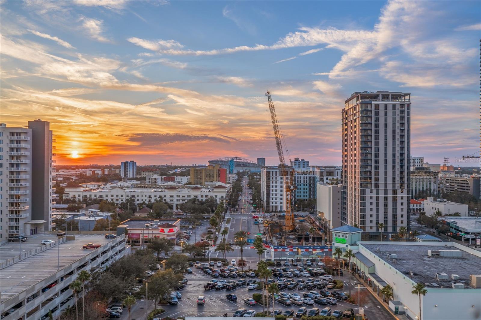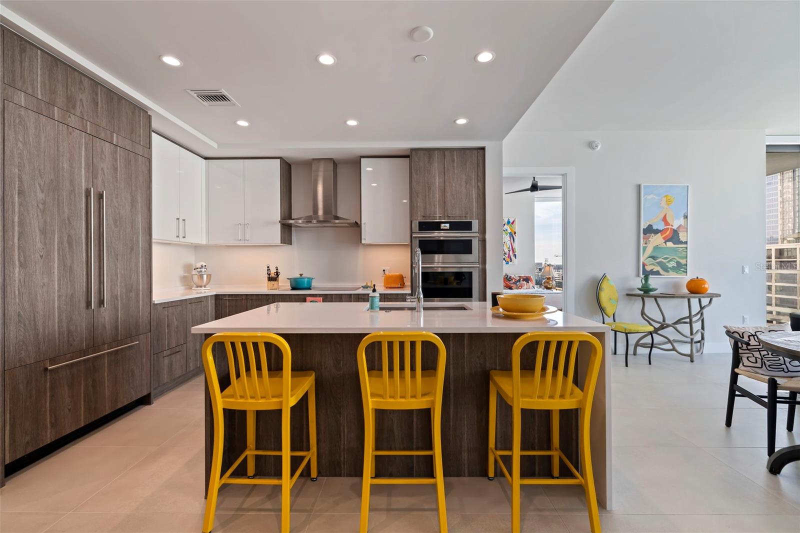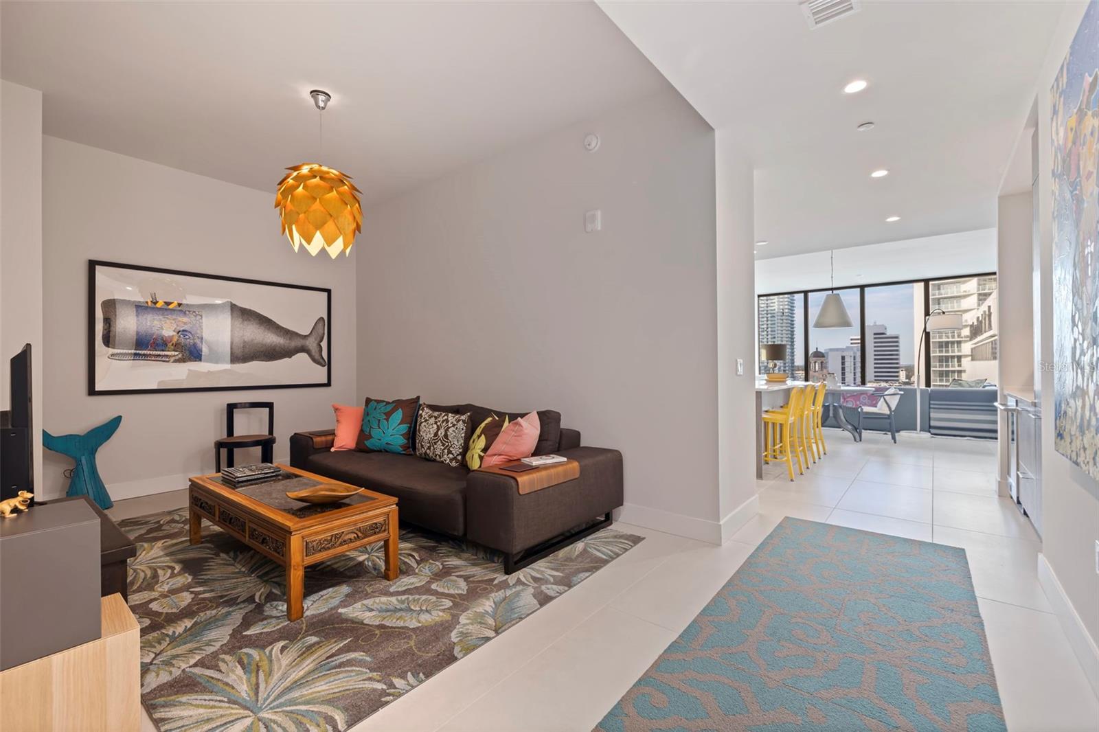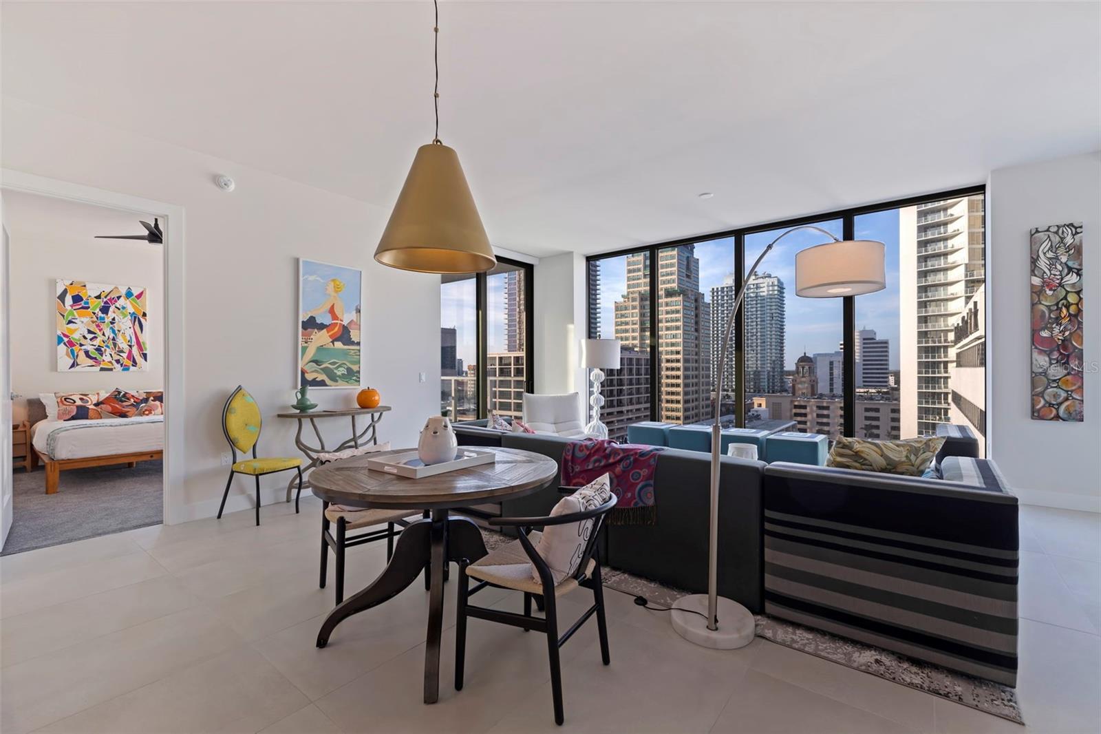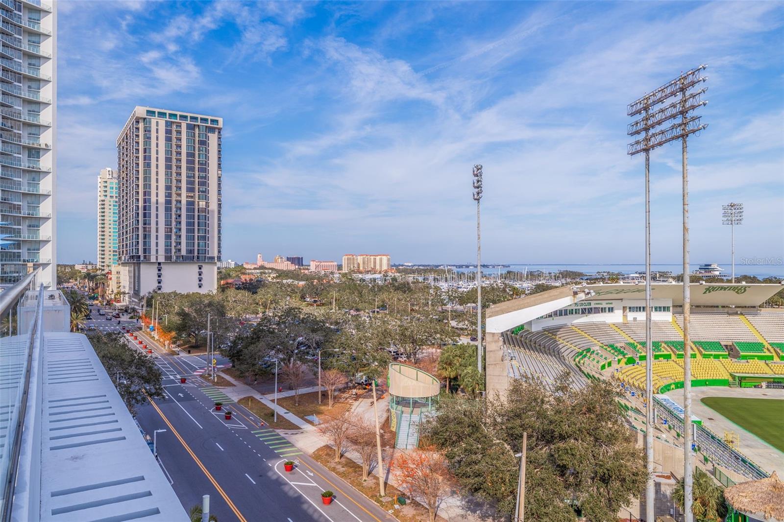 Situated on the 14th floor of the newly completed Saltaire, this exquisite condominium epitomizes the fusion of luxury and leisure. Offering an unparalleled living experience, this 2-bedroom plus versatile den, 3-bathroom unit spans 2,036 sq ft of meticulously designed interiors. Upon entry, be captivated by breathtaking water vistas to the east and sweeping city panoramas to the west. Dual expansive balconies, accessible from both the great room and each bedroom, invite seamless indoor-outdoor living. The interior is adorned with elegant porcelain tile flooring and high-end fixtures throughout, including three ceiling fans for added comfort. The kitchen dazzles with stainless steel appliances, slide-out pantry drawers, and a central island with bar seating, perfect for hosting guests. The owner's suite offers a tranquil retreat with a private balcony showcasing a blend of water and city views, along with dual walk-in closets. Indulge in the spa-like owner's bath, complete with refined vanities, a soaking tub, and an oversized walk-in shower. The second bedroom suite provides its own sanctuary with city views, a walk-in closet, and a private balcony, while the den offers flexibility as an additional bedroom or home office. This unit includes two dedicated parking spaces in a secure, covered garage, along with a climate-controlled storage unit conveniently located next to the residence. Beyond its exceptional interiors, Saltaire offers resort-style amenities, including a pool, spa, club rooms, fitness center, and dog park. Residents can also enjoy breathtaking views from the 7th-floor deck overlooking Tampa Bay and downtown St. Pete. With waterfront parks, marinas, shops, and dining options just steps away, Saltaire isn’t just a place to live—it’s a statement of sophistication, offering an unparalleled blend of luxury, convenience, and vibrant city living.