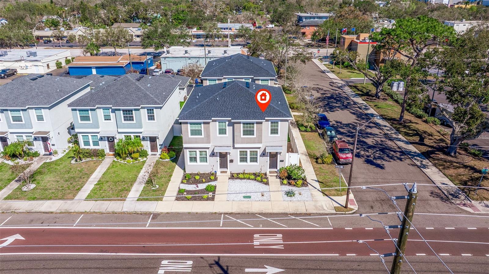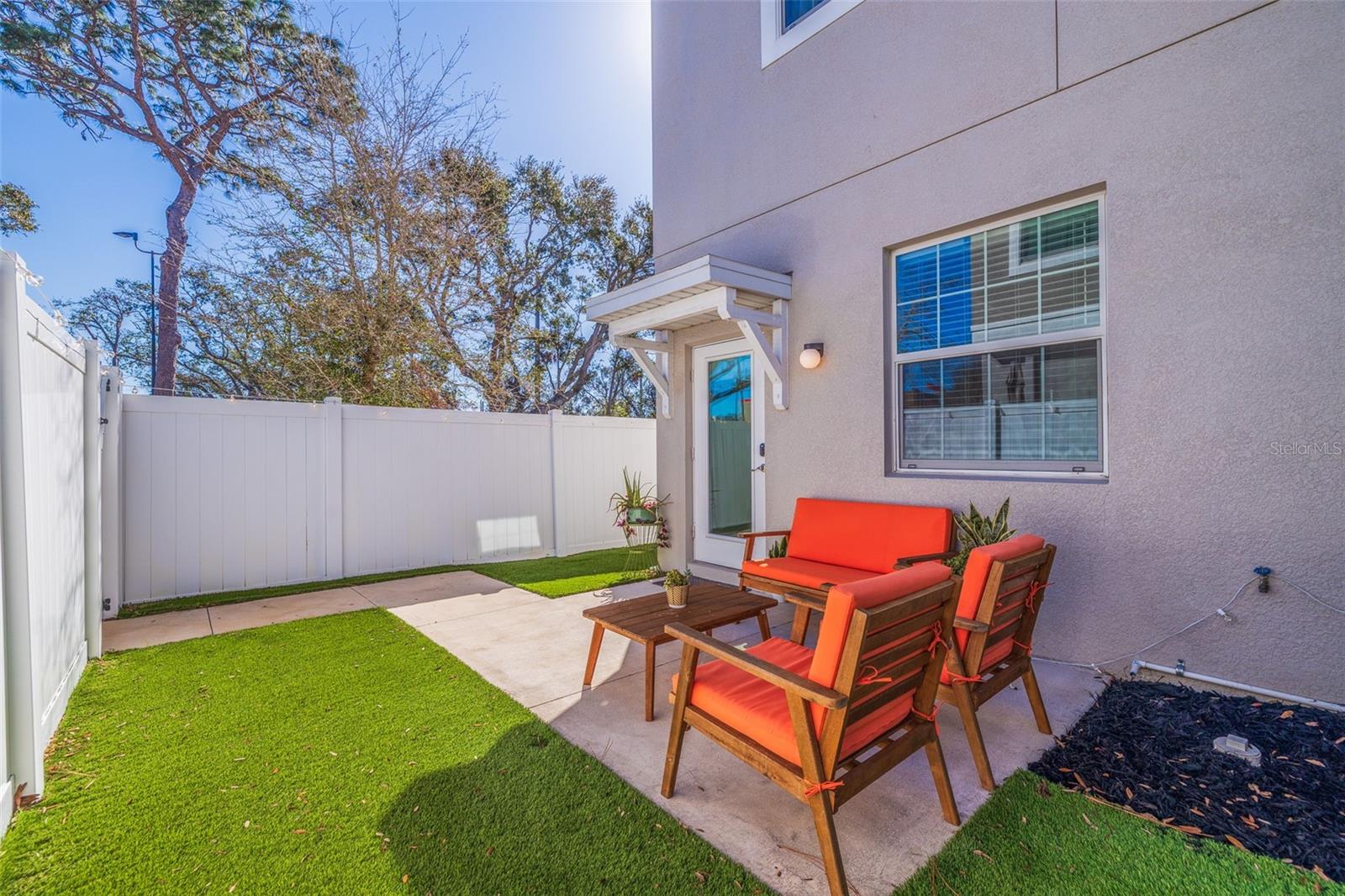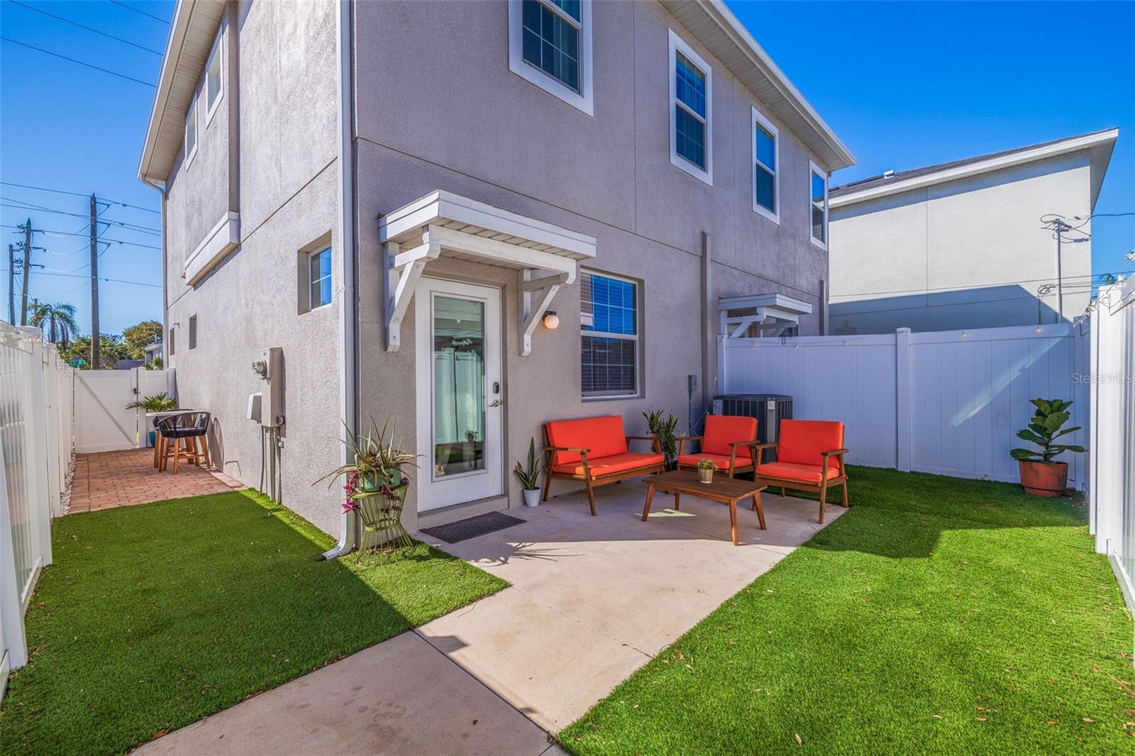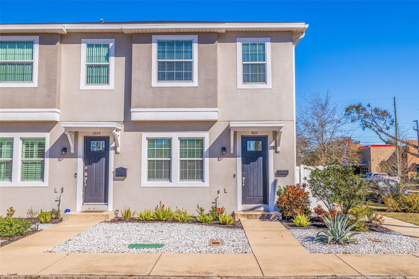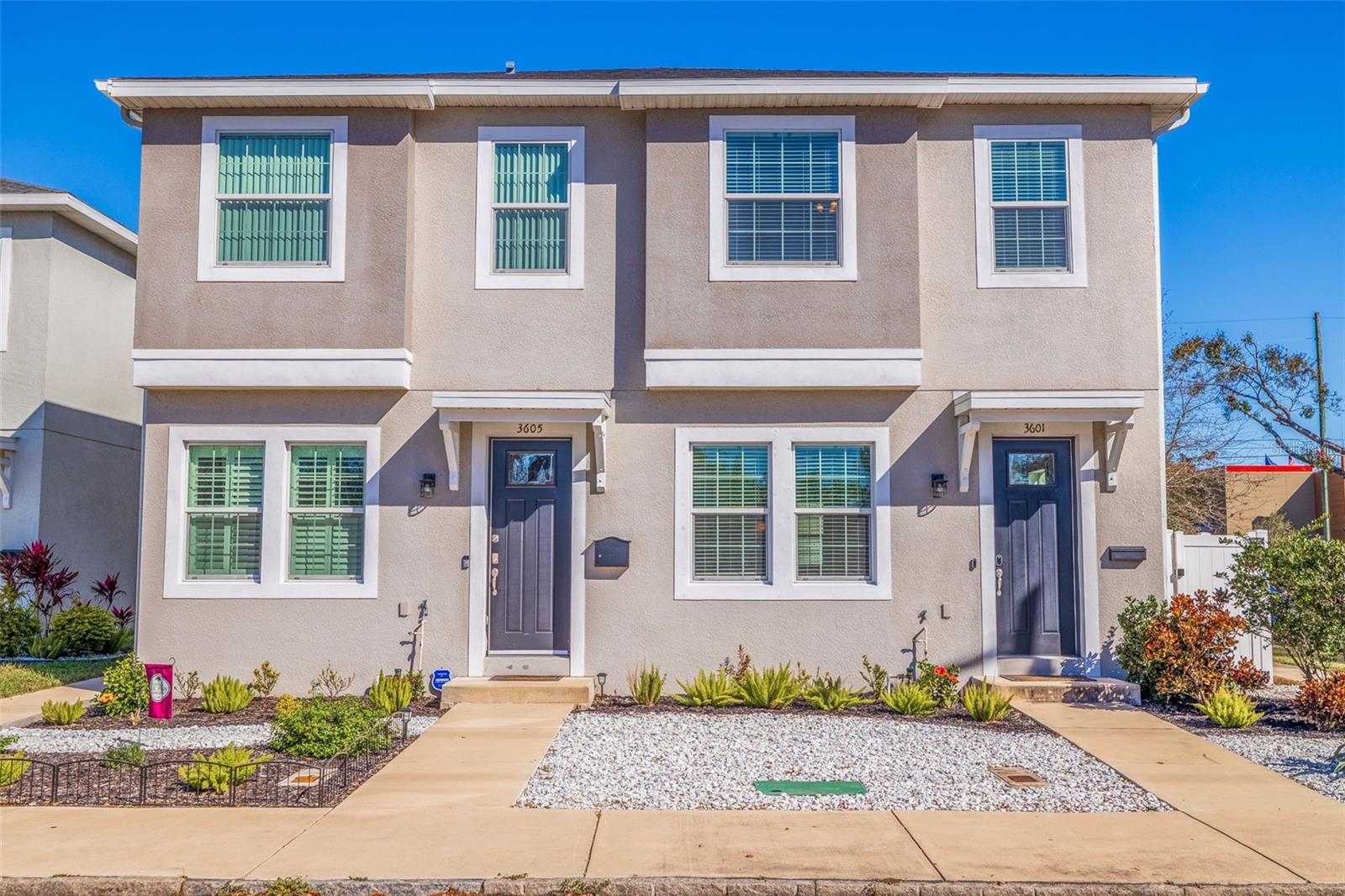 This stylish 2020 built townhome is a RARE opportunity to live at the center of it all, with NO HOA! Highly desirable location, about a 5 minute drive to restaurants and shops in the GRAND CENTRAL DISTRICT, around 8-10 minutes to the heart of DOWNTOWN ST PETERSBURG, and approximately 15 minutes to ST PETE BEACH, with easy access to the Pinellas Trail and I-275. The low maintenance manicured landscaped entry welcomes you into an open-concept layout with high ceilings and laminate floors throughout the first level, perfect for both relaxation and entertaining. The kitchen has granite countertops, white shaker cabinets, stainless steel appliances, and offers plenty of space for meal prep, all while staying connected to the living and dining areas. The half bath on the main level offers added convenience for guests. Step outside and enjoy the low-maintenance courtyard style patio, complete with artificial turf and privacy fence. On the second level, the oversized primary and secondary bedrooms feature their own ensuite bathrooms with ceramic tile and granite countertops, plus walk-in closets. The detached 1 car garage provides additional parking and storage, adding to the appeal of this lovely home. With all of these features and easy access to all that St. Pete has to offer, this property is a must-see!