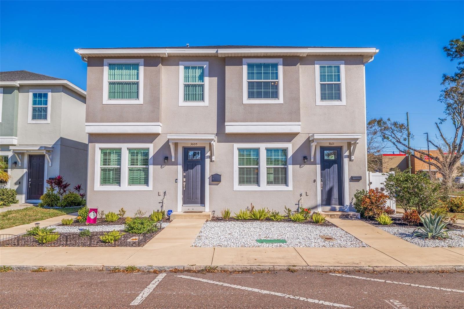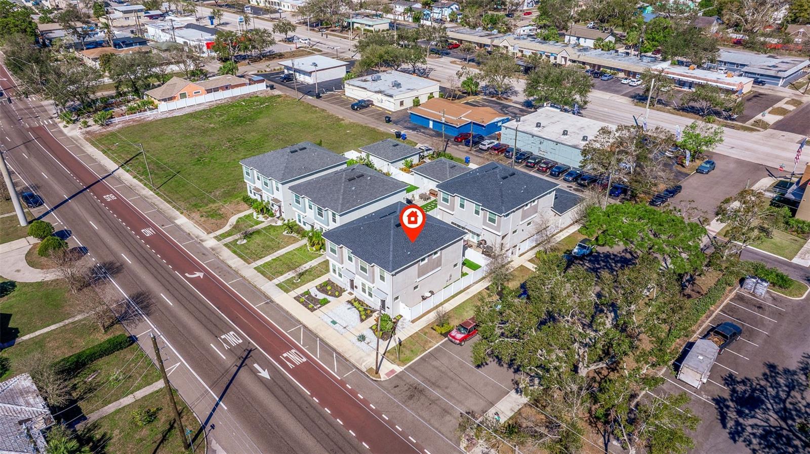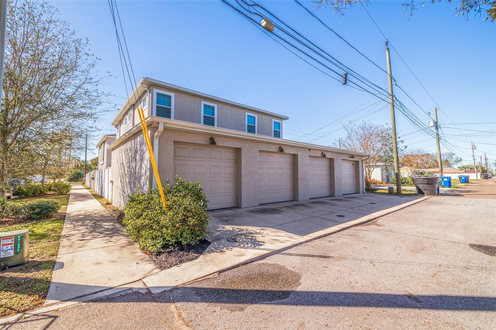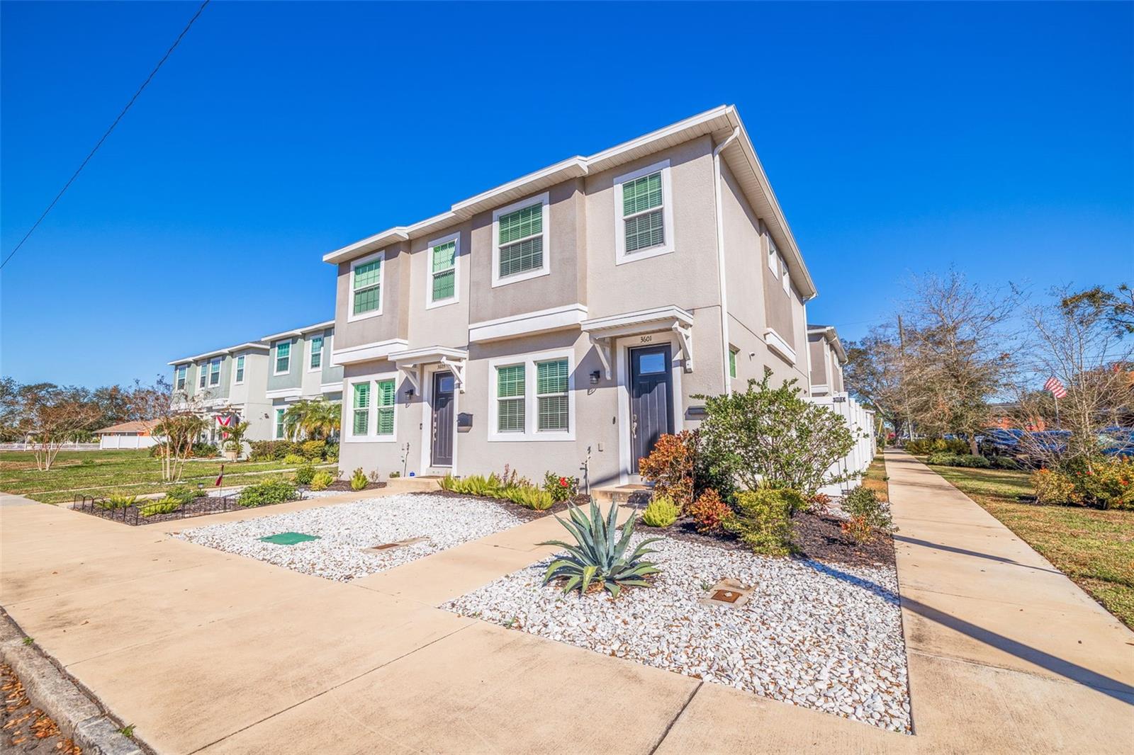 This stylish 2020 built townhome is a RARE opportunity to live at the center of it all, with NO HOA! Highly desirable location, about a 5 minute drive to restaurants and shops in the GRAND CENTRAL DISTRICT, around 8-10 minutes to the heart of DOWNTOWN ST PETERSBURG, and approximately 15 minutes to ST PETE BEACH, with easy access to the Pinellas Trail and I-275. The low maintenance manicured landscaped entry welcomes you into an open-concept layout with high ceilings and laminate floors throughout the first level, perfect for both relaxation and entertaining. The kitchen has granite countertops, white shaker cabinets, stainless steel appliances, and offers plenty of space for meal prep, all while staying connected to the living and dining areas. The half bath on the main level offers added convenience for guests. Step outside and enjoy the low-maintenance courtyard style patio, complete with artificial turf and privacy fence. On the second level, the oversized primary and secondary bedrooms feature their own ensuite bathrooms with ceramic tile and granite countertops, plus walk-in closets. The detached 1 car garage provides additional parking and storage, adding to the appeal of this lovely home. With all of these features and easy access to all that St. Pete has to offer, this property is a must-see!