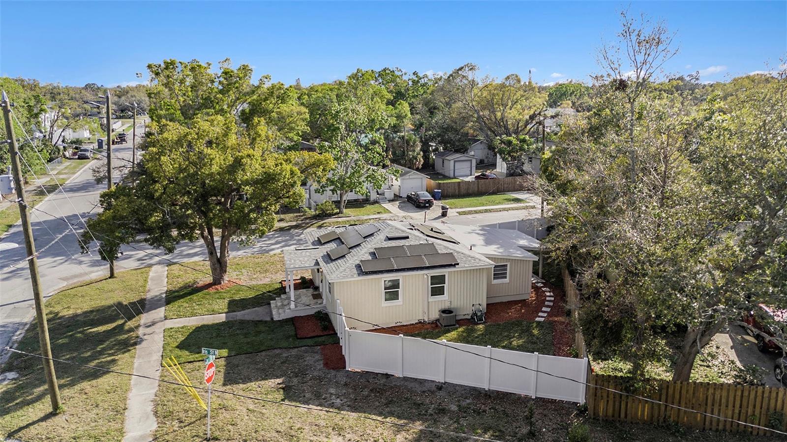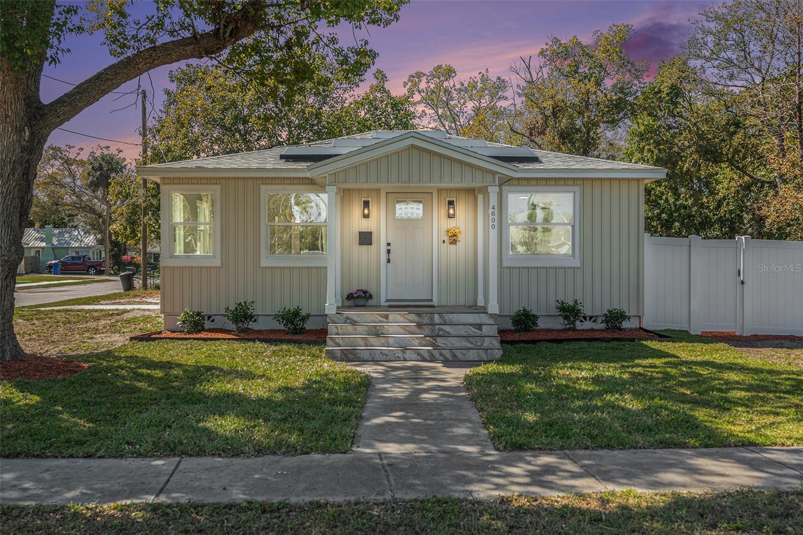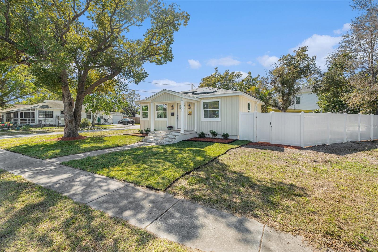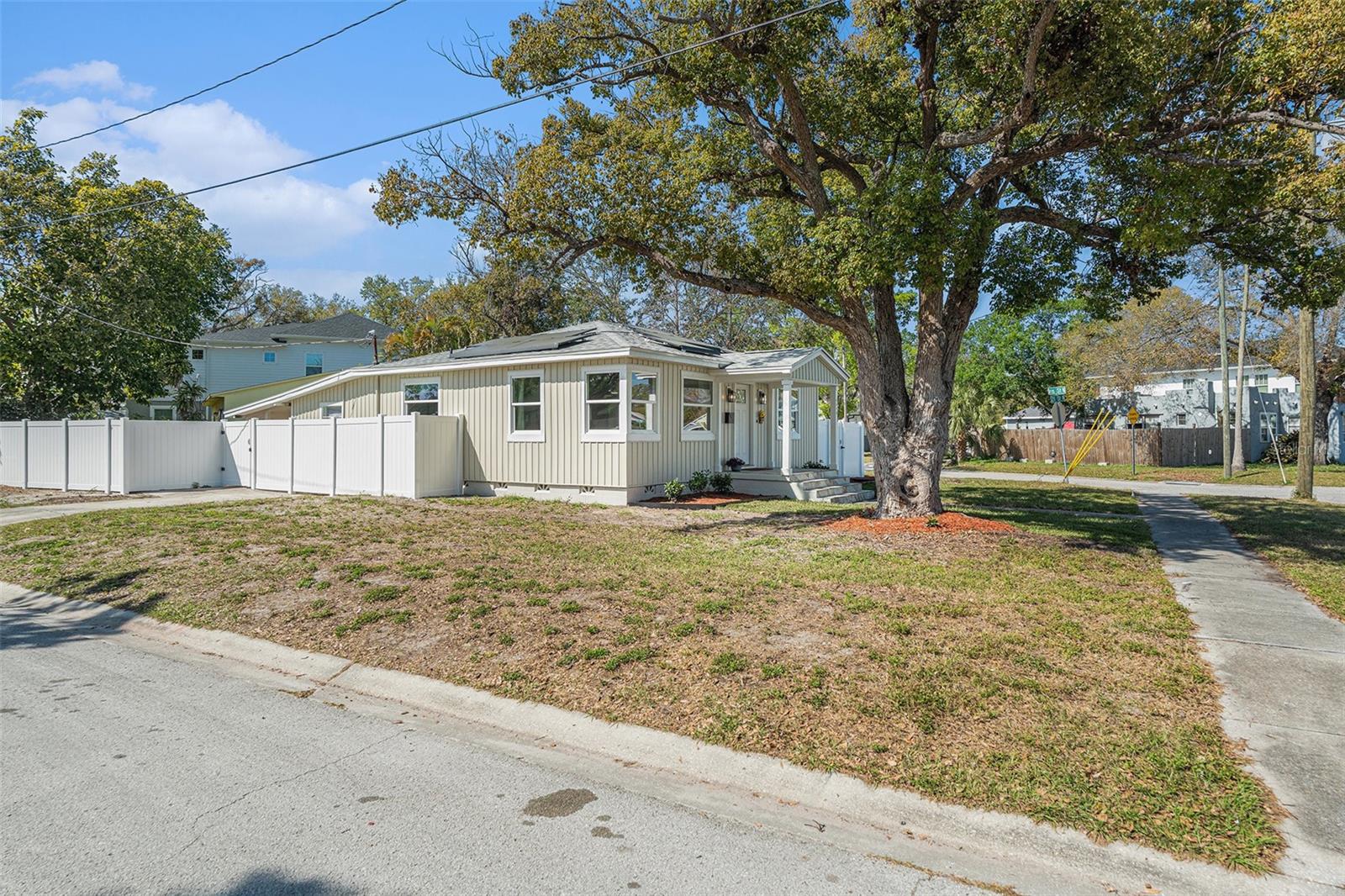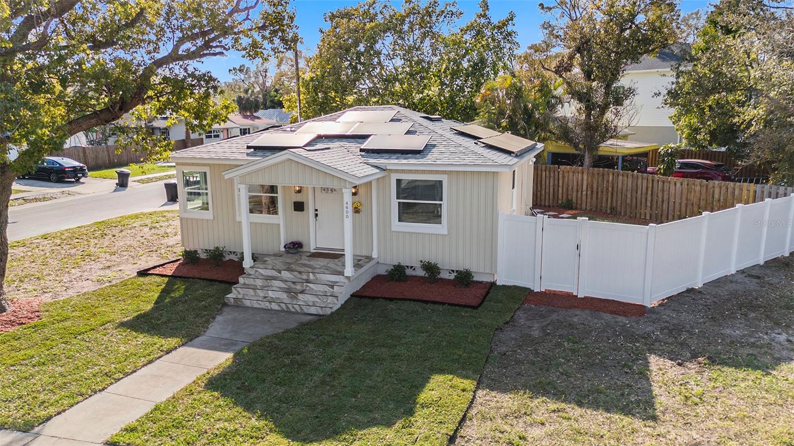 Welcome to this beautifully upgraded home in St. Petersburg, where contemporary updates meet timeless charm. This stunning three-bedroom, one-bath home has been completely transformed with high-end finishes and energy-efficient enhancements, including OWNED SOLAR PANELS that significantly reduce electrical expenses. Recent updates include a brand-new roof installed in October 2024, impact windows and doors added in December 2024, and stylish board and batten siding in an almond color with white trim for a fresh, modern look. The home features a fully permitted and inspected plumbing re-pipe, an updated electrical system, and a new tankless water heater for maximum efficiency. The interior boasts luxury vinyl flooring that is both waterproof and scratch-resistant, along with a designer kitchen featuring stone countertops, brass hardware, and Samsung stainless steel appliances. The spa-like bathroom includes a walk-in shower, an LED defog mirror, and a modern vanity. Additional upgrades include new lighting, ceiling fans, and matte black door hardware throughout the home. The third bedroom, located in the back of the home, is a versatile space that can be used as a bedroom, family room, or home office to suit your needs. The spacious, private yard is fully fenced with fresh landscaping and new sod, creating the perfect space for pets or entertaining. For added peace of mind, the foundation has been reinforced with two new steel beams. FLOOD ZONE X - NO FLOOD INSURANCE NEEDED! Property did not flood or receive damages from the storms. Nestled on a spacious corner lot in a prime St. Petersburg location, this move-in-ready home offers both style and energy efficiency. Schedule a tour today and see all that this beautifully upgraded home has to offer.
