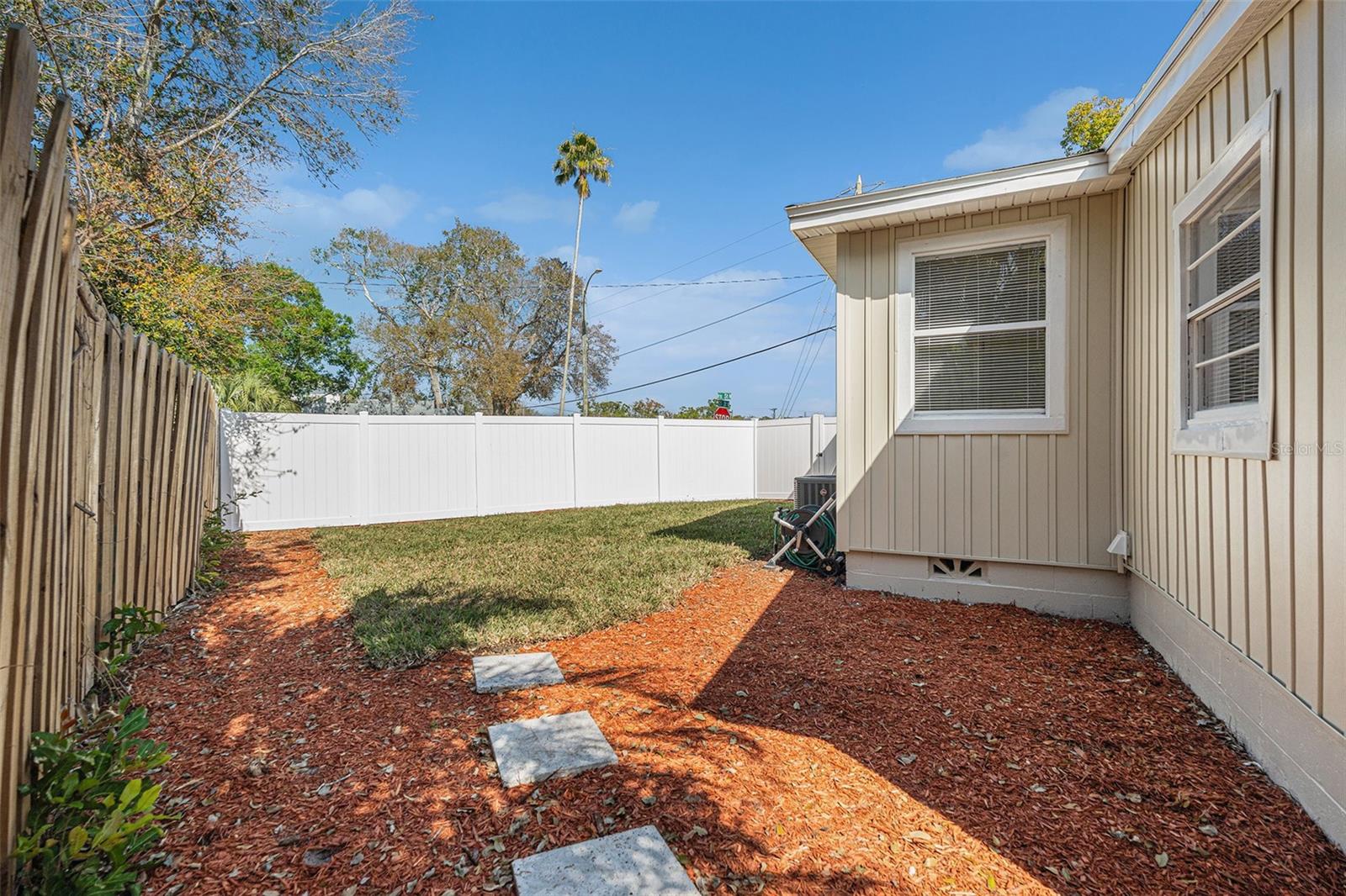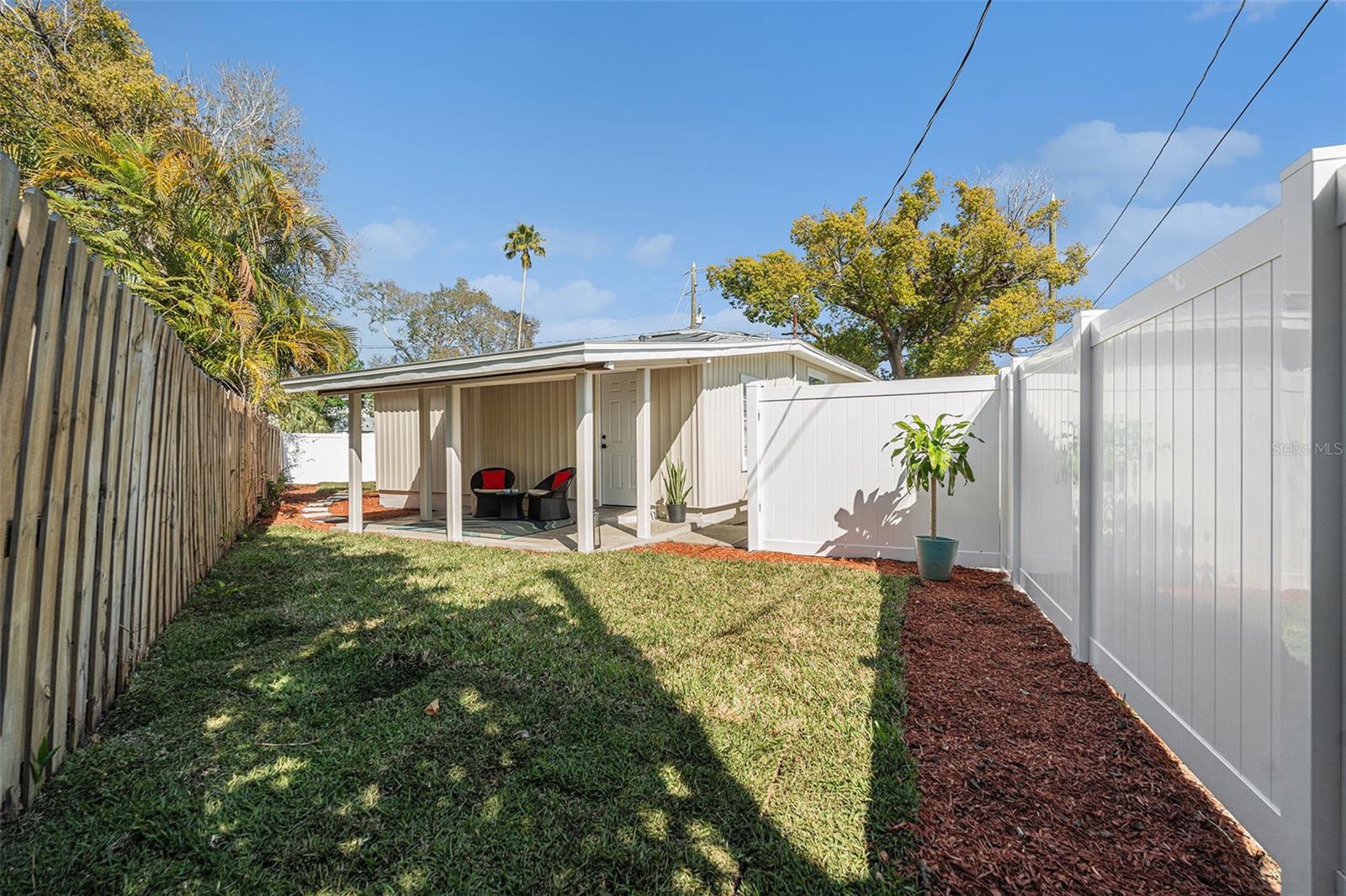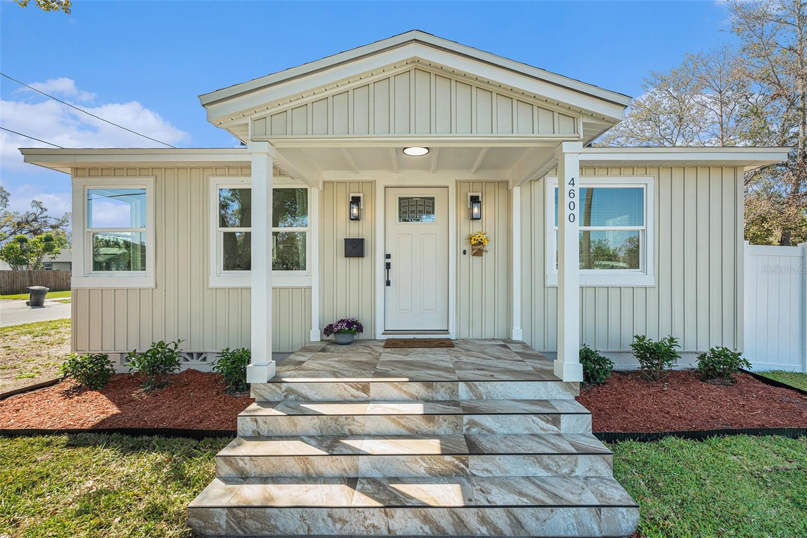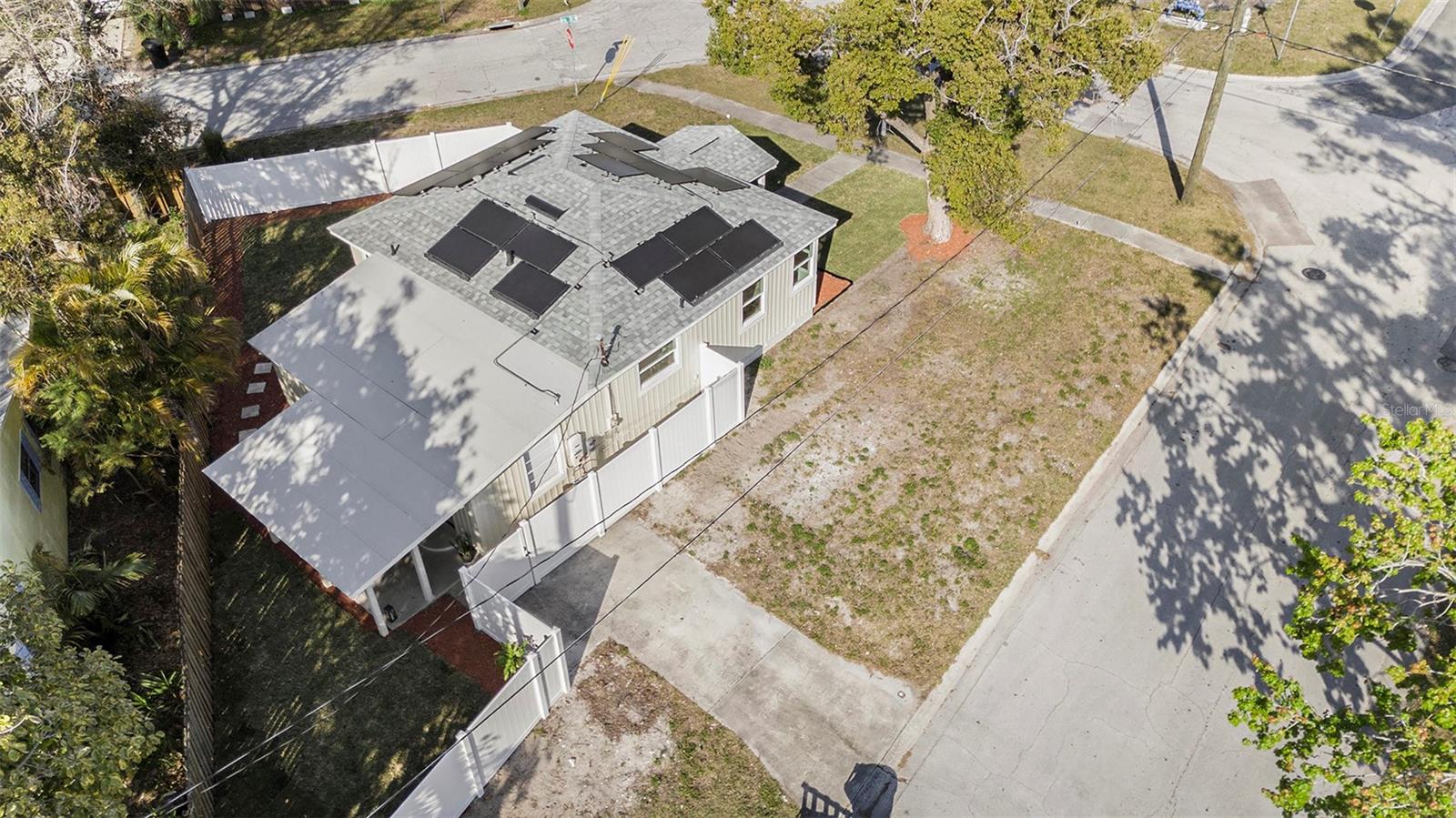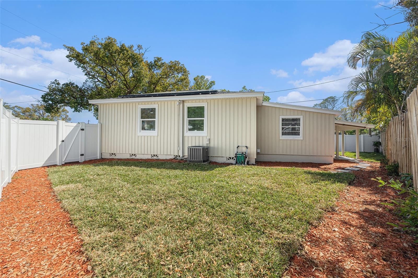 Welcome to this beautifully upgraded home in St. Petersburg, where contemporary updates meet timeless charm. This stunning three-bedroom, one-bath home has been completely transformed with high-end finishes and energy-efficient enhancements, including OWNED SOLAR PANELS that significantly reduce electrical expenses. Recent updates include a brand-new roof installed in October 2024, impact windows and doors added in December 2024, and stylish board and batten siding in an almond color with white trim for a fresh, modern look. The home features a fully permitted and inspected plumbing re-pipe, an updated electrical system, and a new tankless water heater for maximum efficiency. The interior boasts luxury vinyl flooring that is both waterproof and scratch-resistant, along with a designer kitchen featuring stone countertops, brass hardware, and Samsung stainless steel appliances. The spa-like bathroom includes a walk-in shower, an LED defog mirror, and a modern vanity. Additional upgrades include new lighting, ceiling fans, and matte black door hardware throughout the home. The third bedroom, located in the back of the home, is a versatile space that can be used as a bedroom, family room, or home office to suit your needs. The spacious, private yard is fully fenced with fresh landscaping and new sod, creating the perfect space for pets or entertaining. For added peace of mind, the foundation has been reinforced with two new steel beams. FLOOD ZONE X - NO FLOOD INSURANCE NEEDED! Property did not flood or receive damages from the storms. Nestled on a spacious corner lot in a prime St. Petersburg location, this move-in-ready home offers both style and energy efficiency. Schedule a tour today and see all that this beautifully upgraded home has to offer.