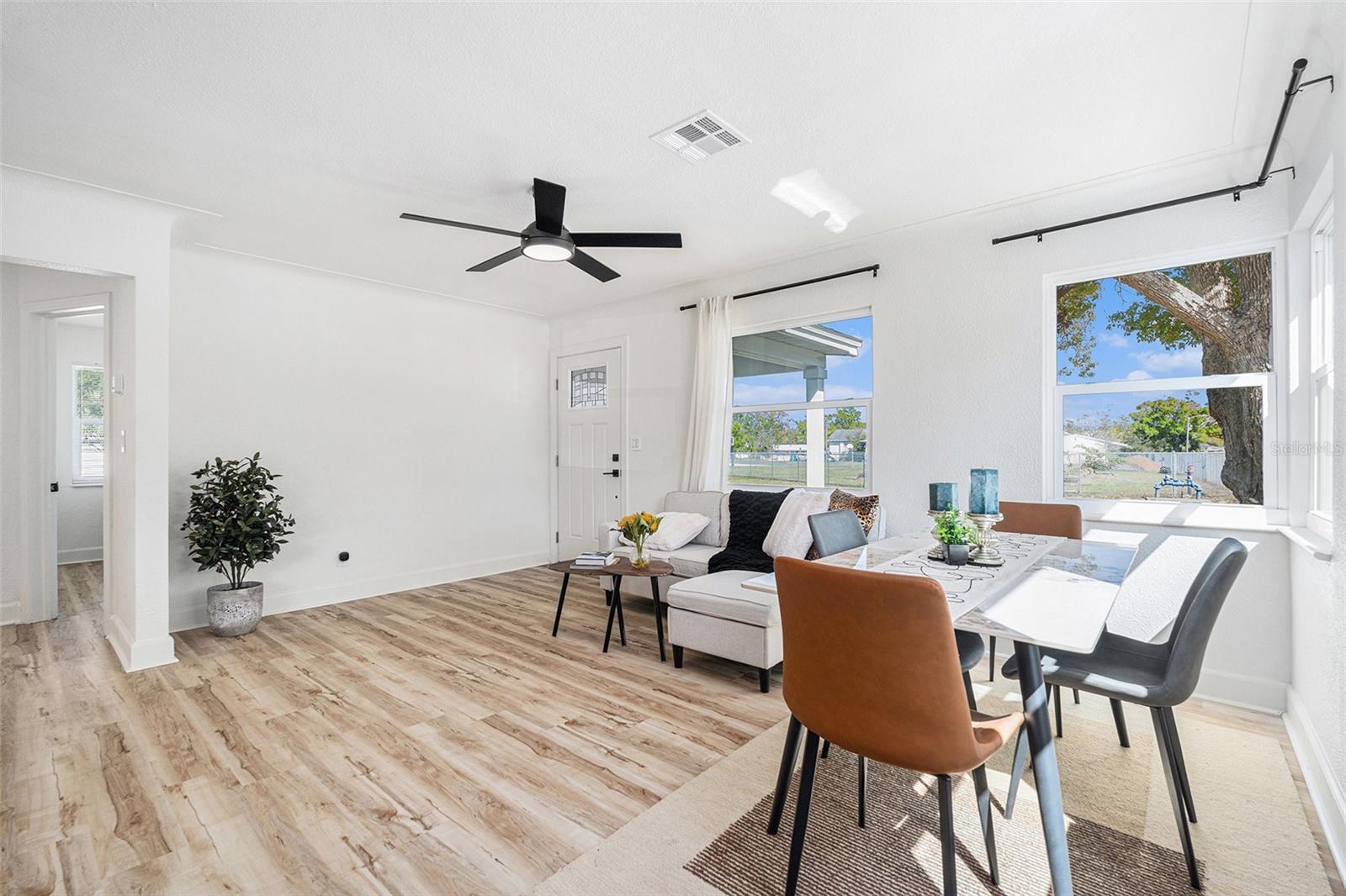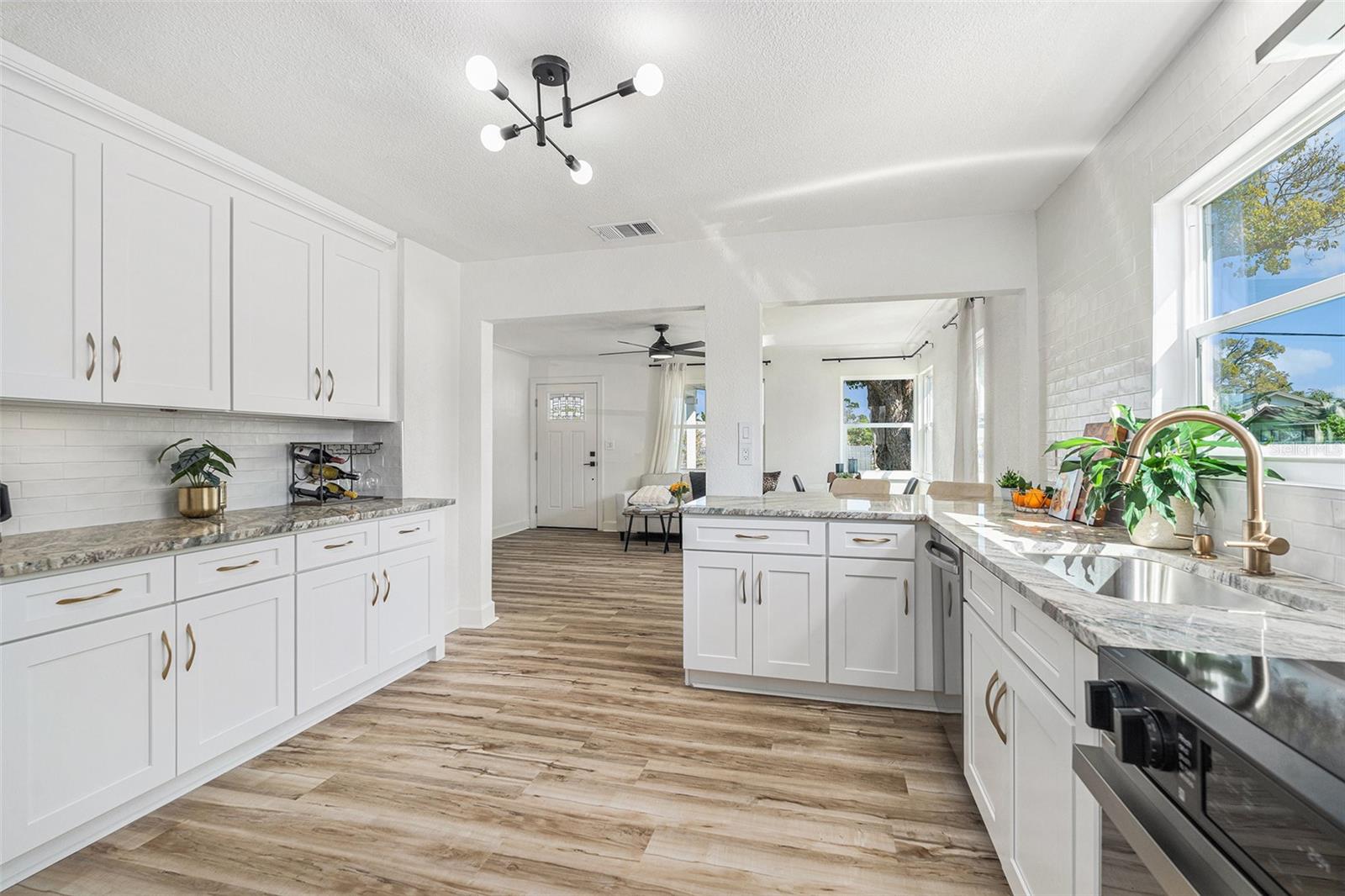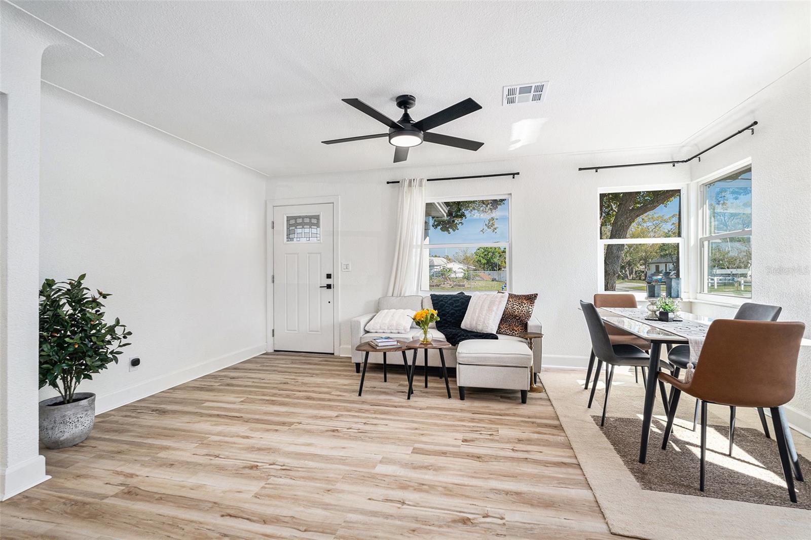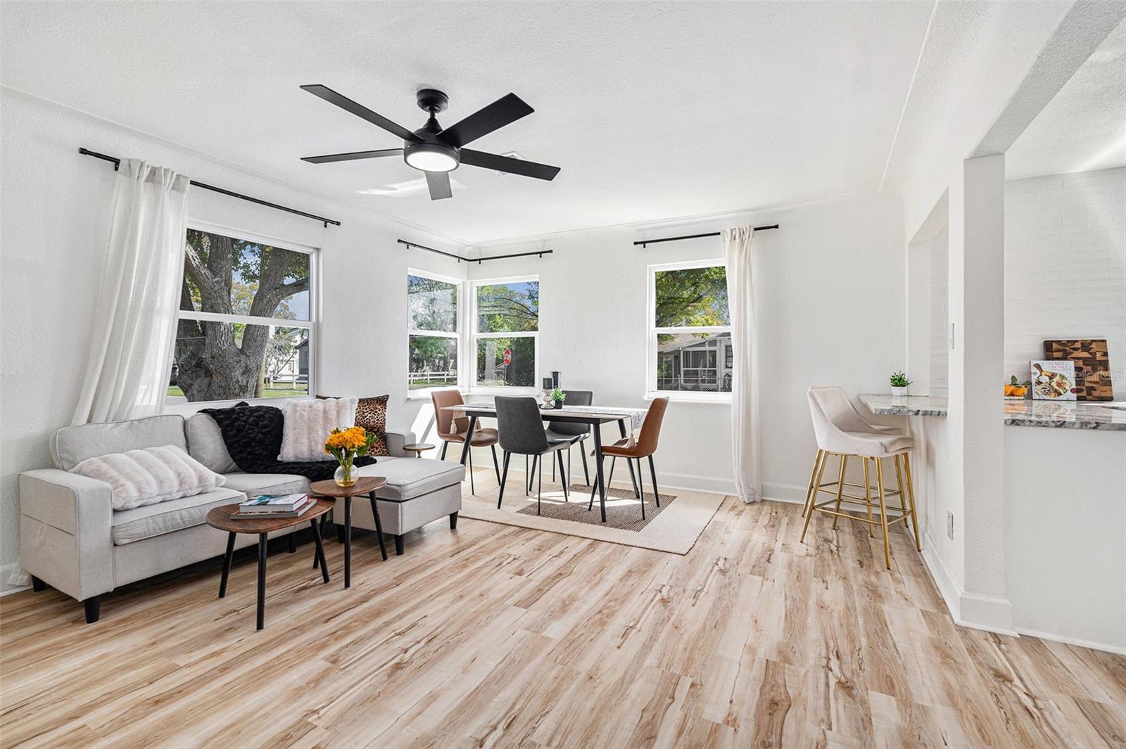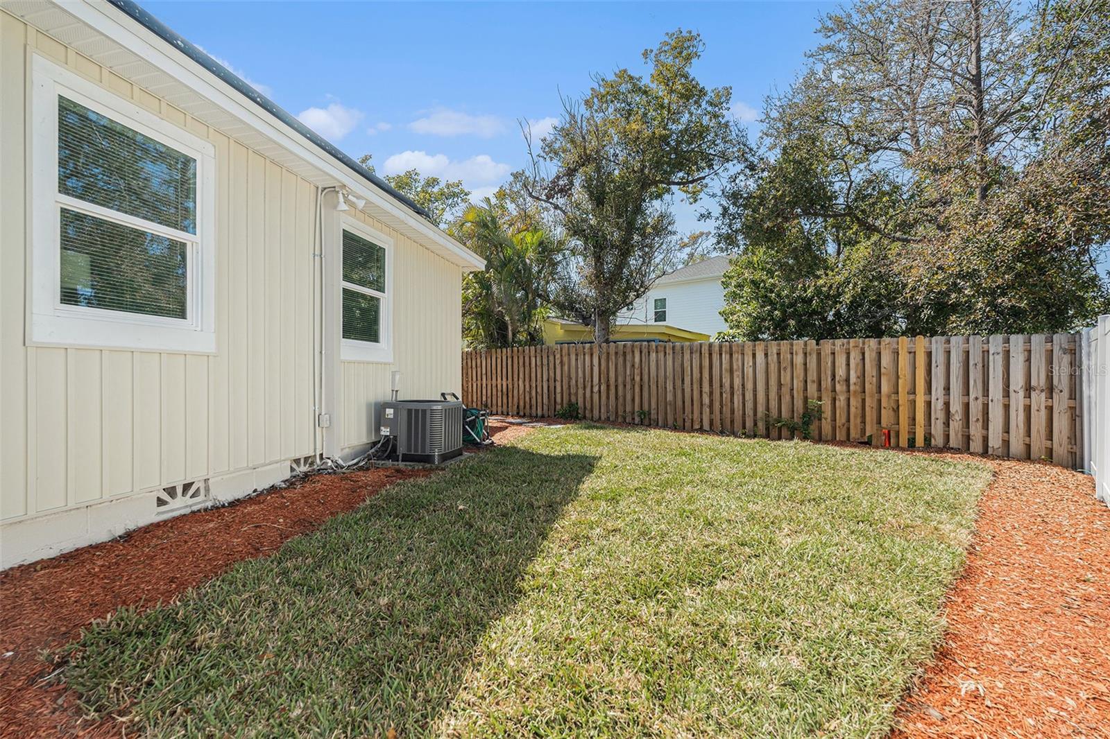 Welcome to this beautifully upgraded home in St. Petersburg, where contemporary updates meet timeless charm. This stunning three-bedroom, one-bath home has been completely transformed with high-end finishes and energy-efficient enhancements, including OWNED SOLAR PANELS that significantly reduce electrical expenses. Recent updates include a brand-new roof installed in October 2024, impact windows and doors added in December 2024, and stylish board and batten siding in an almond color with white trim for a fresh, modern look. The home features a fully permitted and inspected plumbing re-pipe, an updated electrical system, and a new tankless water heater for maximum efficiency. The interior boasts luxury vinyl flooring that is both waterproof and scratch-resistant, along with a designer kitchen featuring stone countertops, brass hardware, and Samsung stainless steel appliances. The spa-like bathroom includes a walk-in shower, an LED defog mirror, and a modern vanity. Additional upgrades include new lighting, ceiling fans, and matte black door hardware throughout the home. The third bedroom, located in the back of the home, is a versatile space that can be used as a bedroom, family room, or home office to suit your needs. The spacious, private yard is fully fenced with fresh landscaping and new sod, creating the perfect space for pets or entertaining. For added peace of mind, the foundation has been reinforced with two new steel beams. FLOOD ZONE X - NO FLOOD INSURANCE NEEDED! Property did not flood or receive damages from the storms. Nestled on a spacious corner lot in a prime St. Petersburg location, this move-in-ready home offers both style and energy efficiency. Schedule a tour today and see all that this beautifully upgraded home has to offer.