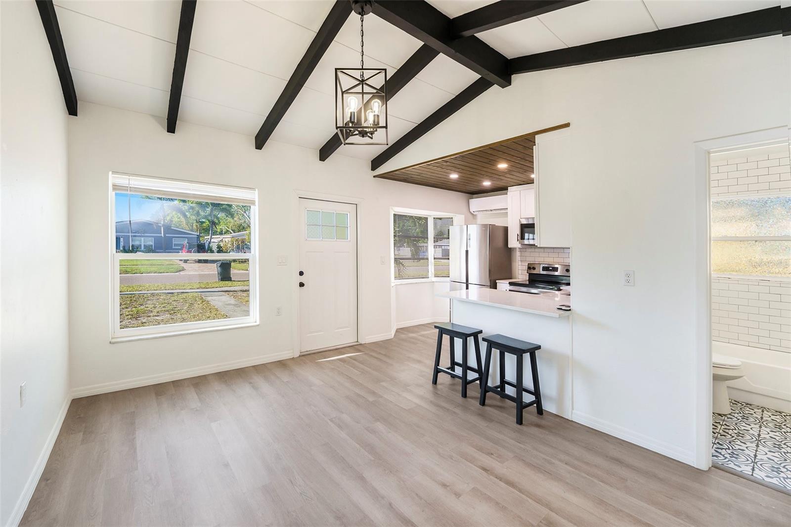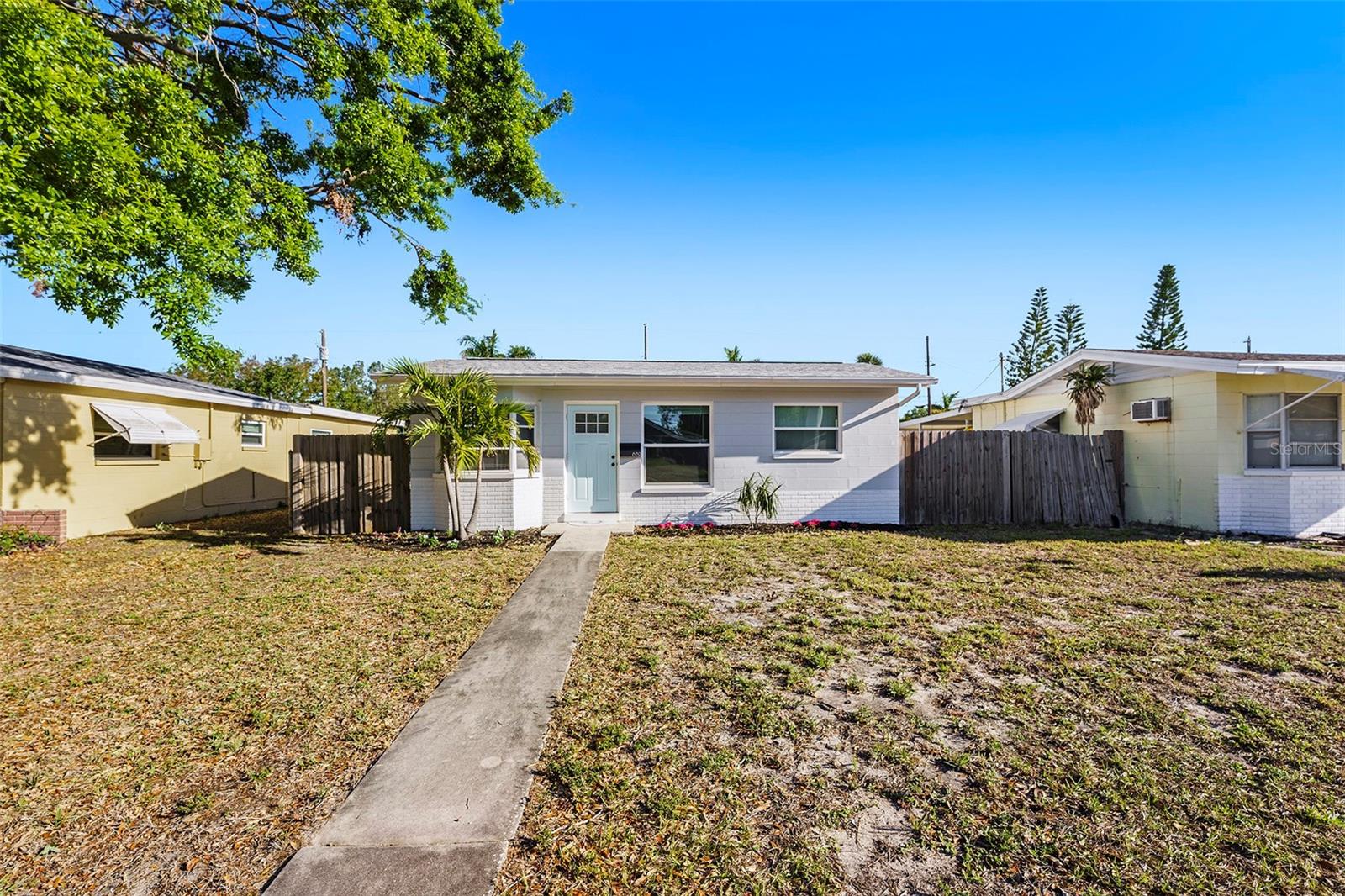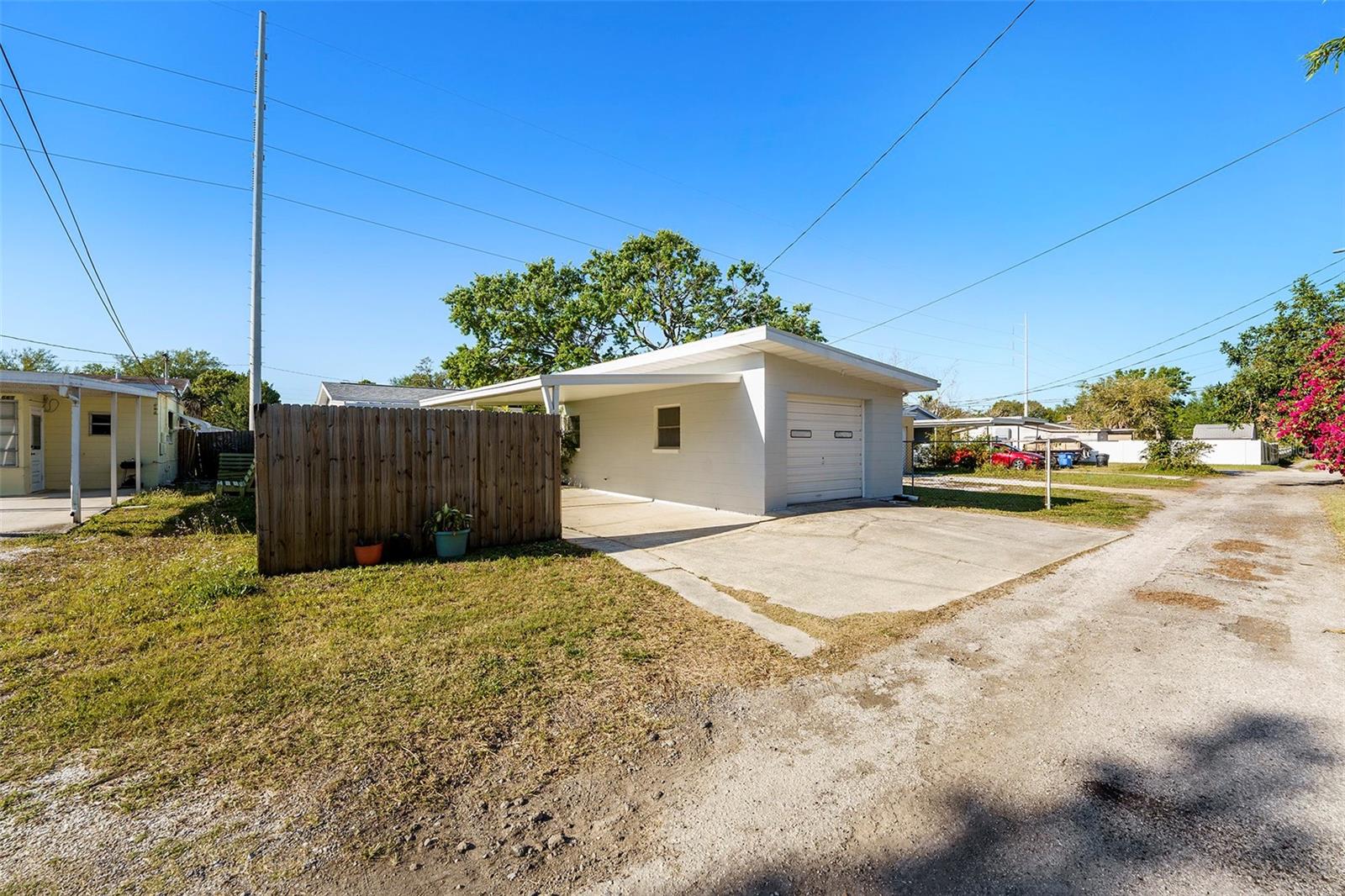 PRICE REDUCED! BELOW MARKET VALUE! This is the ONE! This cozy yet functional property offers a perfect blend of comfort and convenience, with the added potential to increase equity by transforming the oversized detached garage with its own bathroom into a guest suite, rental unit, or versatile workspace. This home had NO water intrusion or wind damage from the 2024 storm season. Welcome to this charming, beautifully updated 1-bedroom, 2-bathroom concrete block home located just one block off vibrant 4th Street in St. Pete Home Features: Beautiful midcentury vaulted ceiling with dark wood beams as you enter the front door. Large, Bright and Airy Living Space perfect for relaxing or entertaining. Updated Kitchen with quartz countertops, newer stainless appliances, and ample solid wood cabinet storage. Spacious Bedroom with ample natural light and closet space. Updated Bathroom featuring modern fixtures and stylish finishes. Fresh Paint and New Flooring throughout, giving the home a modern yet welcoming feel. Detached Oversized Garage with Bonus Bath: The detached 1-car garage is generously sized, offering plenty of room for vehicle storage plus additional space for a workshop, hobby area., or outdoor entertainment. The convenient second bathroom in the garage adds versatility, ideal for adding equity with additional living area, guest suite or potential ADU. Location Highlights: Situated just one block from 4th Street, you’ll enjoy easy access to a variety of restaurants, shops, and entertainment. Minutes from downtown St. Petersburg, park access is 1 block away, and local beaches. Convenient access to major roadways for easy commuting. This property is perfect for first-time buyers, downsizers, or anyone seeking a well-located home with flexible garage space. Don’t miss this rare opportunity in a prime St. Petersburg neighborhood! Schedule your private showing today!