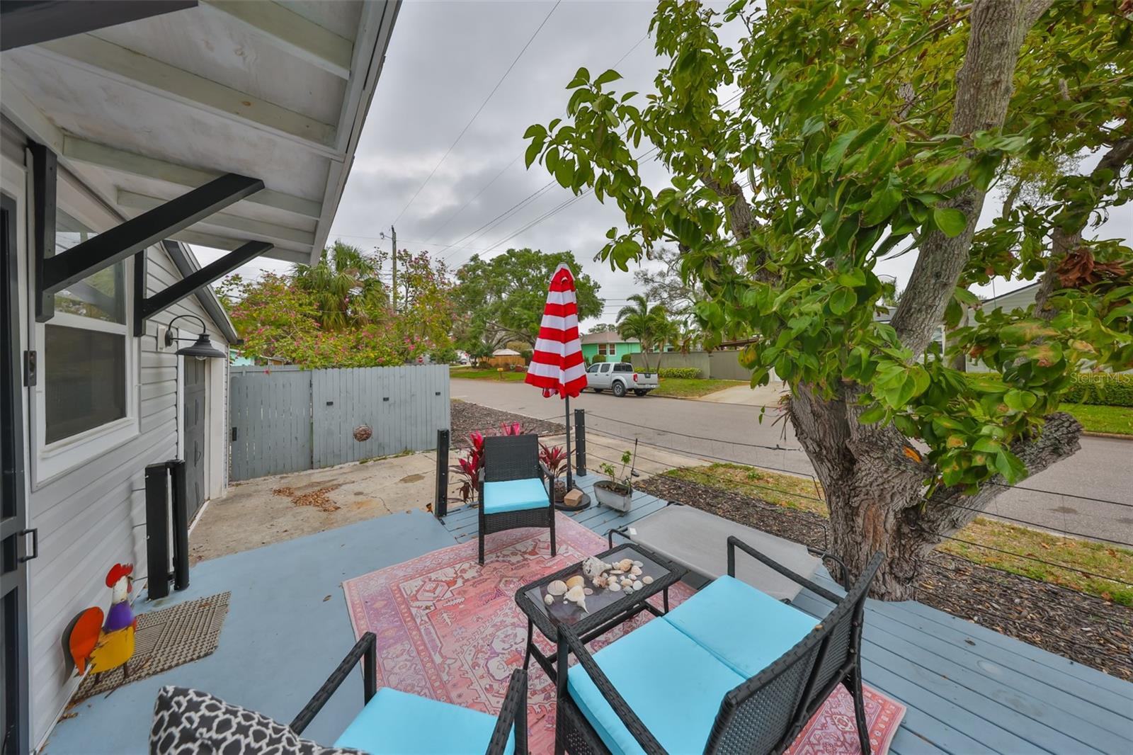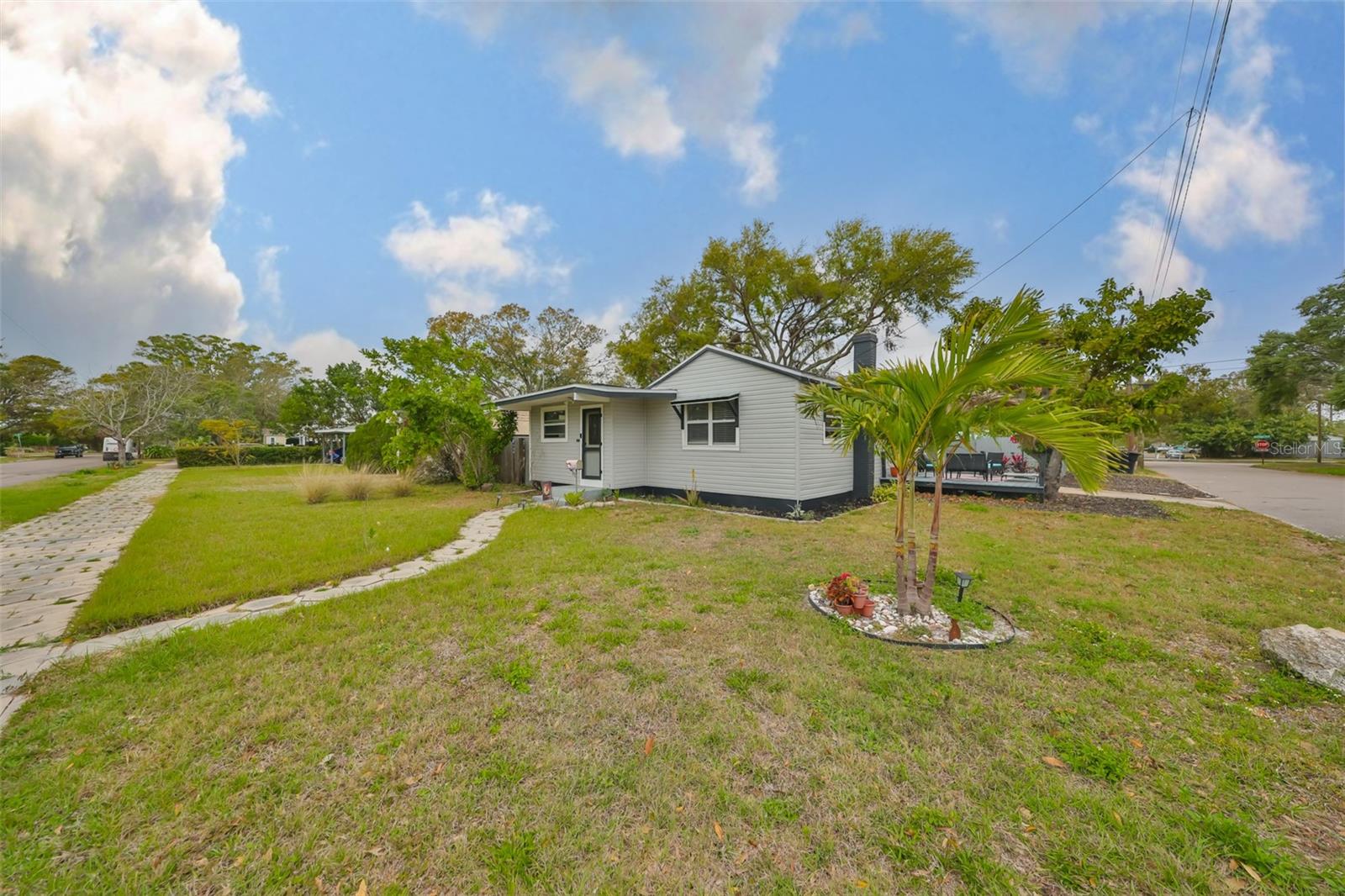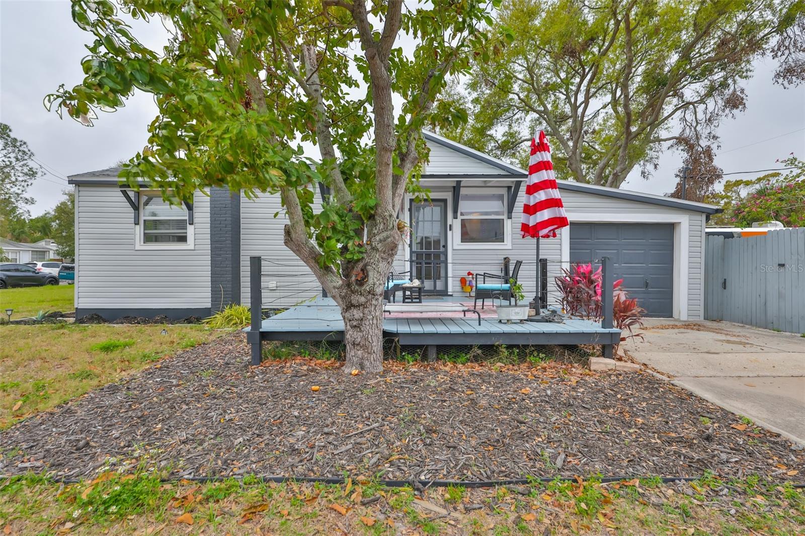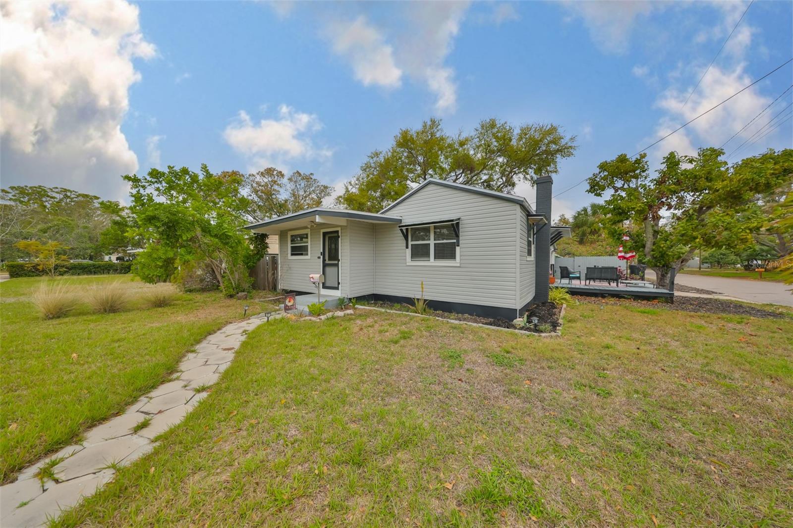 “Colorful Charmer” - Located on a corner lot in West St. Pete, this creatively designed space offers 2 bedrooms and 1.5 bathrooms with a 1-car attached garage. The heart of the home is the energetic, inspired kitchen that pops color at every turn. The colorful, redesigned kitchen with custom tile has been curated to include butcher block countertops with crisp white cabinets to create a modern vibe. A convenient laundry closet is located in the kitchen. A door off the kitchen leads to a deck ideal for morning coffee or relaxing during sunset. The home features 2 bedrooms with the primary bedroom off the living room, and the 2nd bedroom at the rear of the home has a ½ bath attached and a door leading to the courtyard with an outdoor shower and rear garden area. A hallway bathroom with a custom-designed door offers a walk-in shower with modern tile accents. The location provides easy access to the "SunRunner" just a few blocks away for travel to the Gulf Beaches, as well as the convenience of Downtown. All the convenience of dining, shopping, and entertainment on Central Ave and the Tyrone shopping areas, all within minutes. The fun and excitement of Downtown St. Pete is less than a 10-minute drive. Located in a non-flood zone with easy alley access.