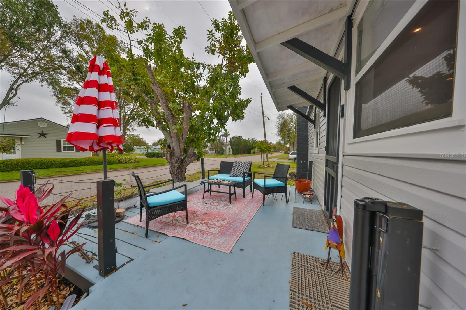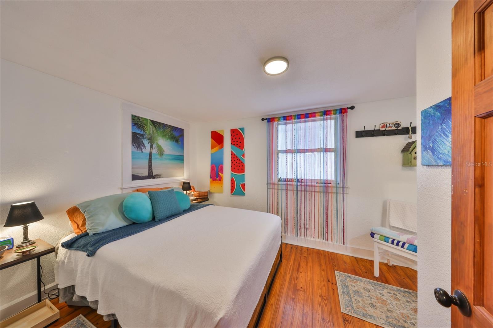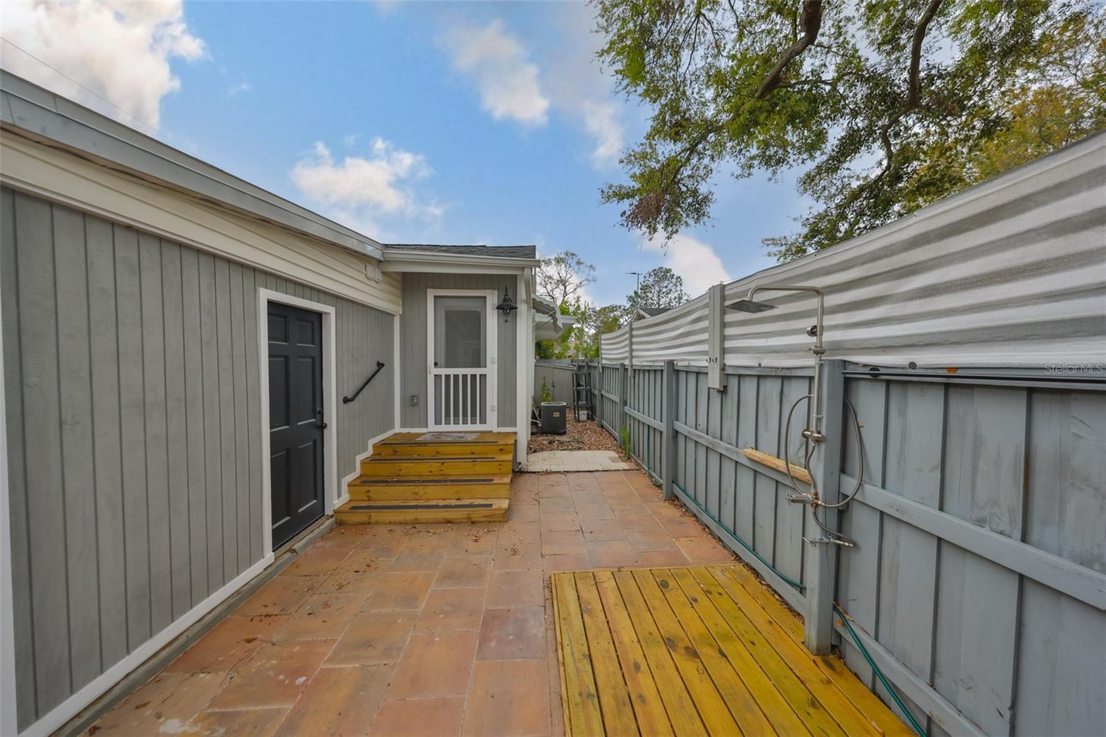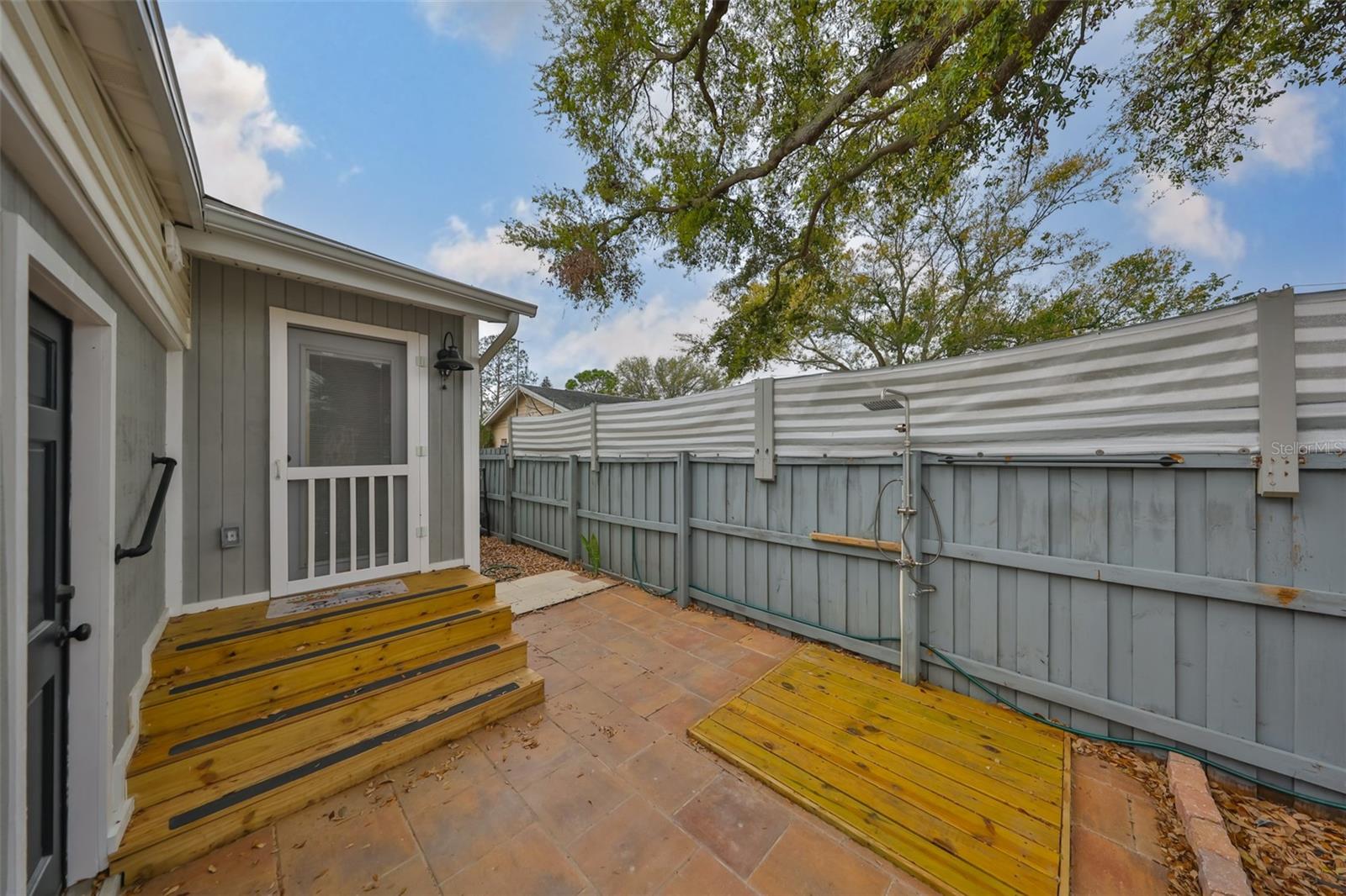 “Colorful Charmer” - Located on a corner lot in West St. Pete, this creatively designed space offers 2 bedrooms and 1.5 bathrooms with a 1-car attached garage. The heart of the home is the energetic, inspired kitchen that pops color at every turn. The colorful, redesigned kitchen with custom tile has been curated to include butcher block countertops with crisp white cabinets to create a modern vibe. A convenient laundry closet is located in the kitchen. A door off the kitchen leads to a deck ideal for morning coffee or relaxing during sunset. The home features 2 bedrooms with the primary bedroom off the living room, and the 2nd bedroom at the rear of the home has a ½ bath attached and a door leading to the courtyard with an outdoor shower and rear garden area. A hallway bathroom with a custom-designed door offers a walk-in shower with modern tile accents. The location provides easy access to the "SunRunner" just a few blocks away for travel to the Gulf Beaches, as well as the convenience of Downtown. All the convenience of dining, shopping, and entertainment on Central Ave and the Tyrone shopping areas, all within minutes. The fun and excitement of Downtown St. Pete is less than a 10-minute drive. Located in a non-flood zone with easy alley access.
