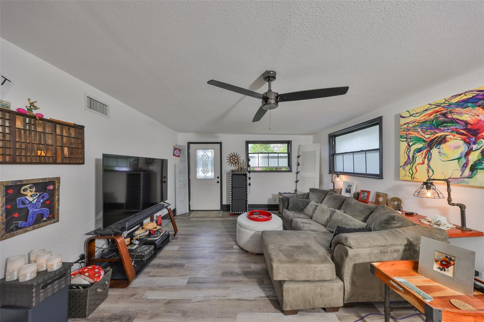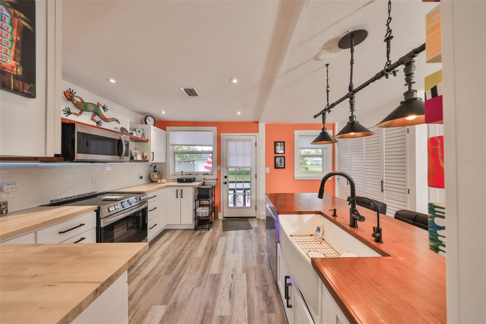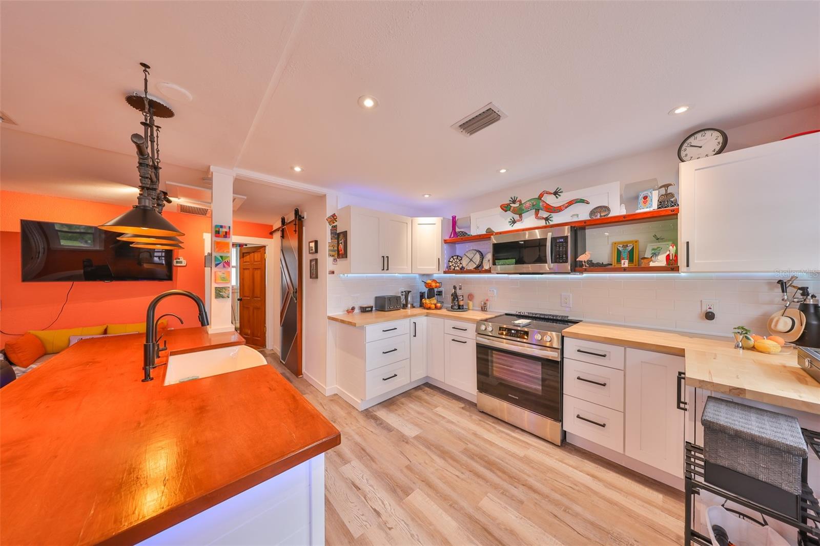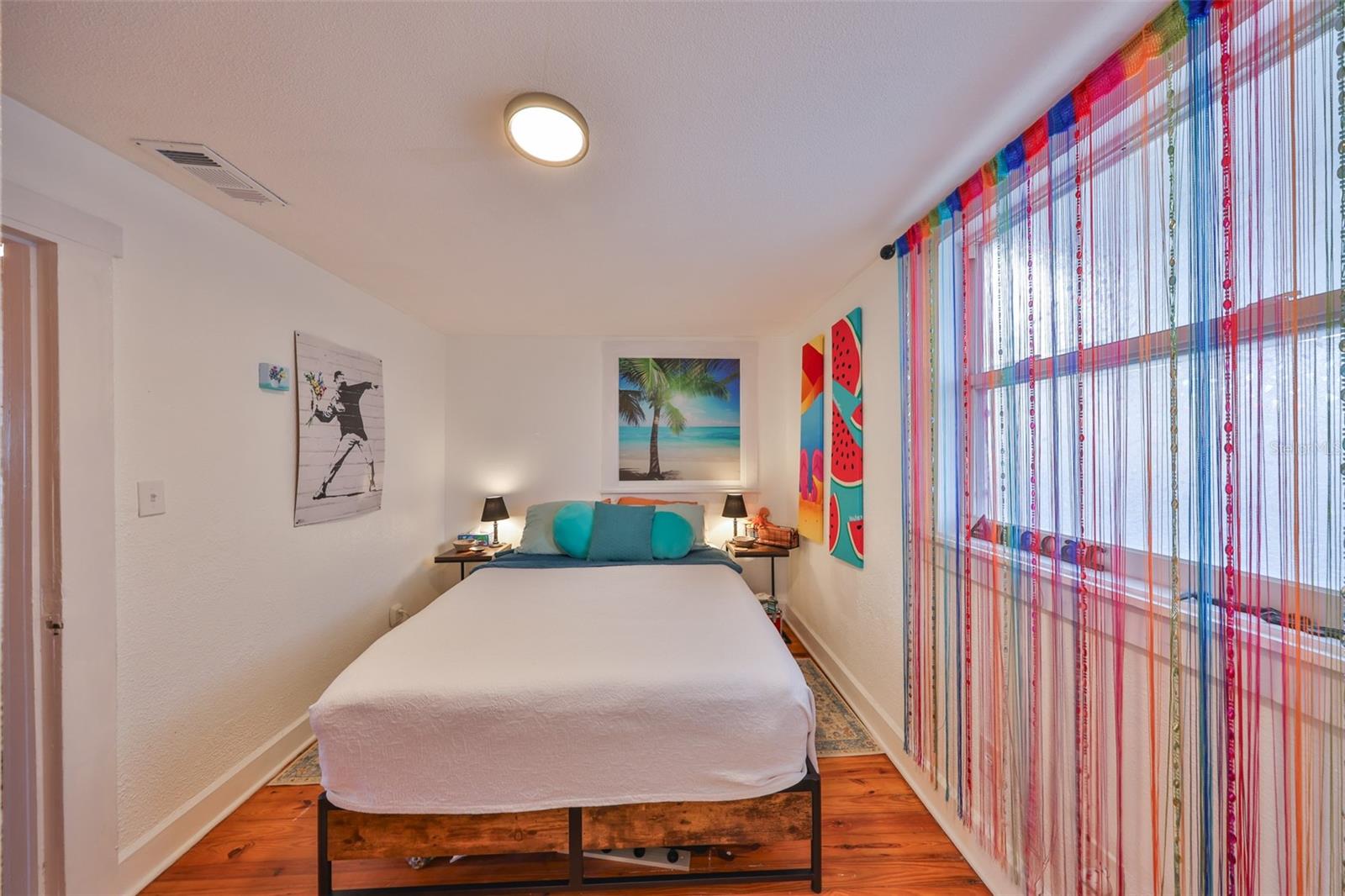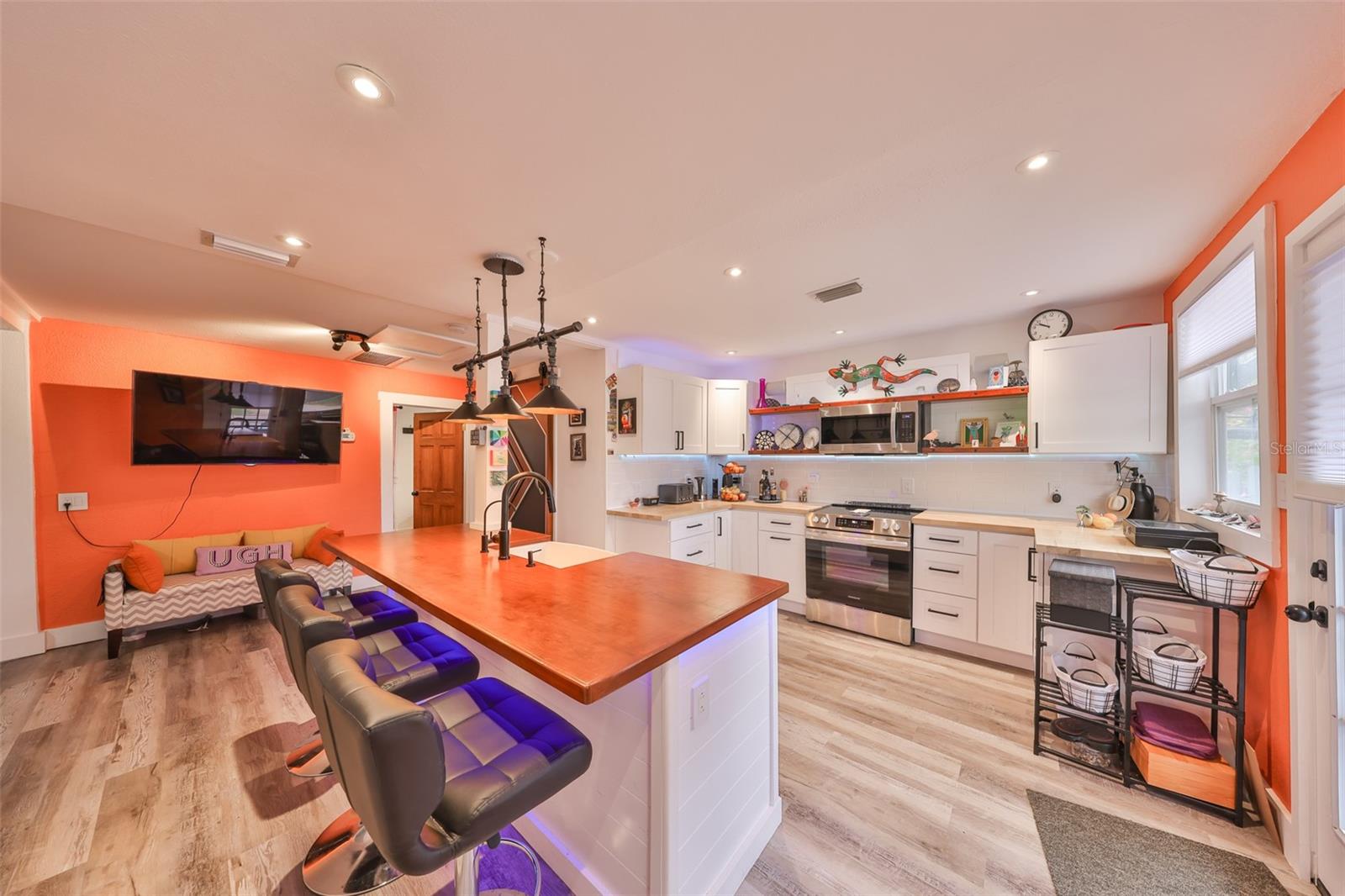 “Colorful Charmer” - Located on a corner lot in West St. Pete, this creatively designed space offers 2 bedrooms and 1.5 bathrooms with a 1-car attached garage. The heart of the home is the energetic, inspired kitchen that pops color at every turn. The colorful, redesigned kitchen with custom tile has been curated to include butcher block countertops with crisp white cabinets to create a modern vibe. A convenient laundry closet is located in the kitchen. A door off the kitchen leads to a deck ideal for morning coffee or relaxing during sunset. The home features 2 bedrooms with the primary bedroom off the living room, and the 2nd bedroom at the rear of the home has a ½ bath attached and a door leading to the courtyard with an outdoor shower and rear garden area. A hallway bathroom with a custom-designed door offers a walk-in shower with modern tile accents. The location provides easy access to the "SunRunner" just a few blocks away for travel to the Gulf Beaches, as well as the convenience of Downtown. All the convenience of dining, shopping, and entertainment on Central Ave and the Tyrone shopping areas, all within minutes. The fun and excitement of Downtown St. Pete is less than a 10-minute drive. Located in a non-flood zone with easy alley access.