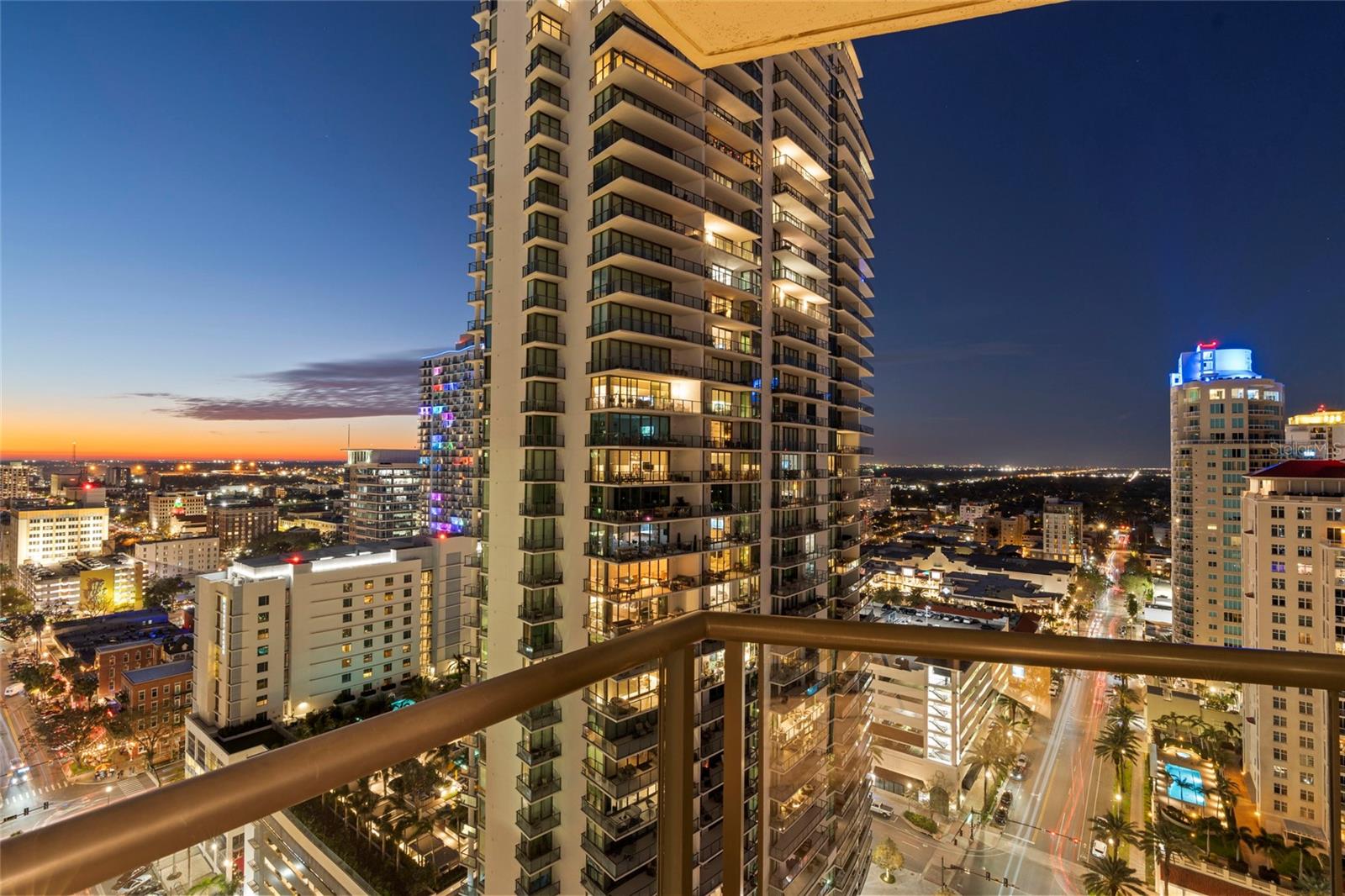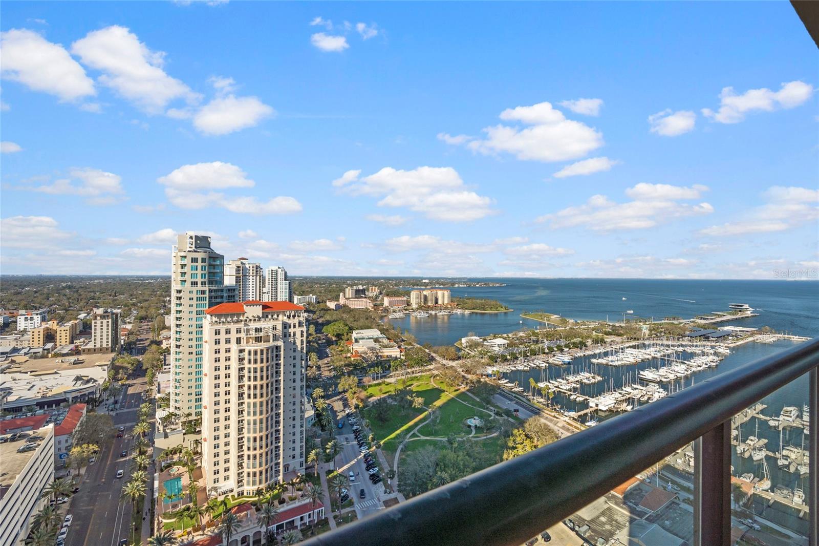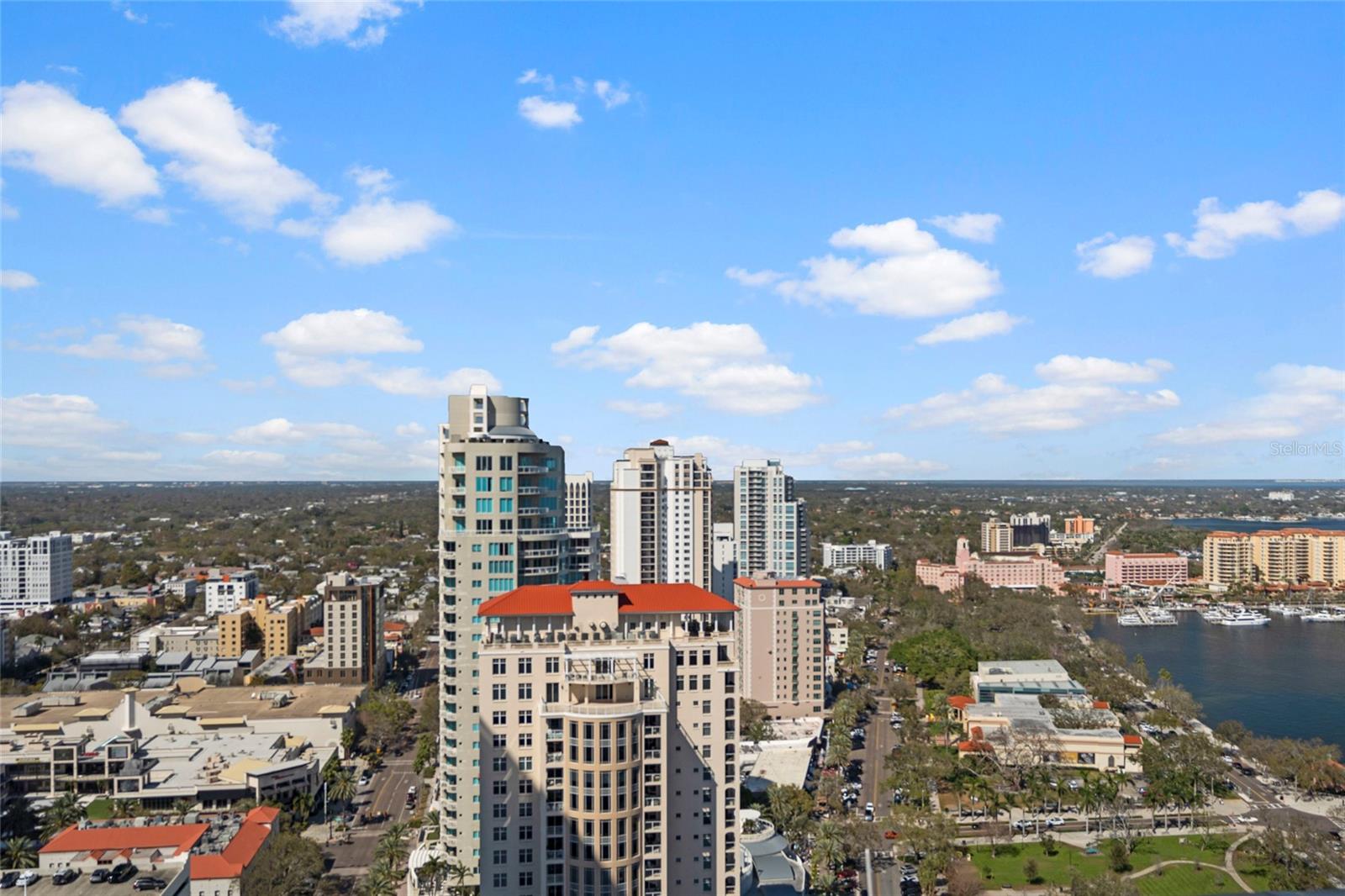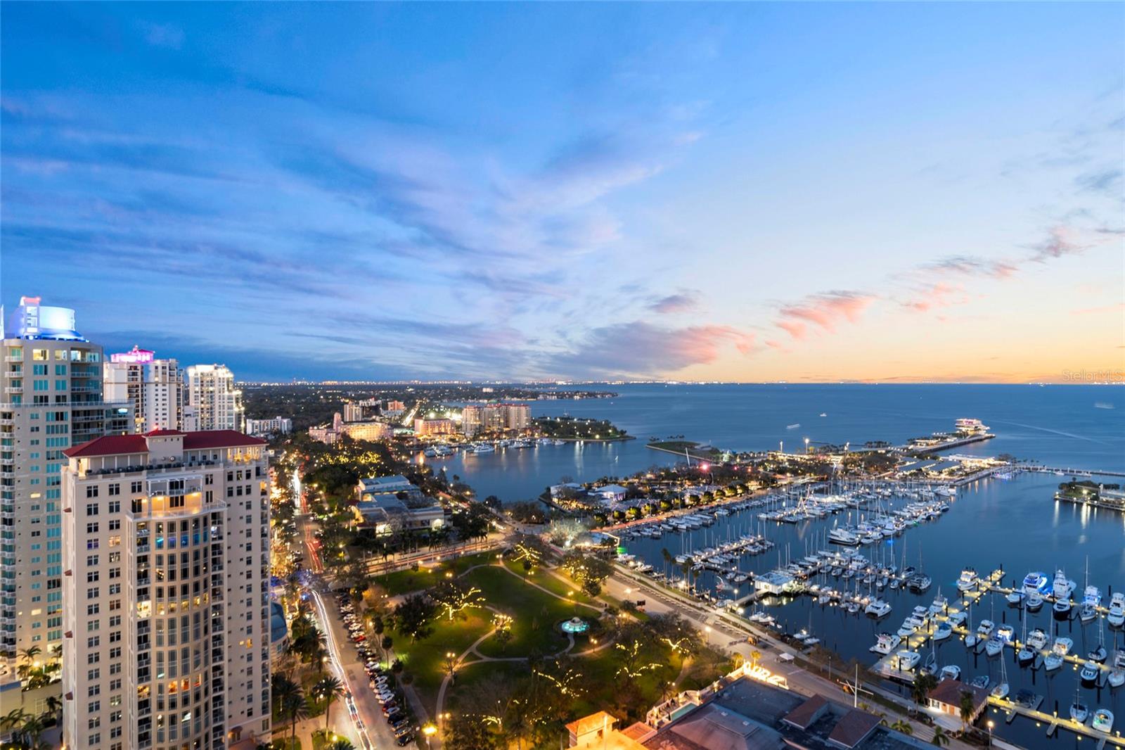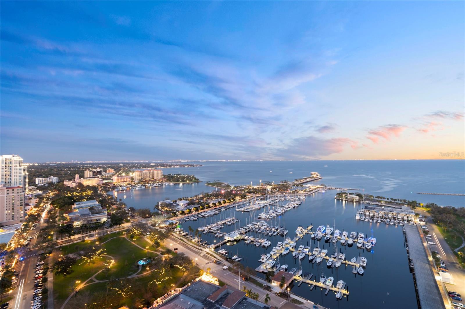 Step into luxury with this fully remodeled 2-bedroom, 2.5-bath condominium on the 24th floor of the renowned Bayfront Tower. Spanning an expansive 2,158 square feet, this NW corner unit offers unparalleled panoramic views of the St. Petersburg skyline, Tampa Bay, and beyond—encompassing the Skyway Bridge, the Gulf of America, downtown St. Petersburg, and even downtown Tampa. From every window, the vibrant city and serene bay unfold in breathtaking 180-degree vistas. Designed for modern luxury, this residence was meticulously remodeled in 2019 with the finest materials and finishes. As you enter, you are immediately greeted by 60 feet of floor-to-ceiling windows with electric shades that flood the space with natural light, highlighting the wide engineered plank hardwood floors and the porcelain tile found throughout the bathrooms. Thoughtfully crafted with LED indirect lighting and Lutron wireless controls, the home exudes a warm and inviting ambiance. The gourmet kitchen is a chef’s dream, featuring a top-tier induction cooktop, double wall oven with a microwave/convection combo, Sub-Zero refrigerator, Asko dishwasher, wine cooler, and custom cabinetry topped with quartz countertops. Whether preparing an intimate meal or entertaining guests, the stunning views make every culinary experience extraordinary. The kitchen provides the perfect vantage point for breathtaking sunsets, ensuring that each evening feels like a special occasion. The flexible layout includes an office/den/guest bedroom with scenic views of the Vinoy Basin and Tampa. The owner's suite offers a private retreat, complete with a spacious 14.5’ x 10.5’ walk-in closet and calming sunset views. Bayfront Tower offers an array of unparalleled amenities designed to enhance your lifestyle. Indulge in the resort-like rooftop, featuring a heated pool, gas grills, 360 running track, and shaded areas for unwinding while soaking in stunning views. The building also boasts a state-of-the-art gym, sauna, yoga/pilates room, game and card rooms, and a library, ensuring every resident has access to first-class leisure and convenience. The exclusive features continue with valet service available 24/7, offering the ultimate in convenience. For those looking for a true sense of community, Bayfront Tower also offers an auditorium, two bars, and an expansive ballroom, with a capacity of up to 150 guests, that has hosted countless memorable events, including weddings, making it the ideal space for gatherings. Located in the heart of Downtown St. Petersburg, this residence places you just steps away from fine dining, art galleries, museums, the St. Pete Yacht Club, lush parks, and vibrant nightlife. Experience the charm of Beach Drive, where the elegance of St. Pete meets the luxury lifestyle you deserve.