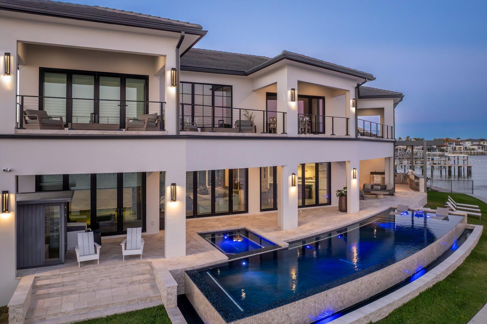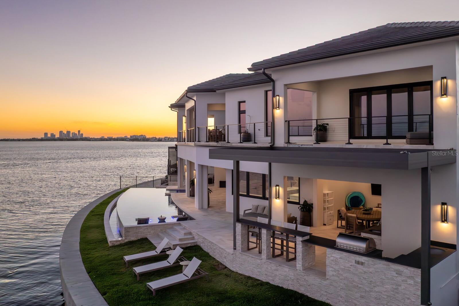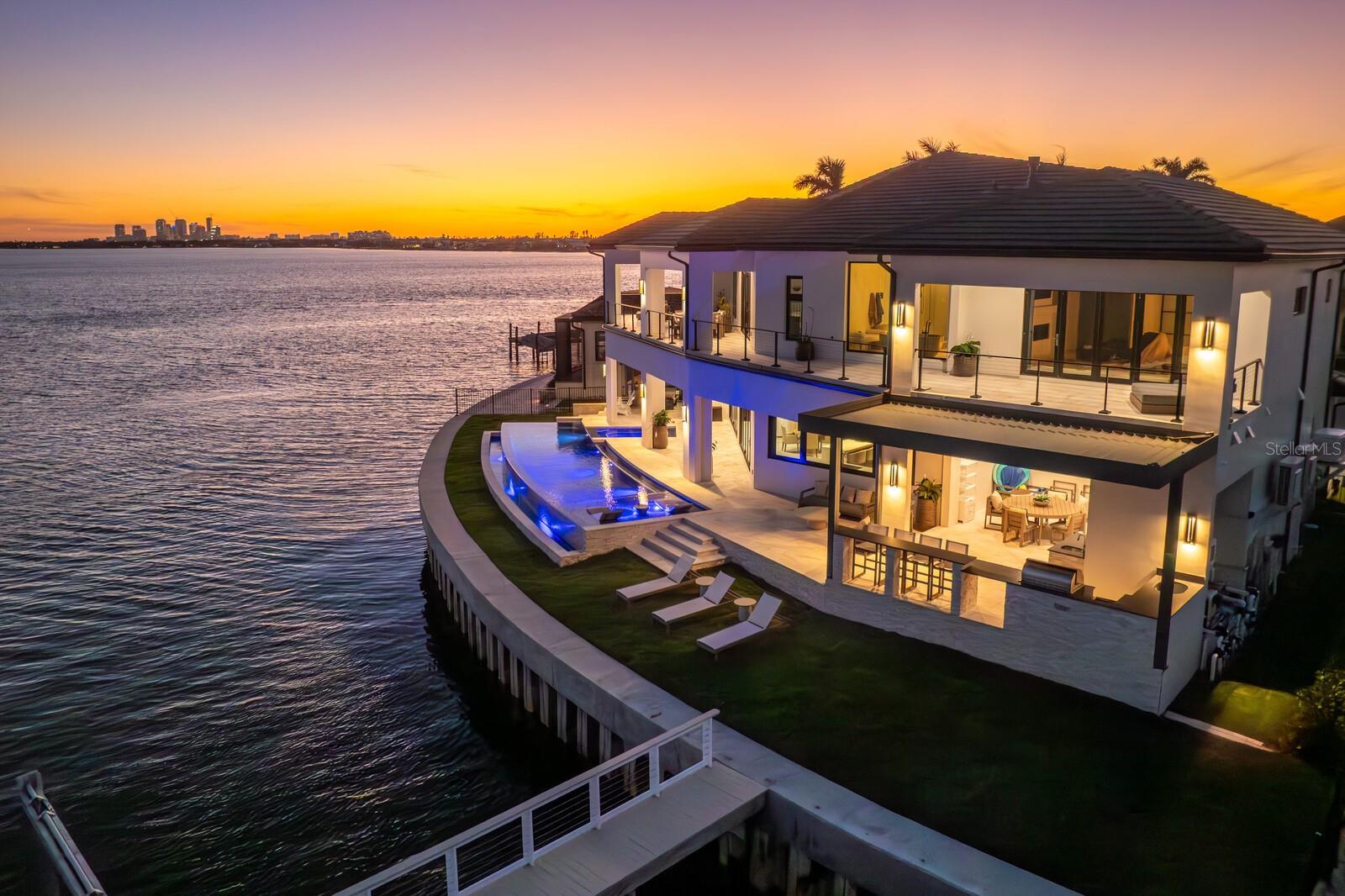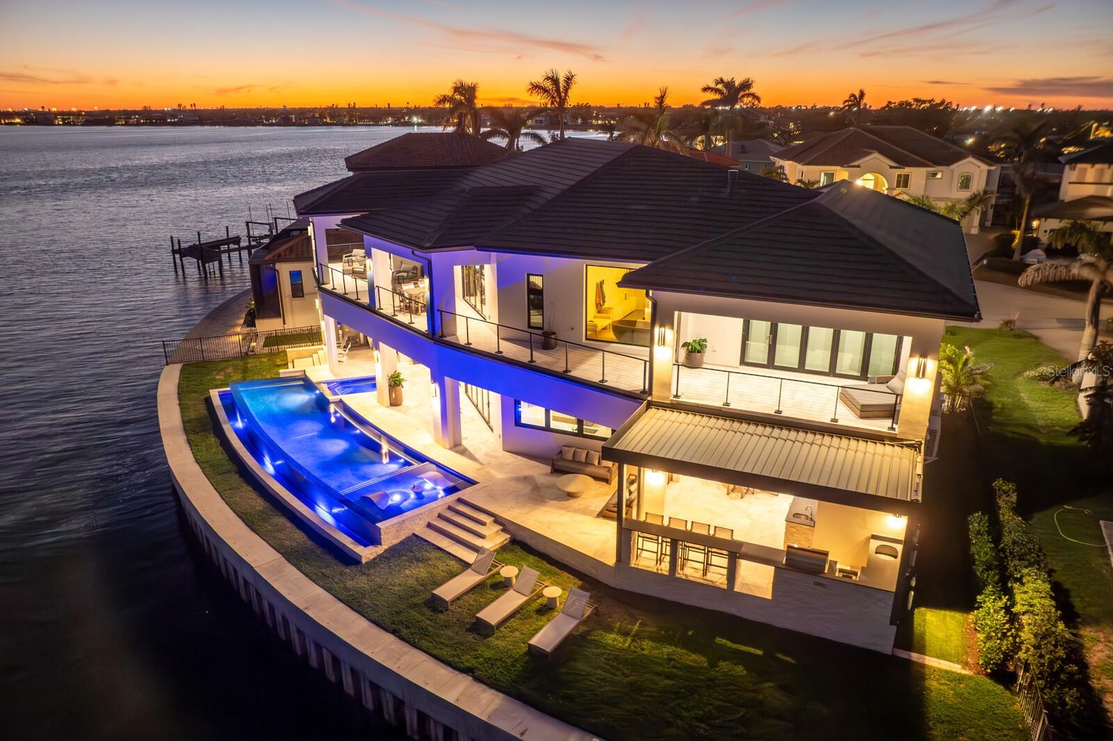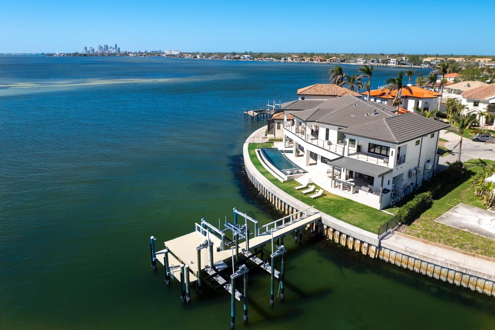 This rare point-lot newer construction estate in Venetian Isles offers 137 feet of wide-open water frontage and unobstructed views of the downtown St. Petersburg skyline. Built with concrete block construction, impact-rated windows and doors, and an elevated foundation, the home was engineered for resilience—its design and storm-rated features helped ensure the interior remained protected during recent severe weather. For boaters, the commercial-grade dock is a standout feature—offering deep water access, a high-speed 40,000 lb boat lift, and two jet ski lifts. With direct access to open water and no fixed bridges, this home delivers true Gulf access with top-tier marina-grade infrastructure. Crafted to the highest modern standards, the home features contemporary finishes and cutting-edge technology with Savant whole-home automation throughout controlling lights, blinds, and music. Designed for seamless indoor-outdoor living, the resort-style exterior includes an infinity-edge pool, oversized covered hot tub, sauna, expansive lounge areas, and a full outdoor kitchen and bar. Accordion-style kitchen windows open directly to the poolside bar, creating a fluid connection ideal for entertaining. Inside, five spacious bedrooms and open-concept living areas are accented by Restoration Hardware lighting. The chef’s kitchen is a true centerpiece, featuring custom cabinetry, dual oversized islands, Wolf and Sub-Zero appliances, two Bosch dishwashers, a warming drawer, ice machine, and a hidden walk-in pantry. A 180-bottle walk-in wine room and cigar humidor offers custom racking, ambient lighting, and precision climate control. Upstairs, the sky lounge and wet bar open to a large balcony with sweeping bay views—perfect for sunset cocktails. Additional highlights include a whole-house generator, two fireplaces, a water filtration system, a commercial ice machine and freezer, in garage and a climate-controlled storage room with full shower/dog wash. This home is not just a place to live; it’s a lifestyle and a rare opportunity to own one of the most coveted waterfront estates in St. Petersburg. Schedule your private showing today and experience the pinnacle of luxury living.