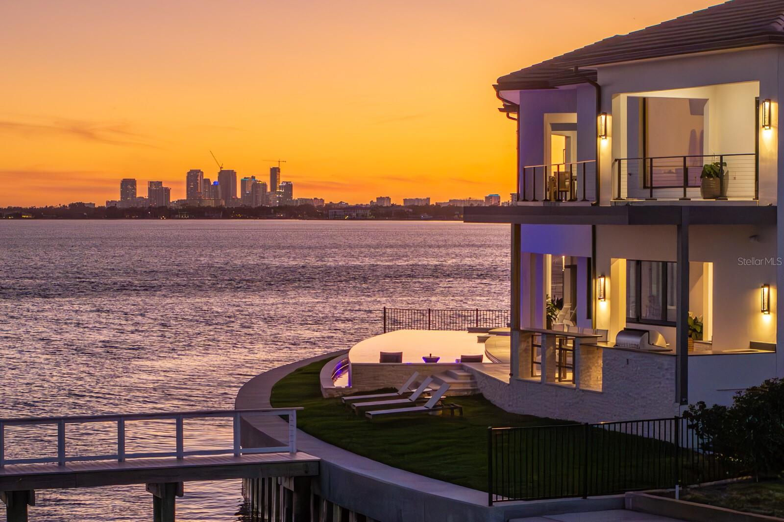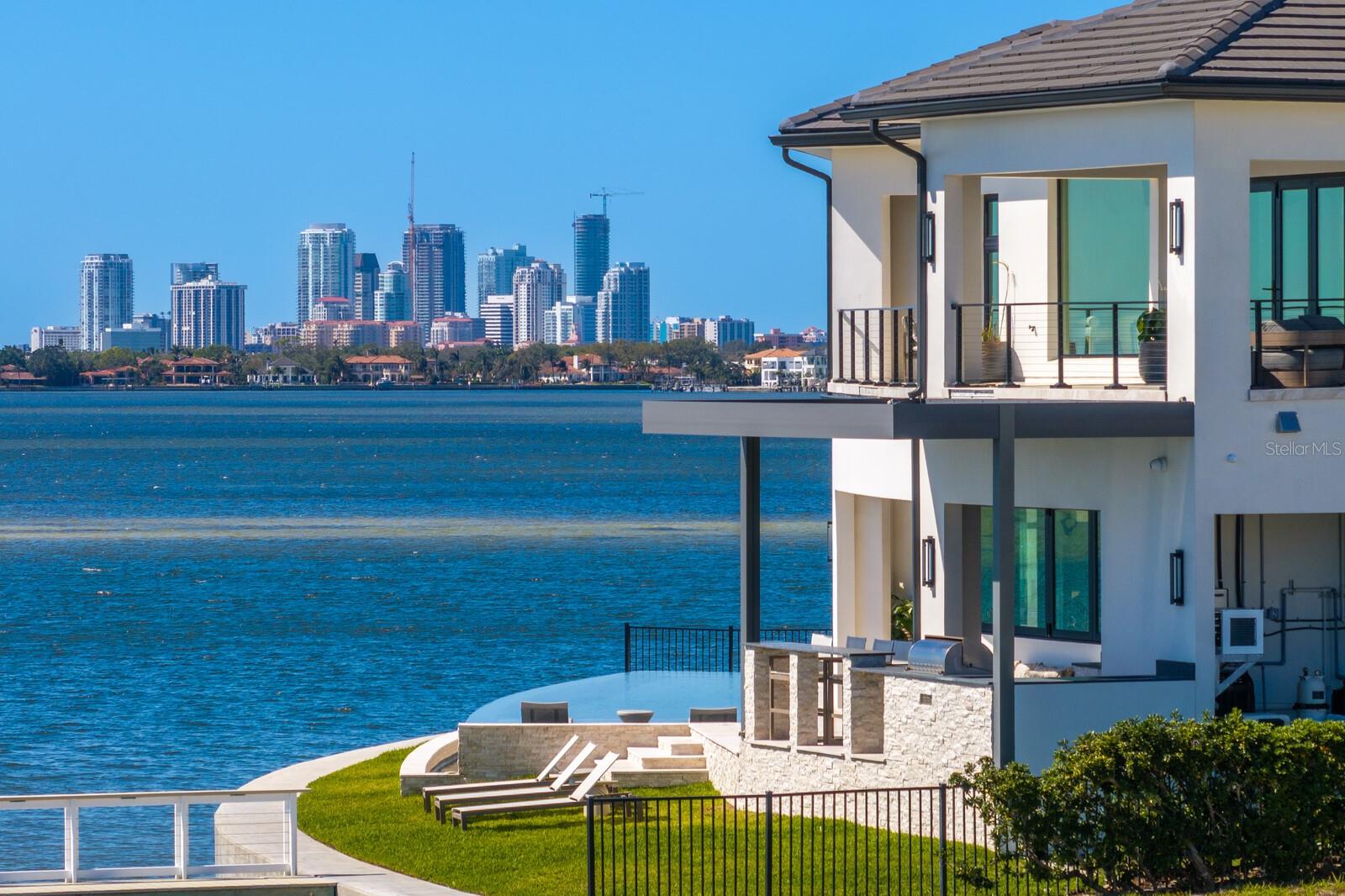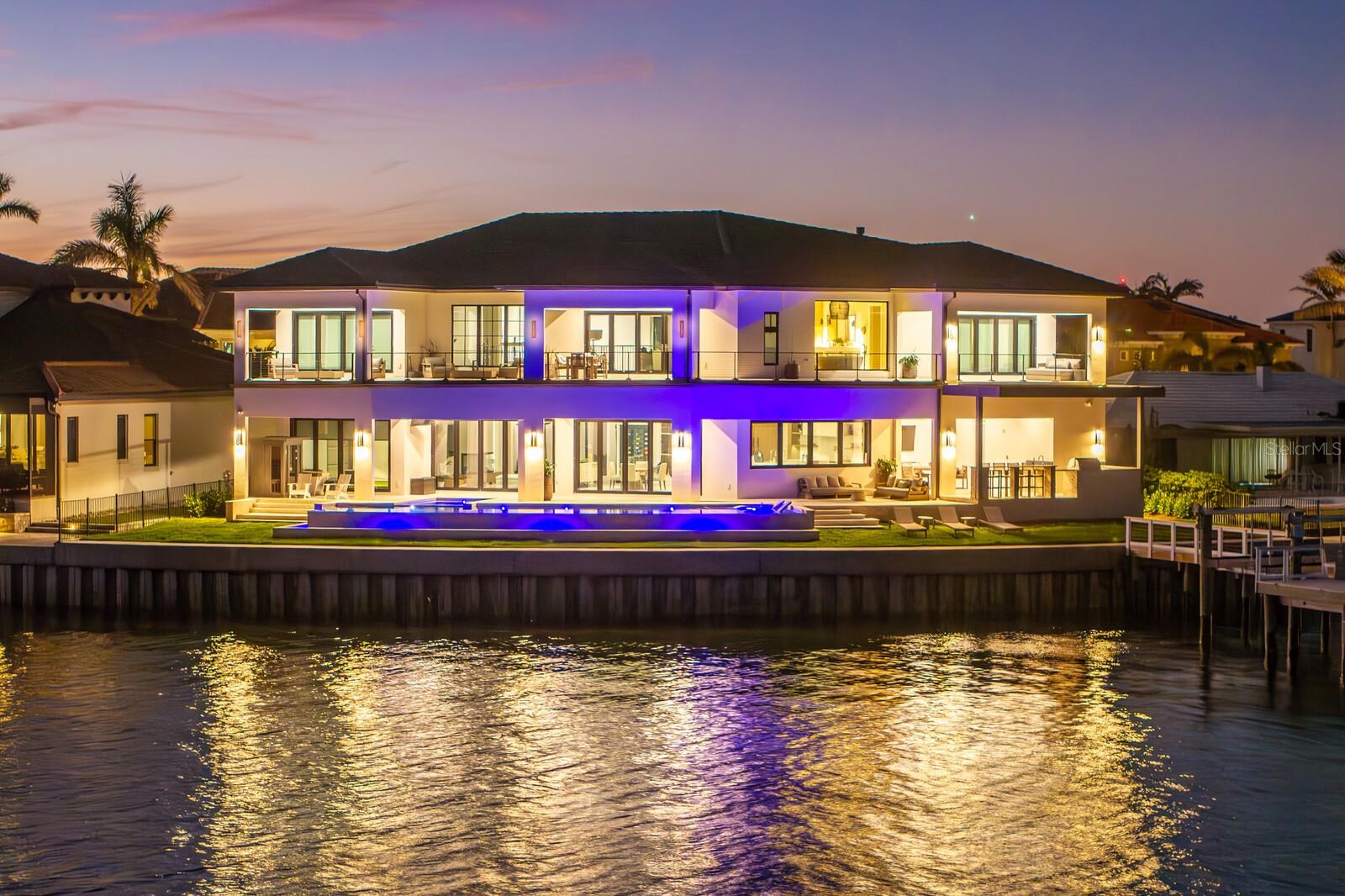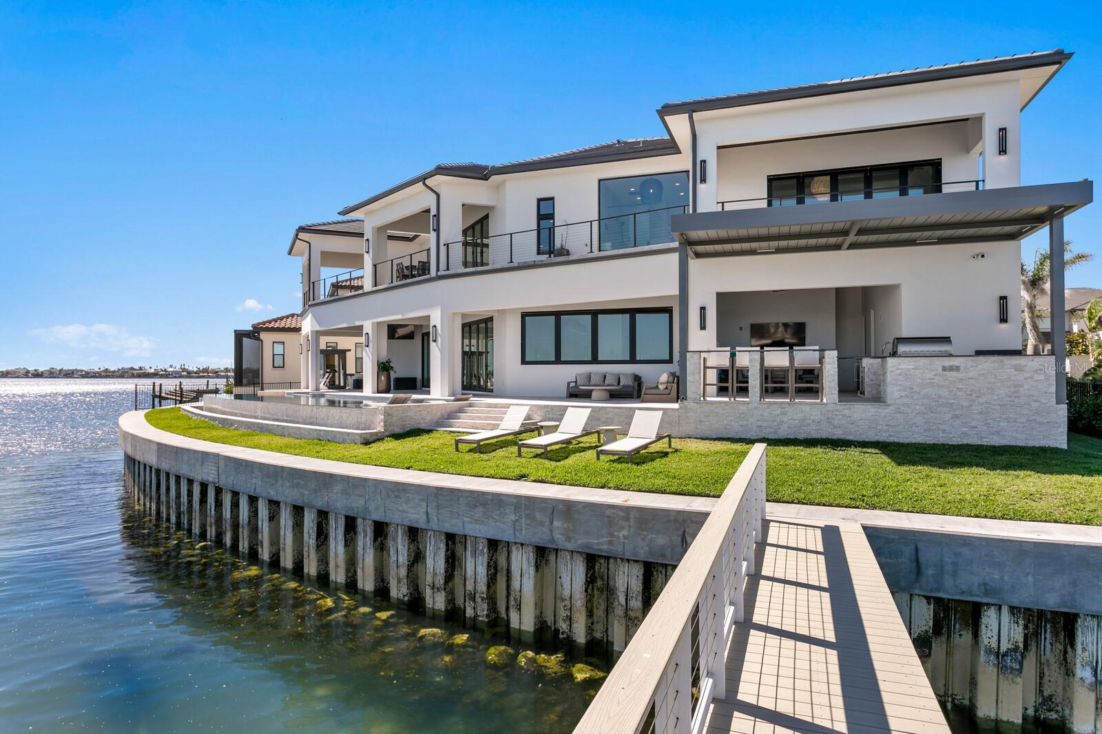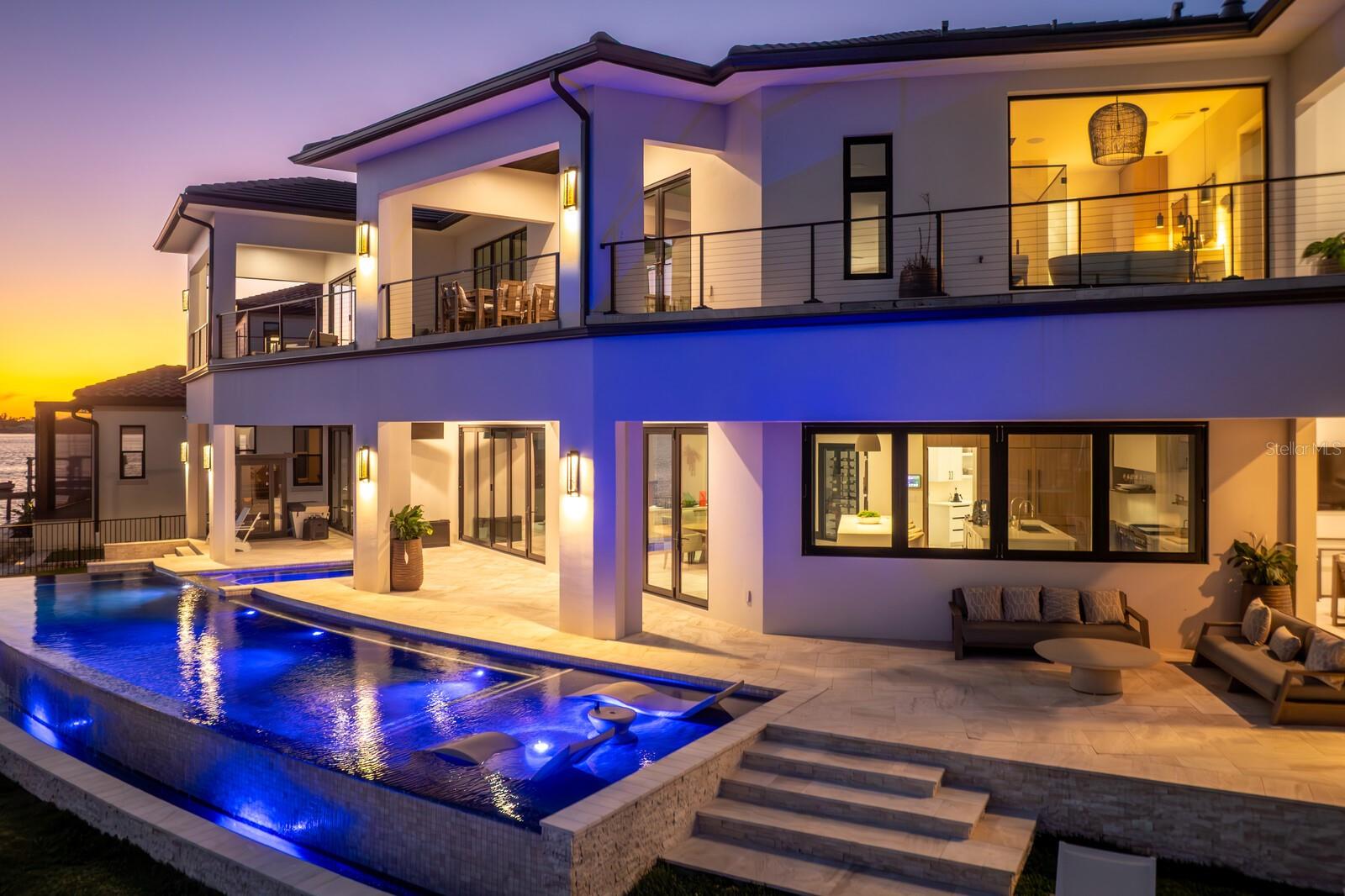 This rare point-lot newer construction estate in Venetian Isles offers 137 feet of wide-open water frontage and unobstructed views of the downtown St. Petersburg skyline. Built with concrete block construction, impact-rated windows and doors, and an elevated foundation, the home was engineered for resilience—its design and storm-rated features helped ensure the interior remained protected during recent severe weather. For boaters, the commercial-grade dock is a standout feature—offering deep water access, a high-speed 40,000 lb boat lift, and two jet ski lifts. With direct access to open water and no fixed bridges, this home delivers true Gulf access with top-tier marina-grade infrastructure. Crafted to the highest modern standards, the home features contemporary finishes and cutting-edge technology with Savant whole-home automation throughout controlling lights, blinds, and music. Designed for seamless indoor-outdoor living, the resort-style exterior includes an infinity-edge pool, oversized covered hot tub, sauna, expansive lounge areas, and a full outdoor kitchen and bar. Accordion-style kitchen windows open directly to the poolside bar, creating a fluid connection ideal for entertaining. Inside, five spacious bedrooms and open-concept living areas are accented by Restoration Hardware lighting. The chef’s kitchen is a true centerpiece, featuring custom cabinetry, dual oversized islands, Wolf and Sub-Zero appliances, two Bosch dishwashers, a warming drawer, ice machine, and a hidden walk-in pantry. A 180-bottle walk-in wine room and cigar humidor offers custom racking, ambient lighting, and precision climate control. Upstairs, the sky lounge and wet bar open to a large balcony with sweeping bay views—perfect for sunset cocktails. Additional highlights include a whole-house generator, two fireplaces, a water filtration system, a commercial ice machine and freezer, in garage and a climate-controlled storage room with full shower/dog wash. This home is not just a place to live; it’s a lifestyle and a rare opportunity to own one of the most coveted waterfront estates in St. Petersburg. Schedule your private showing today and experience the pinnacle of luxury living.