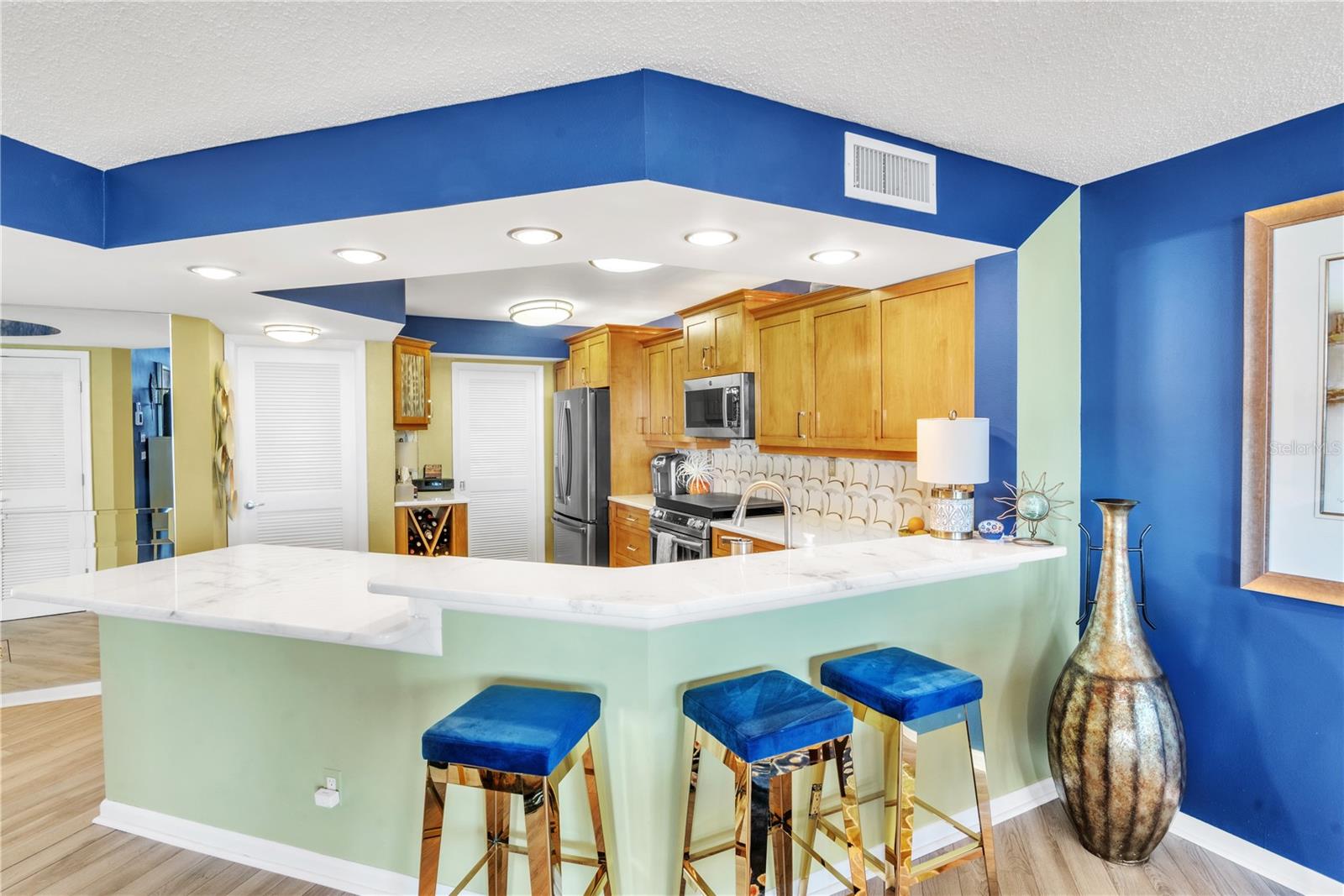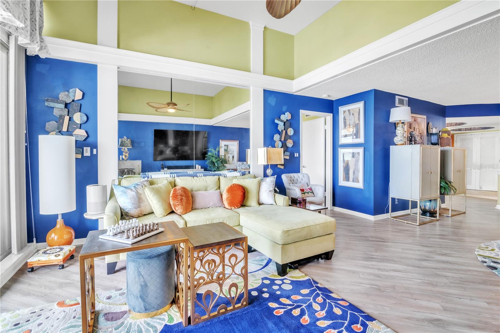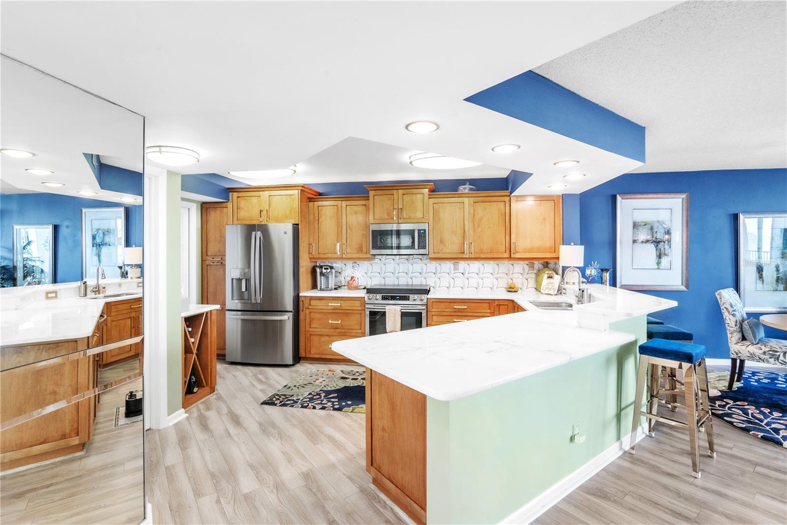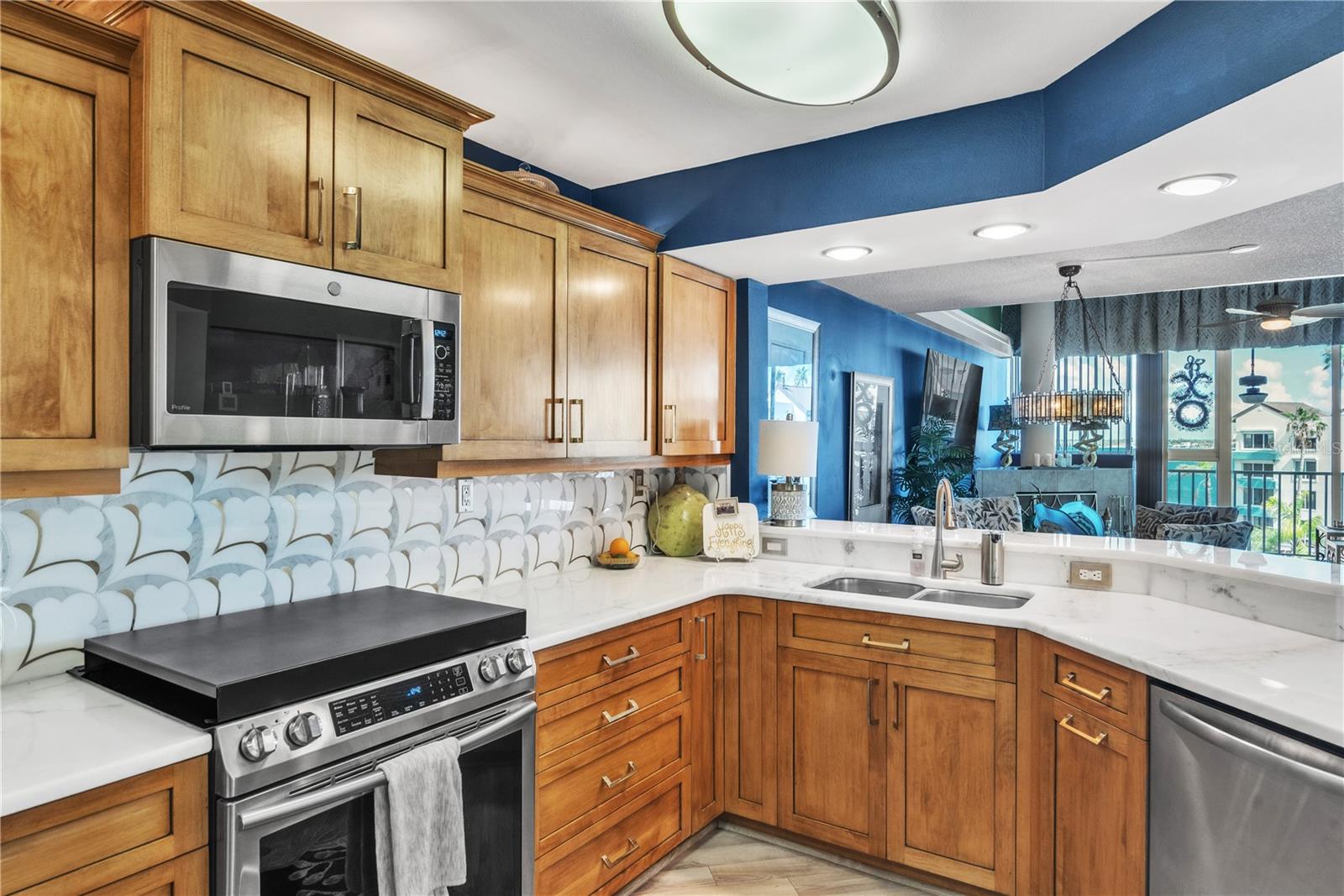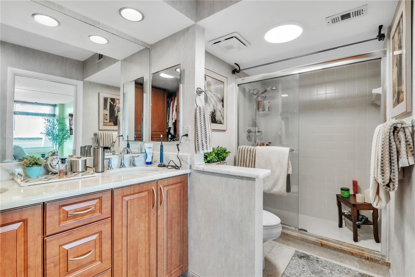 WATERFRONT Penthouse condo with unobstructed views of the bay!! This condo features 2 bedrooms, 2 bathrooms and an additional den which can be used as an office, a separate closet room or third bedroom. This condo has a beautiful entry way and foyer area. The kitchen is upgraded! This beautiful kitchen was completely reconfigured and remodeled with stunning marble countertops, backsplash, and stainless-steel appliances and it is open to the spacious living room! The open floor plan maximizes the space and allows for plenty of natural light. This penthouse unit features vaulted ceilings in the living room and has a decorative electric fireplace. Split bedroom floor plan ensures complete privacy. The master bedroom is situated on the bayside providing beautiful views of the bay. The en-suite bathroom has a walk-in custom made closet and custom vanities with dual sinks. Both bathrooms have been updated with new cabinetry, marble countertops and vanities. The guest bedroom has two Murphy twin size beds with shelves and adjustable reading lights. The large balcony is perfect for relaxing while taking in the stunning water views. You will enjoy the views of tropical serenity and of the pool from your condo. There is an inside laundry room off of the kitchen and a large storage room right outside your condo. Assigned parking space comes dedicated with the unit and additional guest parking spaces are available. Amenities include tennis courts, pickle ball, bocce ball courts, and a large pool/spa area. The pool is heated during the winter months and cooled down in the summer. Water views abound in this unit, whether you are in the living room, master bedroom, on the balcony or at the pool, the water views are amazing! Whether sunrise or sunset, you won't be disappointed. This condo is a must see and a pleasure to show!!