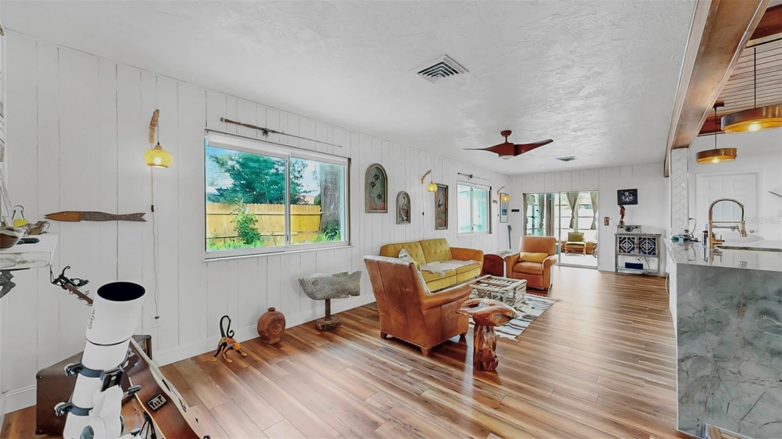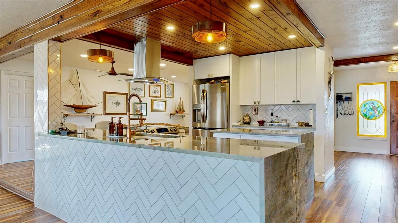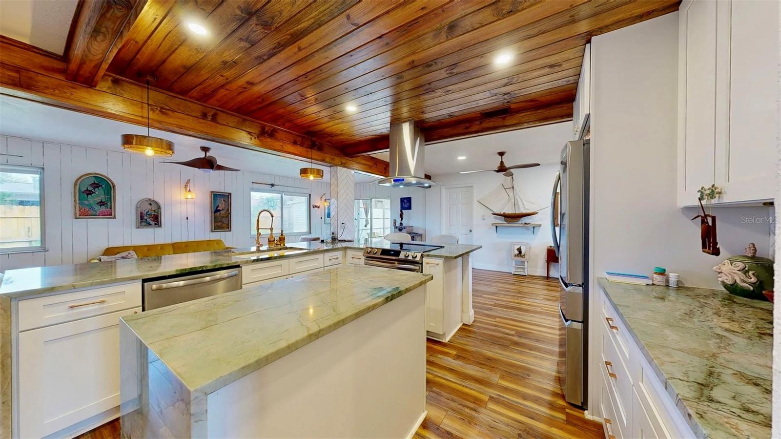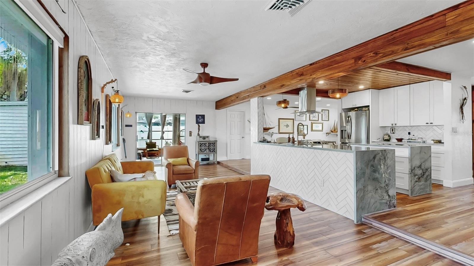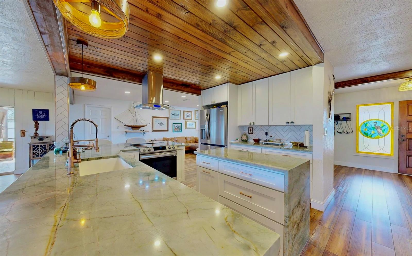 3/2 2,000 square feet Updated home with many custom features. The words Boho, and Florida beach cabin come to mind with all the modern touches you want. 180 degrees of entertaining space in the kitchen with a Marine green quartz countertop. This stone looks like a piece of art two waterfall pieces to really expose how beautiful it is to the dining room area. Stained shiplap wood beam crosses over the kitchen to give it a unique and rustic classy look. As you open the door to your new home you immediately feel the warmth with the stained wood arches inviting you into your dining room off the left, and the walk-in pantry closet to the right. This kitchen was built for the chef, the entertainer, for all those big gatherings it's waiting for you to make forever memories. shaker cabinets with rose gold hardware as well as some beachy vibe hardware. Herringbone tile wraps around the finishing touches. Both bathrooms have been updated tastefully to go along with the theme of the home. The master-bath is tiled with sage green subway tile and a mixed penny tile on the floor, as well as a navy blue double sink vanity with quartz countertop. The second bathroom has cement look tile and a green vanity with quartz countertop all new hardware. Off the master is a Florida room that is very Boho with tile from Spain, and wrapped around stain wood to match your kitchen. A lot of warmth is a great place to have that morning coffee or settle back in with a good book. It also has a unique accordion sliding door to open the room up and make it that much more inviting. The master bedroom is very spacious and also has a walk-in closet. This home also has so much ample storage, an oversized garage with a work station, racks for your fishing rods or storage needs. As well as a shed in the backyard. Plenty of parking a huge driveway with an extension on the side for your boat or RV. A boaters paradise close to the boat ramp, ice machines, bait shops, . 2 miles from Maximo park, 275. 10 -20 min to fort de soto and pass a grille beach. NO FLOODZONE Flood insurance not required, no hurricane damage. This home is a must see!!