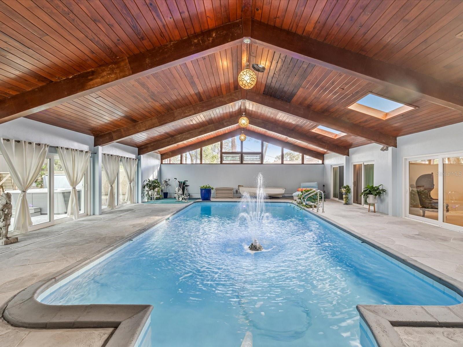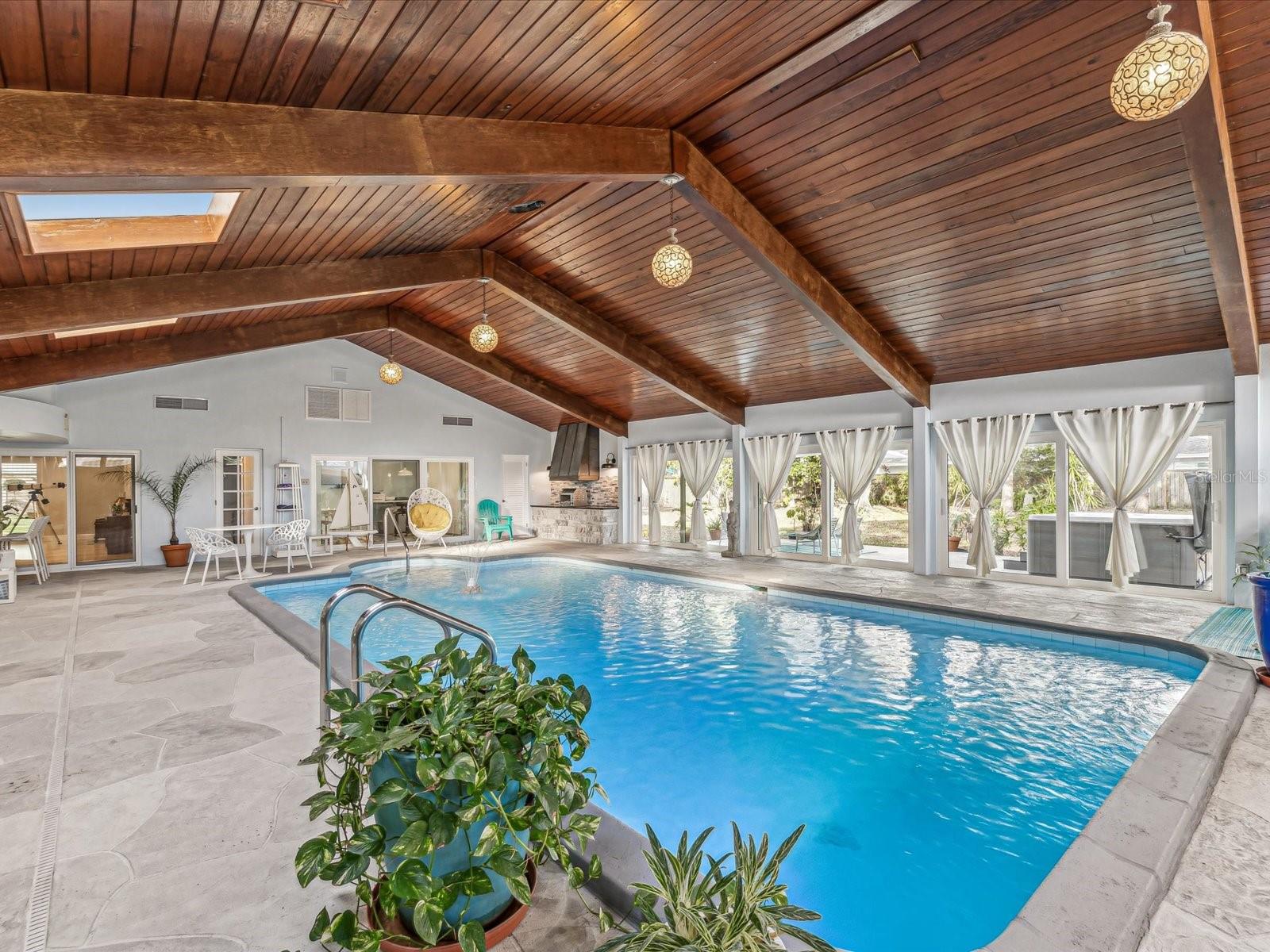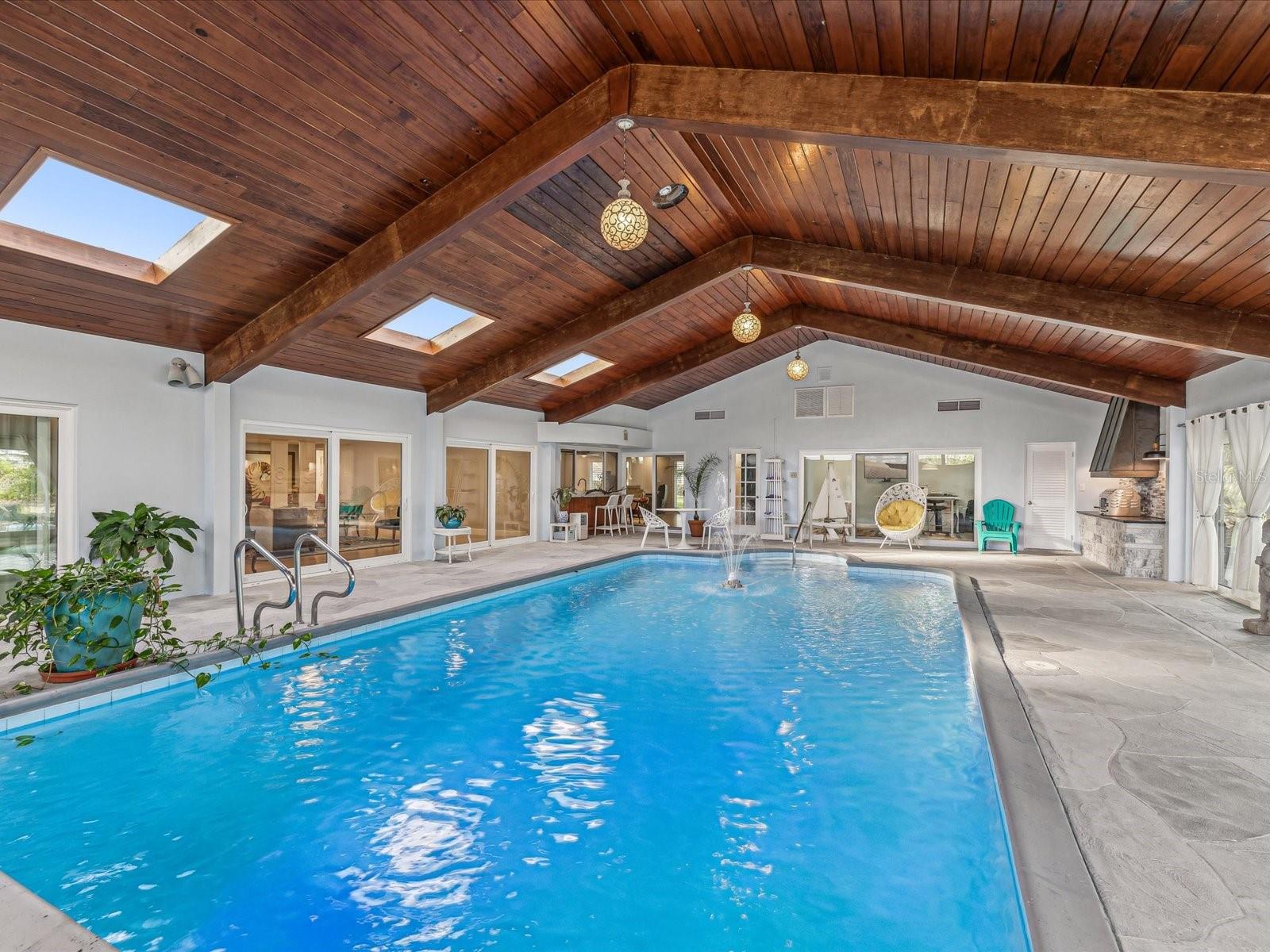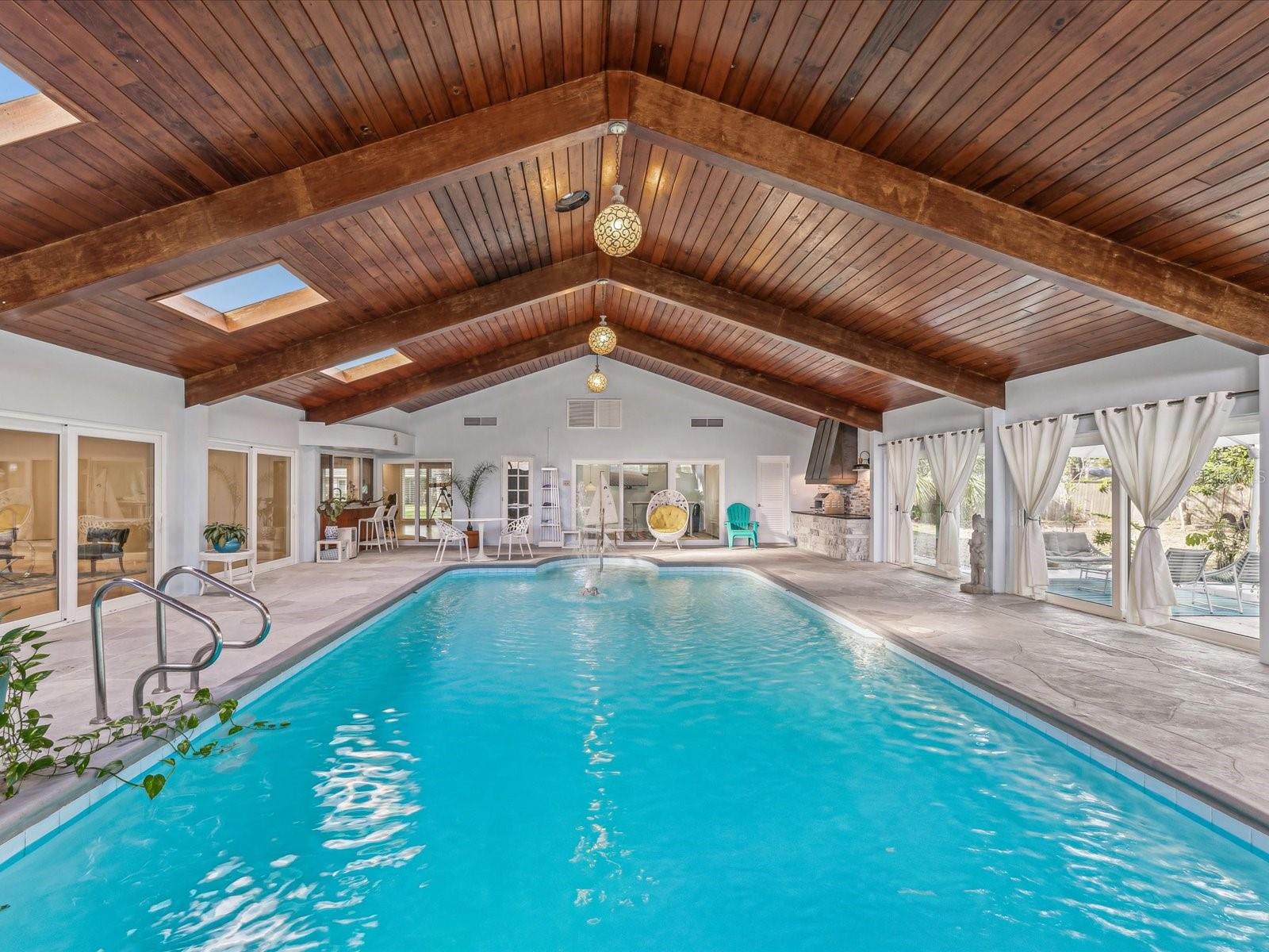 *BRAND NEW PRICE IMPROVEMENT WITH SELLERS OFFERING ASSUMABLE MORTGAGE AT A VERY LOW INTEREST RATE OF 2.85.* Priced at appraisal price! This stunning Mid-Century Modern architectural style home offers 4 bedrooms, 4 bathrooms and sprawls across 5,673 square feet of pure luxury! THIS PROPERTY DID NOT FLOOD during recent storms. It offers extra reassurance with a GENERAC WHOLE HOUSE GENERATOR, hurricane shutters and a hurricane reinforced garage door. All newer systems including 3 HVAC's (2024 & 2017), 2 TANKLESS WATER HEATERS (2019), TILE ROOF (2014 with 50 year warranty), ELECTRICAL & PLUMBING UPDATED DURING RENOVATIONS, WATER SOFTNER (2022) and DOUBLE PANE SLIDERS & WINDOWS (2024, 2021, 2018). Most systems come with transferrable warranty. Situated on an oversized 24,668 square foot corner lot, this property offers ample space with potential for future building opportunities. Step inside to discover beautifully renovated modern amenities & a formal living space that opens to the indoor pool. This is saltwater, heated pool opens to all interior rooms of the house. This pool can be filled and be a pickle ball court, gym or whatever you can imagine! There is also a new outdoor kitchen/ grill in the pool room. Need even more living space? It is possible to fill the indoor pool as it is a climate controlled room. The home is adorned with luxurious touches, such as hardwood flooring, plantation shutters, ALL CALIFORNIA CLOSETS and Italian chandeliers original to the home. The home is also beautified with the rare and famous Ruth Richmond door knobs. As one of the first female architects of the 1960's and designer to Jackie Kennedy Onassis, Ruth Richmond designed the rare lucite doorknobs with gold infusions. These are found throughout the home and give a "Mad Men" mid-century modern jolt of glamour! Each of the 4 bathrooms have been completely updated, with the primary boasting HEATED FLOORS and spa-like features. The primary suite is a true retreat with a cozy fireplace, jacuzzi therapy tub, and motorized lighted curtains that open to reveal the sparkling pool. You'll love the convenience of a built-in bar, LG STYLER & SANITIZER as an alternative to dry cleaning and a dedicated washer/dryer in the closet. The primary bathroom is a haven with two rain showers and custom, elegant fixtures. Outdoors, the possibilities are endless with a hot tub, treehouse, and ample parking, including a spacious 2 car garage. Each bedroom has it's own charm, with one bedroom featuring a vibrant Lilly Pulitzer vibe and another serving as a creative craft room that can be converted back to a bedroom or flex space/office. xxThere is so much more to explore in this exceptional home—call today to discover all the unique details and make this dream home yours!