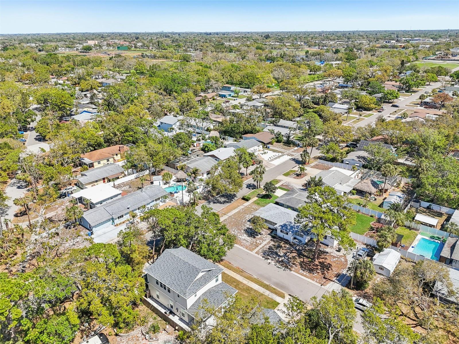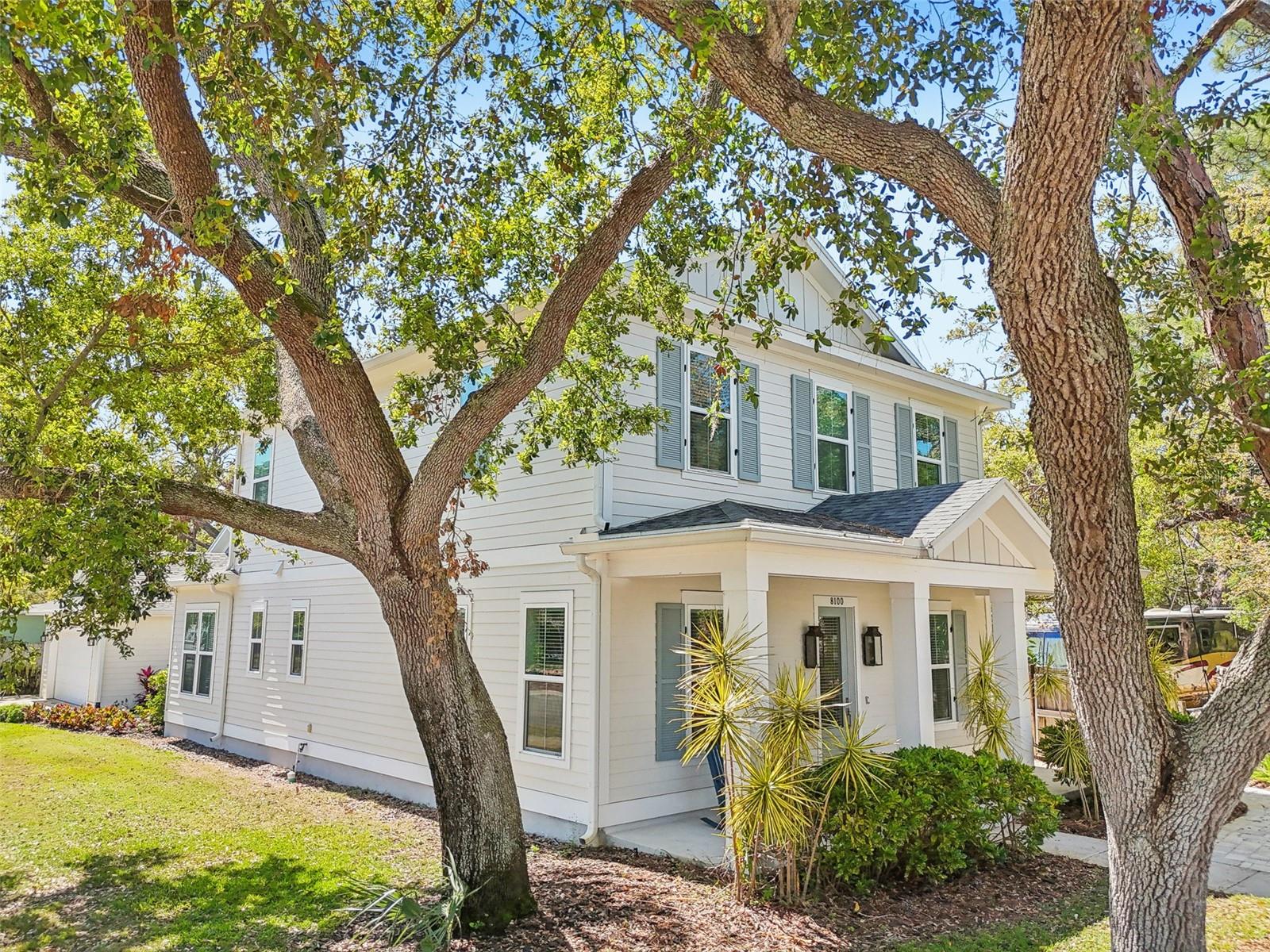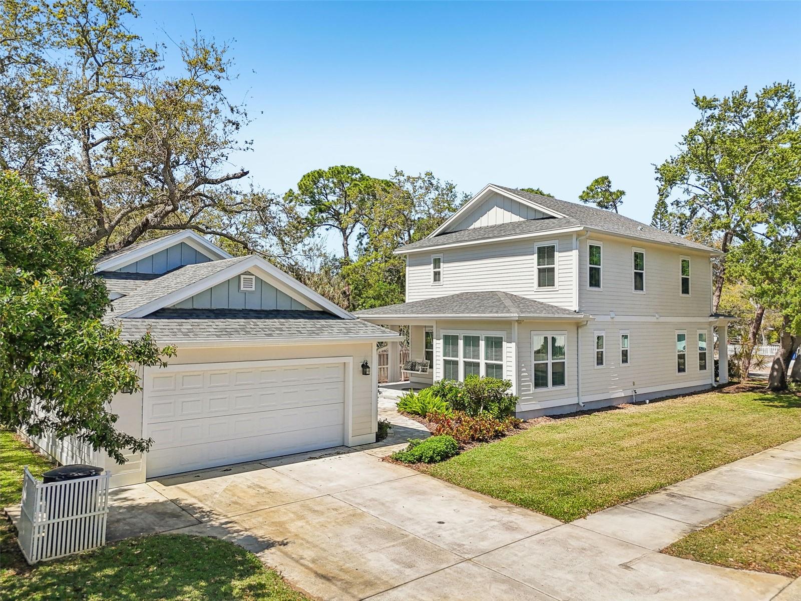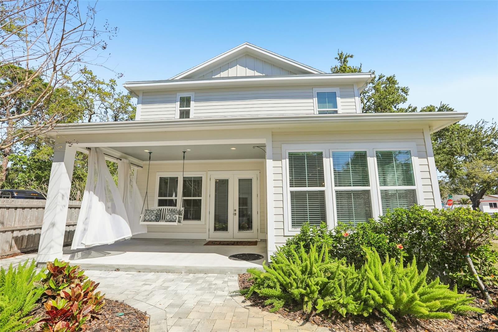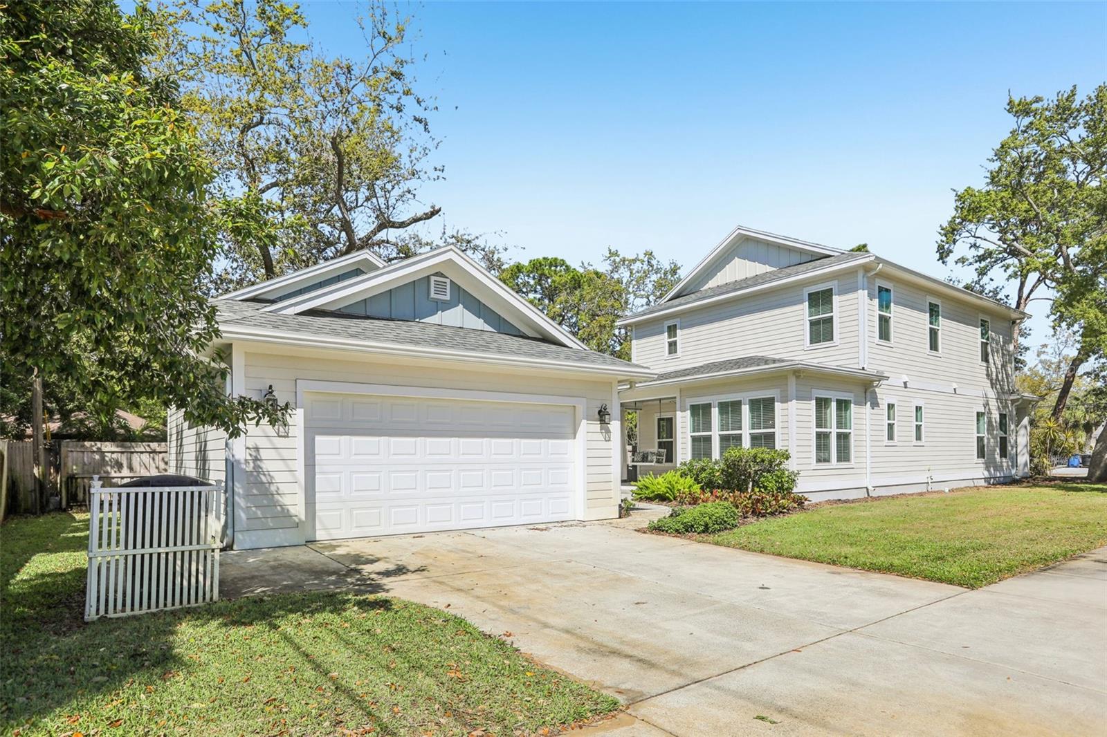 Modern Elegance in Prime Jungle Terrace Location - Welcome to a masterpiece of modern living, crafted by the esteemed Canopy Builders and perfectly positioned on an oversized, tree-lined corner lot in the highly sought-after Jungle Terrace neighborhood. From the moment you arrive, the home’s gas lanterns and wood-accented front porch ceiling create an inviting ambiance that blends timeless charm with contemporary sophistication. Step inside to discover a thoughtfully designed, open-concept floor plan where soaring ceilings, custom trim work, and impact windows flood the interiors with natural light. The heart of the home is the gourmet kitchen, a chef’s dream featuring quartz countertops, soft-close white shaker cabinetry, premium stainless steel appliances, and a gas cooktop—perfect for crafting culinary delights. The adjoining great room and dining area seamlessly connect to an expansive covered back porch, elegantly finished with wood ceilings—ideal for effortless indoor-outdoor entertaining. The first floor is designed for versatility, offering a private office and a guest bedroom with a full bathroom, providing flexibility for remote work, visiting guests, or multi-generational living. Upstairs, the primary suite is a luxurious retreat, showcasing a spa-inspired bathroom with a large walk-in shower, featuring a rainfall shower head and movable wand for a truly indulgent experience. The expansive second bedroom—originally designed as two separate rooms—has been expertly combined to create a generous and adaptable space. For those desiring additional bedrooms, the original builder’s plans are available for an easy reconfiguration. This level is completed by a beautifully appointed full bathroom, and a conveniently located laundry room for everyday ease. For automotive enthusiasts, the garage is a standout feature, thoughtfully equipped with a built-in car lift—perfect for additional vehicle storage, hobby projects, or maximizing space. Additionally, a newer well has offset the water bill from around $1200/mo to $200 for the current owner, offering more savings and efficiency. Enjoy the perfect balance of tranquility and convenience in Jungle Terrace, just minutes from Walter Fuller Park, Azalea Park, and Tyrone Square. Local dining, shopping, and St. Pete’s pristine beaches are all within easy reach, while the neighborhood offers a peaceful, family-friendly atmosphere. This is more than a home—it's a statement of refined living. Experience the best of St. Petersburg, where timeless design meets modern luxury. Schedule your private showing today!