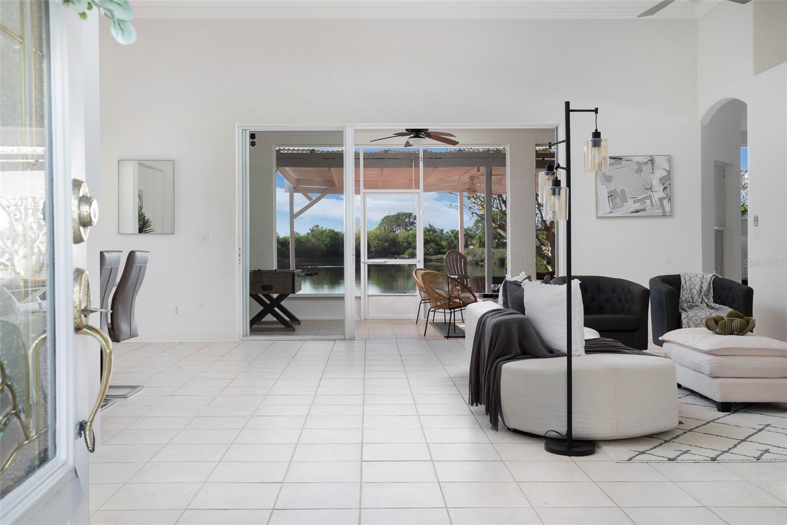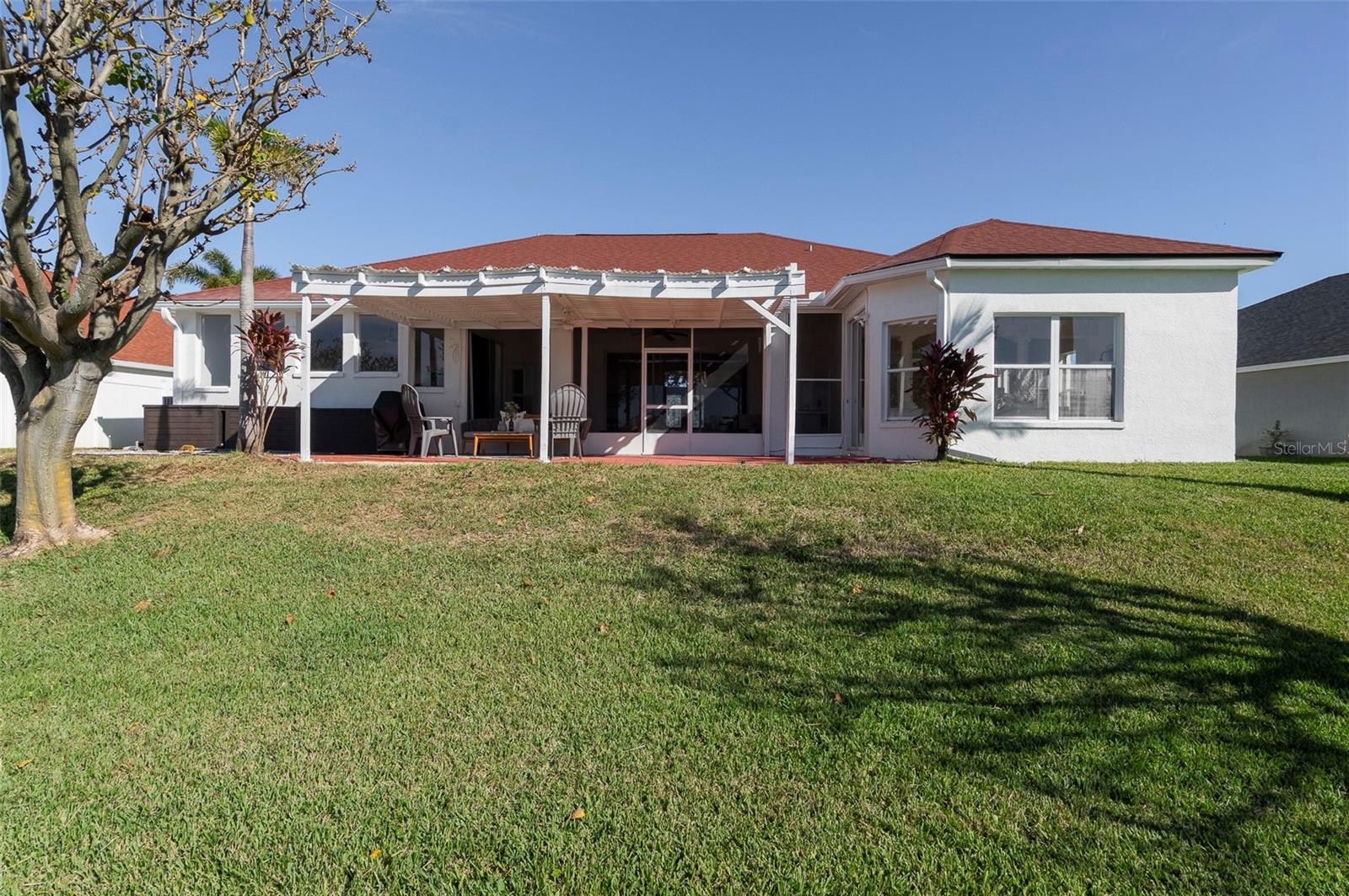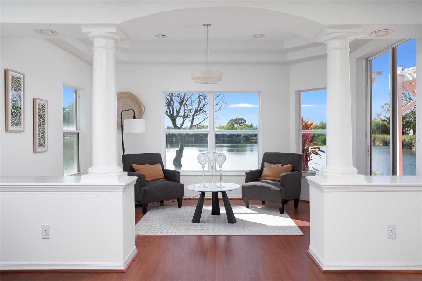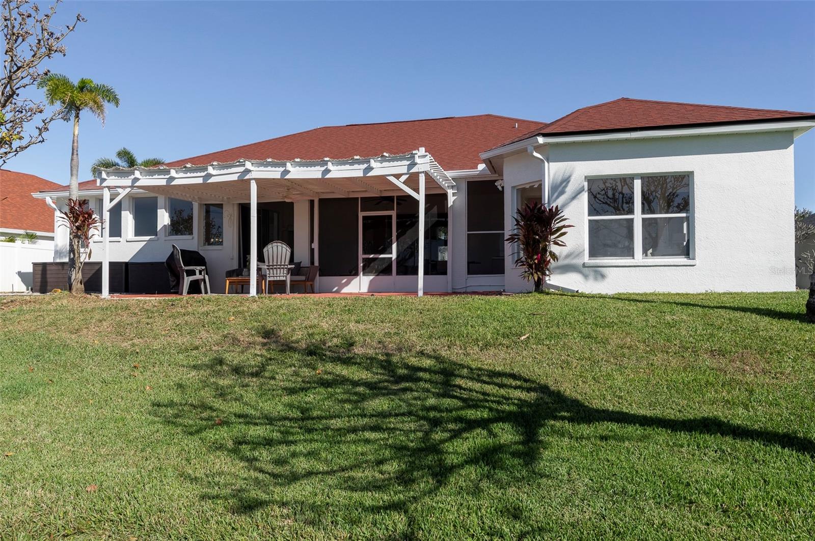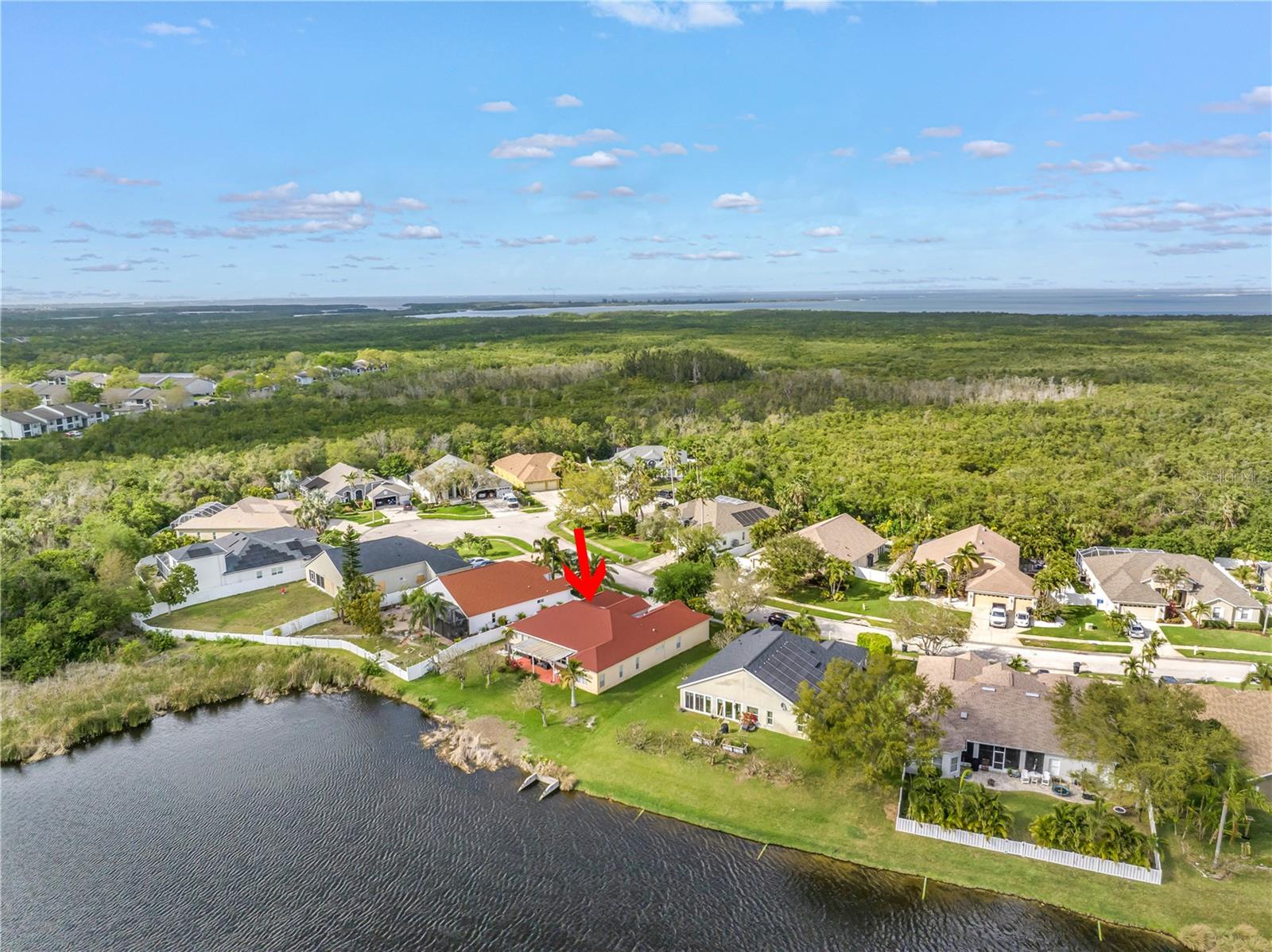 This recently updated, one-of-a-kind waterfront home offers some of the best views in Brighton Bay, ideally located on the St. Petersburg side of the Gandy Bridge. The highly sought-after community provides easy access to Downtown St. Petersburg, local beaches, South Tampa, and both international airports. Recent upgrades include fresh interior and exterior paint, new stainless steel GE appliances, updated lighting and mirrors, and refreshed landscaping. The Ring doorbell and Ring security lights and cameras are included with the sale. Featuring high ceilings throughout, this spacious 4-bedroom, 2.5-bath home feels bright and open. It offers 2,698 square feet of living space on a 10,000-square-foot lot, along with a 3-car garage. The roof was replaced with a 50-year warranty, and the gutters with leaf guards were installed at the same time. The kitchen showcases quartz countertops, a white tile backsplash, a large center island, and abundant cabinetry. A generous laundry room provides ample storage and includes a newer washer and dryer. The primary suite is truly impressive, highlighted by crown molding, decorative alcoves, two walk-in closets, and an additional bonus room currently used as a custom closet. Both the front and backyard feature tropical landscaping and a Rain Bird sprinkler system. Enjoy tranquil water views from the screened back porch, complete with an outdoor grill—perfect for entertaining on the freshwater lake. Brighton Bay is a welcoming community with resort-style amenities, including a large pool, two tennis courts, a volleyball court, playground, and dog park. Weeden Island Preserve is located directly across the street, offering kayaking, canoeing, boardwalks, and scenic hiking trails. Best of all, this home remained high and dry with no flooding during past hurricanes.