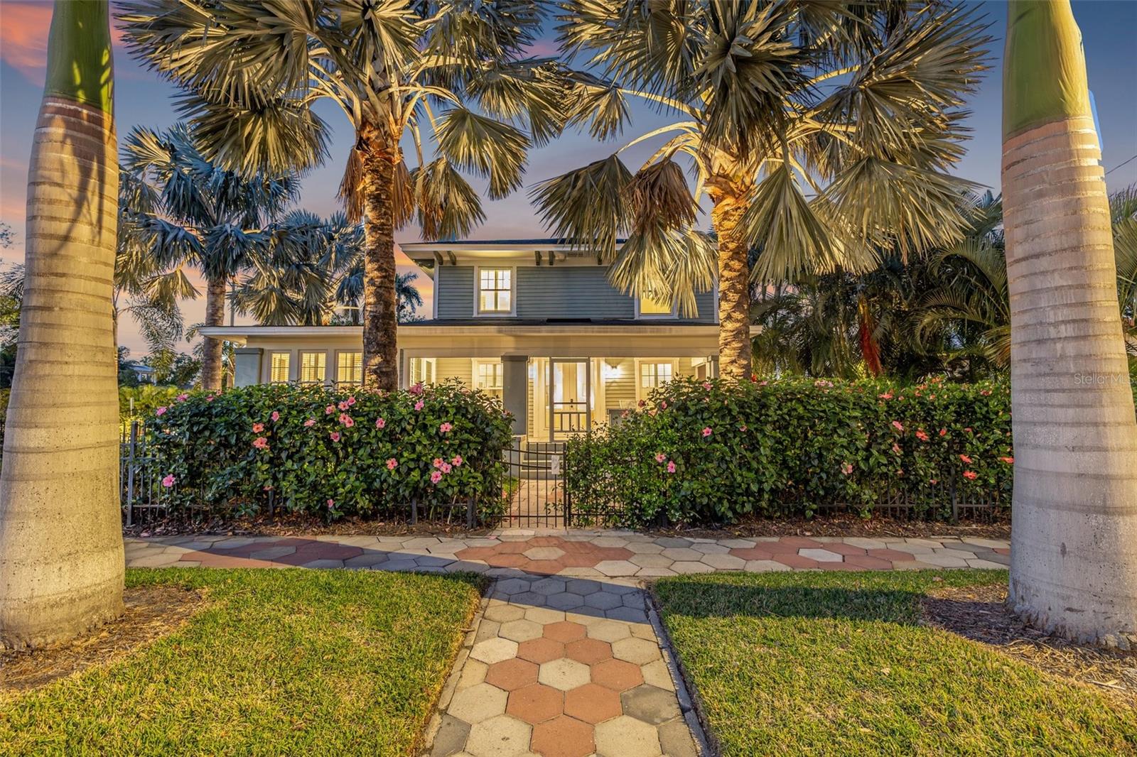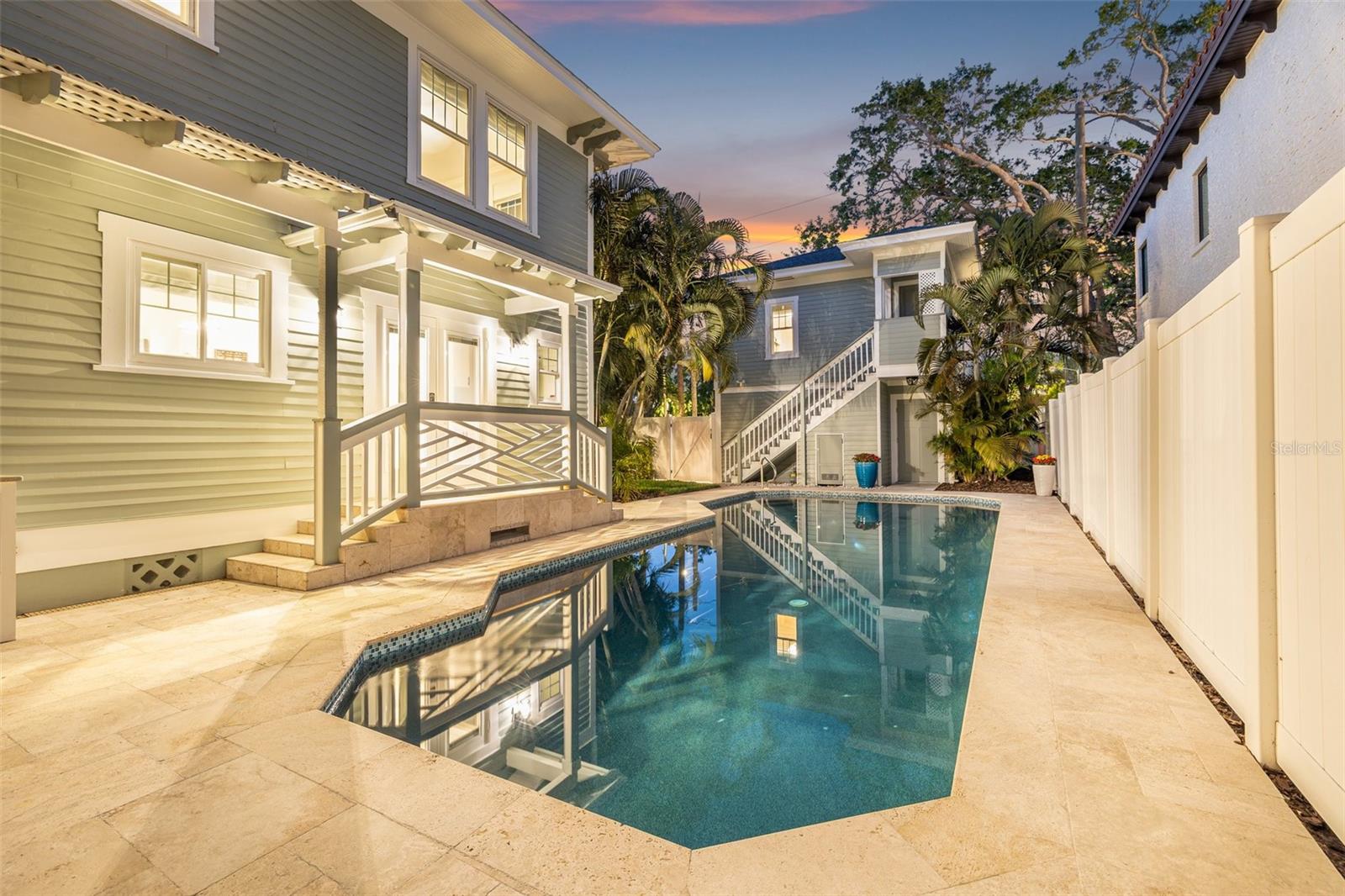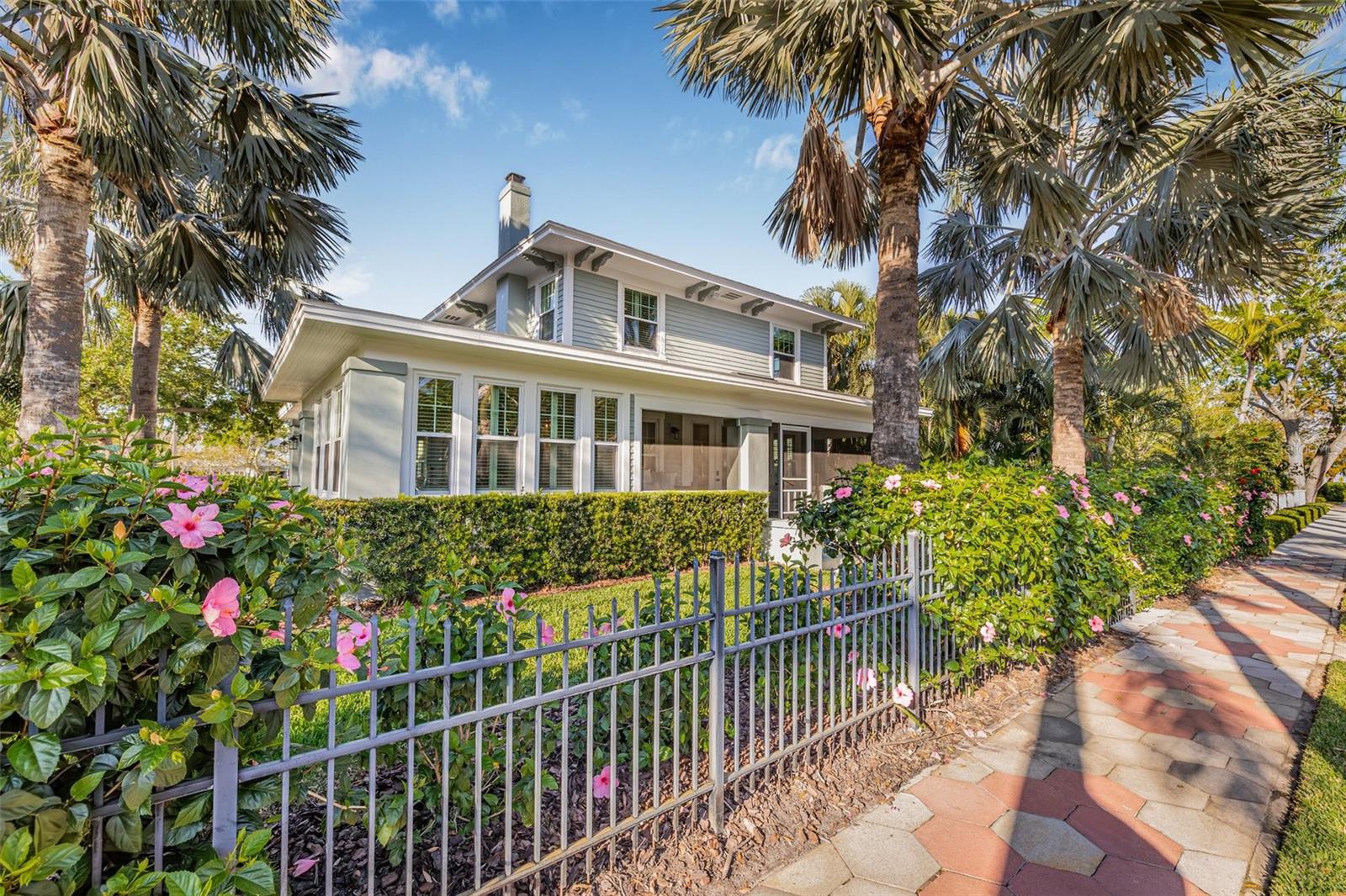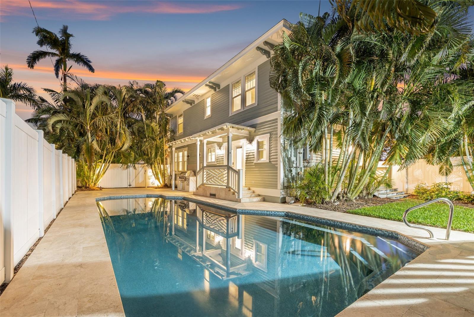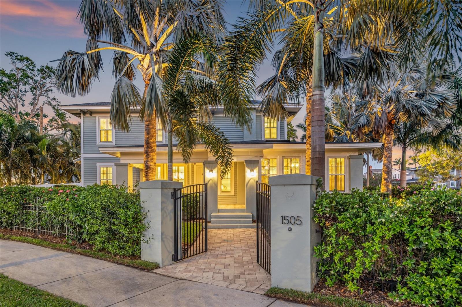 Have you ever dreamed of stepping inside the pages of Architectural Digest? Here is your chance to experience a truly exceptional opportunity. Welcome to 1505 Beach, a captivating pool home that exudes historic allure, gracefully positioned on a beautifully landscaped corner lot, offering ample privacy on one of the most iconic streets in highly sought-after Historic Old Northeast. From the moment you pass through the gates onto the meticulously maintained grounds, the home's timeless appeal is unmistakable. The privacy of the corner lot allows for an idyllic setting, complete with a tropical saltwater pool, lush gardens, dual porches adorned with designer tile, and enchanting outdoor retreats. This property seamlessly blends historic craftsmanship with contemporary luxury, creating an aura of exclusivity that sets it apart from anything else. Spanning 2,900 square feet, this two-story estate offers five bedrooms, four bathrooms, a main-floor ensuite and laundry room, plus a cozy den topped in seagrass wallpaper. Every inch of the home reflects an impeccable attention to detail, with coffered ceilings, expertly crafted trim work, and rich hardwood floors that flow seamlessly throughout the open-concept layout. The gourmet chef’s kitchen is a masterpiece, featuring herringbone wood floors, thick mitered-edge marble countertops, a marble counter splash, custom real-wood cabinetry, a dedicated beverage center, and a full suite of matching Viking luxury appliances—ensuring an unparalleled hosting experience. Upstairs, the spacious primary suite boasts a walk-in closet and a spa-like ensuite bathroom with dual marble vanities, a soaking tub, a separate shower, and elegant marble flooring. Two additional guest bedrooms, each with ample storage, share a beautifully appointed guest bath, also featuring thick mitered-edge marble countertops. This home is a masterclass in restoration, where no detail has been overlooked. Recent updates include hurricane-impact windows and doors, tasteful plantation shutters, two new HVAC systems (2024 & 2022) with updated ductwork, newer plumbing, a new vapor barrier, and updated electrical—ensuring comfort and efficiency for years to come. Additional exquisite touches include a newly renovated gas brick fireplace, Level-5 smooth texture walls, elegant French doors, and thoughtfully restored door hardware and light switches. Step outside to experience the pinnacle of indoor-outdoor living. The heart of this private oasis is a saltwater PebbleTec pool and a gas summer kitchen surrounded by Italian travertine, perfect for al fresco dining and entertaining. Above the spacious 2 car garage is a newly renovated and separately metered guest house. Your visitors may never leave the luxurious accommodations of this 400 square foot guest house which includes a full kitchen, bathroom, and new mini split AC. Further enhancing this remarkable home is a newer roof and a whole-house Generac gas generator, offering peace of mind. Located just a leisurely 10-minute stroll from vibrant downtown St. Petersburg and only one block from the serene Tampa Bay waterfront, parks, and trails, this home offers the perfect blend of historic charm, modern luxury, and an unbeatable location.
