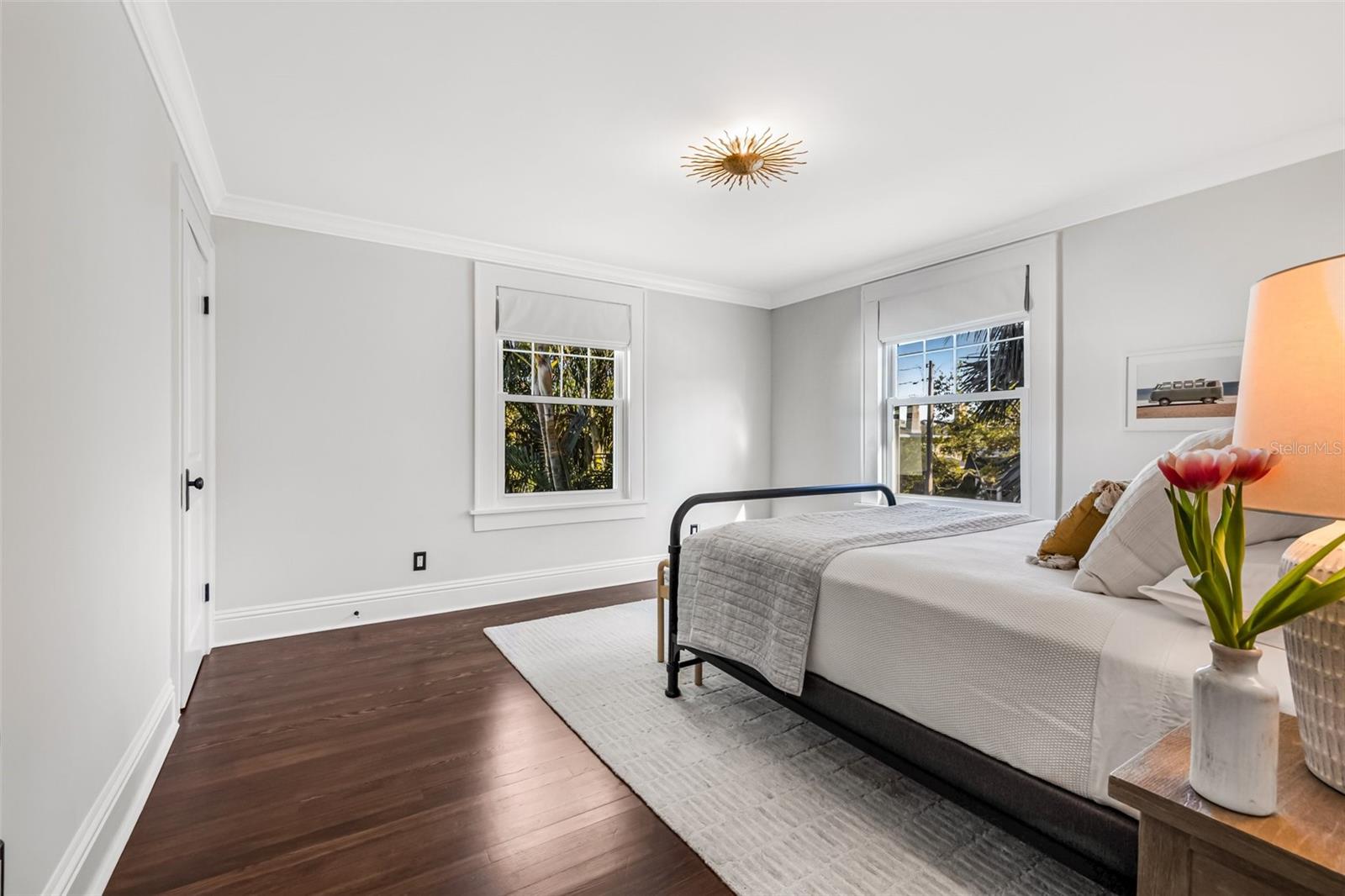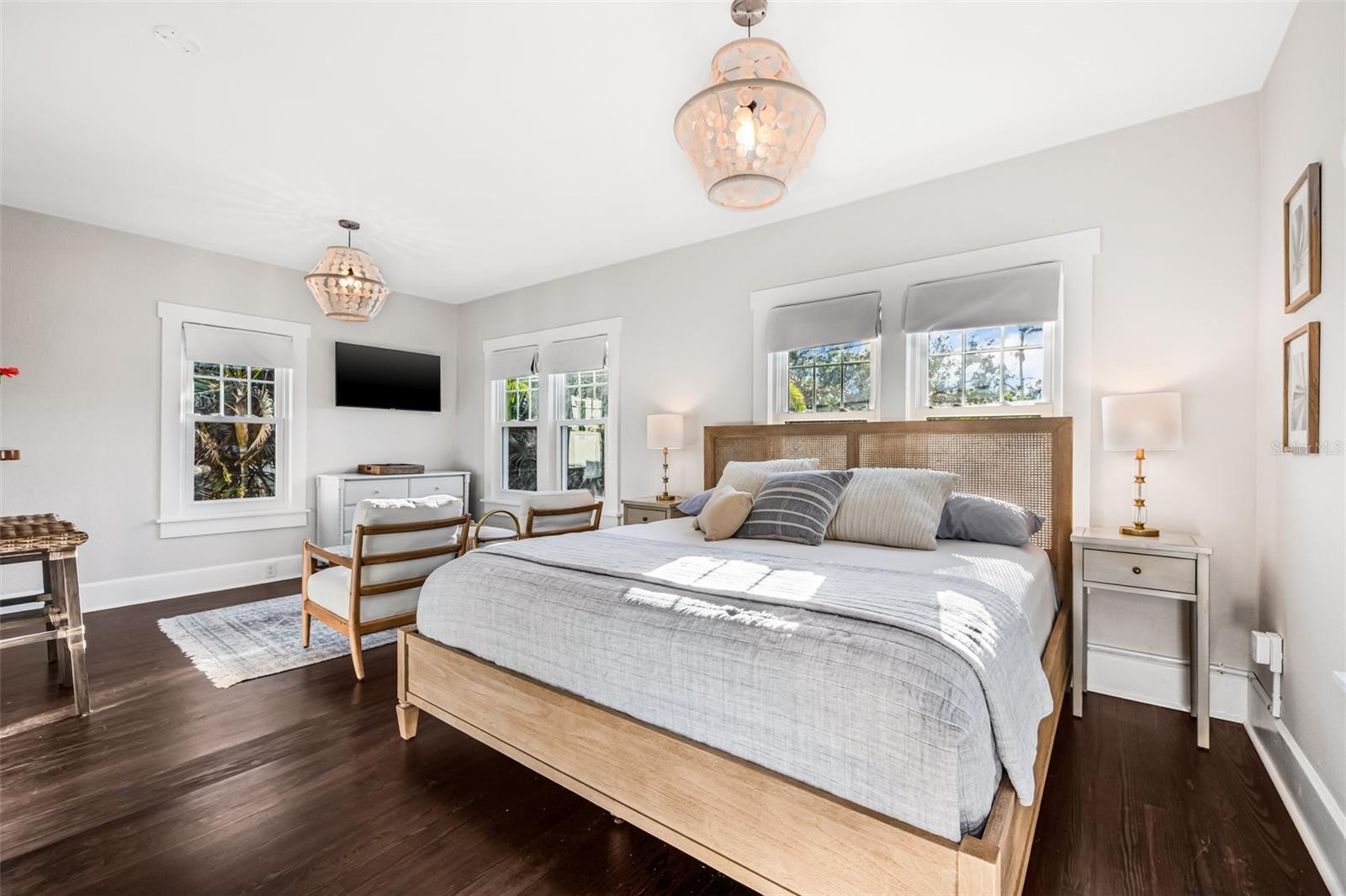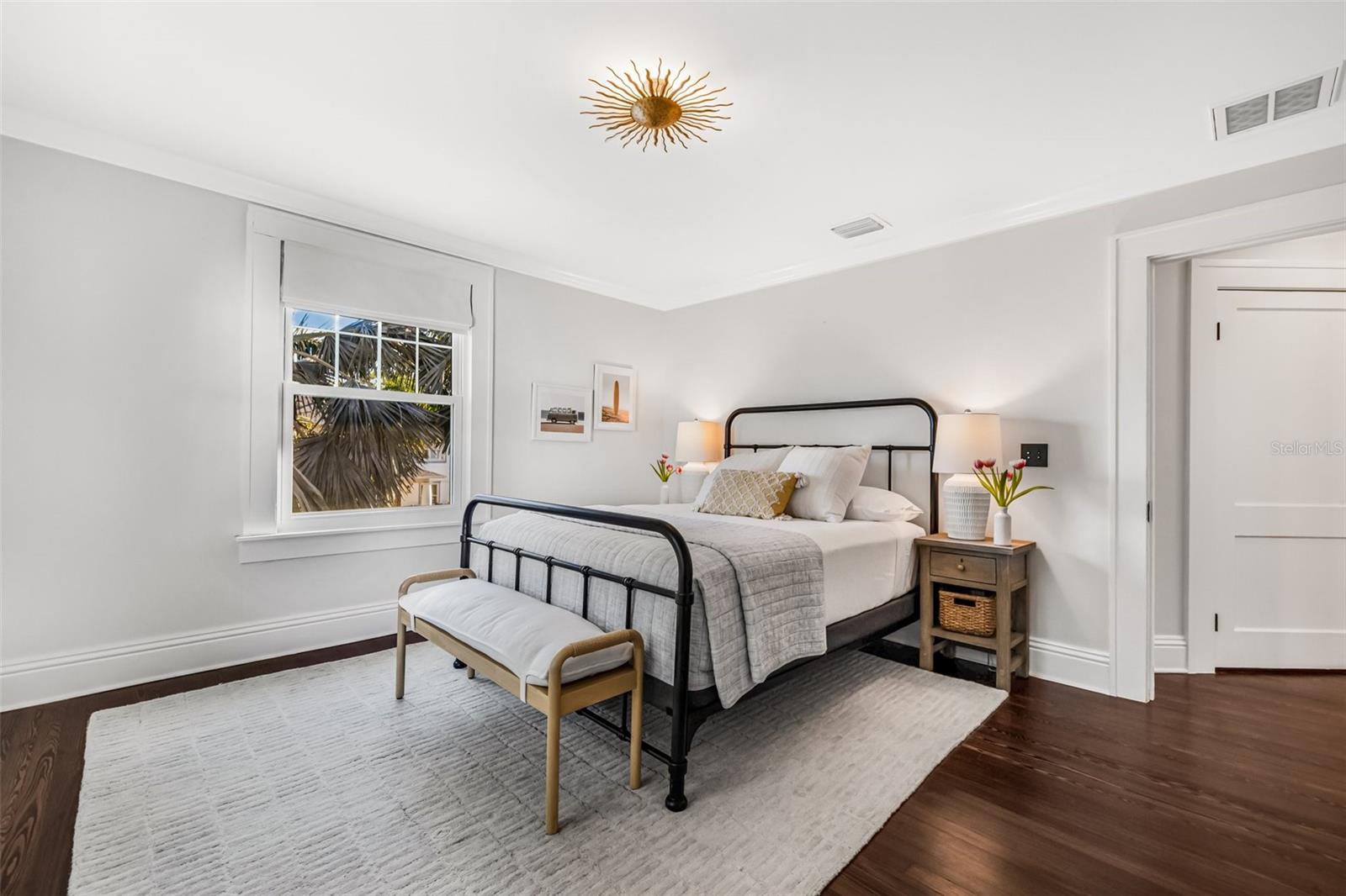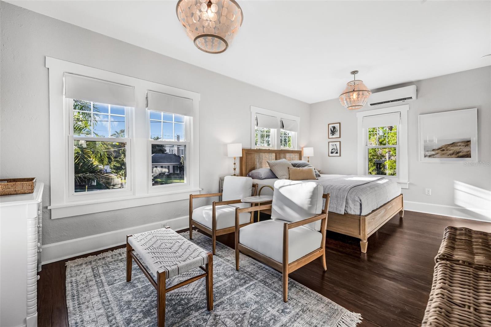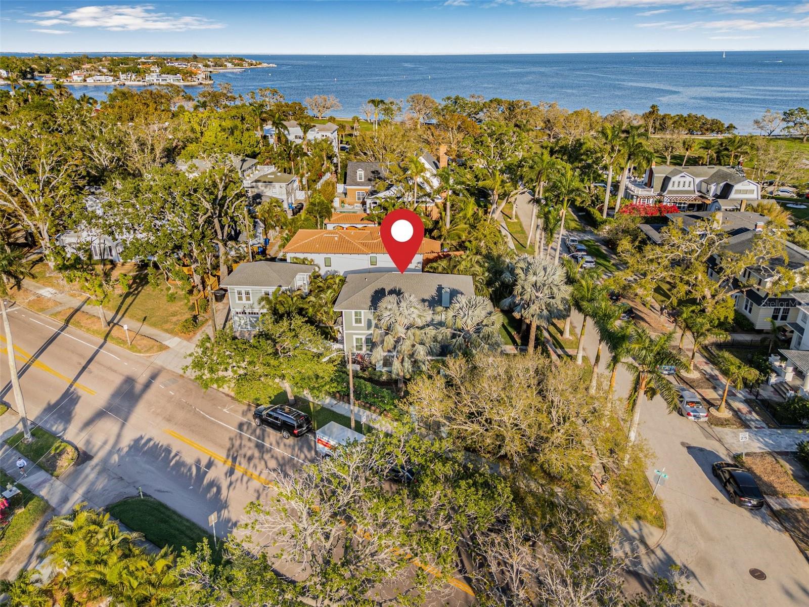 Have you ever dreamed of stepping inside the pages of Architectural Digest? Here is your chance to experience a truly exceptional opportunity. Welcome to 1505 Beach, a captivating pool home that exudes historic allure, gracefully positioned on a beautifully landscaped corner lot, offering ample privacy on one of the most iconic streets in highly sought-after Historic Old Northeast. From the moment you pass through the gates onto the meticulously maintained grounds, the home's timeless appeal is unmistakable. The privacy of the corner lot allows for an idyllic setting, complete with a tropical saltwater pool, lush gardens, dual porches adorned with designer tile, and enchanting outdoor retreats. This property seamlessly blends historic craftsmanship with contemporary luxury, creating an aura of exclusivity that sets it apart from anything else. Spanning 2,900 square feet, this two-story estate offers five bedrooms, four bathrooms, a main-floor ensuite and laundry room, plus a cozy den topped in seagrass wallpaper. Every inch of the home reflects an impeccable attention to detail, with coffered ceilings, expertly crafted trim work, and rich hardwood floors that flow seamlessly throughout the open-concept layout. The gourmet chef’s kitchen is a masterpiece, featuring herringbone wood floors, thick mitered-edge marble countertops, a marble counter splash, custom real-wood cabinetry, a dedicated beverage center, and a full suite of matching Viking luxury appliances—ensuring an unparalleled hosting experience. Upstairs, the spacious primary suite boasts a walk-in closet and a spa-like ensuite bathroom with dual marble vanities, a soaking tub, a separate shower, and elegant marble flooring. Two additional guest bedrooms, each with ample storage, share a beautifully appointed guest bath, also featuring thick mitered-edge marble countertops. This home is a masterclass in restoration, where no detail has been overlooked. Recent updates include hurricane-impact windows and doors, tasteful plantation shutters, two new HVAC systems (2024 & 2022) with updated ductwork, newer plumbing, a new vapor barrier, and updated electrical—ensuring comfort and efficiency for years to come. Additional exquisite touches include a newly renovated gas brick fireplace, Level-5 smooth texture walls, elegant French doors, and thoughtfully restored door hardware and light switches. Step outside to experience the pinnacle of indoor-outdoor living. The heart of this private oasis is a saltwater PebbleTec pool and a gas summer kitchen surrounded by Italian travertine, perfect for al fresco dining and entertaining. Above the spacious 2 car garage is a newly renovated and separately metered guest house. Your visitors may never leave the luxurious accommodations of this 400 square foot guest house which includes a full kitchen, bathroom, and new mini split AC. Further enhancing this remarkable home is a newer roof and a whole-house Generac gas generator, offering peace of mind. Located just a leisurely 10-minute stroll from vibrant downtown St. Petersburg and only one block from the serene Tampa Bay waterfront, parks, and trails, this home offers the perfect blend of historic charm, modern luxury, and an unbeatable location.