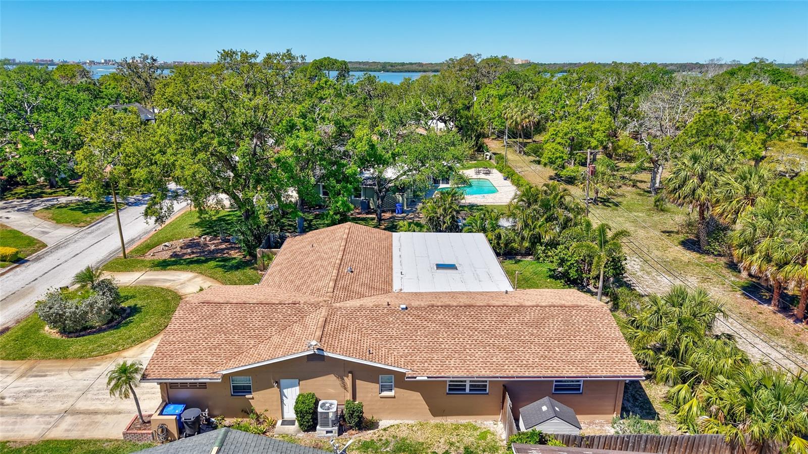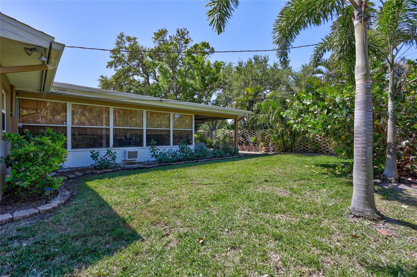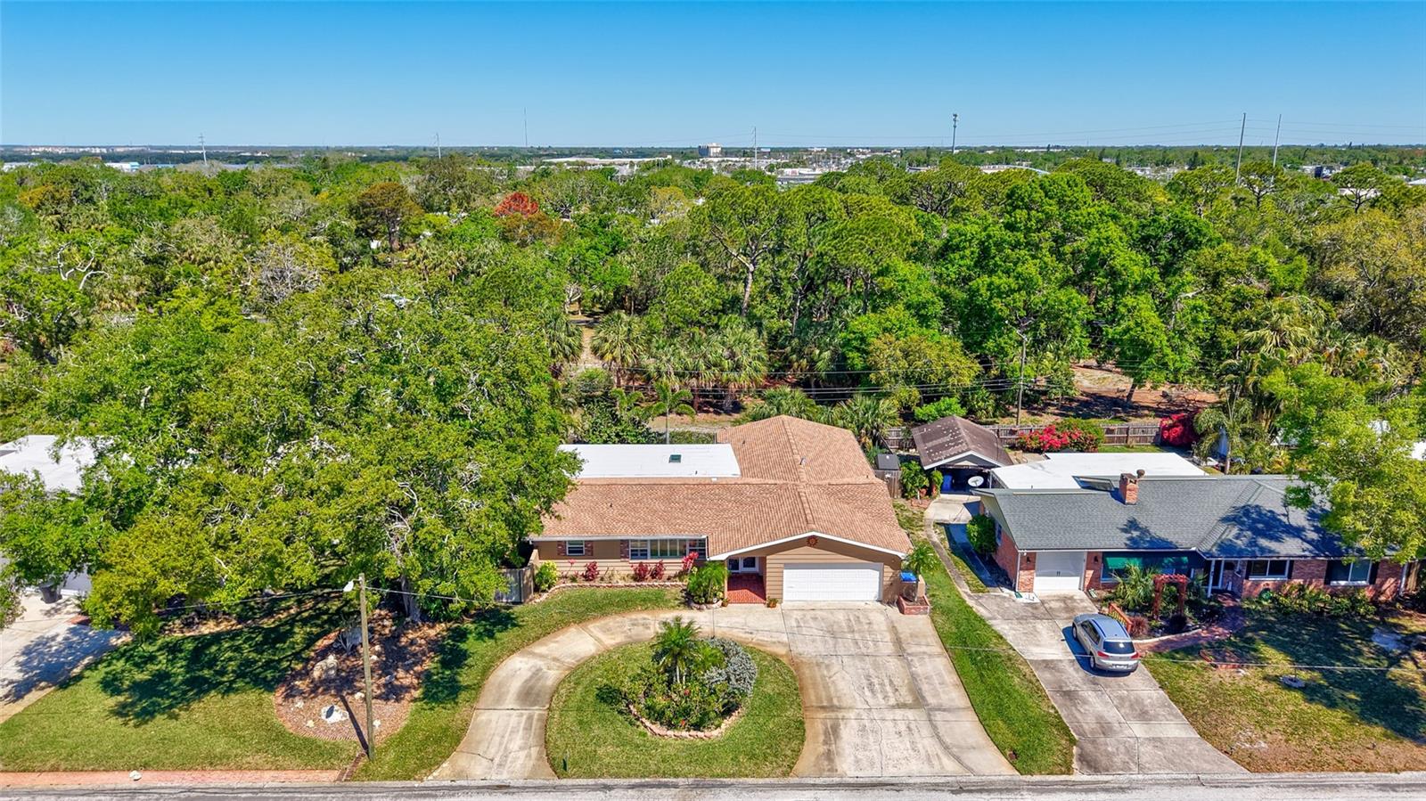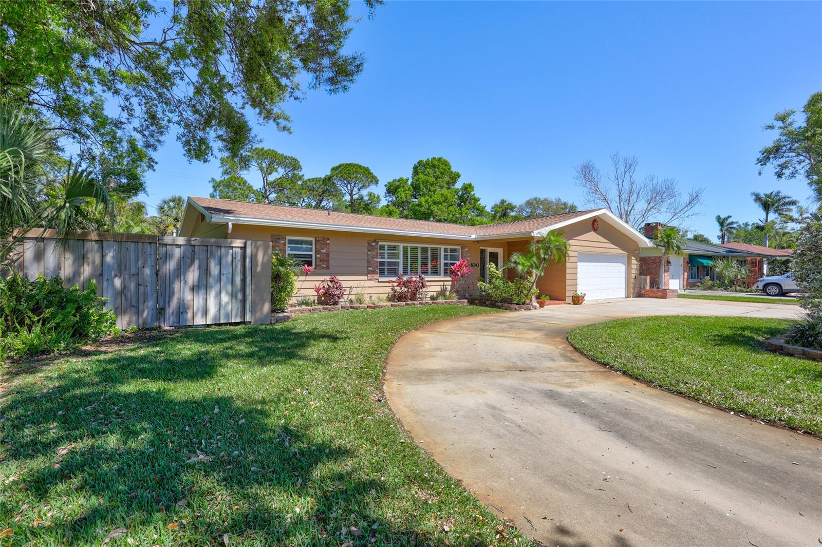 Welcome to the area of Abercrombie Park in Jungle Terrace and this 4BR/3BA block home on a quiet dead-end street. Enter this home through the beautiful stained-glass door to the open living/dining room combo with ceramic tile and plantation shutters. The updated kitchen features stainless steel appliances, granite counter tops with tile backsplash, and a convenient breakfast bar that opens on to an additional family room for entertaining. The Primary Suite is 12X15 and features a fully remodeled bathroom with dual sinks in the new vanity with granite countertop. The 2nd Bedroom can also be used as a Primary Bedroom with en-suite, full bath and a door leading to the laundry room. Additional Bedrooms are spacious with terrazzo floors and built-in closets. Additionally, there’s a 400-square-foot cooled Florida room and covered Lanai just off the kitchen looking out onto the tranquil green backyard with a calming fountain and room for a pool. The gate at the rear of the backyard leads to Abercrombie Park for the hiking trails, dog-walking, picnics and sunsets on Boca Ciega Bay. In the front of the home, there is a large circular driveway, with abundant space for parking, plus additional space to park a boat or RV. The lush landscape is maintained by a well-fed irrigation system, ensuring your property looks fantastic year-round. This home has been perfectly maintained, with a new Roof in 2025, a new HVAC system in 2024 and new Electric panel in 2024. Located just minutes to the beaches, dining, shopping and more. Also, in a X500 flood zone for peace of mind.