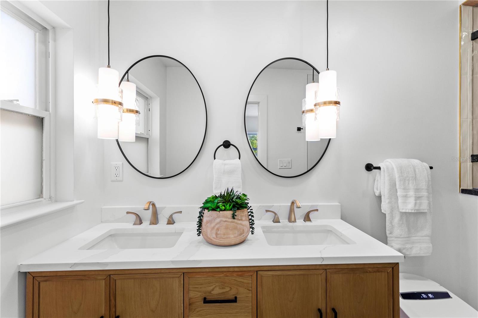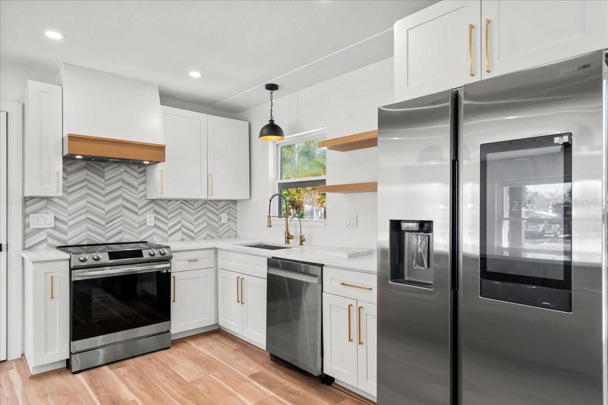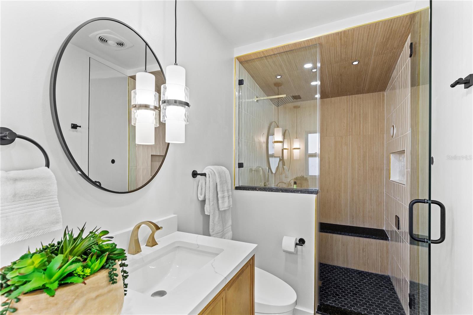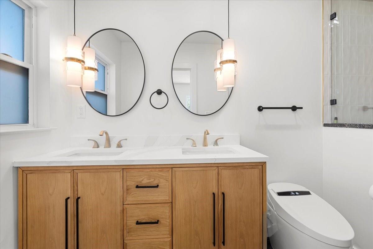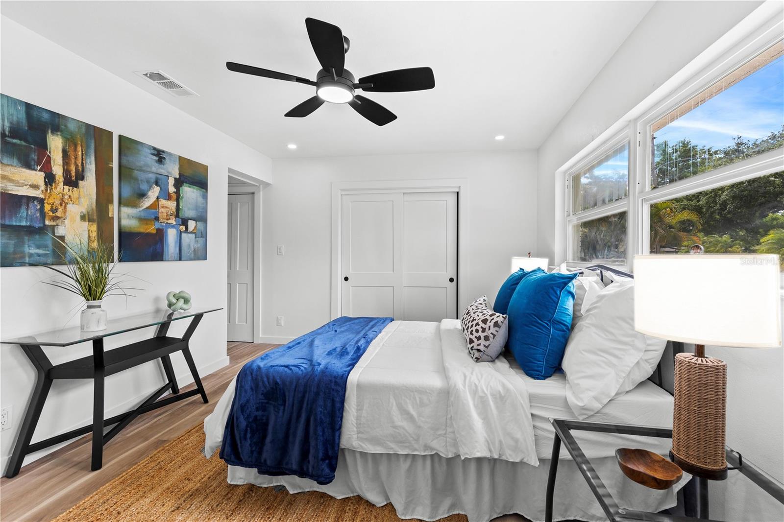 *1 Point Lender Paid, Full-term Rate Buy Down offered by Jonathan Ferrante with Blue Water Mortgage - ***Buyers must qualify for financing* Experience this stunning home in the heart of St. Pete, where every detail has been meticulously designed and nothing has been overlooked. This newly renovated 3-bedroom, 3-bath masterpiece offers all the bells and whistles, blending modern design with luxurious amenities for a truly elevated lifestyle. Step inside to discover a spacious open-concept living area with oak luxury vinyl plank flooring and a wall of windows that floods the space with natural light. The kitchen is equipped with brand new stainless steel appliances including a Samsung smart fridge, touch less faucet, filtered water dispenser, and a custom white oak range hood. The 8-foot oak island is complete with an in-island microwave, USB outlets, cladding accents, and statement pendant lighting. Every room has been outfitted with new recessed lighting and ceiling fans and the electrical box has been updated with new wiring and GFCI breakers. Indulge in the primary bathroom featuring a luxurious SteamSpa steam shower with chromotherapy lighting, Bluetooth, an automatic heated bidet, and elegant brass fixtures that evoke a spa-like feeling. The private entry to the third bedroom, with its en-suite bathroom, offers ultimate guest privacy, perfect for a mother-in-law suite or a dedicated guest retreat. Situated on a corner lot, the exterior features all new sod, fully landscaped grounds, and a Rain Bird irrigation system. The deck leads to a tranquil pergola complete with swings, an ideal spot to relax and unwind. The circle driveway with alley access to the sleek, one-car garage provides curb appeal and functionality. Nestled in a quiet neighborhood in the heart of St. Pete, just 10 minutes to the beach and less than 15 minutes to downtown, this home offers unmatched convenience. Remarkably, this property remained high and dry during the recent hurricanes and is not in a flood zone. The hurricane shutters add an extra layer of assurance.