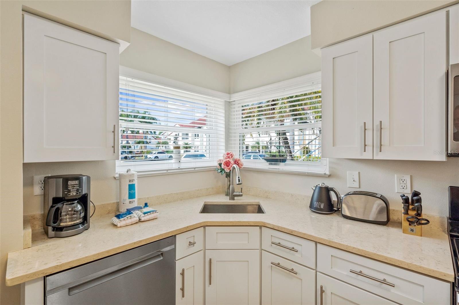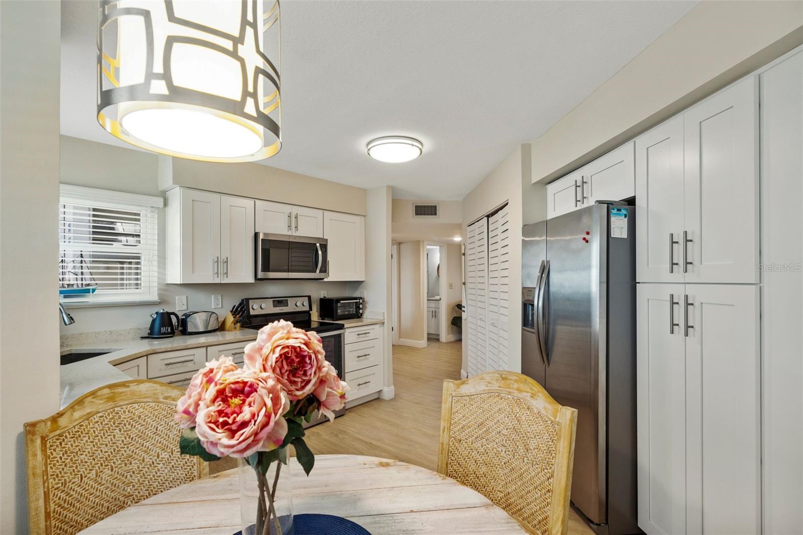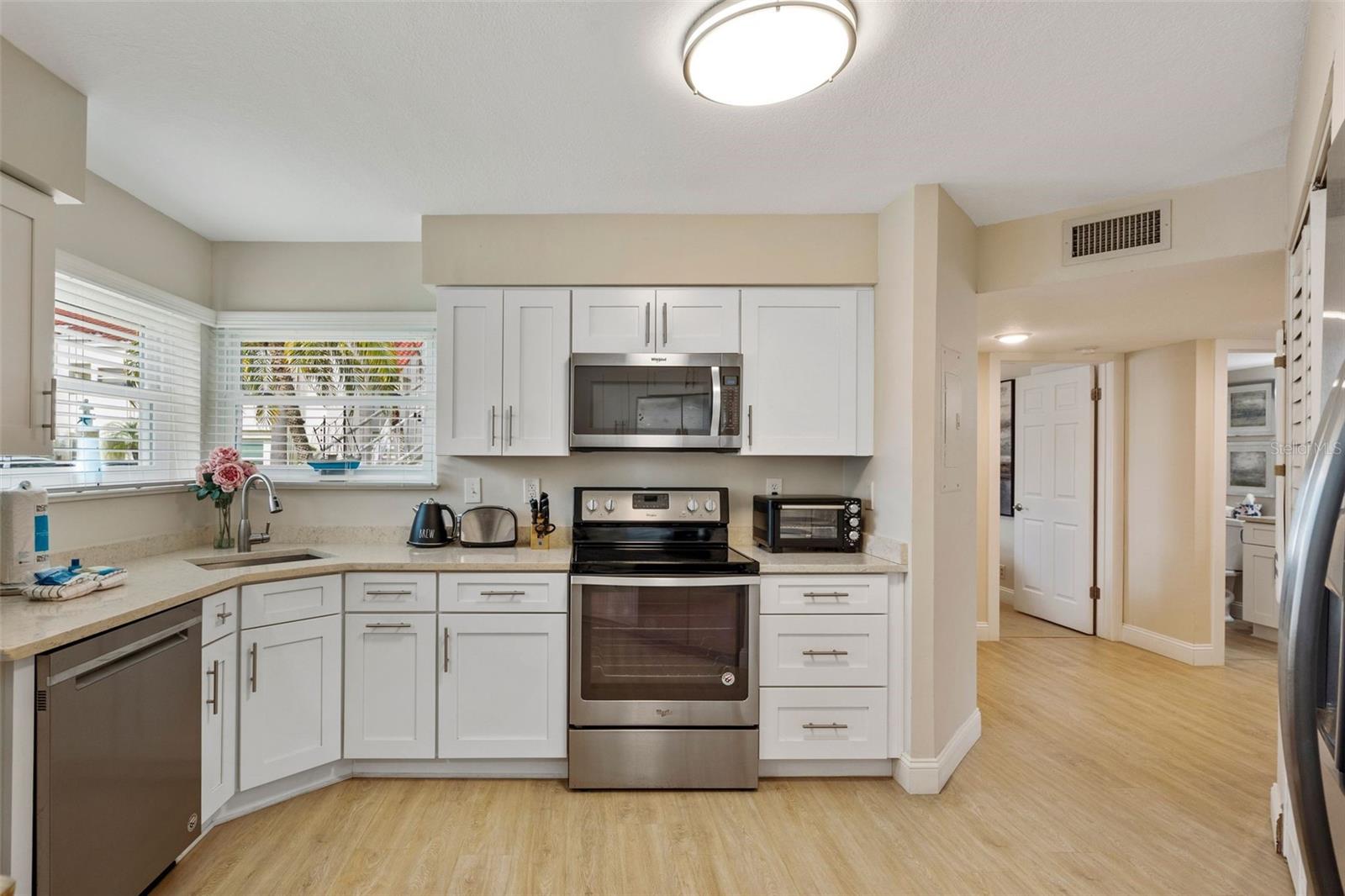 Welcome home to the epitome of Country Club living, Florida-style. What does that mean? It means golf now, go to the beach later! This unit is convenient to not one, but TWO of the best beaches in North America! It is less than 2 miles from the sand at #1 Rated St. Pete Beach and about a 10-min drive (6.4 miles) to beautiful Ft. DeSoto Beach! And, for a change of pace, it is only about a 15-minute drive to the Riviera-esque scene of Downtown St. Pete, which boasts world class, museums, restaurants, parks and a vibrant buzz of activity both day and night! There is always something fun to do in Downtown St. Pete! This is a perfect vacation spot that you can enjoy year-round as a resident. OR come and enjoy your slice of Florida bliss part-time and gain the offsetting income of weekly rentals in the wildly popular Isla del Sol Community! Realistically, you could easily be earning in the neighborhood of $40K+/yr. The property is sold fully furnished. All you need is your toothbrush, swimsuit, golf attire, clubs, and sunscreen! This bright and cheery first-floor condo has been meticulously and beautifully remodeled to an exacting standard. The most recent update was the installation of impact resistant, hurricane-rated sliders and windows last summer, at a cost just over $20K. These windows are not only attractive! They also provide great energy efficiency, sound insulation and security! AND, they are water-tight! It is indeed comforting to know that this unit was high and dry with ZERO water or damage of any kind from last year’s storms. This truly is one of the nicest units that you will find in Vista Verde. Even the location within the Isla Community is terrific. Located off of a fairway on the award-winning Isla del Sol Golf Course, the views are serene. You will enjoy the great outdoors from your covered patio area year-round! Bonus: Your patio has a storage closet that is perfect for housing all your beach necessities. And while the patio is a serene retreat, whenever you fancy it, the sparkling pool and spa, that is exclusively for Vista Verde East’s use, is a very short stroll from your doorstep! Truly, you WILL LOVE EVERYTHING about this home. It is spotlessly clean with furnishings that look as if they were delivered only yesterday! The luxury vinyl plank flooring throughout is easy to clean and comfy for your tootsies. The kitchen is bright and airy, enjoying sunlight from three windows! It features an eat-in area, quartz countertops, abundant cabinets, stainless steel appliances AND a full-size washer and dryer conveniently secreted within a closet right there in your kitchen! The master bedroom, with king bed, is beautifully furnished and en-suite, complete with a classy bathroom featuring a deep tub with shower and a stylish vanity with dual sinks. The second bedroom has a queen bed with a walk-in closet and enjoys direct access to the guest bath, which has also been beautifully remodeled to include a walk-in shower, comfort height water closet and stylish vanity. EVERYTHING is included in this price: dishes, cutlery, pots and pans, electronics, major and minor appliances, art….. It's all here, ready and waiting for you!