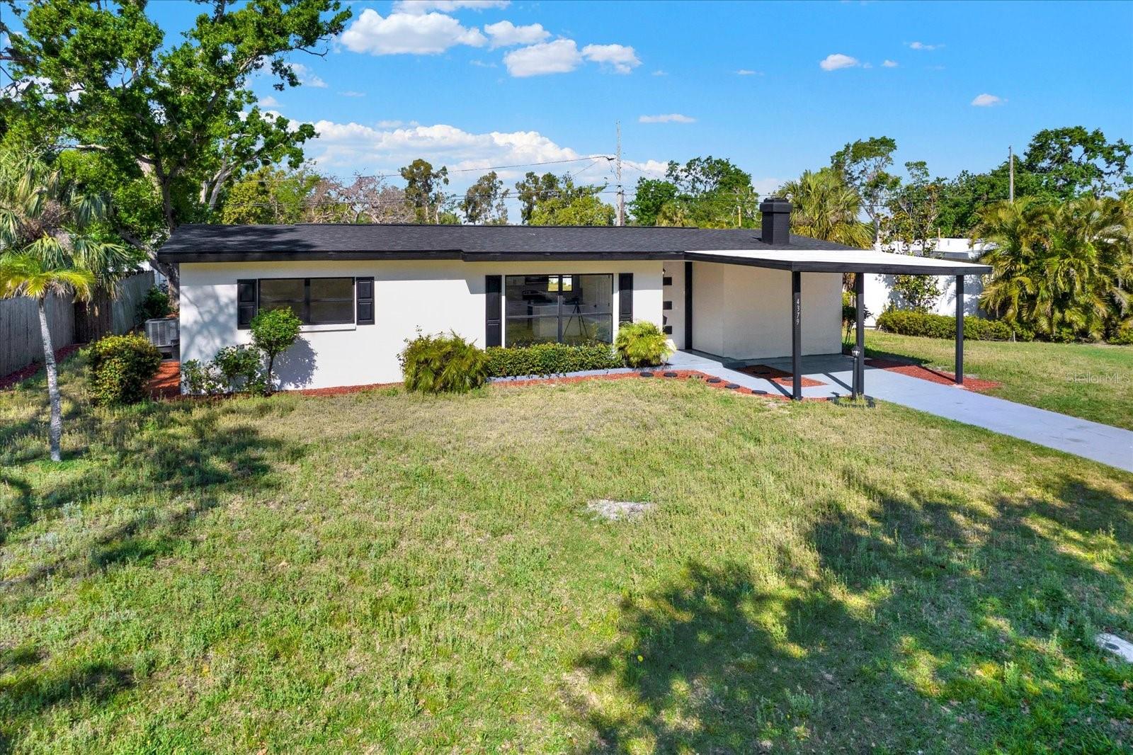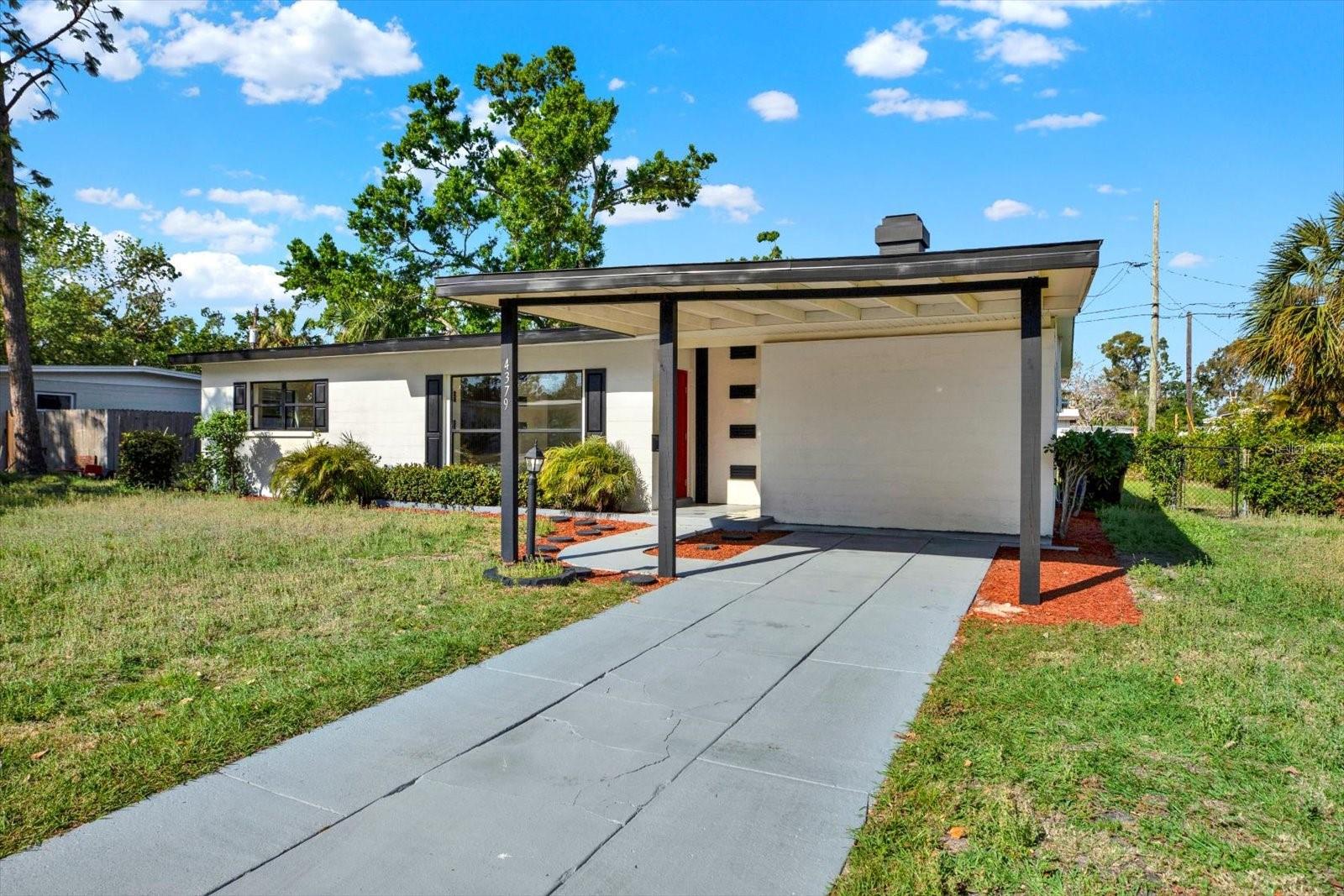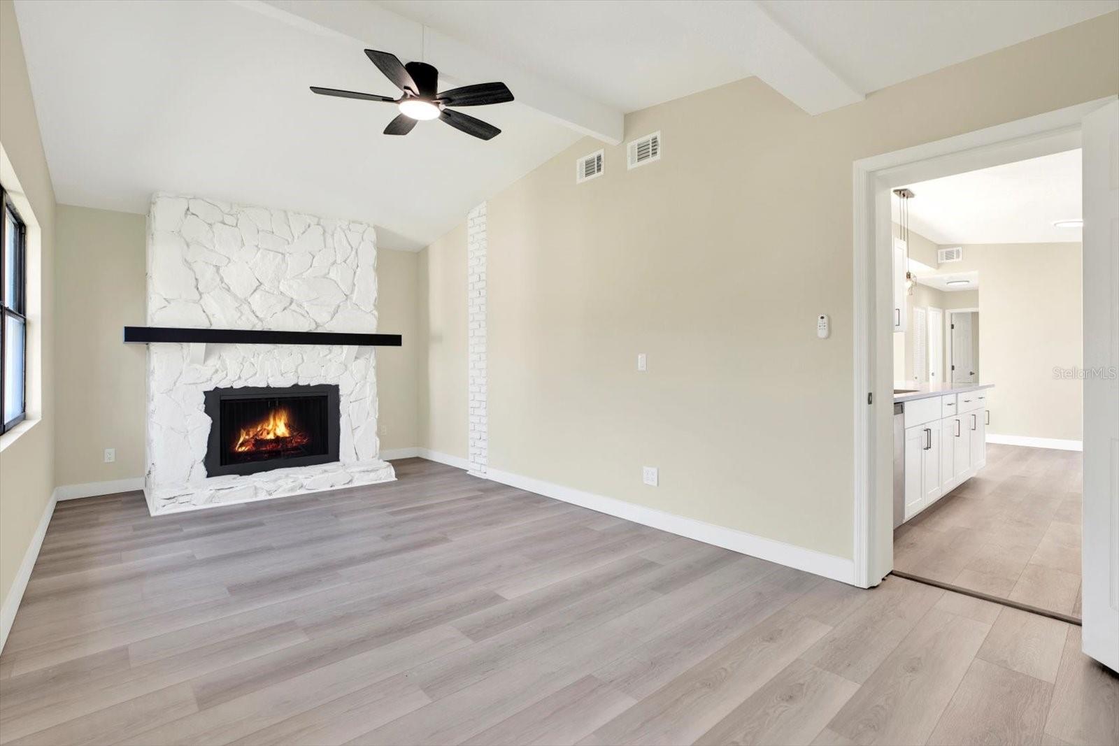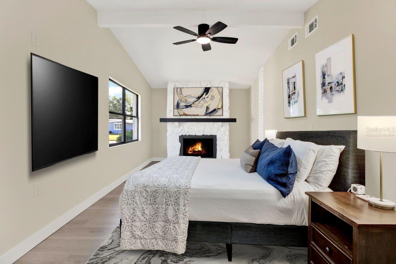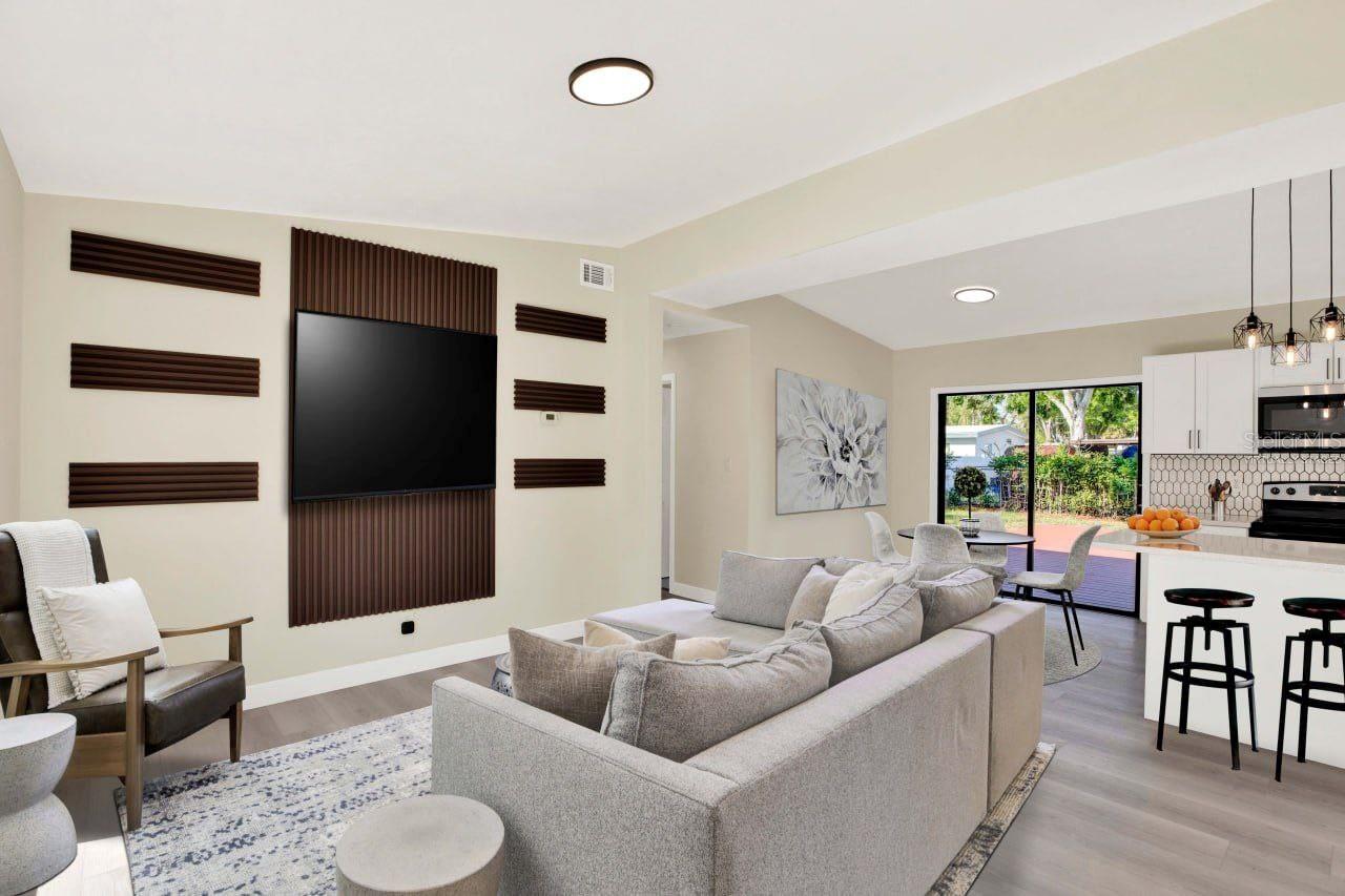 One or more photo(s) has been virtually staged. This thoughtfully upgraded 3-bedroom, 2-bathroom residence offers 1,262 square feet of stylish living space with a desirable split floor plan—perfect for privacy and comfort. The primary suite is situated on one side of the home, while the secondary bedrooms and bath are on the other, creating ideal separation for families or guests. As you step inside, you’ll be greeted by a spacious living room that seamlessly flows into the dining area. Both spaces are enhanced with luxury vinyl plank flooring and custom wall accents, setting the stage for both relaxing evenings and entertaining guests. The kitchen is a showstopper, featuring newly installed wood cabinetry with coordinating custom hardware, stunning stone countertops with matching bar top and backsplash, an undermount sink with a modern faucet, and stylish lighting. All major appliances—including a range, refrigerator, dishwasher, and microwave—are included. Retreat to your serene primary bedroom, complete with its own fireplace, creating a cozy ambiance you’ll love. The en-suite bathroom offers a luxurious touch with marble flooring, a beautifully tiled shower enclosure, and modern fixtures, including a built-in sink, stylish cabinetry, and chic accessories. Two generously sized secondary bedrooms share a fully updated bathroom, featuring an upgraded tub with tile surround, new vanity with built-in sink, matching hardware, and a contemporary mirror. A versatile bonus room completes the interior—ideal for a home office, playroom, or creative space. Step outside to the expansive backyard with a large rear deck, perfect for family gatherings, barbecues, or simply enjoying Florida’s beautiful weather. Conveniently located just minutes from I-275, top-rated beaches, airports, shopping, dining, hospitals, and schools. Plus, enjoy low-cost living with NO HOA and NO CDD fees! Don’t miss this move-in ready gem—schedule your private showing today!