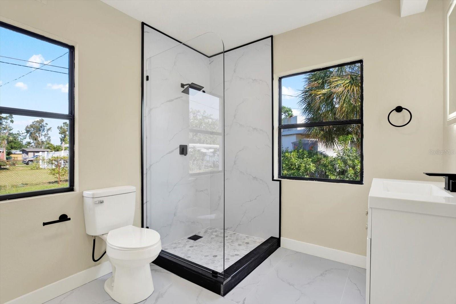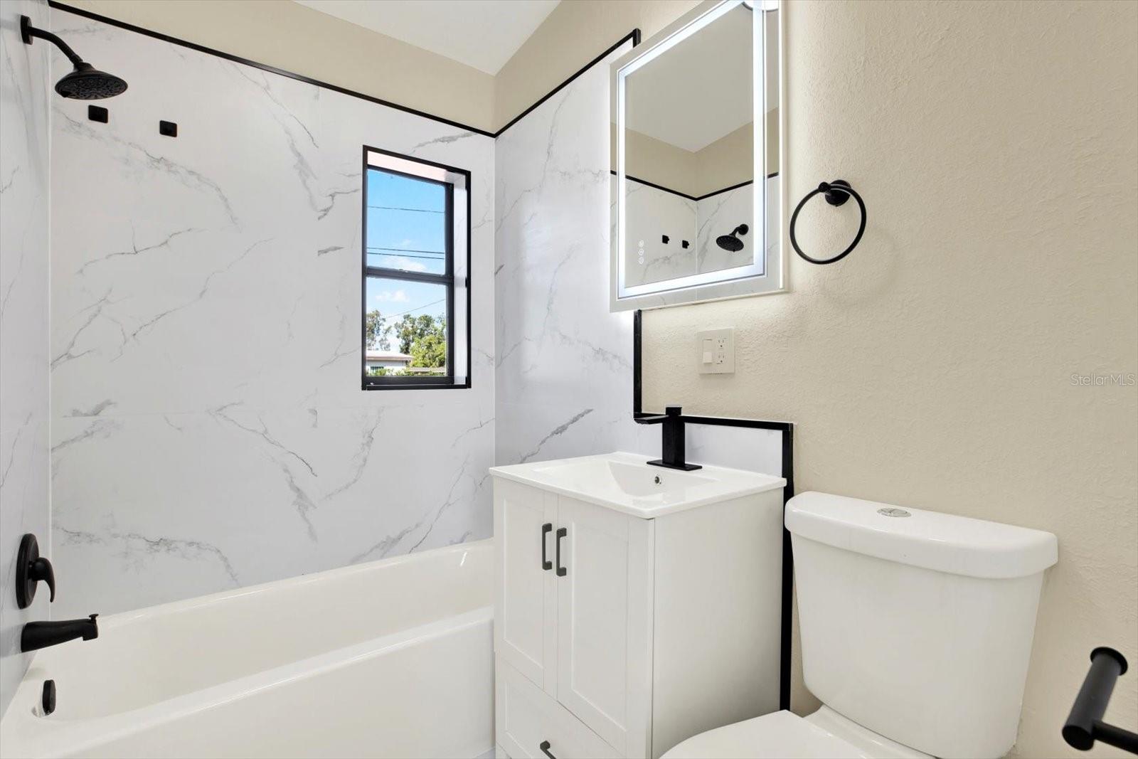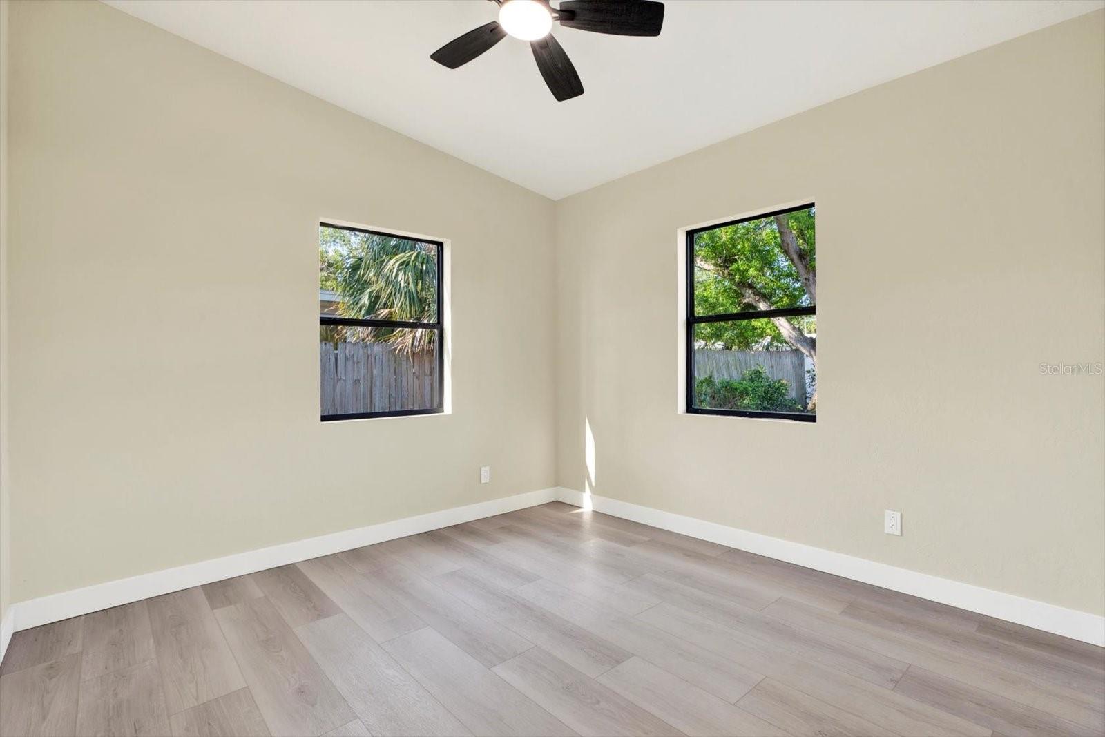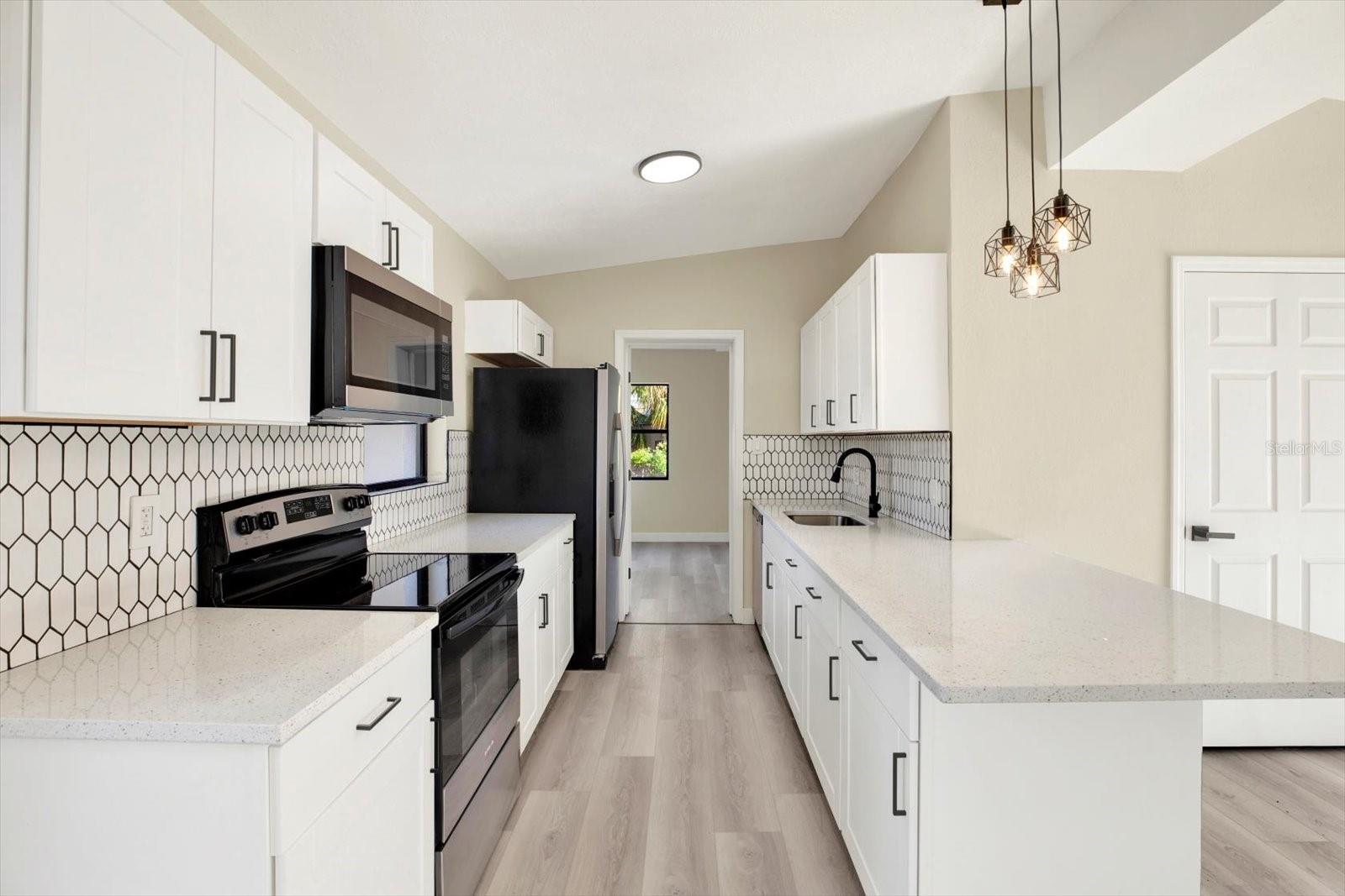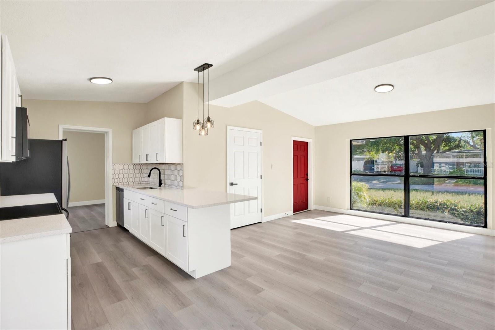One or more photo(s) has been virtually staged. This thoughtfully upgraded 3-bedroom, 2-bathroom residence offers 1,262 square feet of stylish living space with a desirable split floor plan—perfect for privacy and comfort. The primary suite is situated on one side of the home, while the secondary bedrooms and bath are on the other, creating ideal separation for families or guests. As you step inside, you’ll be greeted by a spacious living room that seamlessly flows into the dining area. Both spaces are enhanced with luxury vinyl plank flooring and custom wall accents, setting the stage for both relaxing evenings and entertaining guests. The kitchen is a showstopper, featuring newly installed wood cabinetry with coordinating custom hardware, stunning stone countertops with matching bar top and backsplash, an undermount sink with a modern faucet, and stylish lighting. All major appliances—including a range, refrigerator, dishwasher, and microwave—are included. Retreat to your serene primary bedroom, complete with its own fireplace, creating a cozy ambiance you’ll love. The en-suite bathroom offers a luxurious touch with marble flooring, a beautifully tiled shower enclosure, and modern fixtures, including a built-in sink, stylish cabinetry, and chic accessories. Two generously sized secondary bedrooms share a fully updated bathroom, featuring an upgraded tub with tile surround, new vanity with built-in sink, matching hardware, and a contemporary mirror. A versatile bonus room completes the interior—ideal for a home office, playroom, or creative space. Step outside to the expansive backyard with a large rear deck, perfect for family gatherings, barbecues, or simply enjoying Florida’s beautiful weather. Conveniently located just minutes from I-275, top-rated beaches, airports, shopping, dining, hospitals, and schools. Plus, enjoy low-cost living with NO HOA and NO CDD fees! Don’t miss this move-in ready gem—schedule your private showing today!
