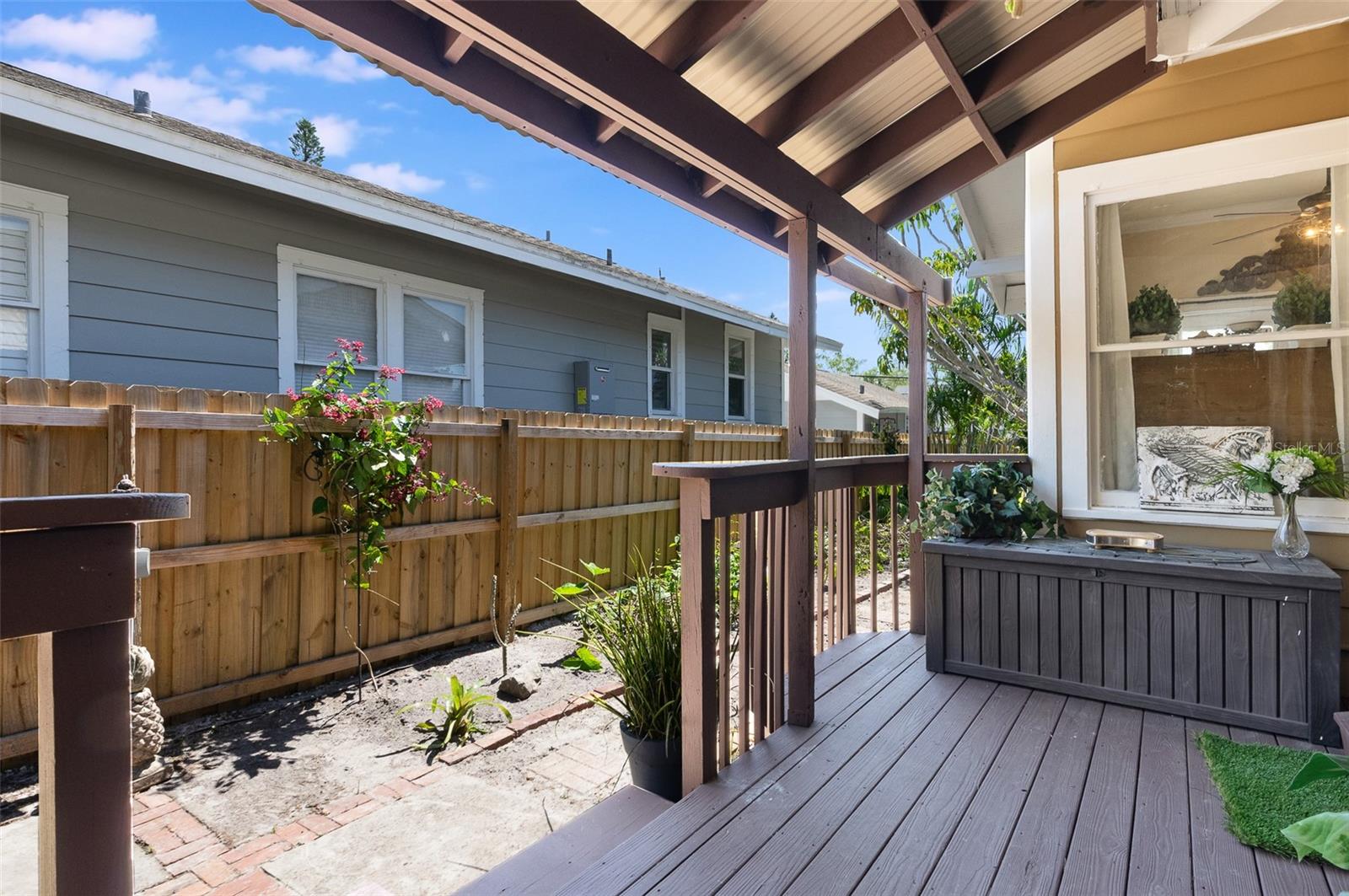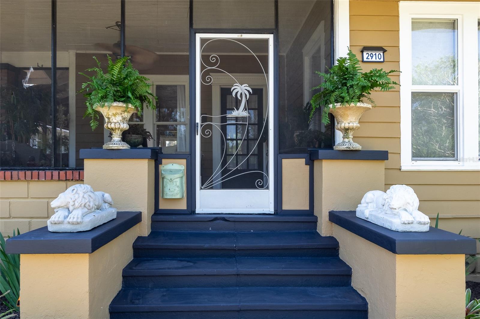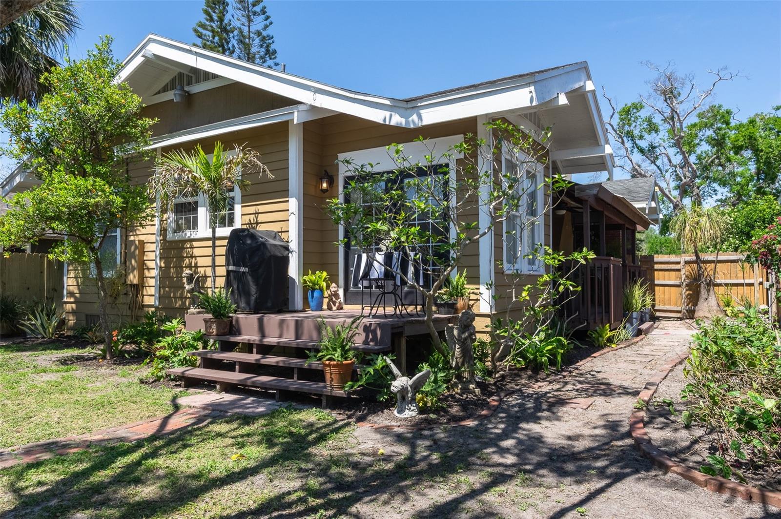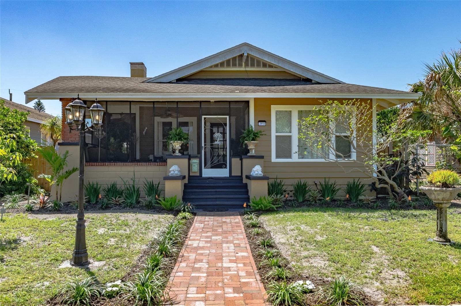 PRICE REDUCTION.… you have waited 105 years for this Charming American Craftsman Bungalow to become available! First…The Neighborhood-Historic Kenwood. On the National Register of Historic places, Kenwood was St. Pete’s first “suburb” in 1912. Often praised for its unique architecture… characterized by Craftsman Bungalows, Tudor revival elements, and its emphasis on nature, conservation, strong sense of community and slow pace of life. A community in St. Pete that has NOT pushed out the historic dwellings. Enjoy all of this in a NO FLOOD ZONE. Second…The Location- In the heart of Historic Kenwood, DIRECTLY on arguably the best streetside position viewing beautiful Seminole Park, with green space, mature trees and the historic Pavillion…all from your unobstructed large private screened porch with original tile. Of Course, the Home itself- Built in 1920,this 2 bedroom 2 bath historic gem blends all the charm you would expect with important updates. The 2025 freshly painted exterior has the low-pitched roofs, overhanging eaves and hallmark decorations of the period. The fireplaced (original hearth tile) living room/dining room floods with natural light through multiple large windows and high ceilings with glass sliding doors leading to a large, covered porch. The family-sized designer eat-in kitchen features unique old-world cabinets & stainless appliances… then flows to a rear deck porch viewing a stone patio with a mix of new and mature landscaping. The primary bedroom features a roomy, newly installed stunning bathroom with claw-foot tub. The guest bedroom boasts extra-large windows. The second updated bathroom with tub/shower has all the charm of the 1920’s, as well as a laundry closet with tankless hot water heater and stackable washer/dryer. A combination of original hardwood floors blend well with new complimentary flooring material. Crown molding and original 8” baseboards abound throughout the house including the kitchen. The original large detached garage has new roof in 2024. Other improvements in 2024 include new sprinkler system, new side porch roof & interior paint. The main house roof, and HVAC is new in 2015. The entire lot is privately wood fenced and brick walkway front and back new in 2025. Historic Kenwood…known for its community events, block parties, art walks and “Bungalow Tours”, borders Central Ave with its growing community of eateries and unique shops. The location is unbeatable-close to Downtown St. Pete and Gulf of Mexico beaches. 4-Point inspection completed 2025. *Please see attached sheet for full list of dated improvements.