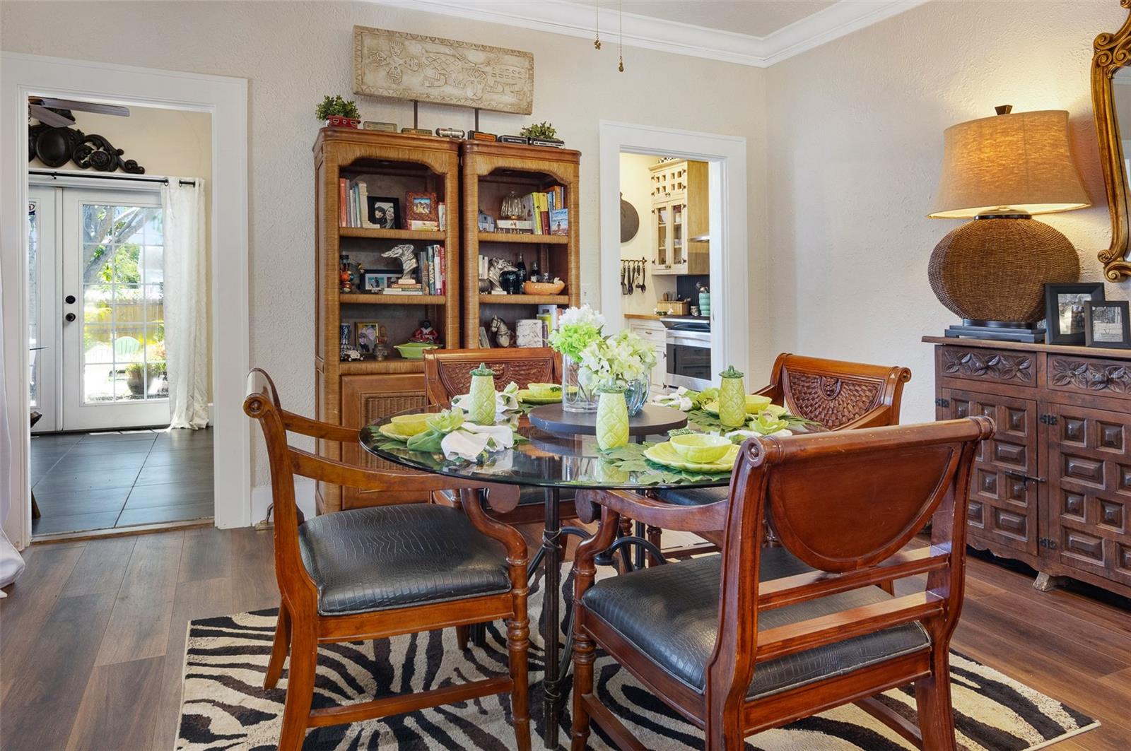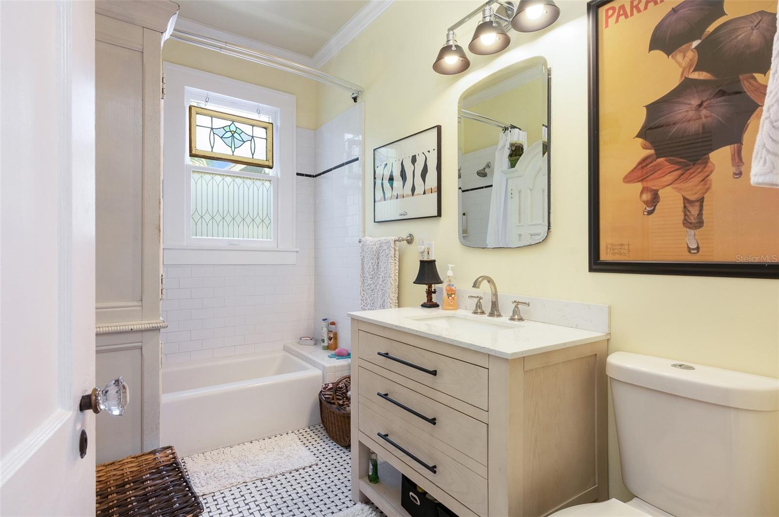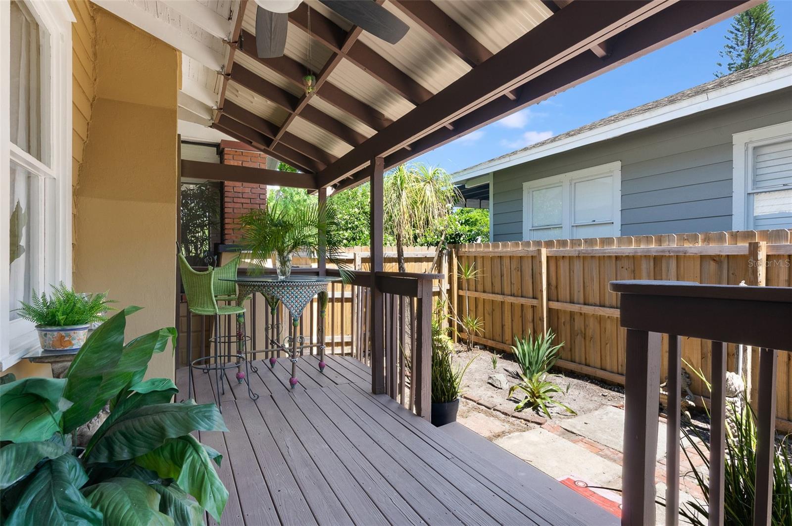 PRICE REDUCTION.… you have waited 105 years for this Charming American Craftsman Bungalow to become available! First…The Neighborhood-Historic Kenwood. On the National Register of Historic places, Kenwood was St. Pete’s first “suburb” in 1912. Often praised for its unique architecture… characterized by Craftsman Bungalows, Tudor revival elements, and its emphasis on nature, conservation, strong sense of community and slow pace of life. A community in St. Pete that has NOT pushed out the historic dwellings. Enjoy all of this in a NO FLOOD ZONE. Second…The Location- In the heart of Historic Kenwood, DIRECTLY on arguably the best streetside position viewing beautiful Seminole Park, with green space, mature trees and the historic Pavillion…all from your unobstructed large private screened porch with original tile. Of Course, the Home itself- Built in 1920,this 2 bedroom 2 bath historic gem blends all the charm you would expect with important updates. The 2025 freshly painted exterior has the low-pitched roofs, overhanging eaves and hallmark decorations of the period. The fireplaced (original hearth tile) living room/dining room floods with natural light through multiple large windows and high ceilings with glass sliding doors leading to a large, covered porch. The family-sized designer eat-in kitchen features unique old-world cabinets & stainless appliances… then flows to a rear deck porch viewing a stone patio with a mix of new and mature landscaping. The primary bedroom features a roomy, newly installed stunning bathroom with claw-foot tub. The guest bedroom boasts extra-large windows. The second updated bathroom with tub/shower has all the charm of the 1920’s, as well as a laundry closet with tankless hot water heater and stackable washer/dryer. A combination of original hardwood floors blend well with new complimentary flooring material. Crown molding and original 8” baseboards abound throughout the house including the kitchen. The original large detached garage has new roof in 2024. Other improvements in 2024 include new sprinkler system, new side porch roof & interior paint. The main house roof, and HVAC is new in 2015. The entire lot is privately wood fenced and brick walkway front and back new in 2025. Historic Kenwood…known for its community events, block parties, art walks and “Bungalow Tours”, borders Central Ave with its growing community of eateries and unique shops. The location is unbeatable-close to Downtown St. Pete and Gulf of Mexico beaches. 4-Point inspection completed 2025. *Please see attached sheet for full list of dated improvements.