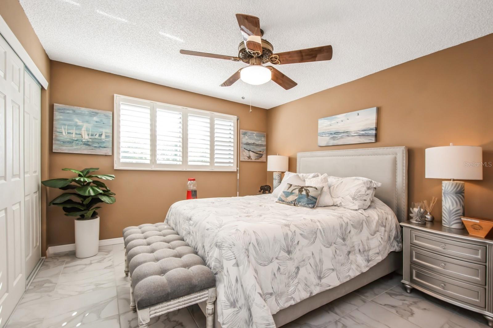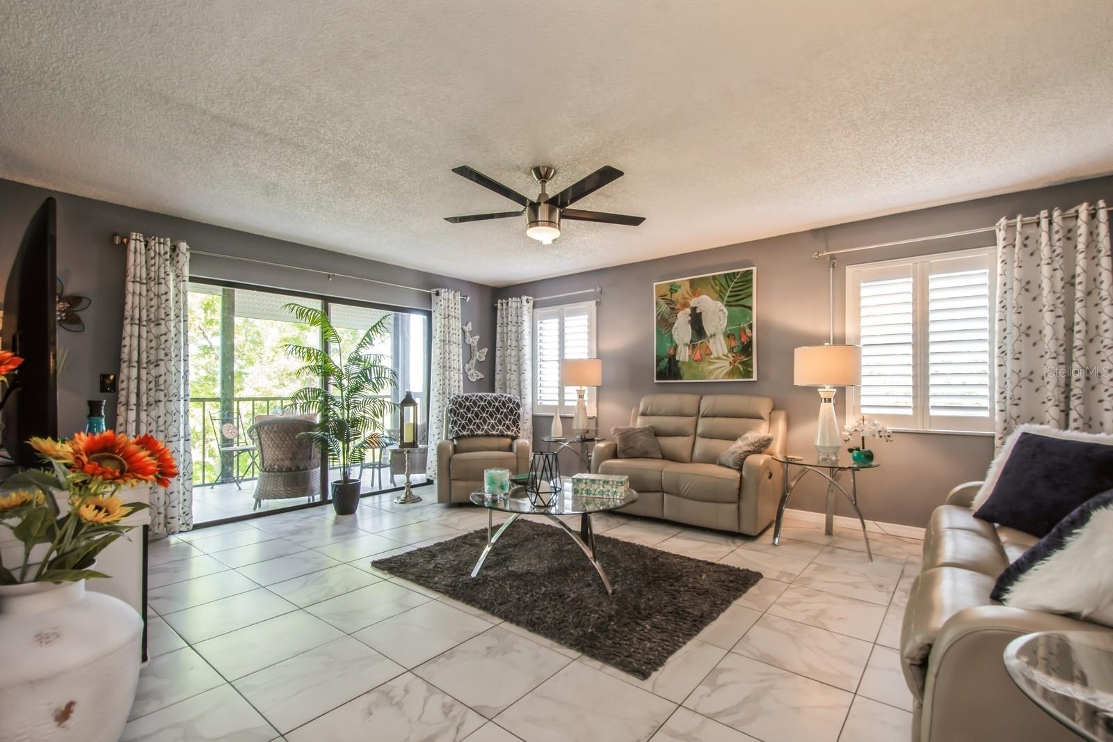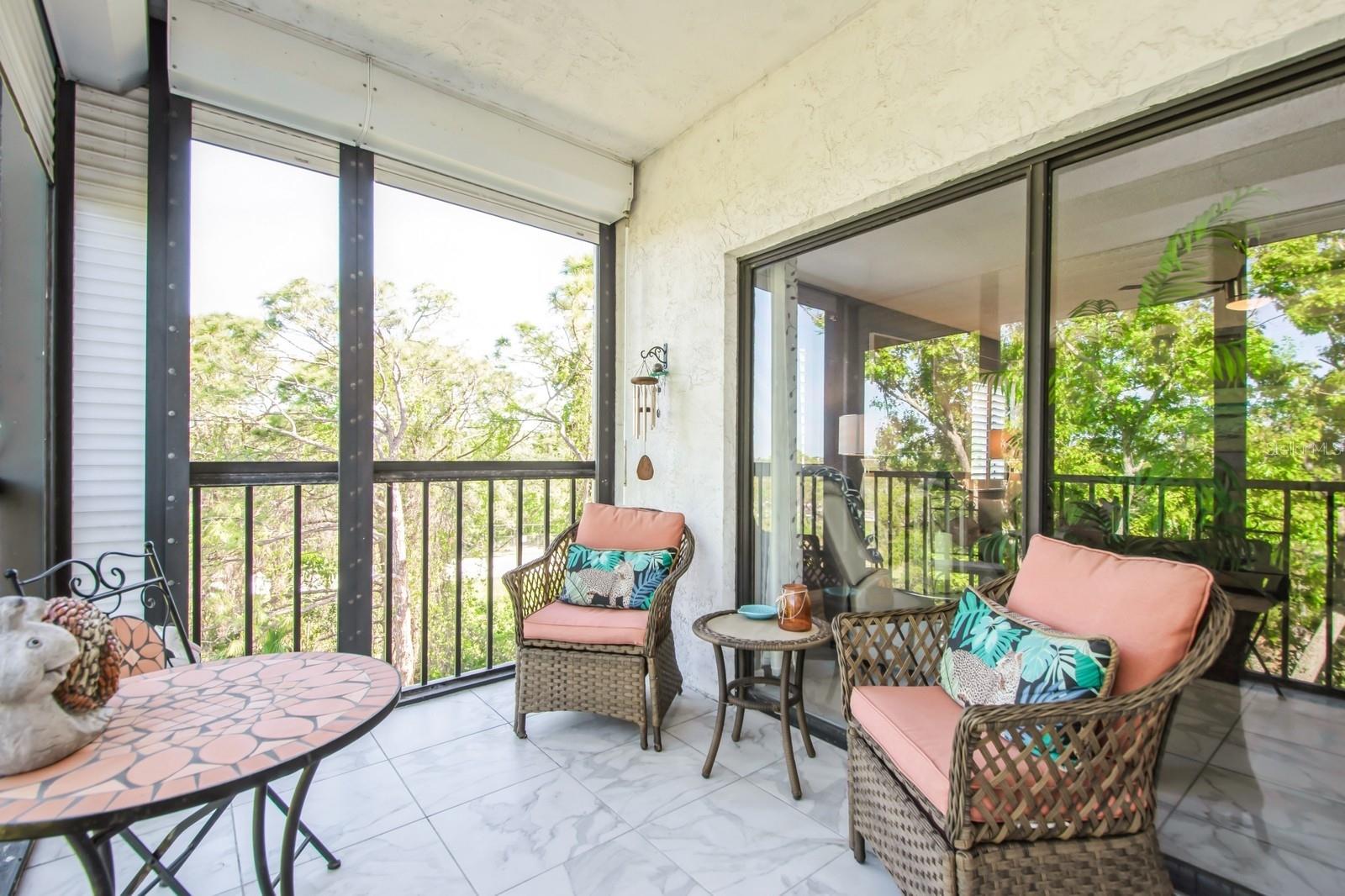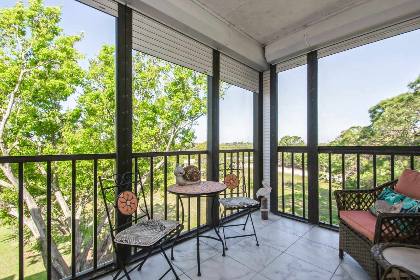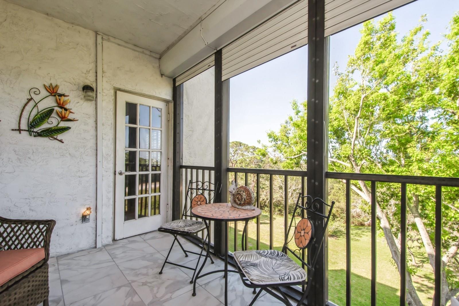 Welcome to your dream home at 8198 Terrace Garden Dr N #411, a beautifully maintained 2-bedroom, 2-bathroom condo in the sought-after 55+ community of Terrace Park of Five Towns. Spanning 1,700 square feet, this residence offers a perfect blend of modern elegance and low-maintenance living, designed to impress from the moment you step inside. The porcelain tile floors flow seamlessly throughout, creating a bright and cohesive space, while every window is dressed with stylish interior plantation shutters and equipped with hurricane-rated shutters for both sophistication and security. The heart of this condo is its updated kitchen, a chef’s delight with shaker cabinets topped with crown molding, luxurious granite countertops and backsplash, a gas stove, and matching stainless steel Samsung appliances. Just off the kitchen, a spacious laundry room with side-by-side washer and dryer units and ample storage makes daily tasks effortless. The open-concept layout enhances the sense of space, inviting relaxation or entertaining with ease. Retreat to the primary suite, a generously sized haven featuring a walk-in closet, a powder room, and an en-suite bathroom with updated stone countertops. This suite also boasts its own private balcony, offering peaceful views of the surrounding greenery—a perfect spot for morning coffee or evening unwinding. The second bedroom, equally inviting, enjoys access to a second full bathroom, also updated with stone countertops, making it ideal for guests or a home office. Outdoor living is a highlight here, with two private balconies showcasing tranquil vistas of the lush landscape. The main balcony, accessible from the living area, is perfect for gatherings or quiet moments, while the primary suite’s balcony adds an extra touch of serenity. The building itself offers standout features, including an elevator for convenience, common area storage spaces, covered bike storage, and an assigned covered carport space. Best of all, it’s the only building in Five Towns with its own sparkling swimming pool right next door—a rare luxury for residents. Living in Terrace Park at Five Towns means enjoying a wealth of community amenities. Beyond the pool attached to this building, you’ll find additional pools, scenic walking paths winding around ponds and lakes, a soon-to-be-renovated clubhouse and gym, tennis and pickleball courts, and a vibrant social scene with various community events. The HOA fee takes care of nearly everything—cable, internet, natural gas for heating and cooking, pest control, pool maintenance, recreational facilities, sewer, trash, and water—leaving only the electric bill as your additional expense. Perfectly positioned, this condo is just minutes from world-class beaches, shopping, dining, and major highways, offering an unbeatable combination of relaxation and accessibility. Don’t miss your chance to own this stunning condo in one of Southwest Florida’s premier 55+ communities—schedule your private tour today and experience the carefree, active lifestyle awaiting you!