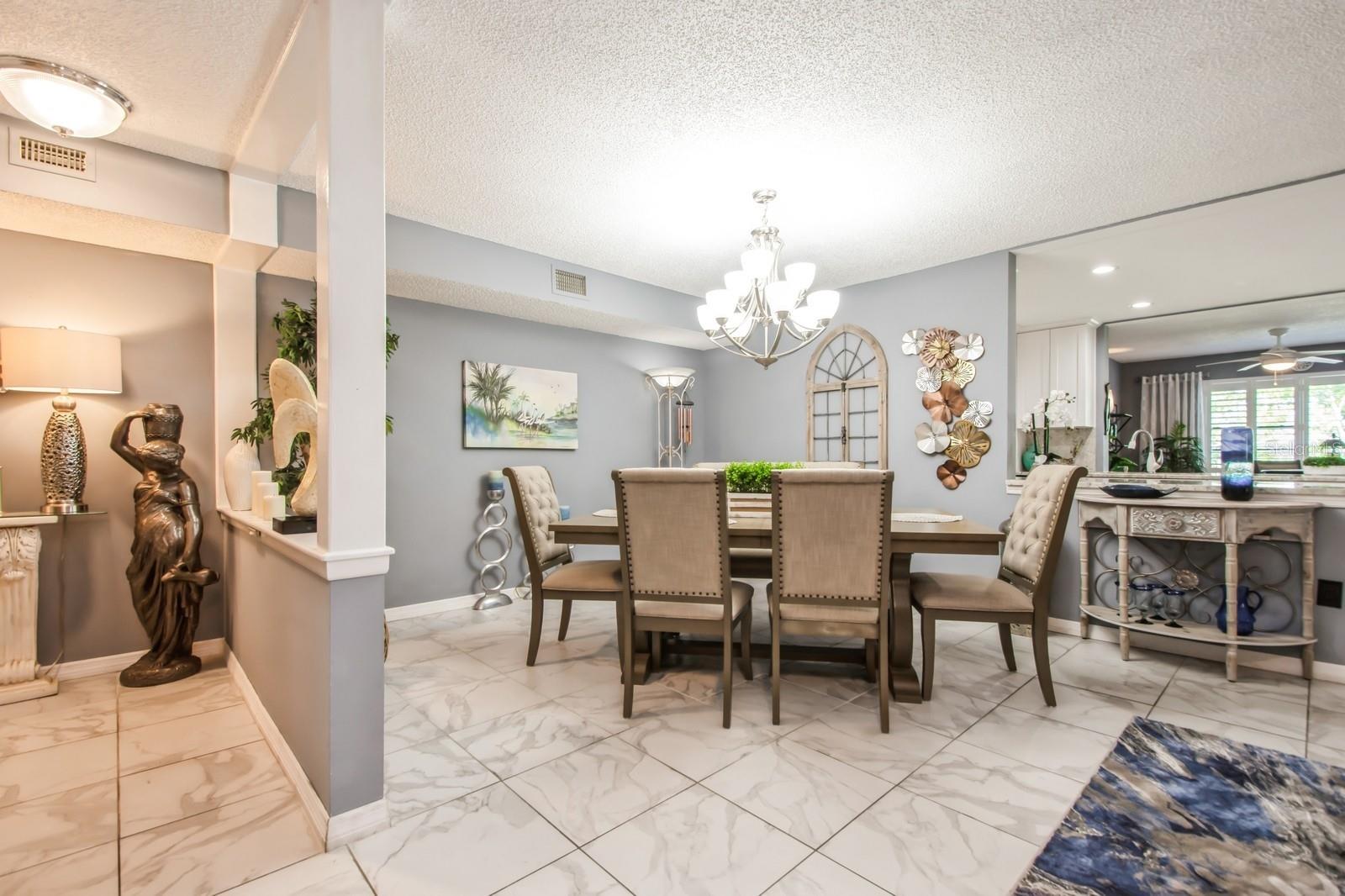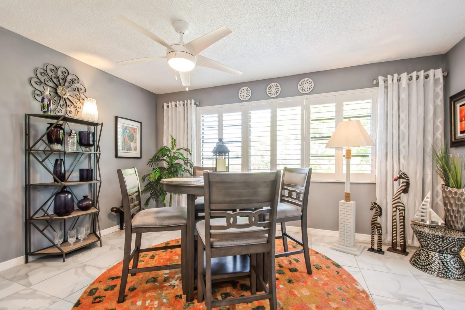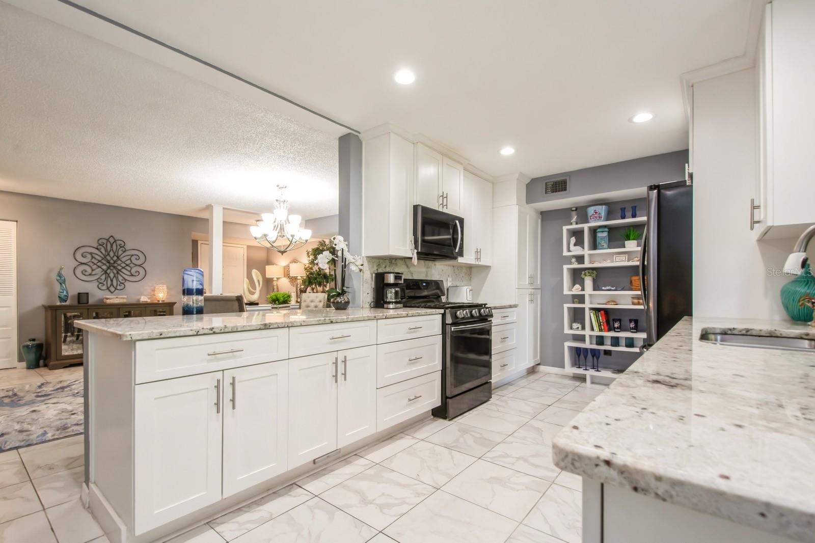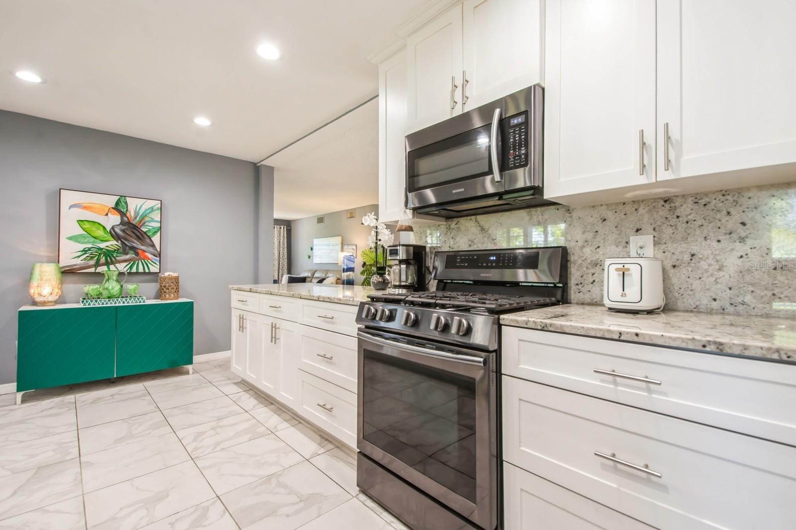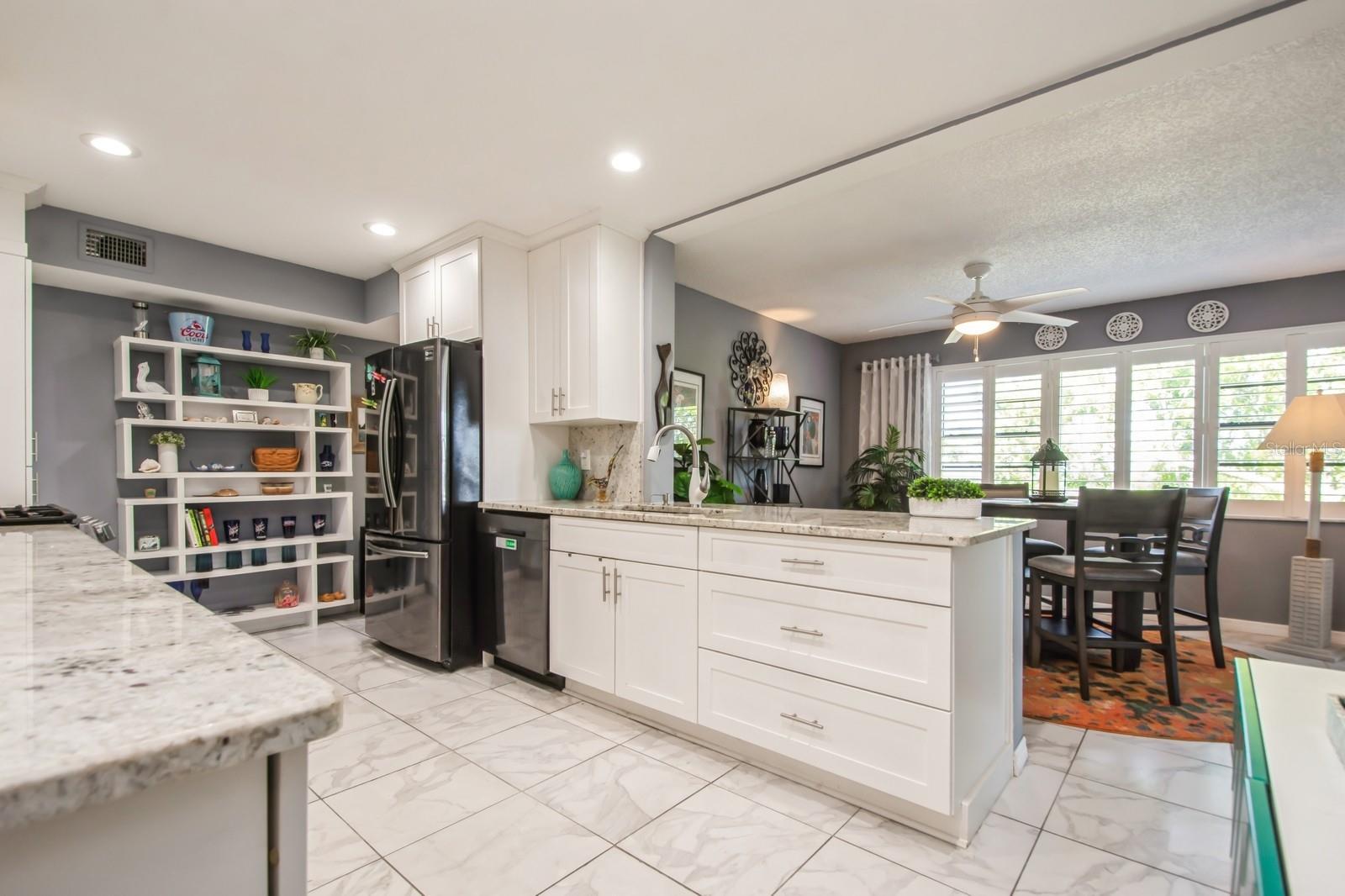 Welcome to your dream home at 8198 Terrace Garden Dr N #411, a beautifully maintained 2-bedroom, 2-bathroom condo in the sought-after 55+ community of Terrace Park of Five Towns. Spanning 1,700 square feet, this residence offers a perfect blend of modern elegance and low-maintenance living, designed to impress from the moment you step inside. The porcelain tile floors flow seamlessly throughout, creating a bright and cohesive space, while every window is dressed with stylish interior plantation shutters and equipped with hurricane-rated shutters for both sophistication and security. The heart of this condo is its updated kitchen, a chef’s delight with shaker cabinets topped with crown molding, luxurious granite countertops and backsplash, a gas stove, and matching stainless steel Samsung appliances. Just off the kitchen, a spacious laundry room with side-by-side washer and dryer units and ample storage makes daily tasks effortless. The open-concept layout enhances the sense of space, inviting relaxation or entertaining with ease. Retreat to the primary suite, a generously sized haven featuring a walk-in closet, a powder room, and an en-suite bathroom with updated stone countertops. This suite also boasts its own private balcony, offering peaceful views of the surrounding greenery—a perfect spot for morning coffee or evening unwinding. The second bedroom, equally inviting, enjoys access to a second full bathroom, also updated with stone countertops, making it ideal for guests or a home office. Outdoor living is a highlight here, with two private balconies showcasing tranquil vistas of the lush landscape. The main balcony, accessible from the living area, is perfect for gatherings or quiet moments, while the primary suite’s balcony adds an extra touch of serenity. The building itself offers standout features, including an elevator for convenience, common area storage spaces, covered bike storage, and an assigned covered carport space. Best of all, it’s the only building in Five Towns with its own sparkling swimming pool right next door—a rare luxury for residents. Living in Terrace Park at Five Towns means enjoying a wealth of community amenities. Beyond the pool attached to this building, you’ll find additional pools, scenic walking paths winding around ponds and lakes, a soon-to-be-renovated clubhouse and gym, tennis and pickleball courts, and a vibrant social scene with various community events. The HOA fee takes care of nearly everything—cable, internet, natural gas for heating and cooking, pest control, pool maintenance, recreational facilities, sewer, trash, and water—leaving only the electric bill as your additional expense. Perfectly positioned, this condo is just minutes from world-class beaches, shopping, dining, and major highways, offering an unbeatable combination of relaxation and accessibility. Don’t miss your chance to own this stunning condo in one of Southwest Florida’s premier 55+ communities—schedule your private tour today and experience the carefree, active lifestyle awaiting you!