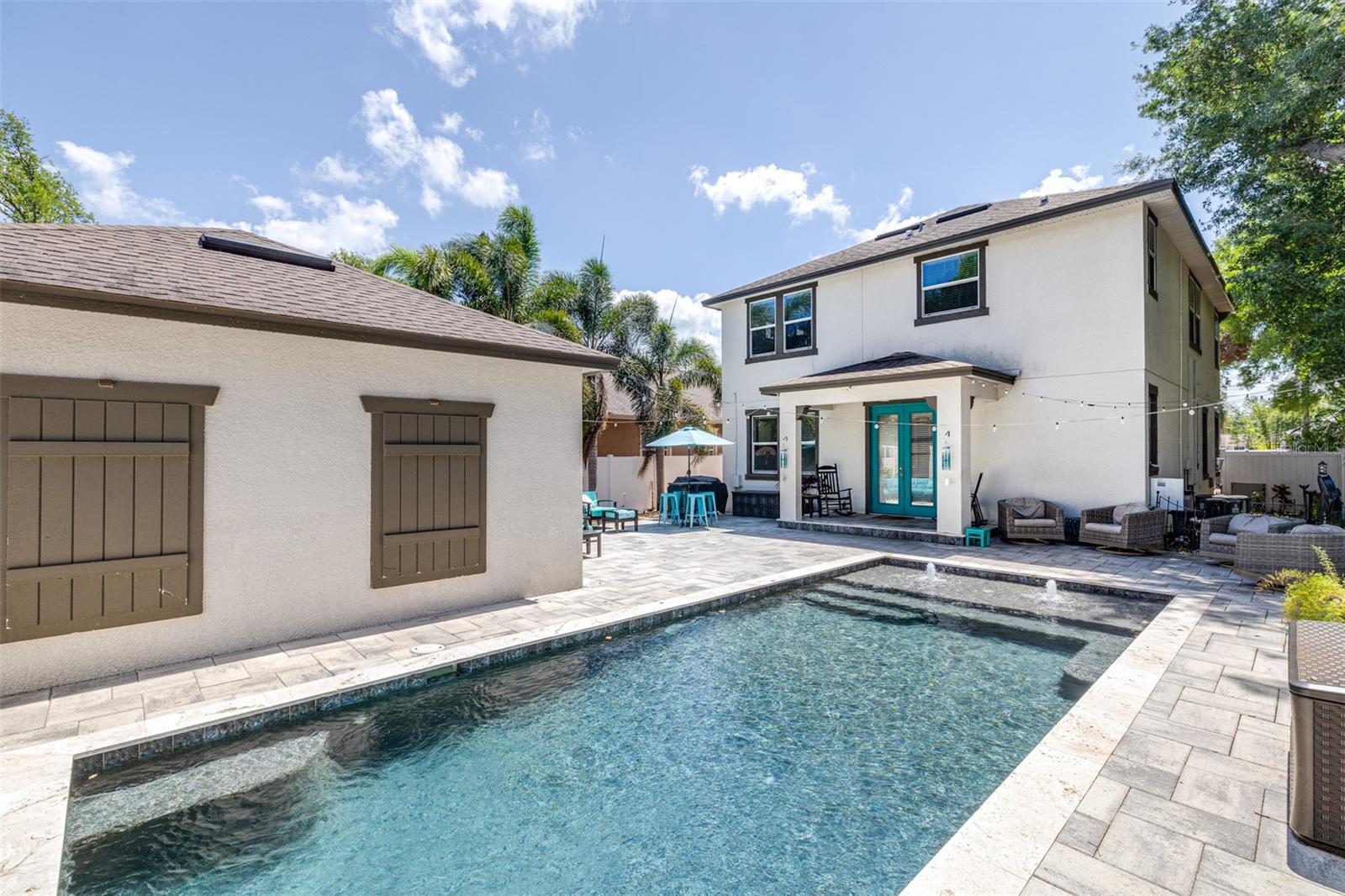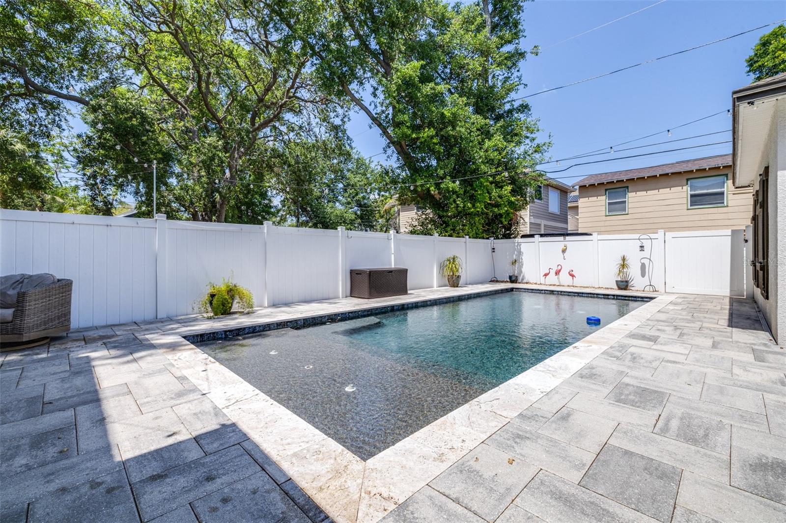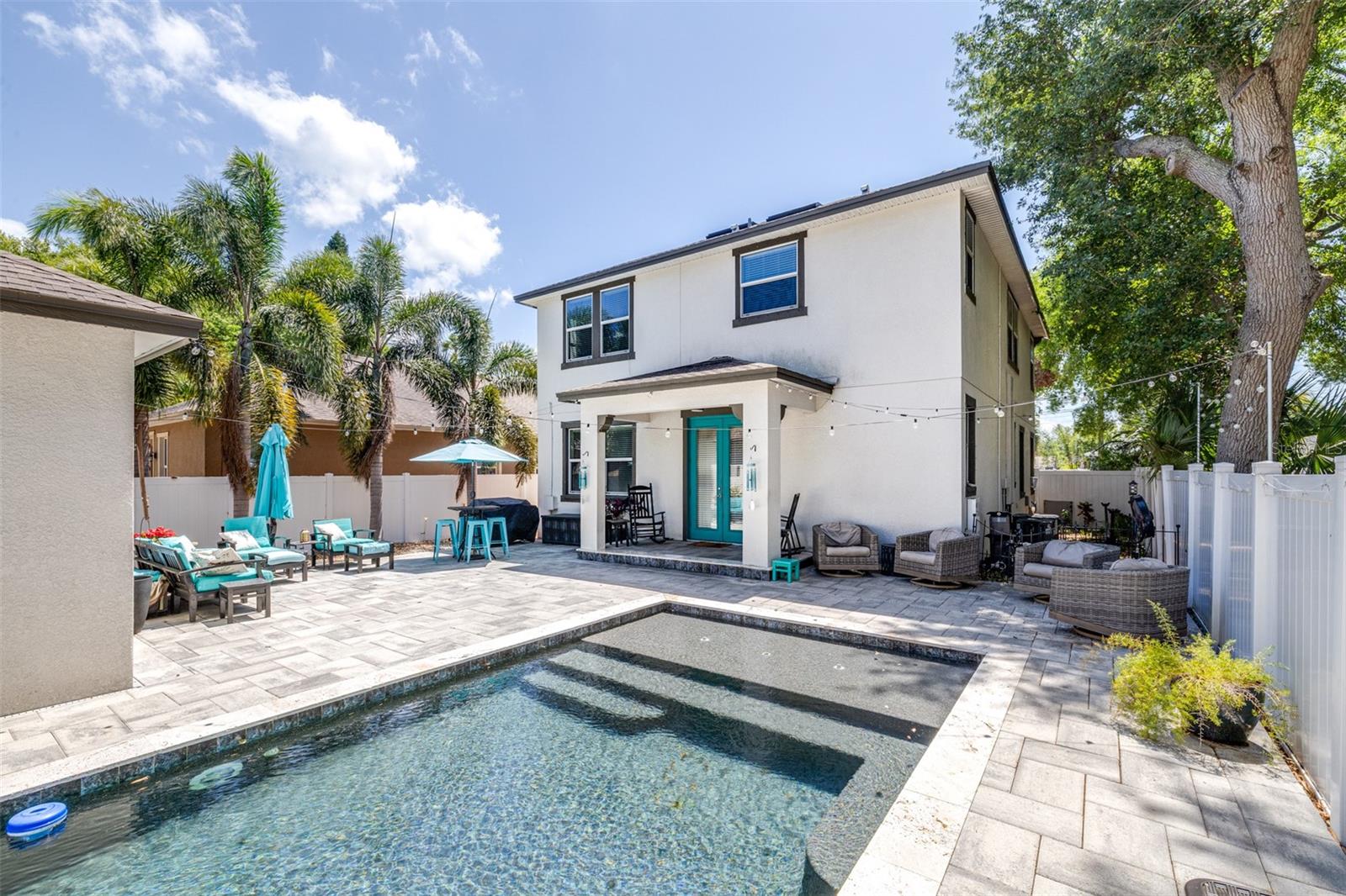 Experience the perfect blend of historic charm and modern luxury in this stunning 4-bedroom, 3-bathroom pool home, located in the highly sought-after Roser Park neighborhood just minutes from vibrant downtown St. Petersburg. Built in 2017, this two-story home is tucked away at the end of a quiet street, offering privacy, serene wooded views, and private alley access to a spacious two-car garage. Step through the grand oversized front door into an inviting space with soaring ceilings and elegant tile floors. The front bonus room offers endless possibilities—it can serve as a home office, movie room, formal dining room, or additional living space. The spacious kitchen is a standout feature, boasting expansive counter and cabinet space, stainless steel appliances, granite and quartz countertops, a walk-in pantry, and a built-in wine fridge. The open-concept layout flows seamlessly into the bright and airy living room, making it perfect for entertaining. French doors lead out to the private backyard oasis, where you’ll find a gorgeous custom saltwater pool surrounded by luxury pavers, creating an elegant and low-maintenance outdoor space. The fenced backyard provides a tranquil retreat with plenty of space for pets, family, and friends. Upstairs, the luxurious master suite boasts a tray ceiling, a spacious walk-in closet, and a spa-like en suite with double vanities, a soaking tub, and a glass-enclosed shower. Two additional bedrooms, a full bathroom, and a laundry room complete the second floor. Located near Johns Hopkins All Children’s Hospital, USF, parks, marinas, restaurants, and boutiques, this home offers unparalleled convenience and charm. Don’t miss out on this incredible opportunity to live just minutes from the best of downtown St. Pete—schedule your showing today! No Flood Zone!