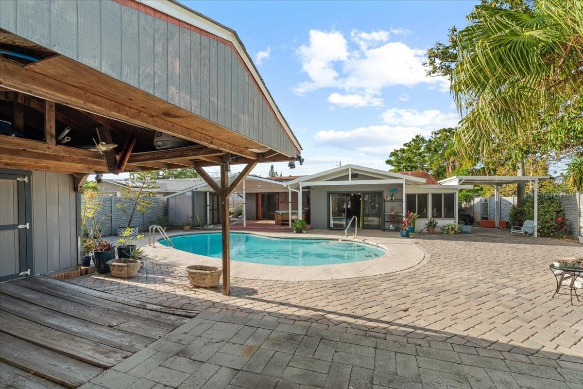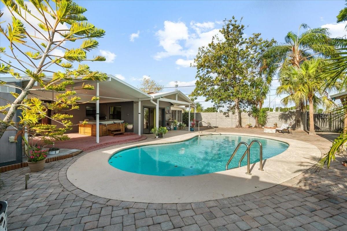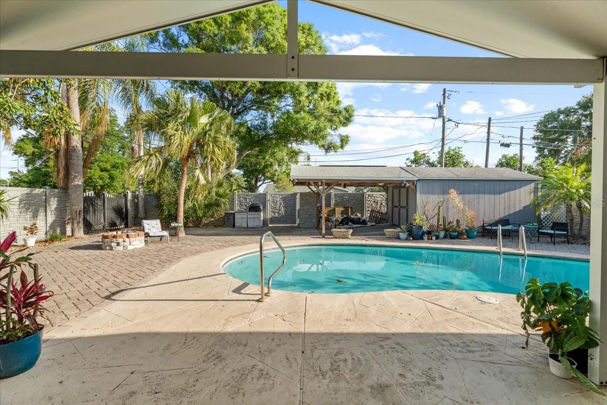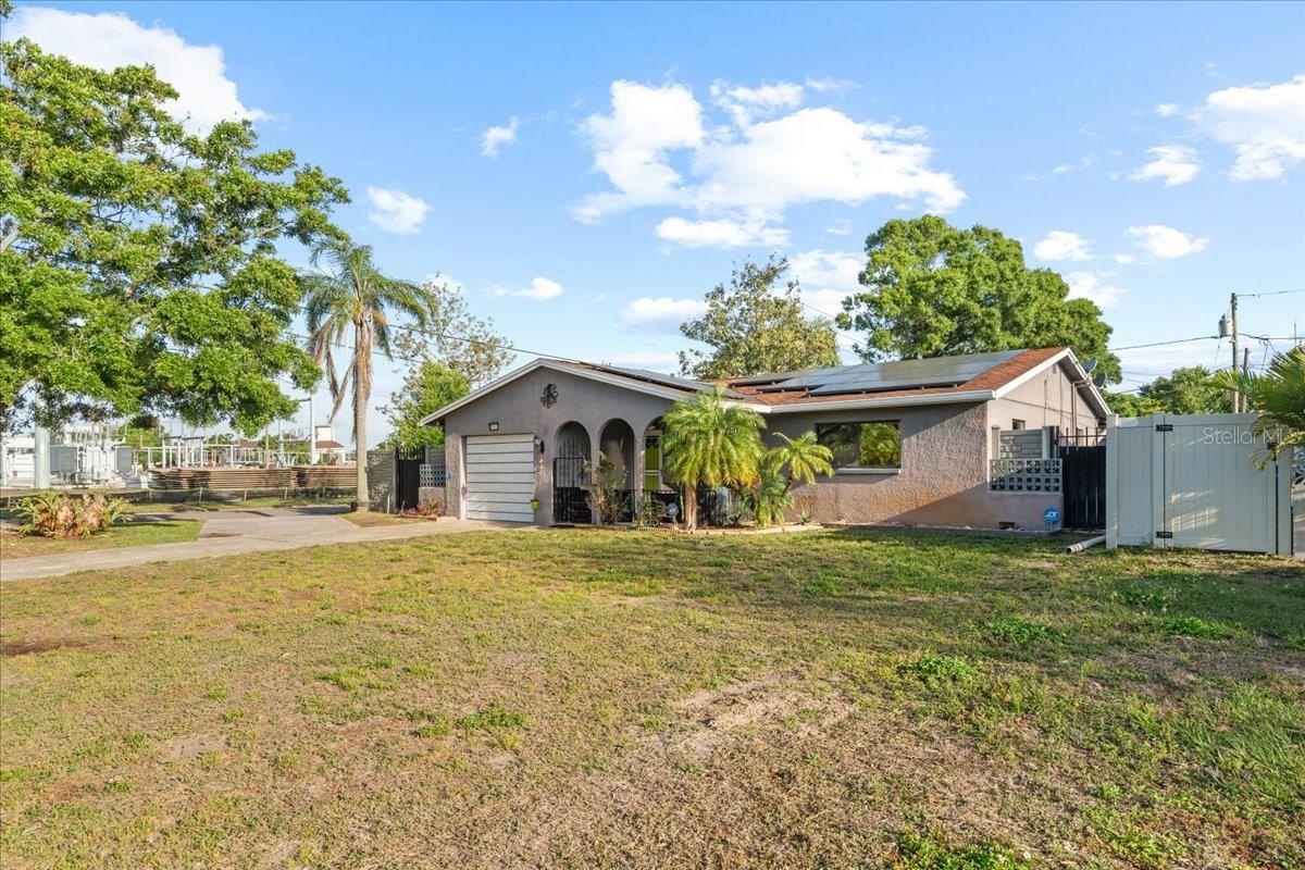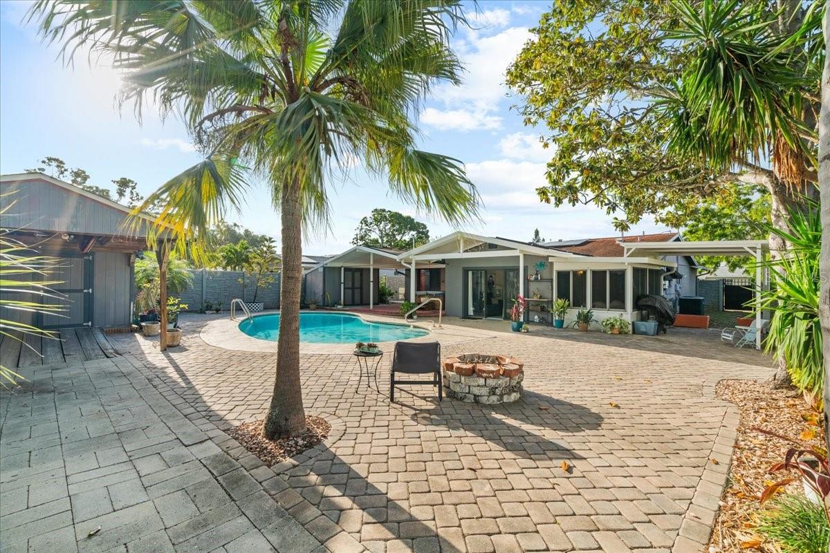 If you’re looking for an adorable pool home with a large, fully fenced, low maintenance yard with multiple patios perfect for gardening, entertaining, and other outdoor hobbies – You have found it! This 1,450 sq ft home in the heart of St. Petersburg offers the perfect blend of comfort, functionality, and open spaces. As you pull up to the house into the horseshoe driveway, take in the ample on and off-street parking on this corner lot. The front porch offers a peaceful and shaded space to enjoy your morning coffee in style. Step inside to discover gleaming new laminate flooring (installed March 2025) in the living room and bedrooms. The thoughtful floor plan features an open living room, eat in kitchen with dry bar, and back family room/sunroom that provides lots of flex space for a home office, craft space, or whatever suits your lifestyle. Down the hall, sit two generously sized bedrooms, including a primary suite with an ensuite bathroom and access to the back patio through glass sliding doors. The primary bedroom serves as a peaceful retreat. Both bedrooms offer large closets, perfect for storage. The attached one car garage houses the washer/dryer as well as a small workshop area. Outside, this property truly shines. Take a refreshing dip in the sparkling in-ground pool, or entertain guests on your choice of covered or uncovered patios. Two versatile sheds plus a workshop offer abundant storage and space for hobbies, while the fully fenced yard ensures complete privacy. RV and boat owners will appreciate the corner lot, large gates, and convenient alley access, making storage of oversized vehicles a breeze. The attached one-car garage provides additional secure parking, storage space, and laundry. Smart upgrades make this home as efficient as it is comfortable. Fully paid-off solar panels significantly reduce energy costs, while an irrigation system keeps the landscaping lush with minimal effort. This move-in ready home combines the best of Florida living with practical amenities that make everyday life easier. Non-flood zone and no flooding in recent storms.