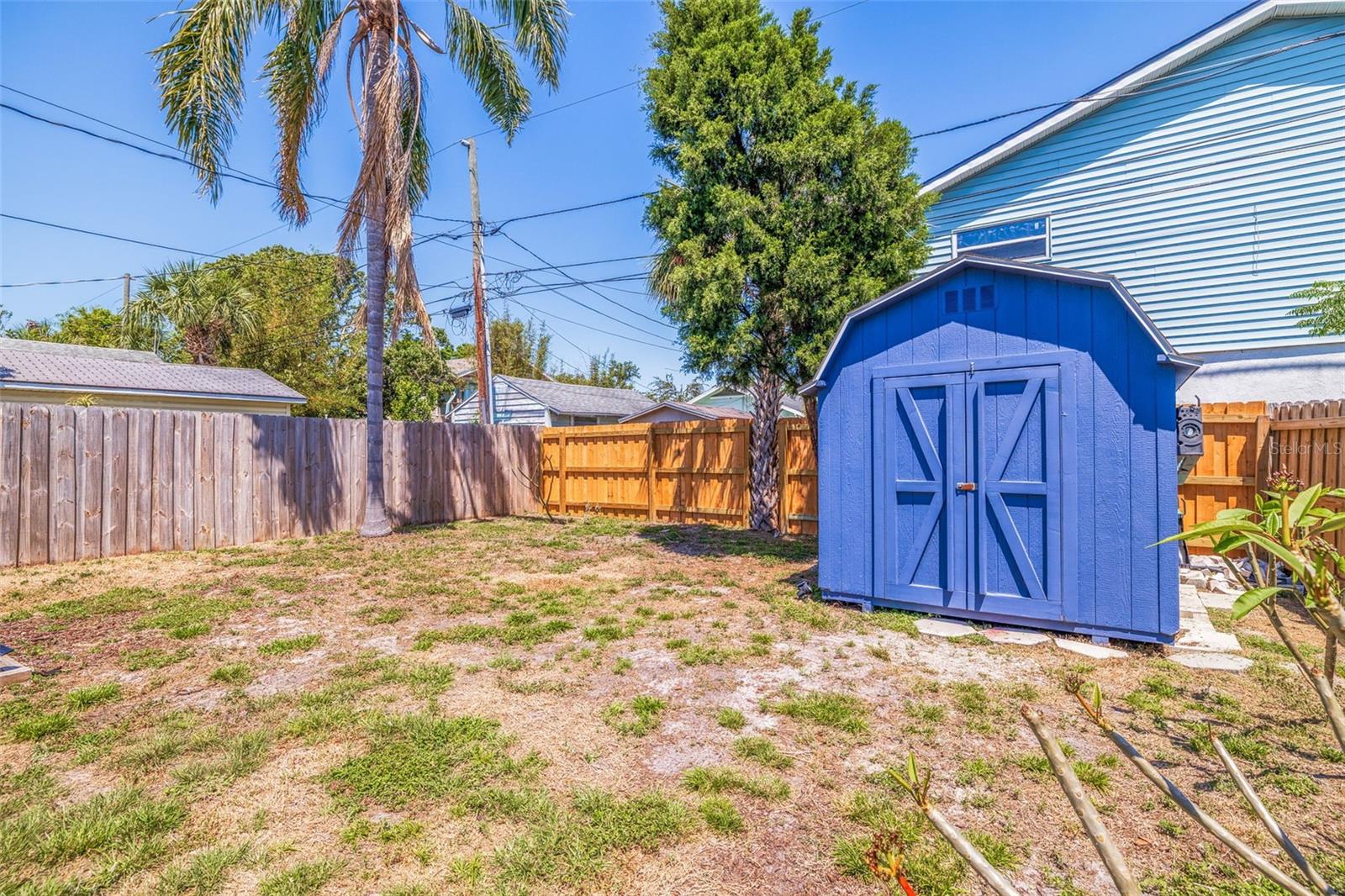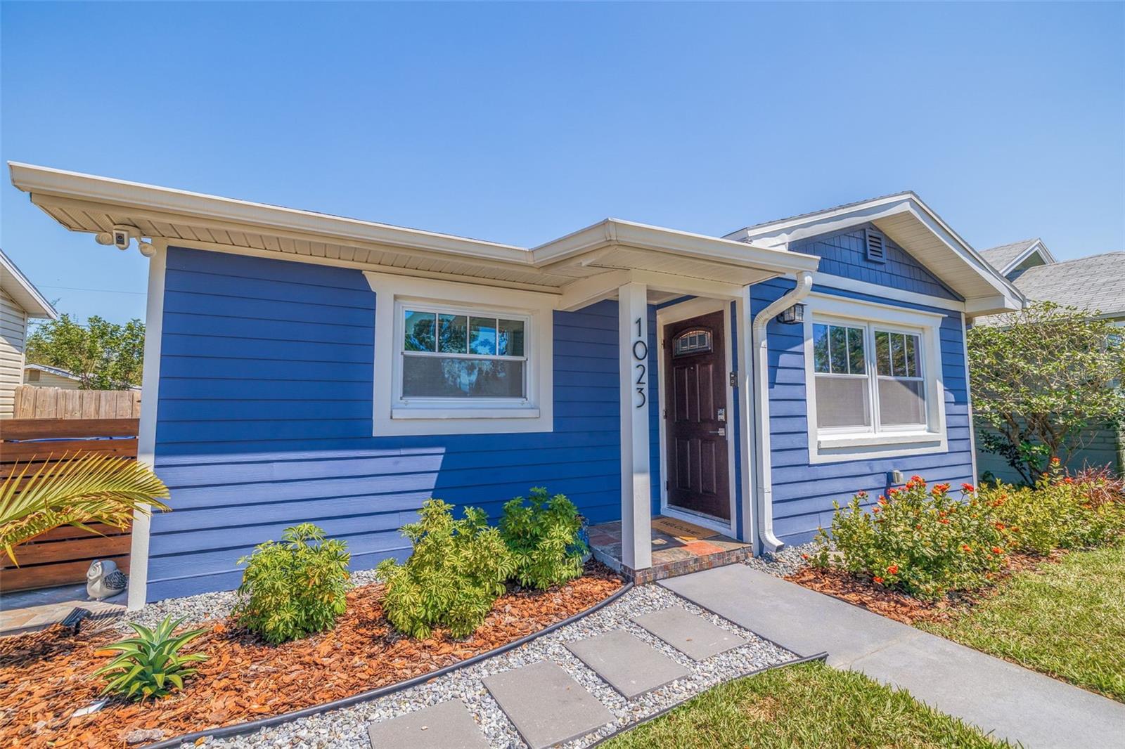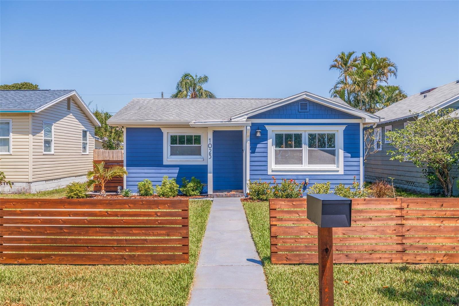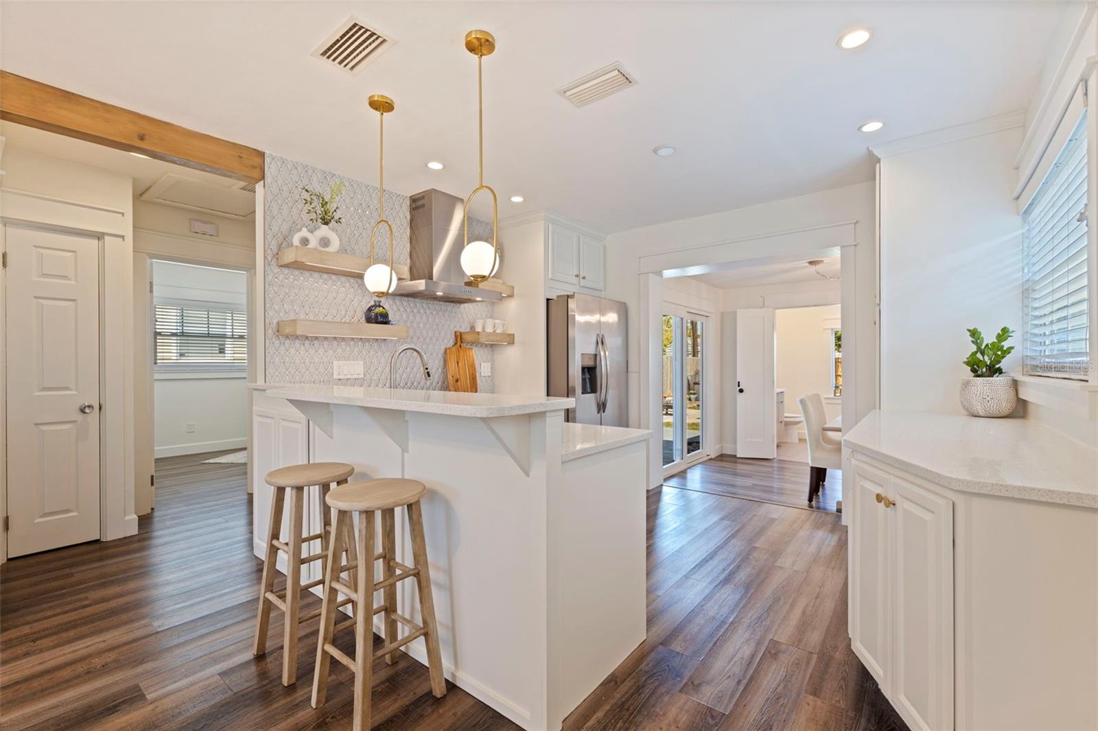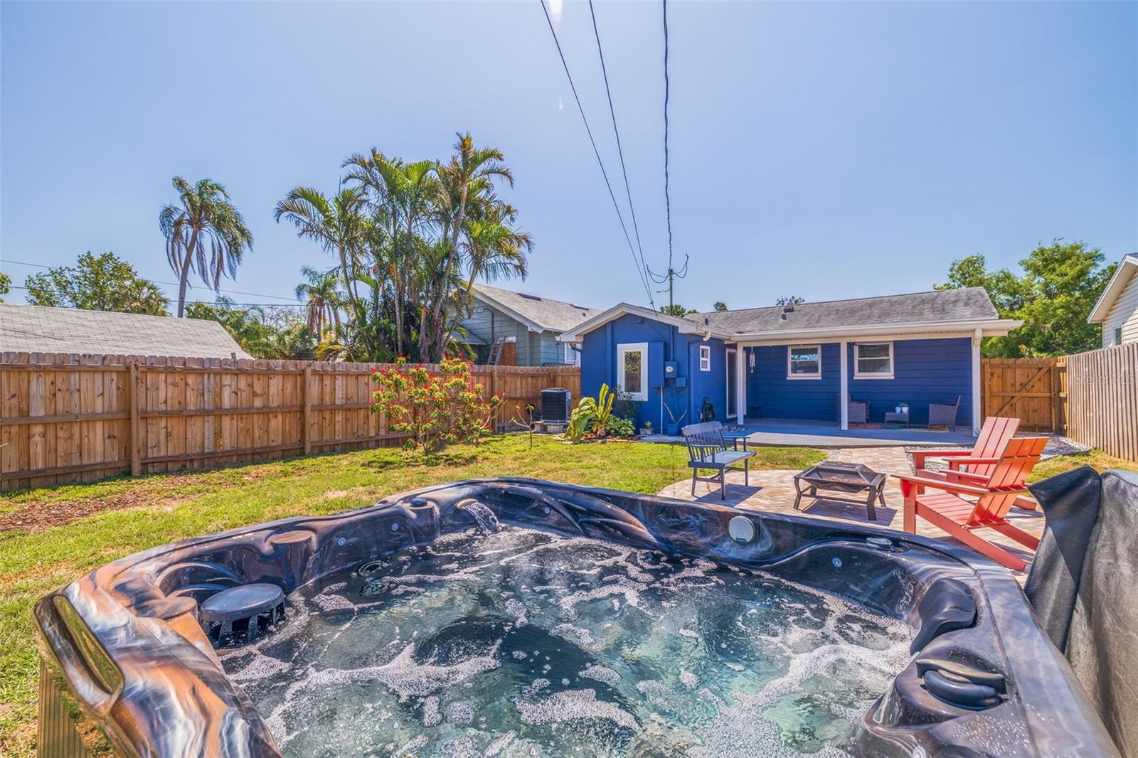 Welcome to this beautifully remodeled 2-bedroom, 2-bath bungalow, ideally located in Magnolia Heights — a high and dry St. Petersburg neighborhood where FLOOD INSURANCE IS NOT REQUIRED. Every inch of this home has been thoughtfully updated, offering a seamless blend of modern style and everyday functionality. Step inside to find wide-plank luxury vinyl flooring flowing throughout an open-concept layout. The designer kitchen features bright quartz countertops, open shelving with under-cabinet lighting, a gas stove, stainless steel appliances, a newly replaced refrigerator (2024), and a custom coffee bar for your morning routine. Just off the kitchen, a cozy dining nook with built-in bench seating adds charm and convenience — complete with hidden storage beneath. The spacious primary suite offers a peaceful retreat, highlighted by floating nightstands and sleek wall sconces that bring a clean, contemporary look with a warm, inviting touch. Both bathrooms have been fully updated with modern finishes, creating spa-like escapes. Enjoy the outdoors in your private, fully fenced backyard with a large paver patio — ideal for entertaining, dining al fresco, or relaxing in the included hot tub under the stars. Additional updates include a newer A/C system (2024), a gas tankless water heater (2019) for endless hot water, and smart storage solutions throughout. This home is truly turnkey — beautifully finished and move-in ready, in a prime location just minutes to downtown, parks, and local shops and restaurants.
