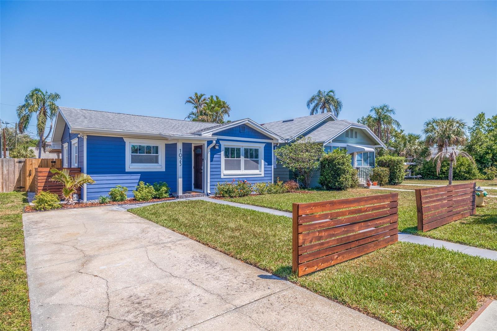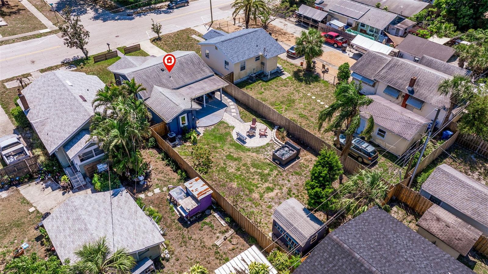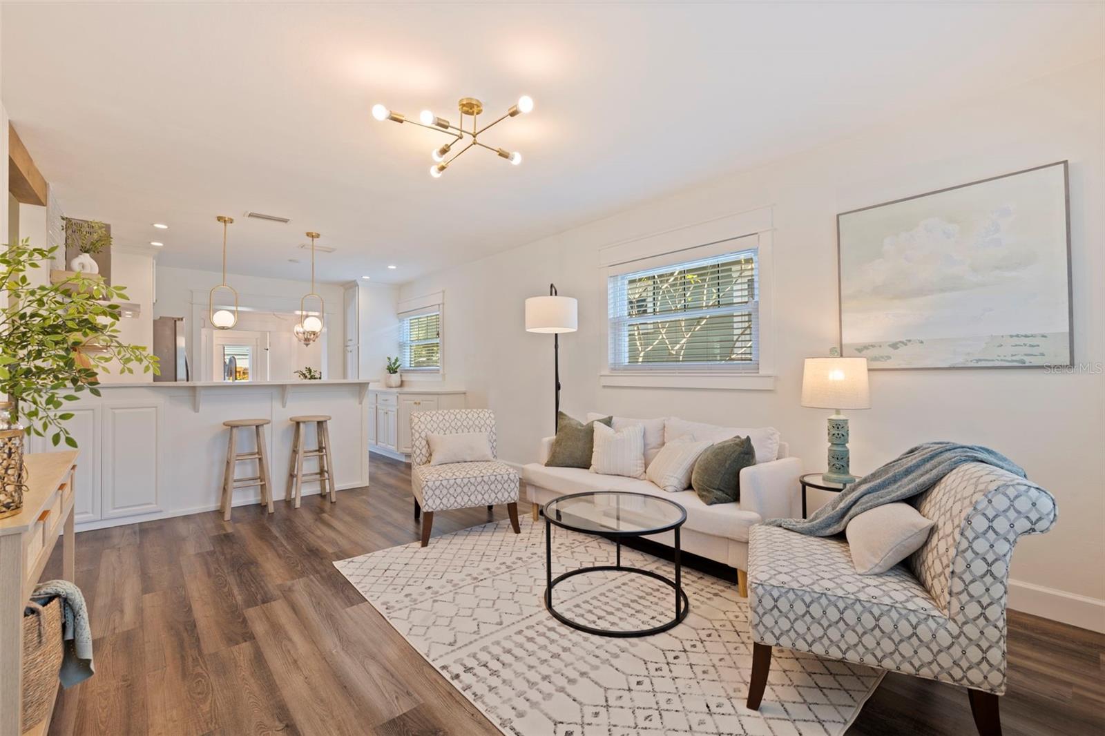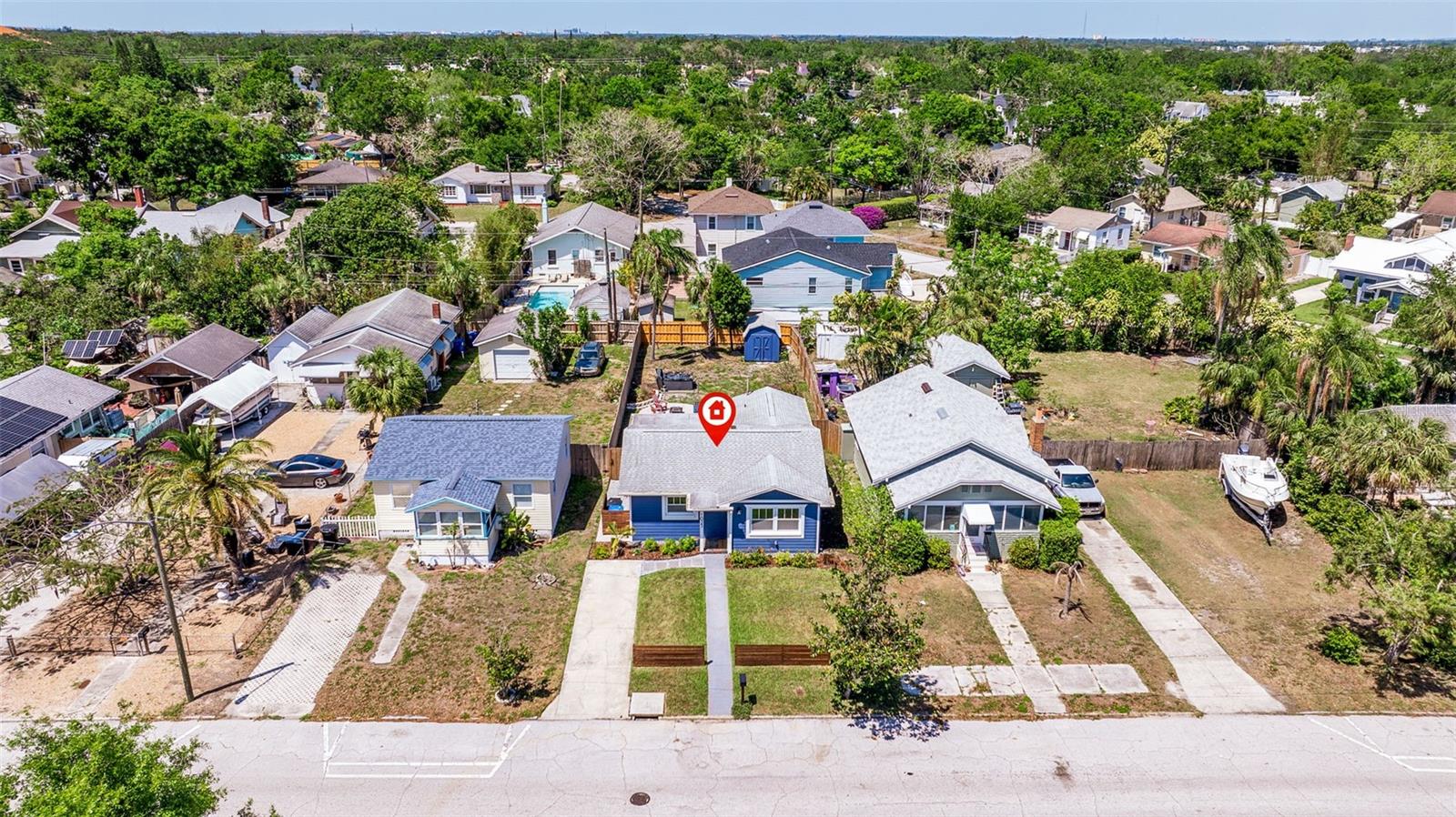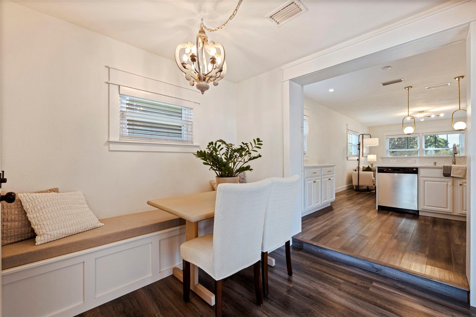Welcome to this beautifully remodeled 2-bedroom, 2-bath bungalow, ideally located in Magnolia Heights — a high and dry St. Petersburg neighborhood where FLOOD INSURANCE IS NOT REQUIRED. Every inch of this home has been thoughtfully updated, offering a seamless blend of modern style and everyday functionality. Step inside to find wide-plank luxury vinyl flooring flowing throughout an open-concept layout. The designer kitchen features bright quartz countertops, open shelving with under-cabinet lighting, a gas stove, stainless steel appliances, a newly replaced refrigerator (2024), and a custom coffee bar for your morning routine. Just off the kitchen, a cozy dining nook with built-in bench seating adds charm and convenience — complete with hidden storage beneath. The spacious primary suite offers a peaceful retreat, highlighted by floating nightstands and sleek wall sconces that bring a clean, contemporary look with a warm, inviting touch. Both bathrooms have been fully updated with modern finishes, creating spa-like escapes. Enjoy the outdoors in your private, fully fenced backyard with a large paver patio — ideal for entertaining, dining al fresco, or relaxing in the included hot tub under the stars. Additional updates include a newer A/C system (2024), a gas tankless water heater (2019) for endless hot water, and smart storage solutions throughout. This home is truly turnkey — beautifully finished and move-in ready, in a prime location just minutes to downtown, parks, and local shops and restaurants.