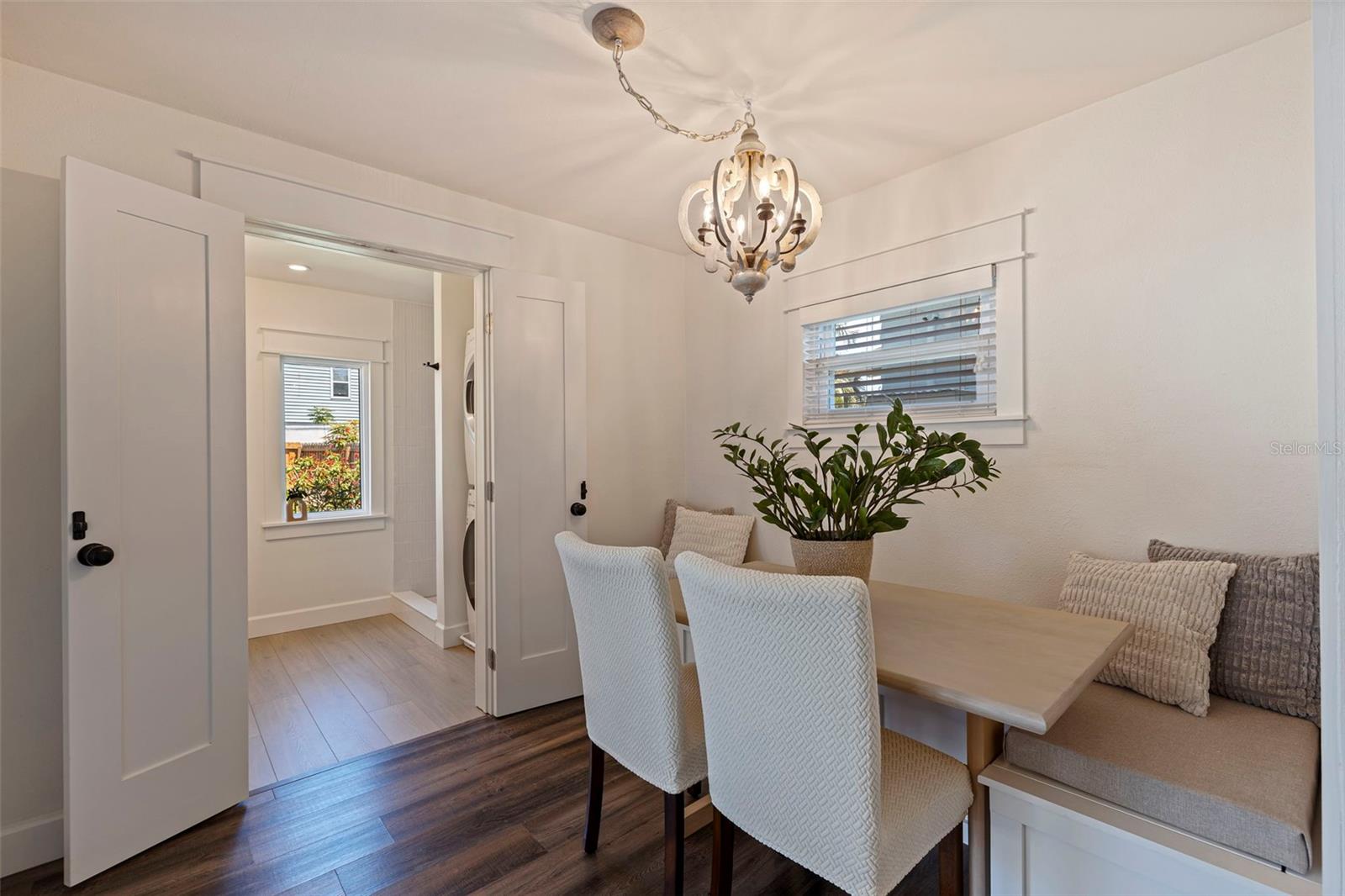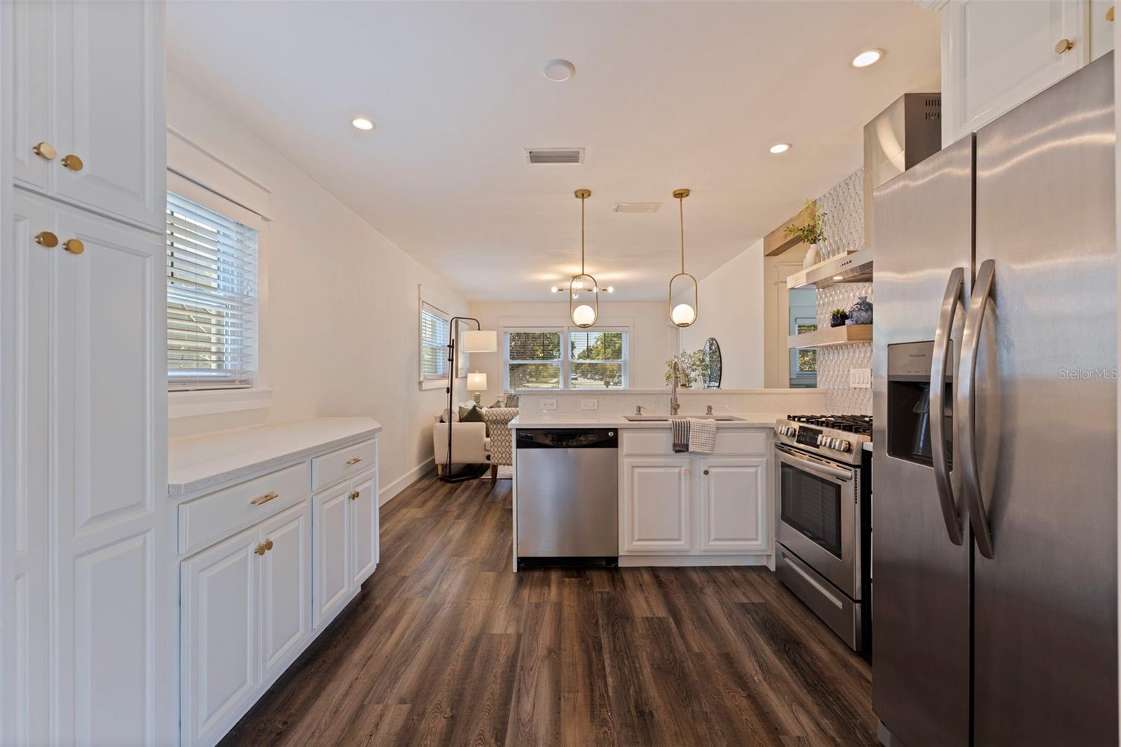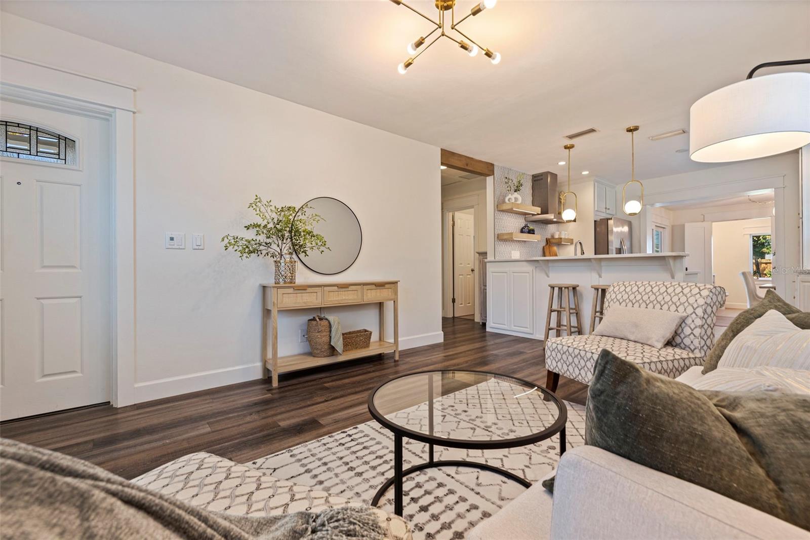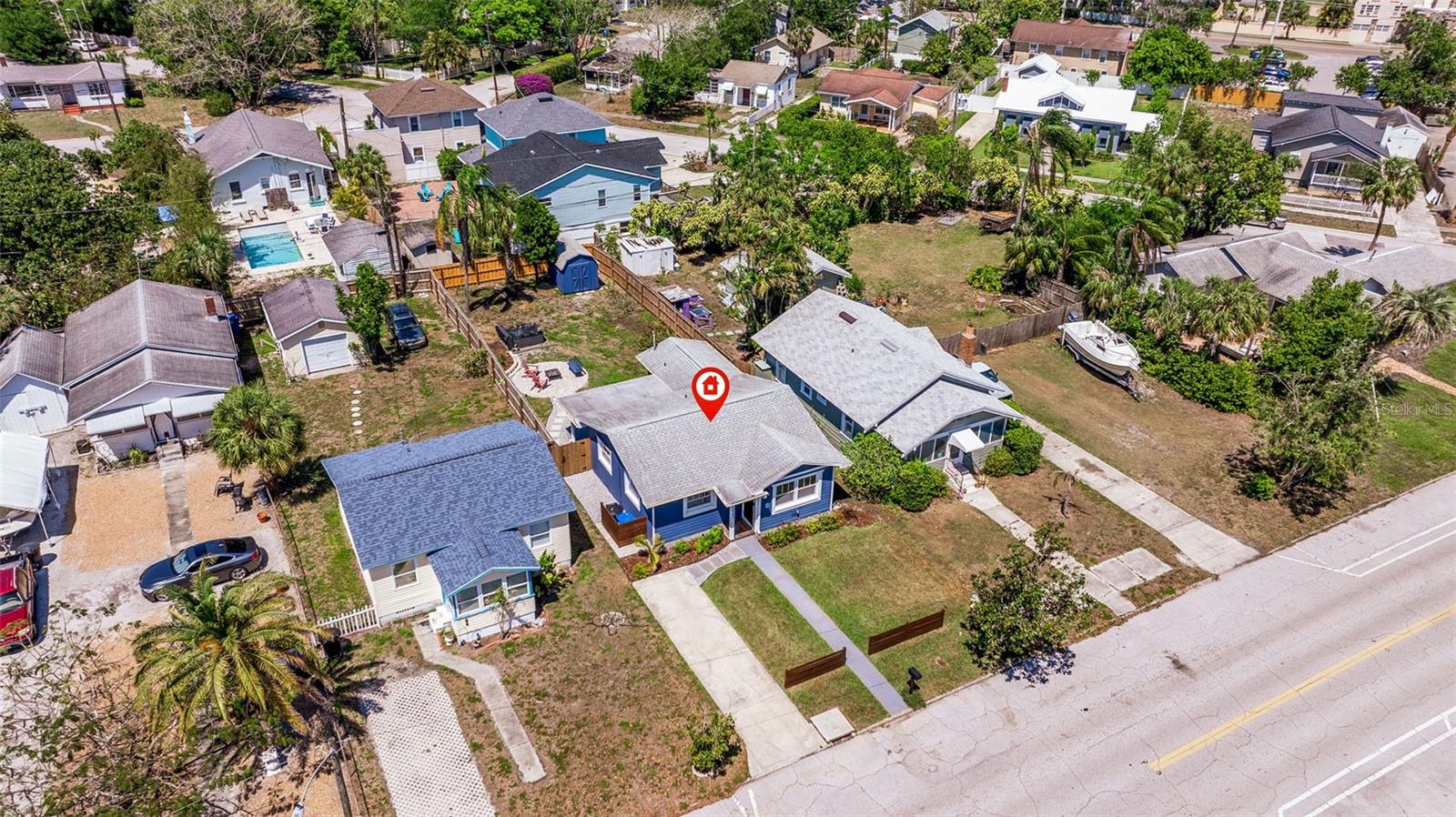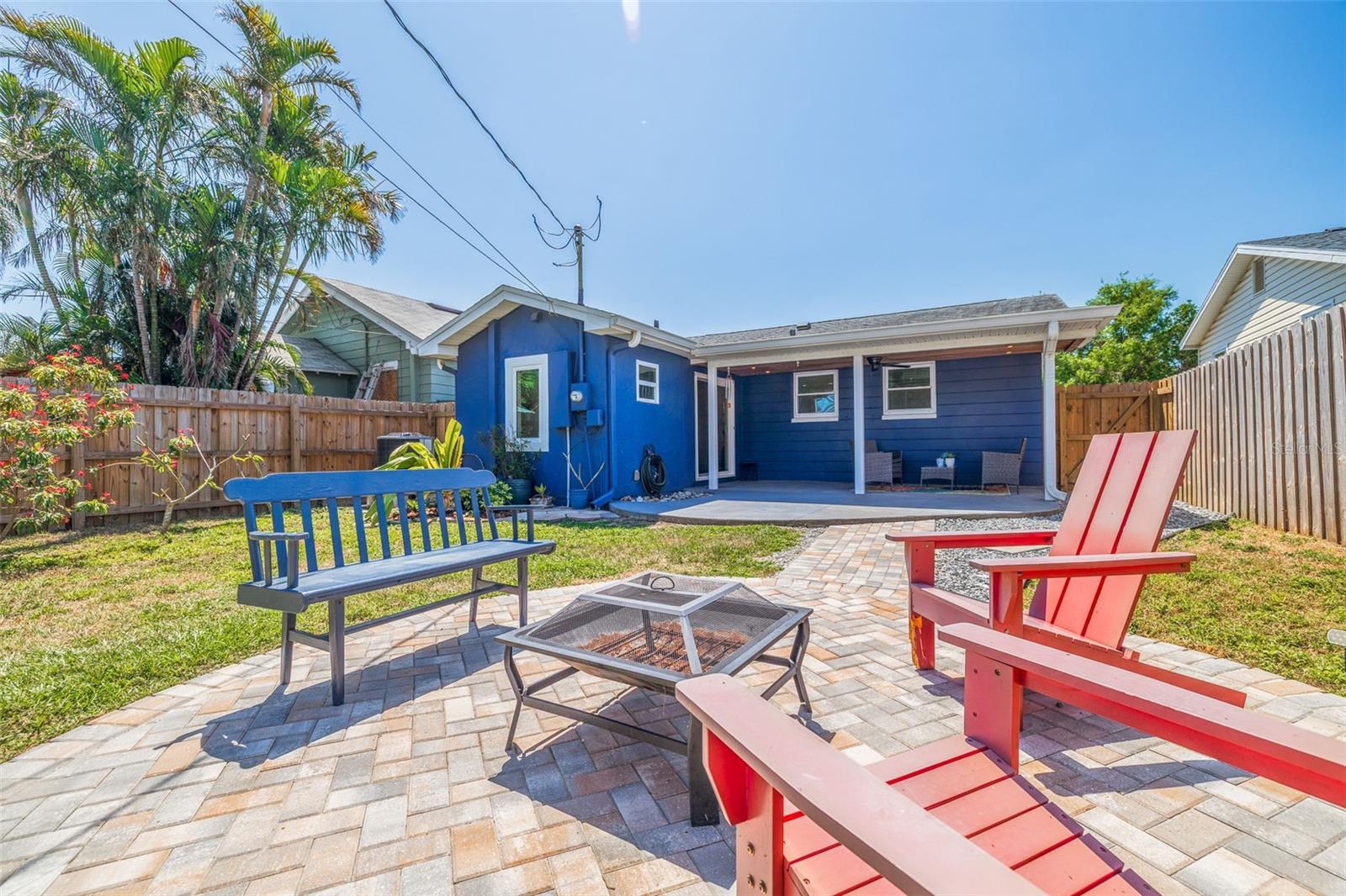 Welcome to this beautifully remodeled 2-bedroom, 2-bath bungalow, ideally located in Magnolia Heights — a high and dry St. Petersburg neighborhood where FLOOD INSURANCE IS NOT REQUIRED. Every inch of this home has been thoughtfully updated, offering a seamless blend of modern style and everyday functionality. Step inside to find wide-plank luxury vinyl flooring flowing throughout an open-concept layout. The designer kitchen features bright quartz countertops, open shelving with under-cabinet lighting, a gas stove, stainless steel appliances, a newly replaced refrigerator (2024), and a custom coffee bar for your morning routine. Just off the kitchen, a cozy dining nook with built-in bench seating adds charm and convenience — complete with hidden storage beneath. The spacious primary suite offers a peaceful retreat, highlighted by floating nightstands and sleek wall sconces that bring a clean, contemporary look with a warm, inviting touch. Both bathrooms have been fully updated with modern finishes, creating spa-like escapes. Enjoy the outdoors in your private, fully fenced backyard with a large paver patio — ideal for entertaining, dining al fresco, or relaxing in the included hot tub under the stars. Additional updates include a newer A/C system (2024), a gas tankless water heater (2019) for endless hot water, and smart storage solutions throughout. This home is truly turnkey — beautifully finished and move-in ready, in a prime location just minutes to downtown, parks, and local shops and restaurants.